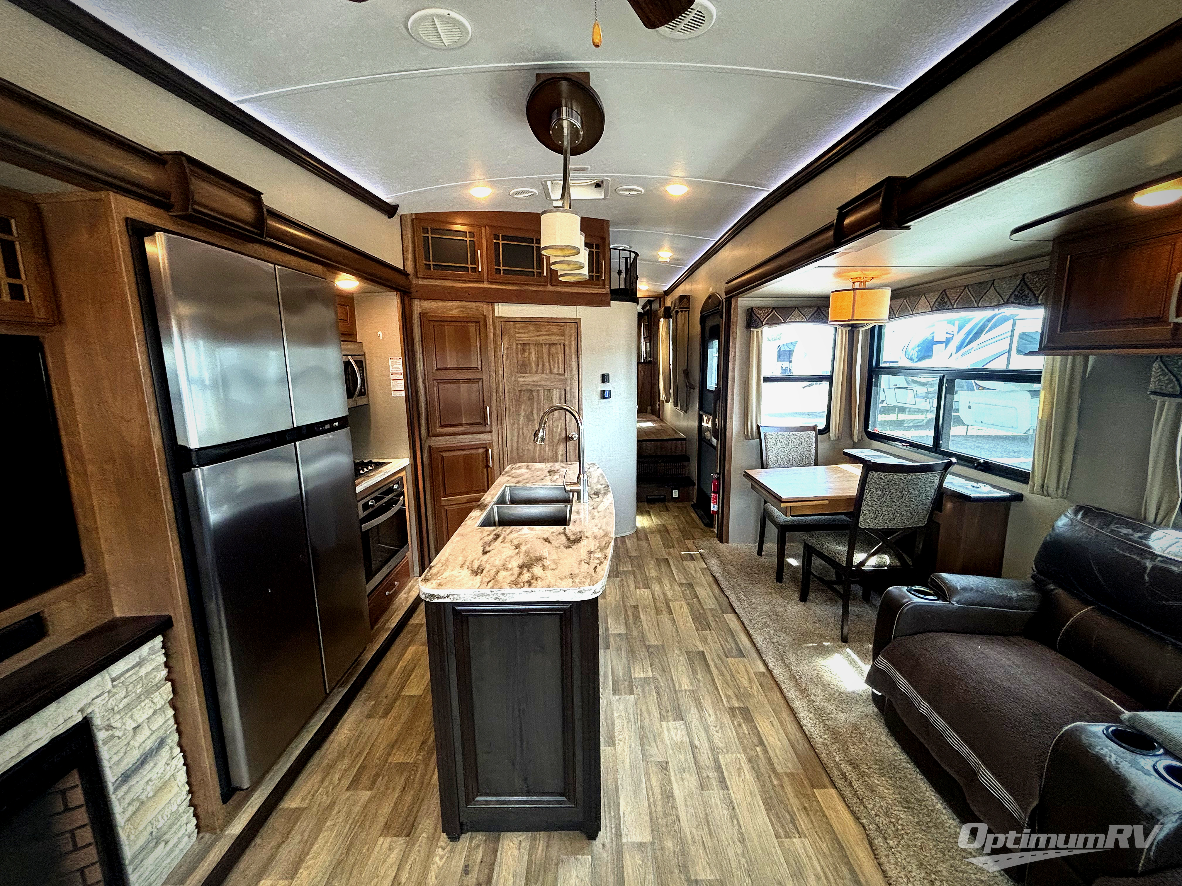 Opposite the door side find a HD TV with fireplace, a refrigerator, and three burner range with overhead convection microwave oven slide out. A corner pantry is featured just off the slide near the range. There is also a convenient center island with double sinks. You will easily be able to prepare and cook food for your family here.