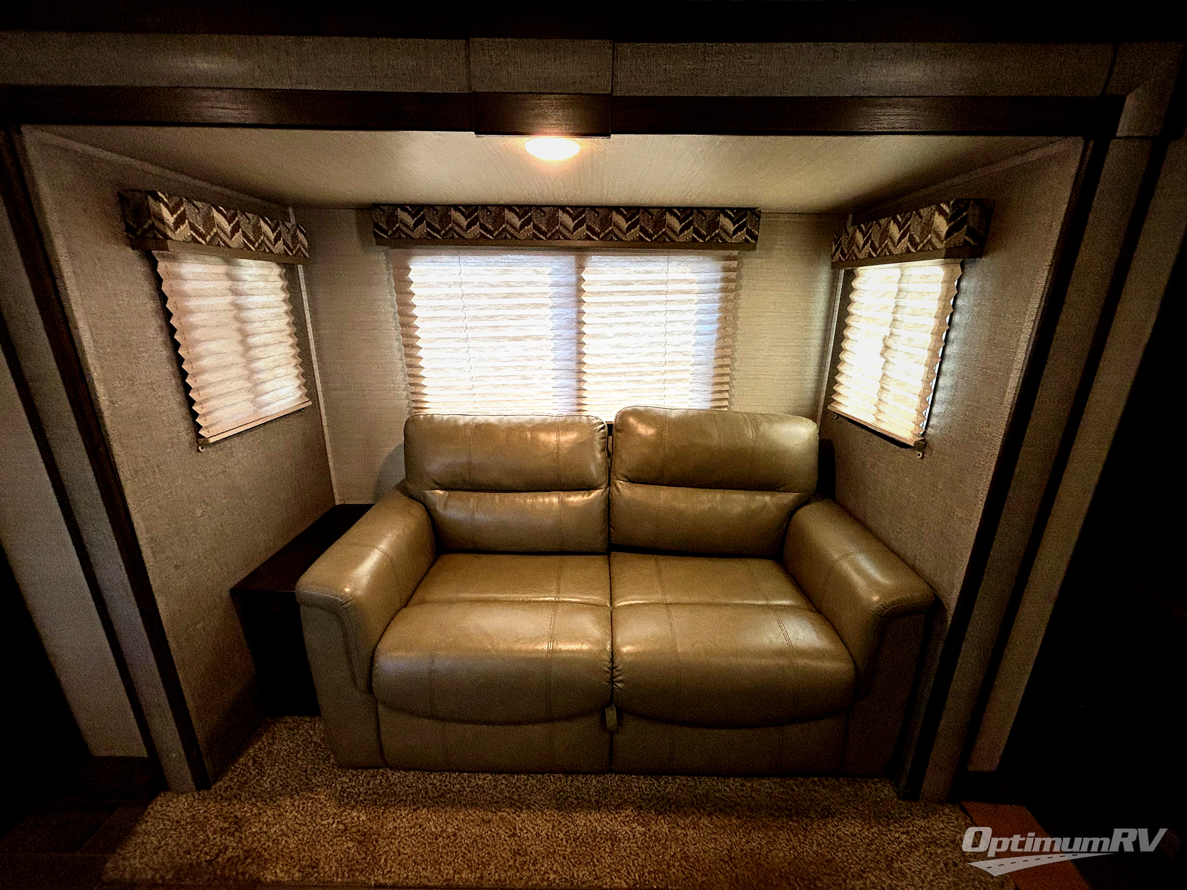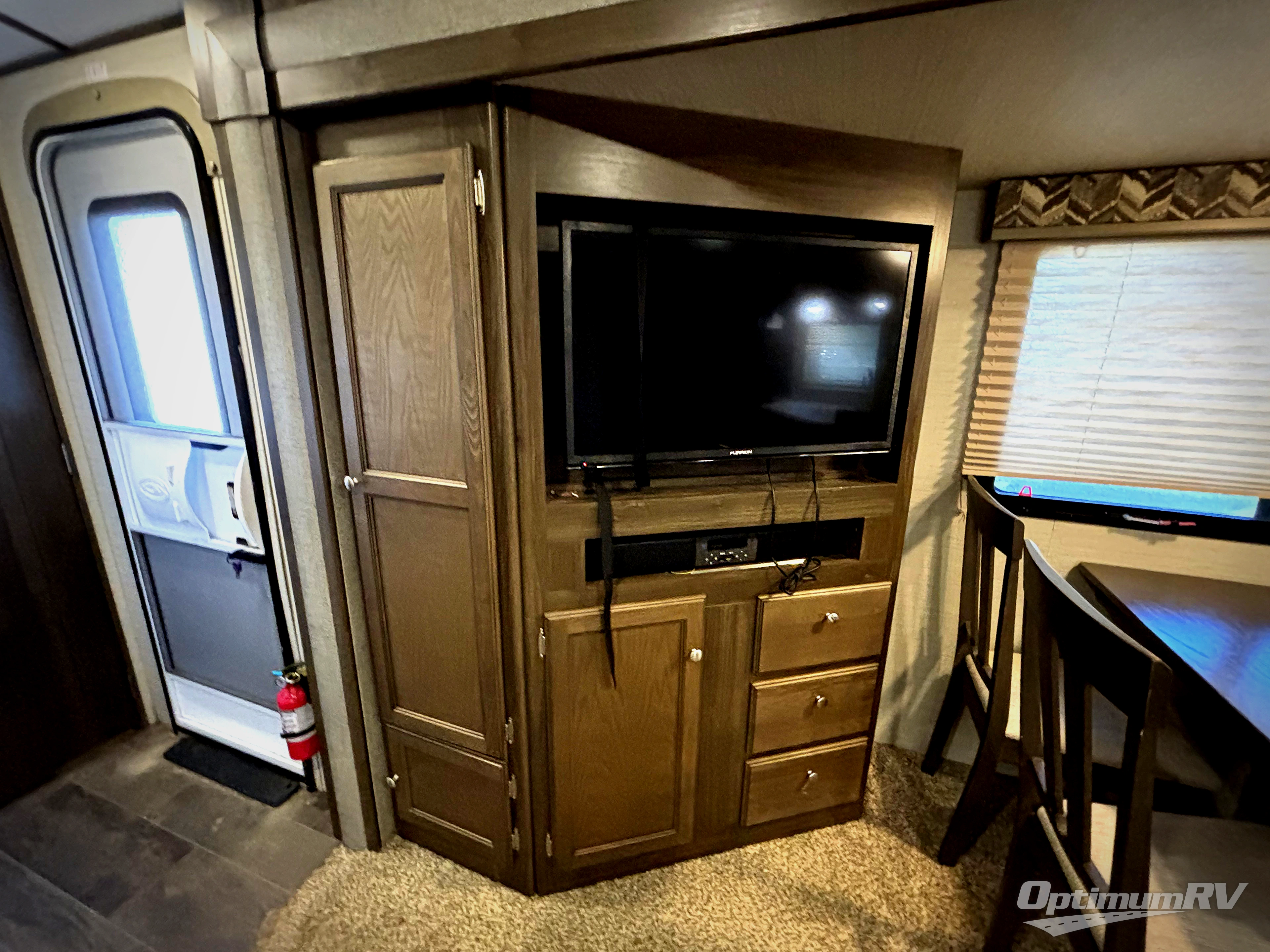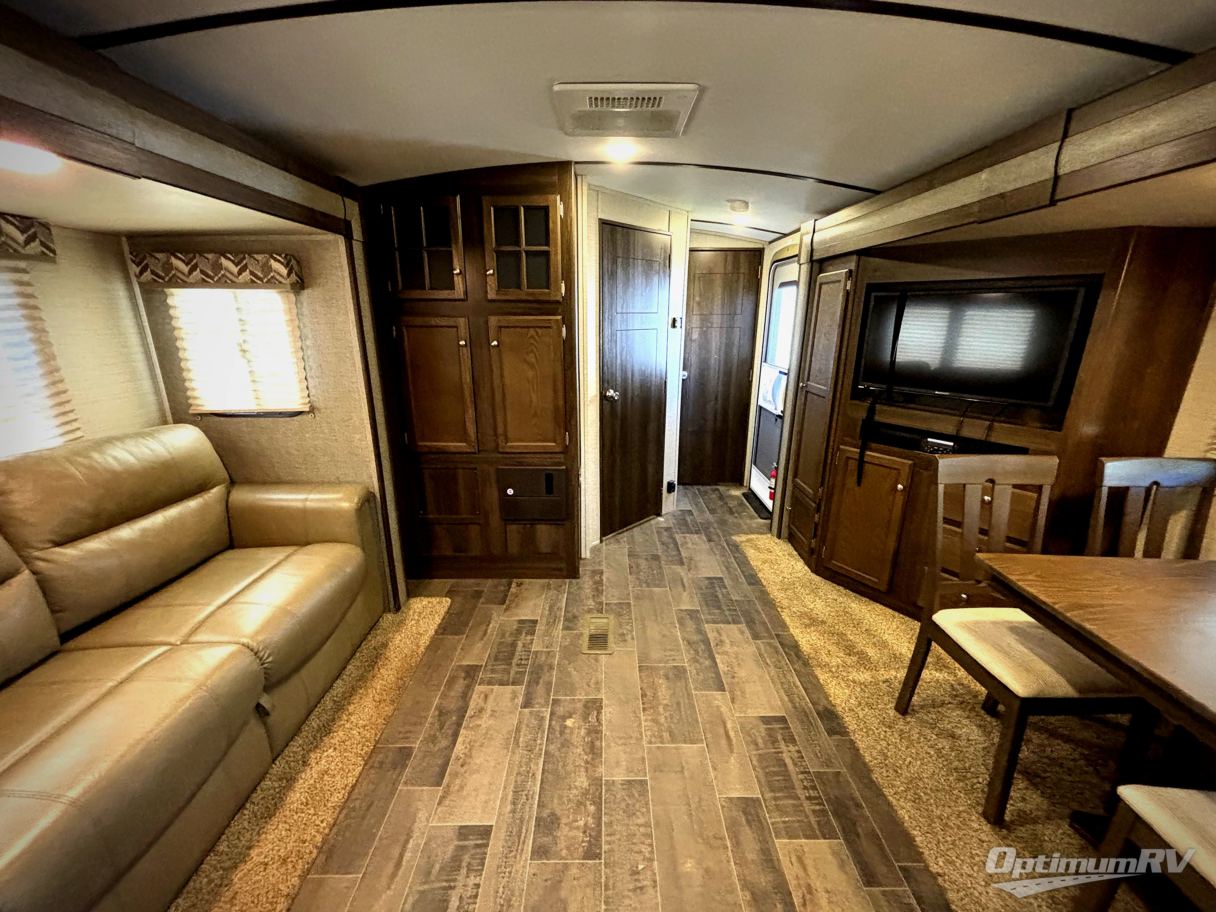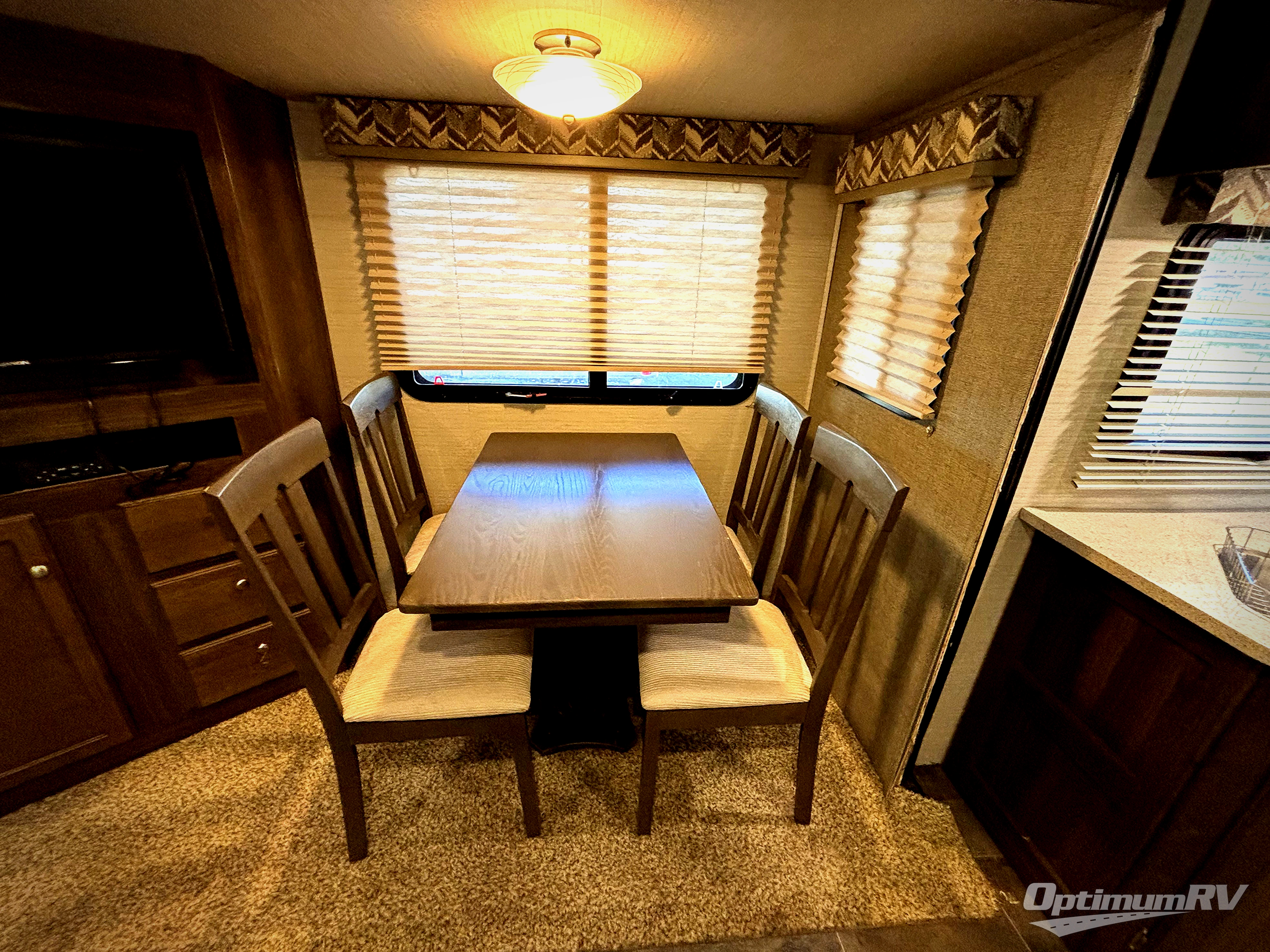 In the main living area enjoy the added space thanks to the dual slide outs. To the left of the entry door there is a slide out entertainment center with coat closet, and a free standing dinette with chairs. On the opposite side you will enjoy the tri-fold sofa for seating with an end table on one side.