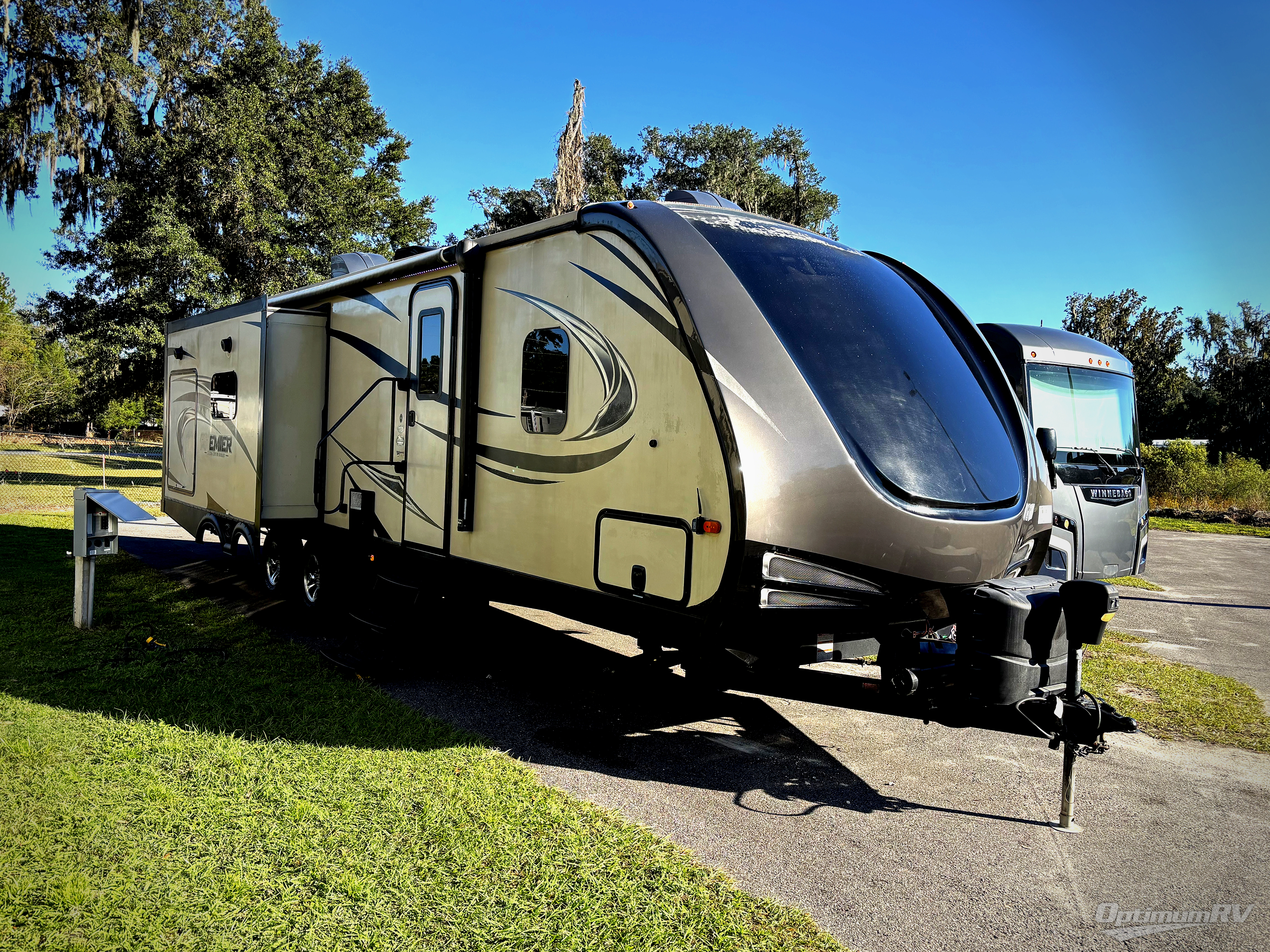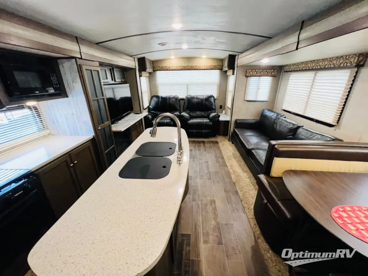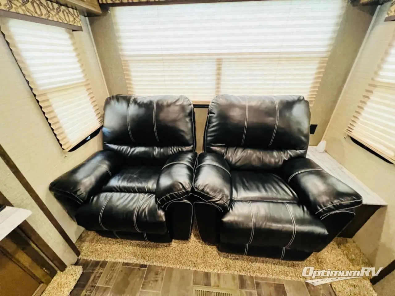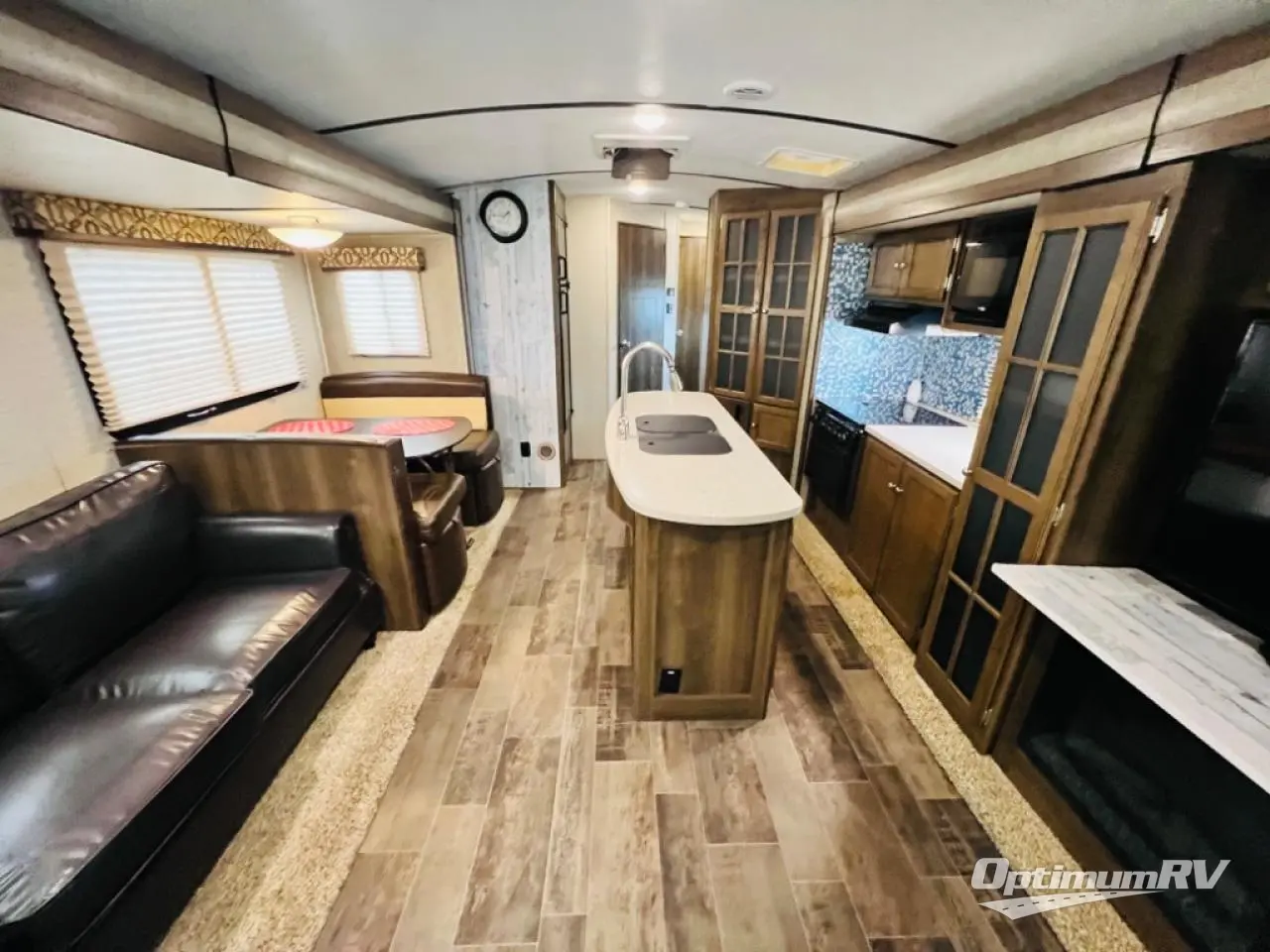 Step inside this Premier Ultra Lite travel trailer 30RIPR by Keystone RV. It features a rear living layout, double slides, luxury cinema recliners, and a convenient kitchen island.