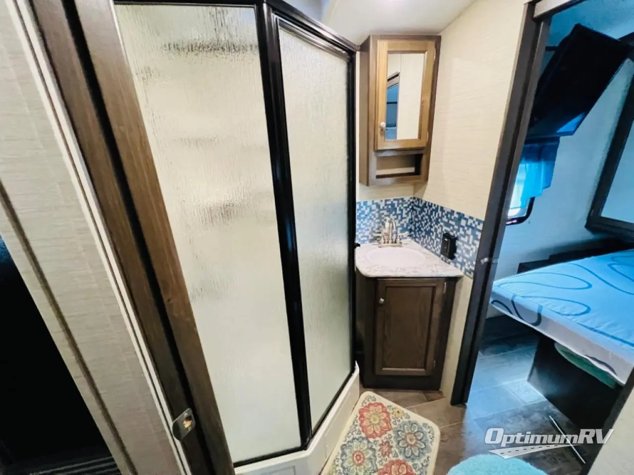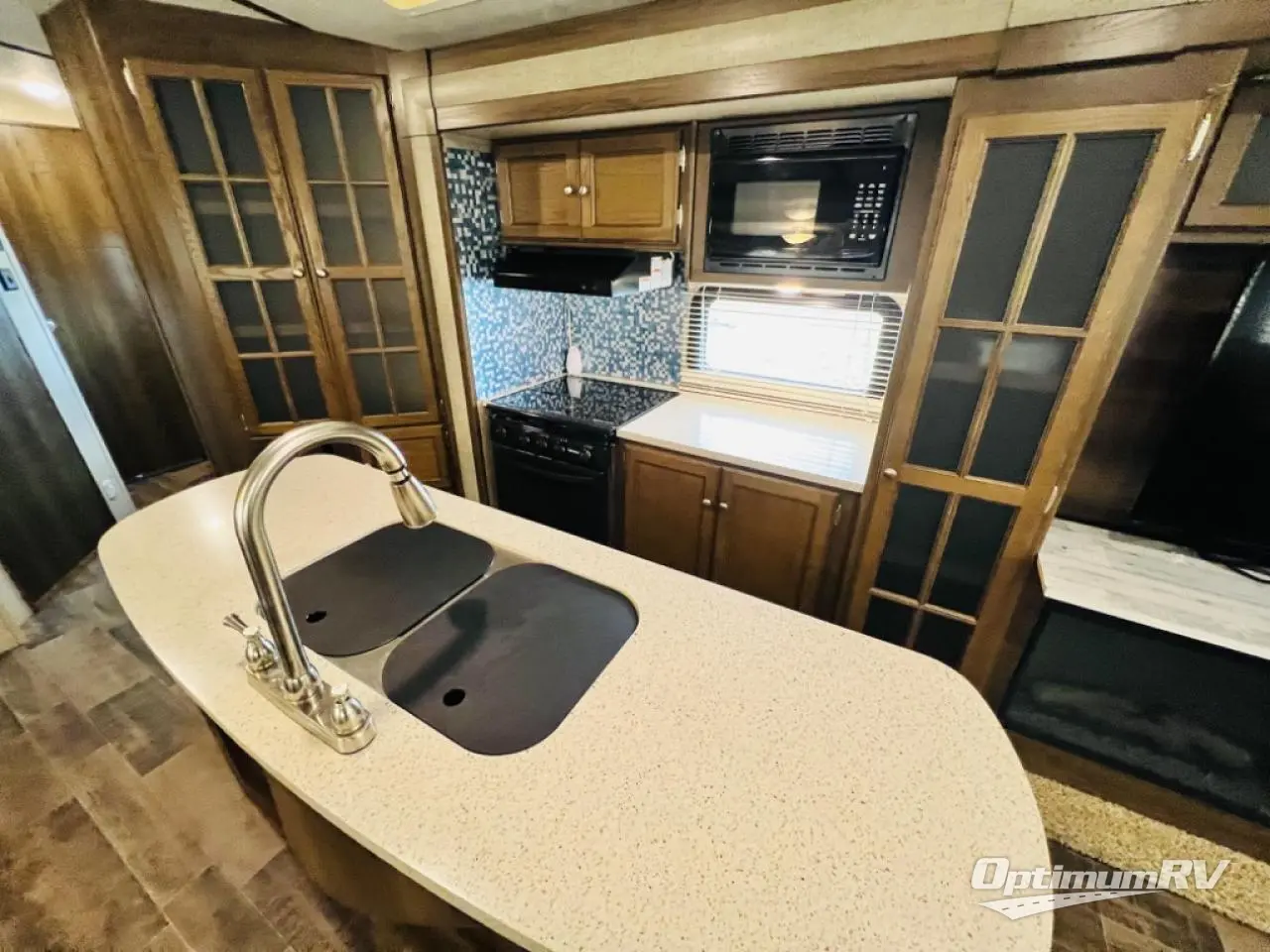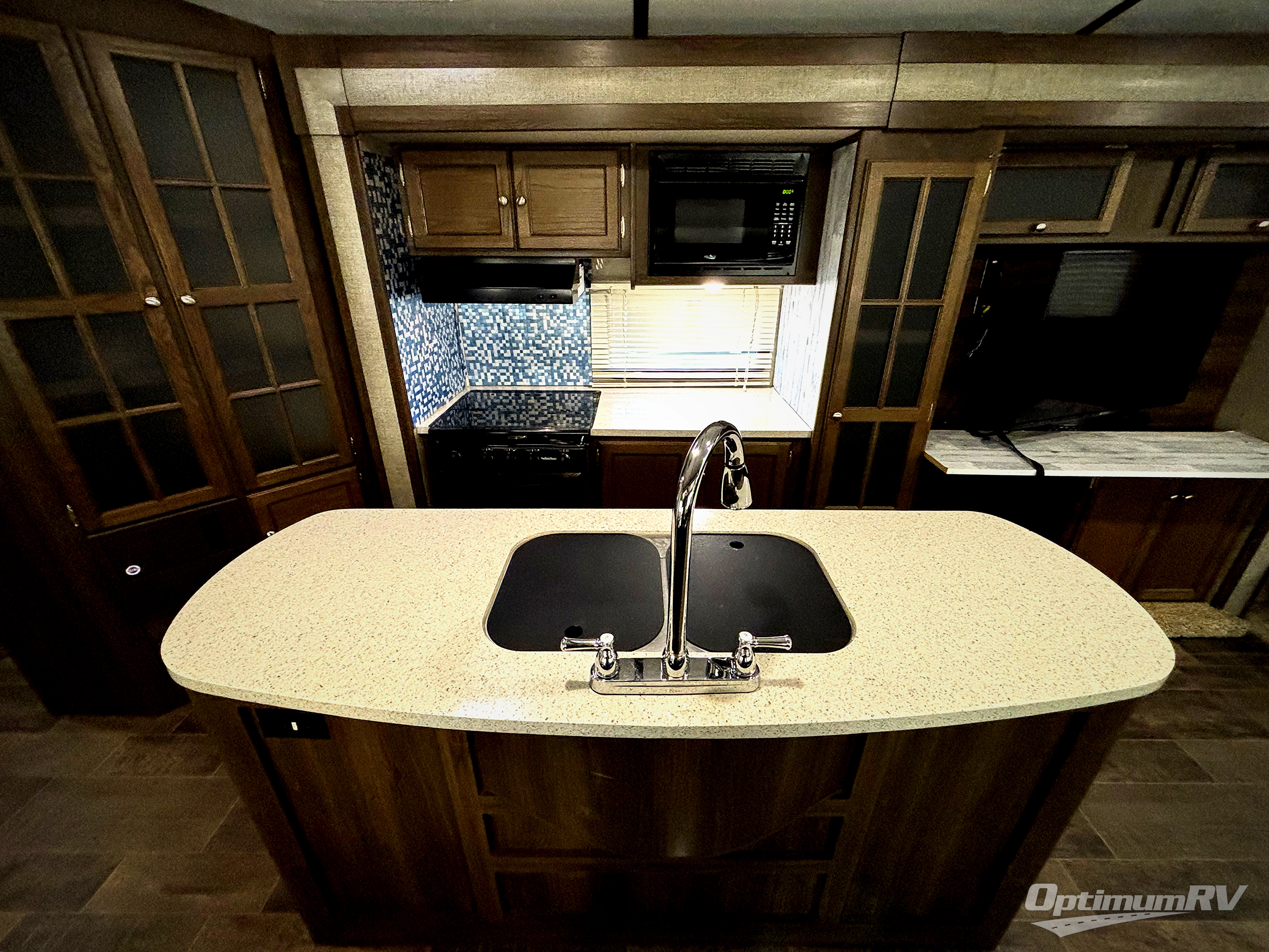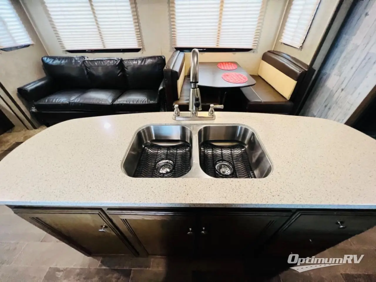 On the road side, you will find luxury cinema recliners for two, and a booth dinette slide. The refrigerator is located just off the slide near the booth dinette. There is also a convenient island in the middle that features a double kitchen sink for clean up and extra counter space for prep work.