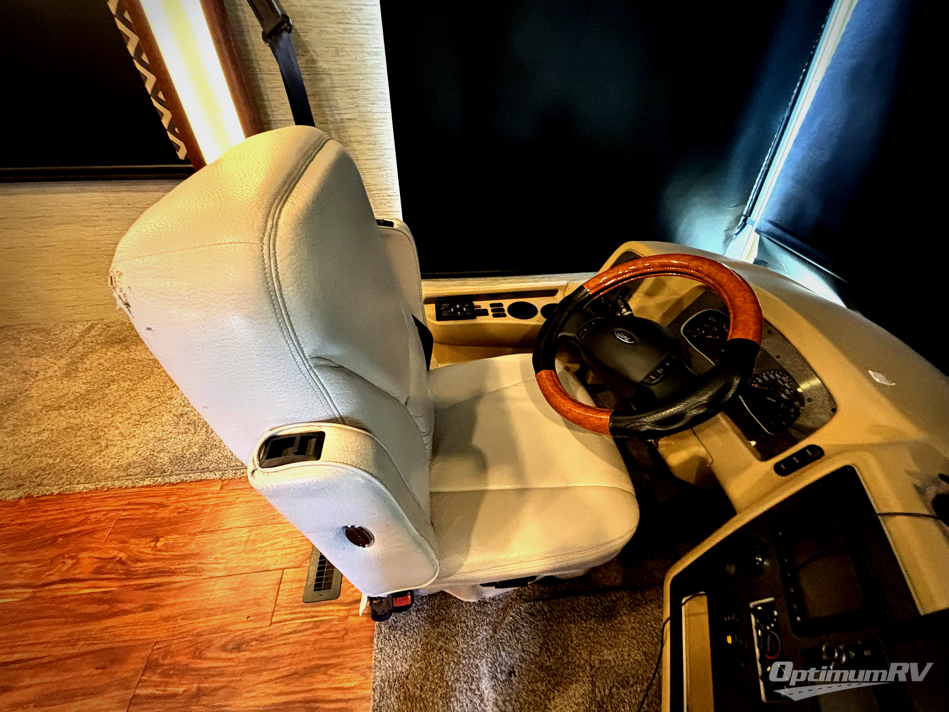 As you enter the motor coach, to the right there is the driver and passenger's chairs that rotate to provide more seating in the living and kitchen area. There is additional storage above the cab.
