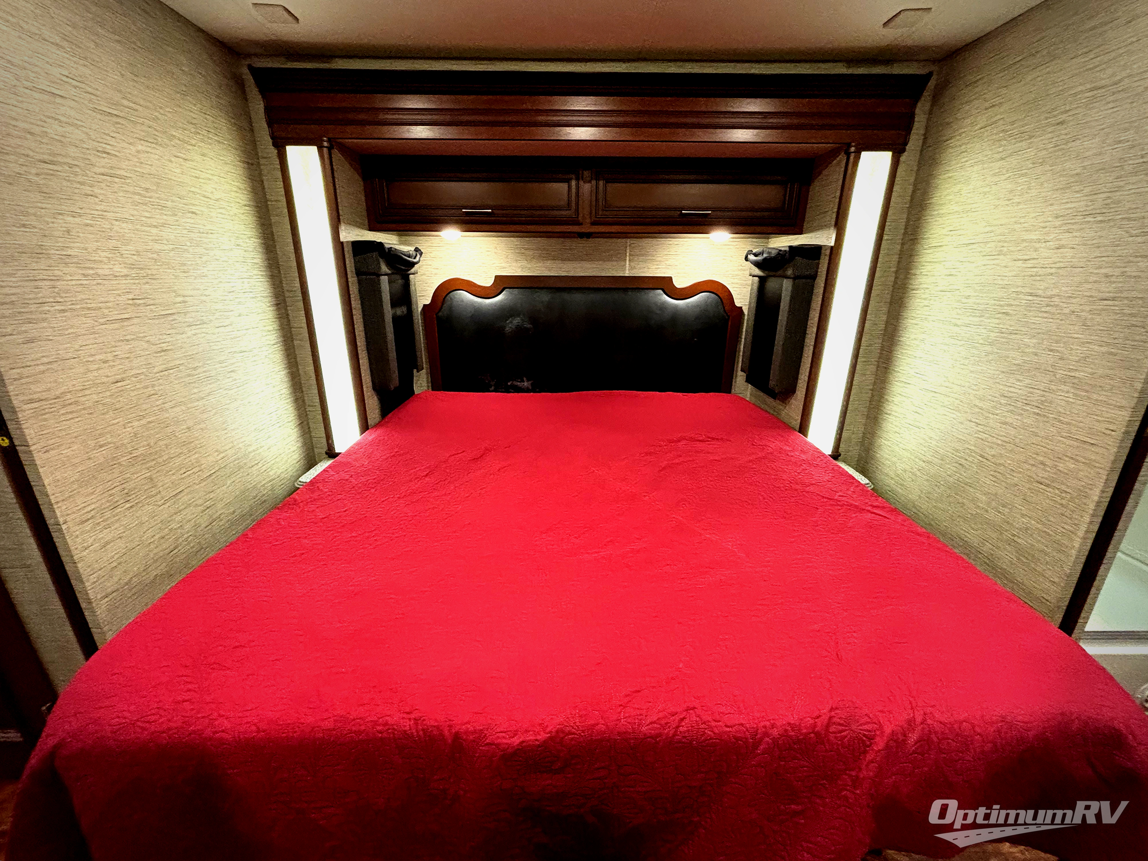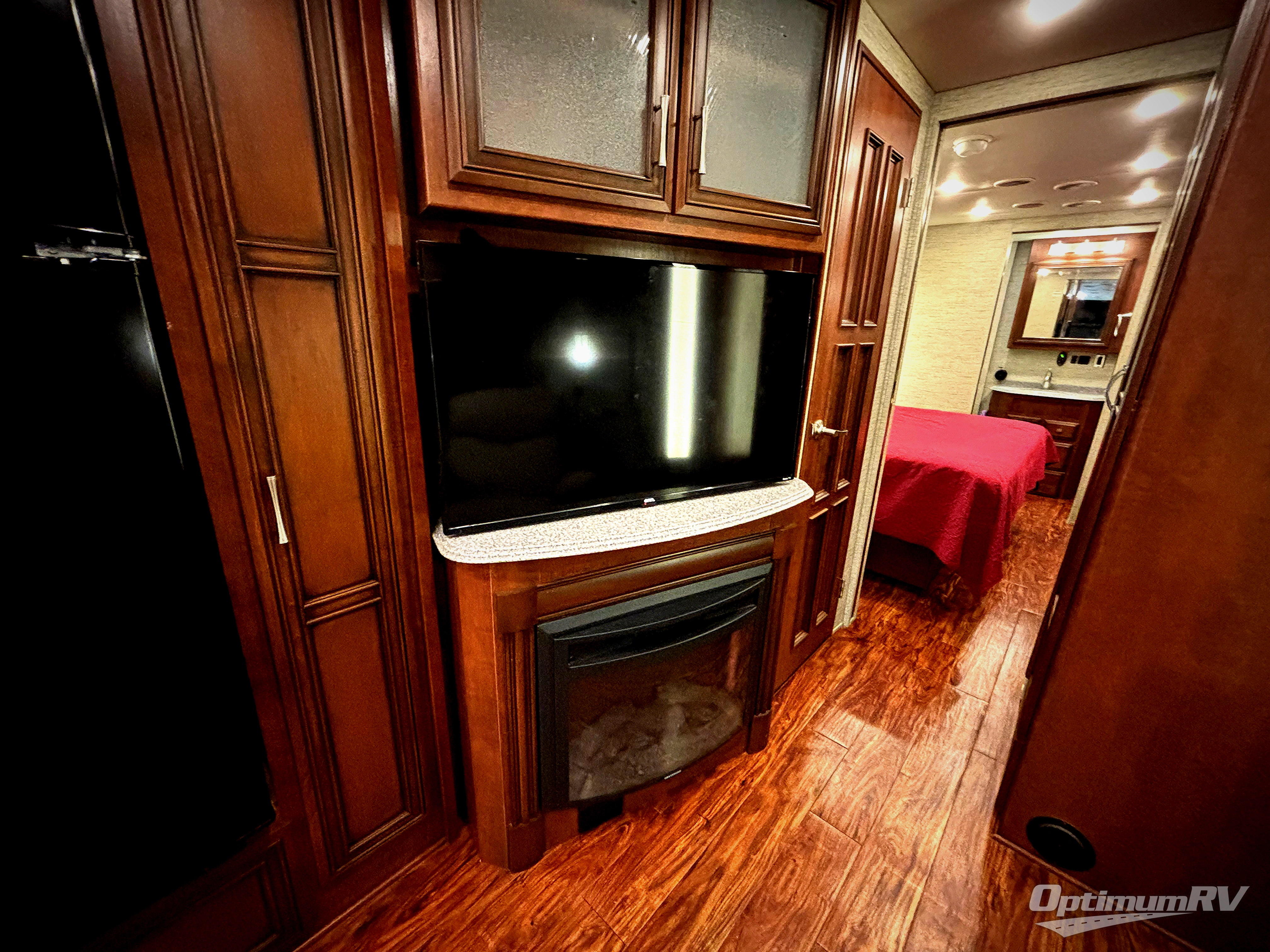 As you head to the rear bath, slide the master bedroom door open to see a king bed slide out including overhead cabinets. A chest of drawers, dual shirt wardrobes, overhead cabinets, and a TV are on the opposite wall.