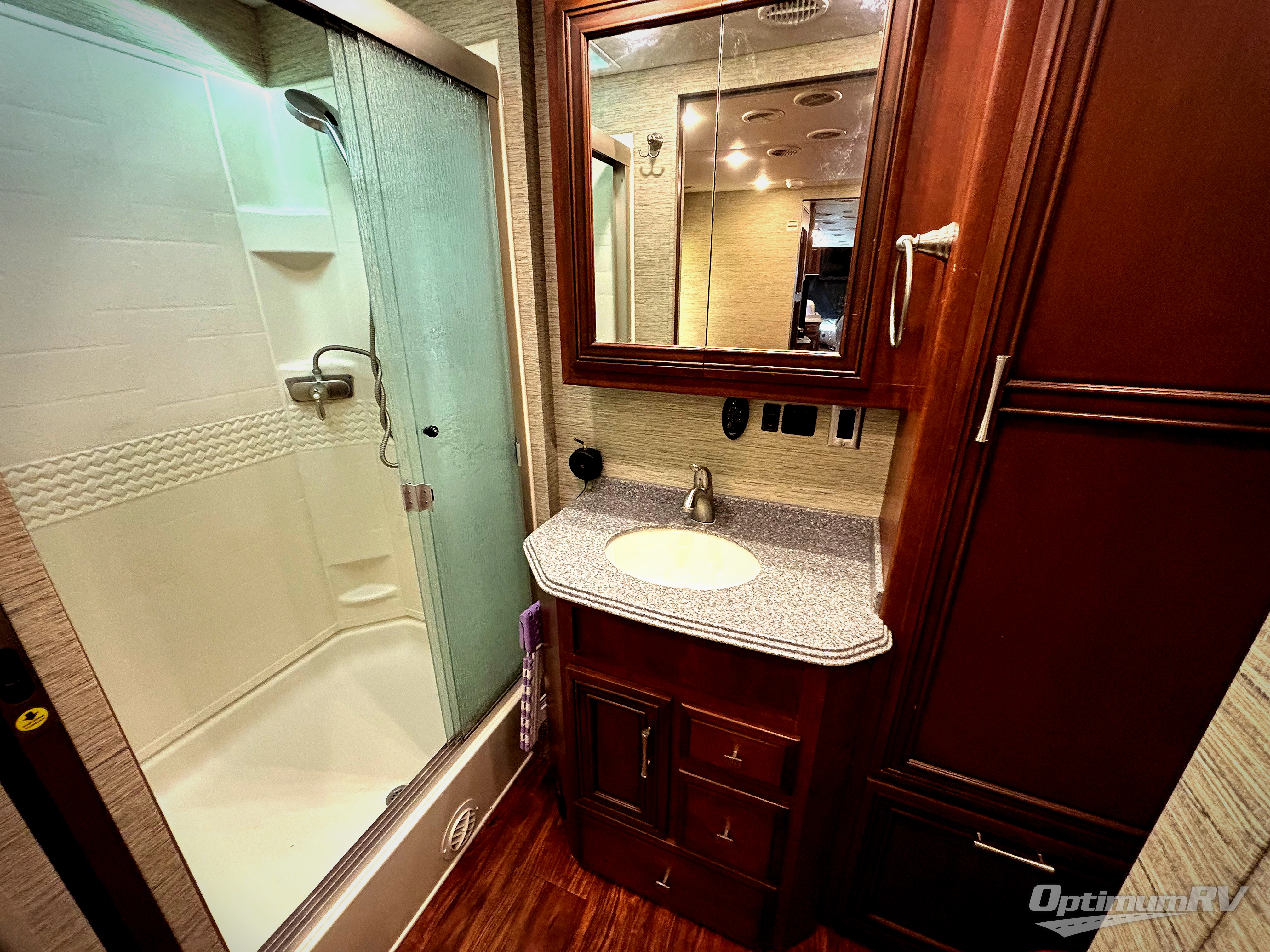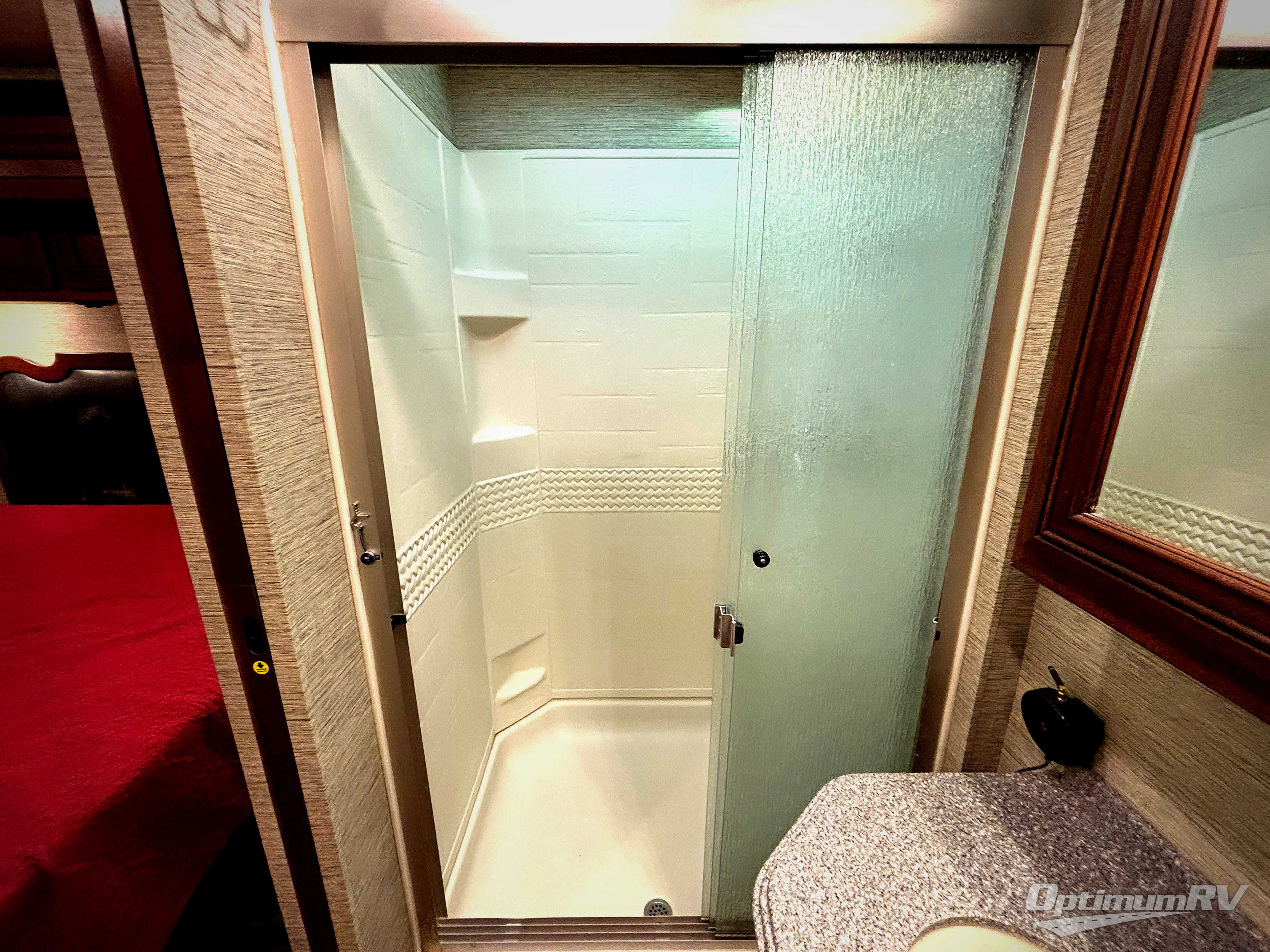 The master bath is located in the rear of the motor coach. The bath includes a toilet, corner shower, sink, and linen storage.