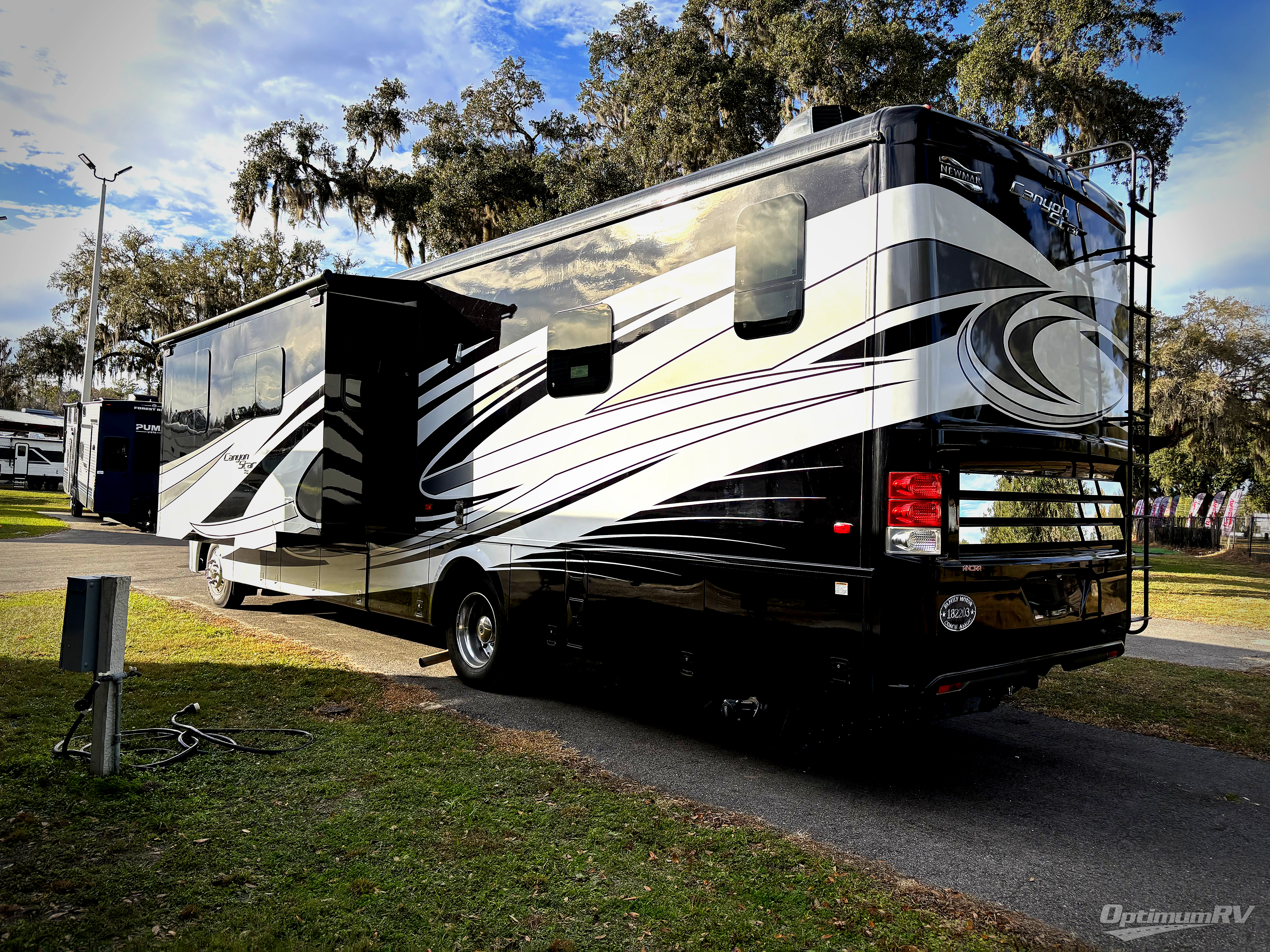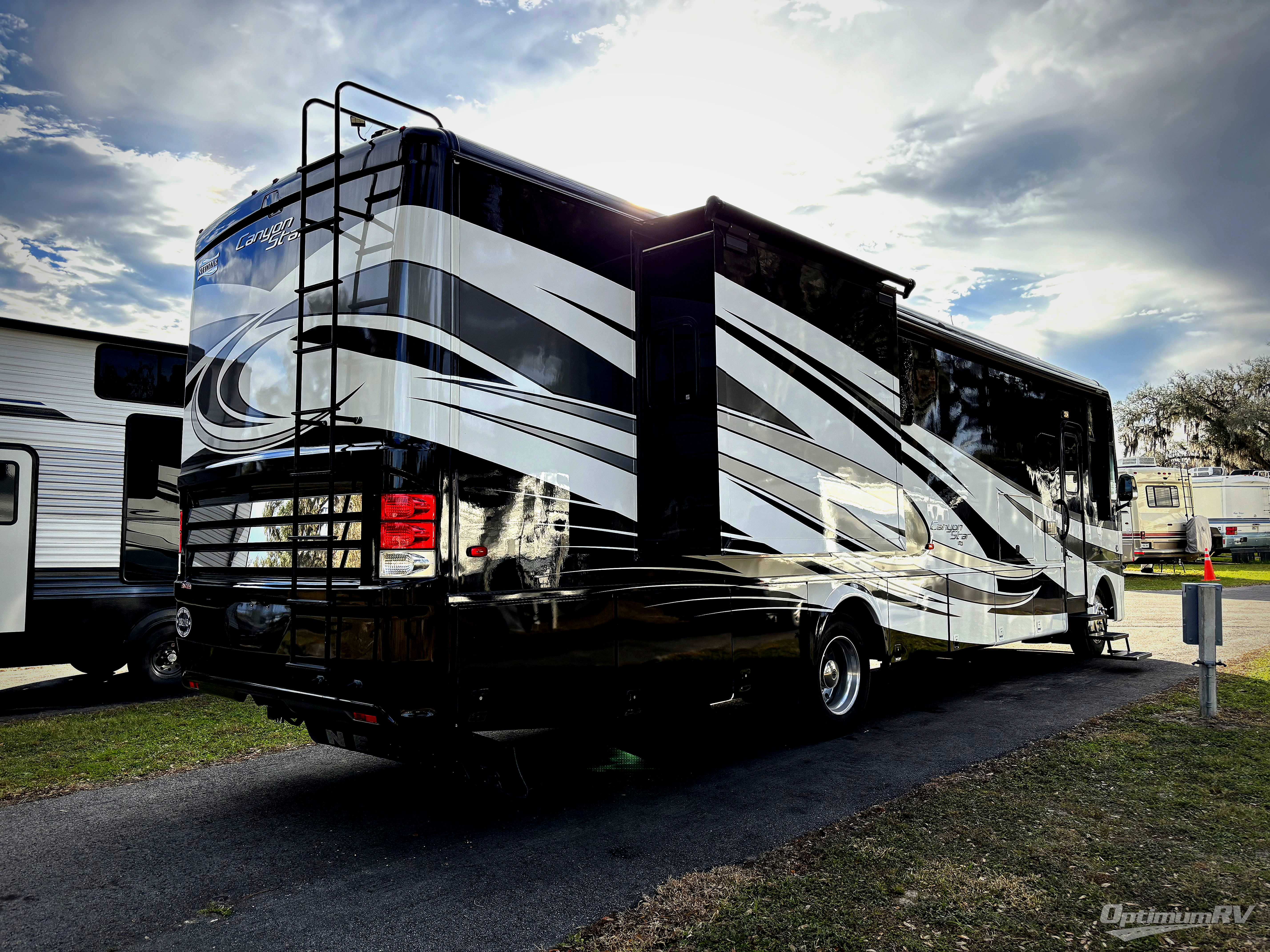 This Newmar Canyon Star 3710 class A gas motor coach features a rear master bath, king bed, dry bar, plus a half bath.