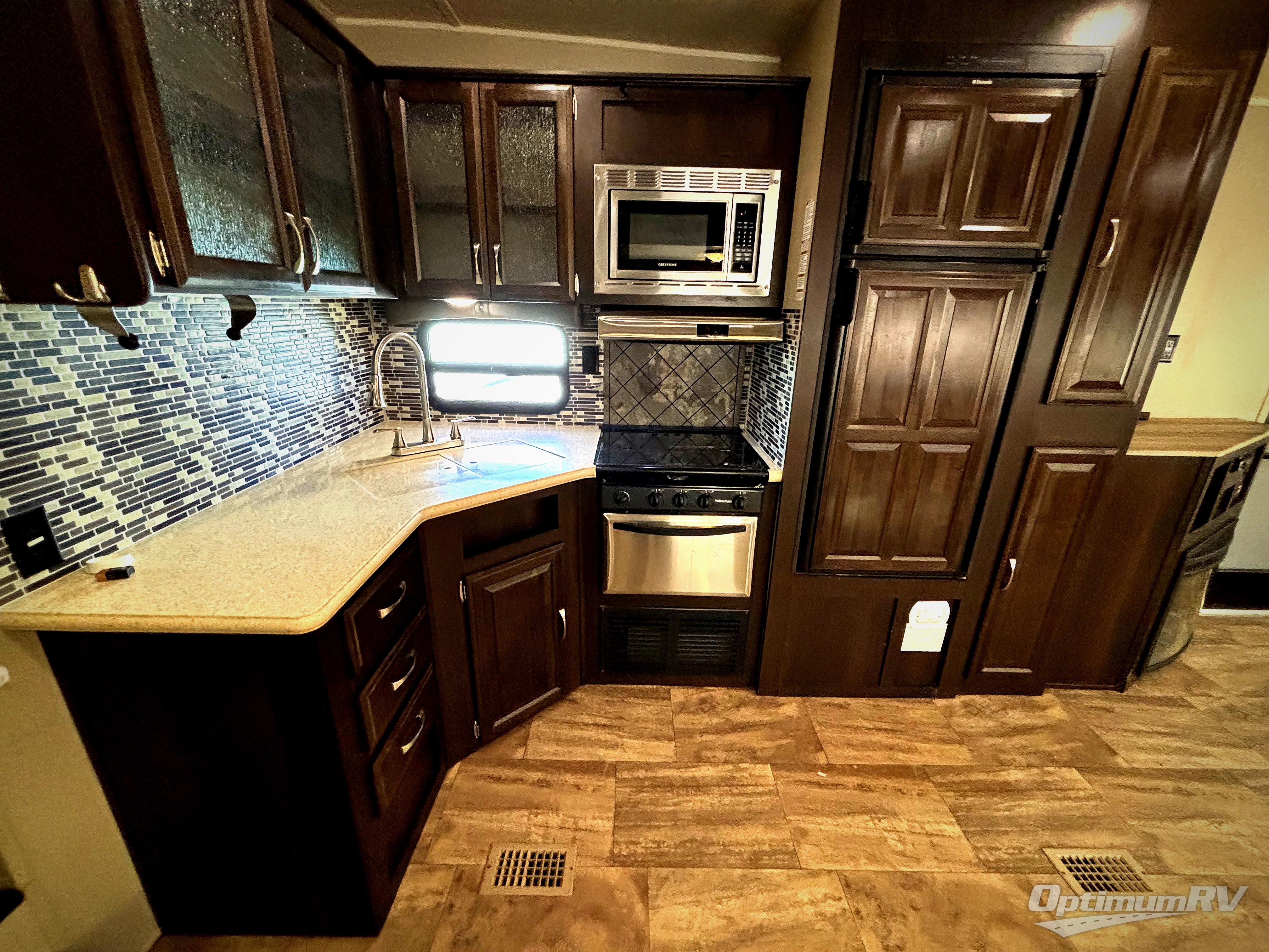 Step into this fifth wheel to enter the rear living area. There are two recliners with an end table in between, and overhead cabinets.