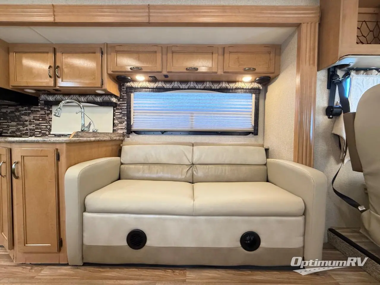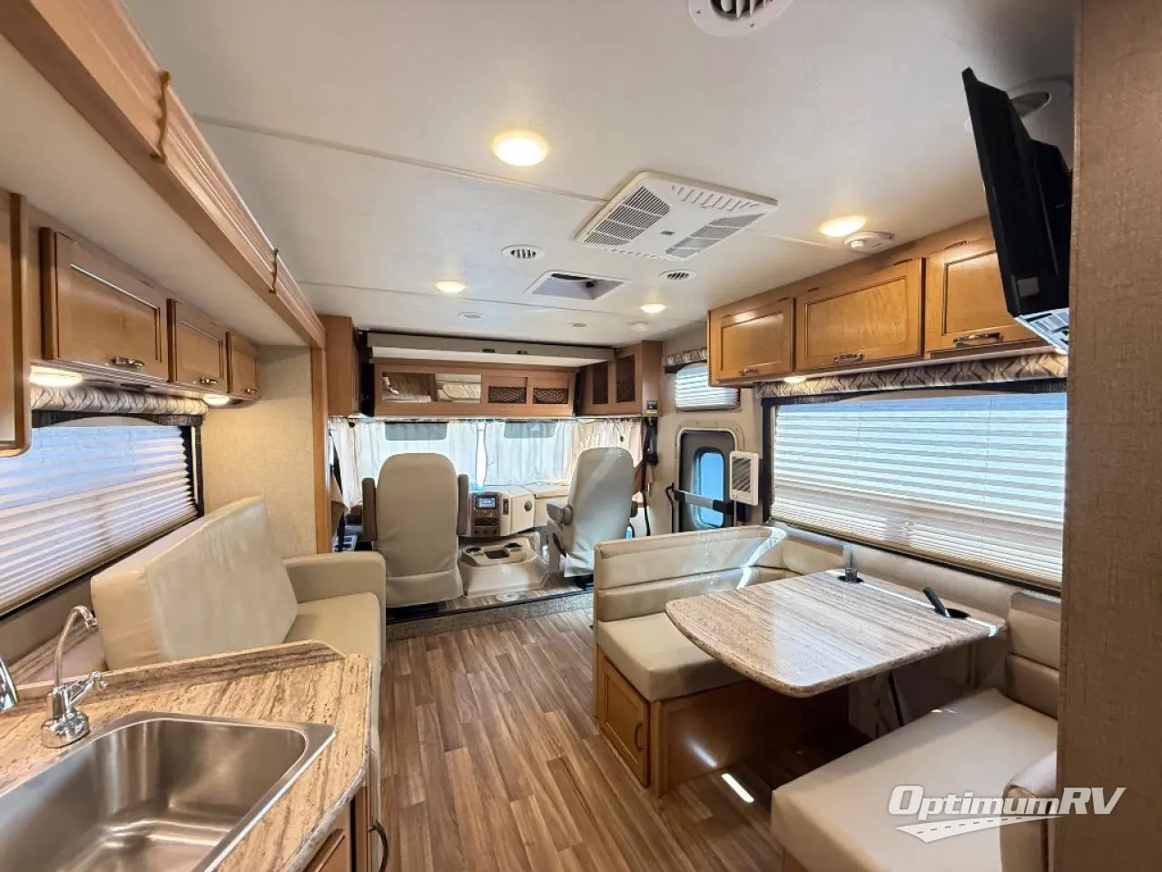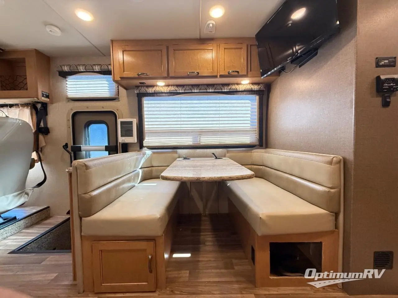 A spacious booth dinette has a 32" LED TV mounted above it, facing the front of the motorhome for easy viewing from all seats, including the captain's chairs.