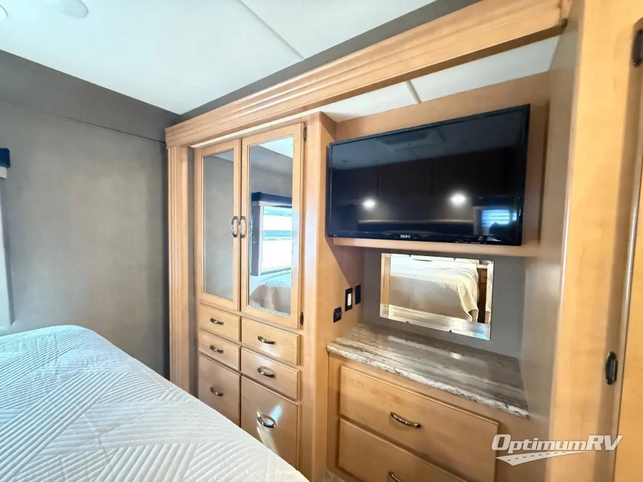 Moving into the bedroom area, still within the full wall slide out, there is a dresser and closet with a 32" LED TV. The bedroom also includes a queen bed with nightstands on each side plus overhead cabinets.