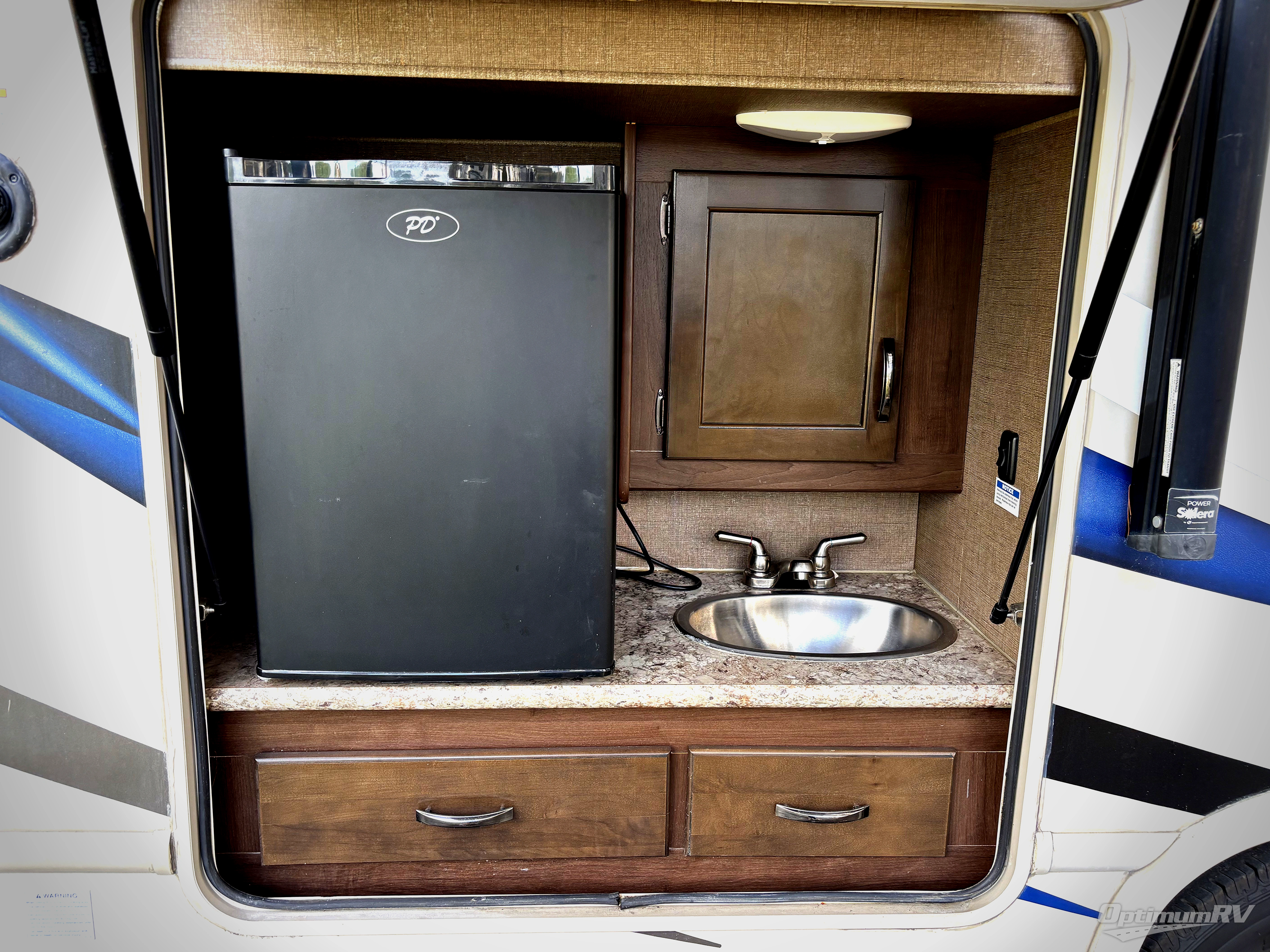 Above the cab there is a cab-over bunk with a 54"x96" sleeping area with two sets of overhead cabinets.
