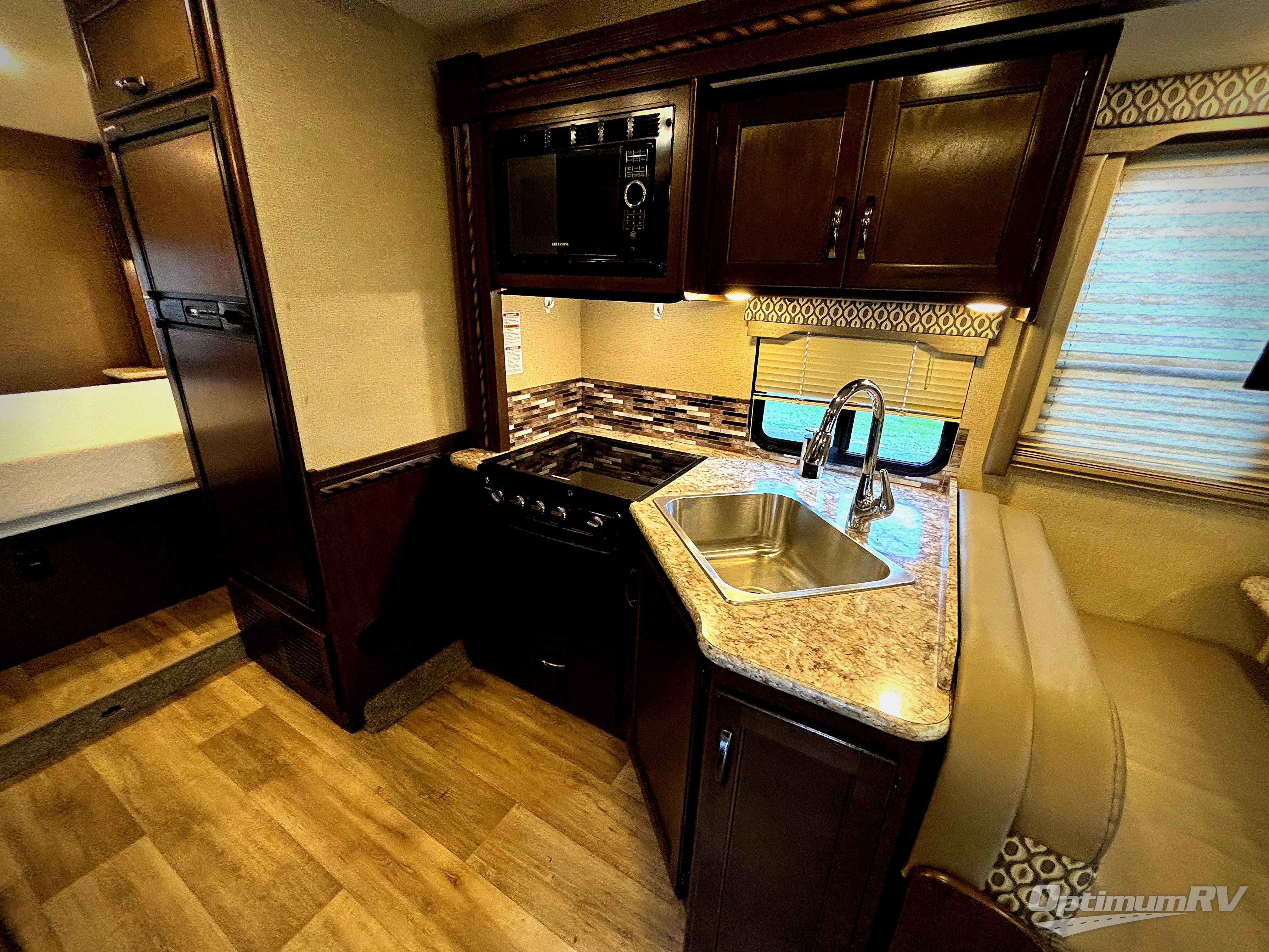 As you enter this model you will find yourself in the combined kitchen and living area. Here there is a slide out along the roadside which features a 71" Dream Dinette with a 40" LED TV above, a large sink, overhead cabinets, a three burner range with a microwave above, and adjacent to the slide out there is a refrigerator for your perishable food items. To the right of the door there is a 68" jack-knife sofa with an overhead cabinet.