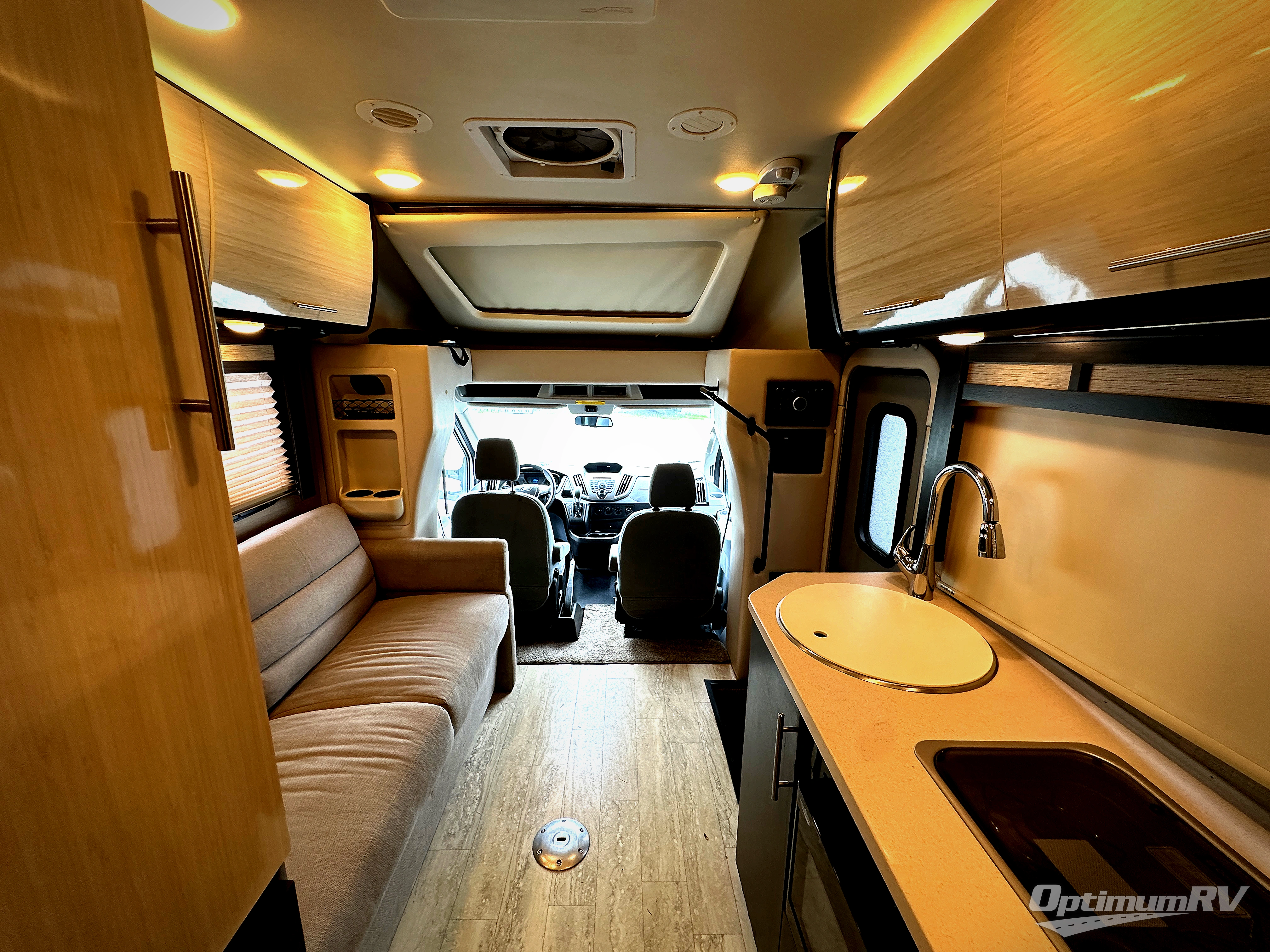 Enter in front behind the passenger's seat and notice a 32" LED TV overhead. This can easily be viewed from the sofa on the opposite side. There are two sets of seat belts for your rear travelers, and the sofa can easily be turned into a 42" x 64" sleeping space for on board guests. A removable pedestal table creates a nice dining space up front. Plus there is a built-in skylight over the cab area providing more natural light inside.