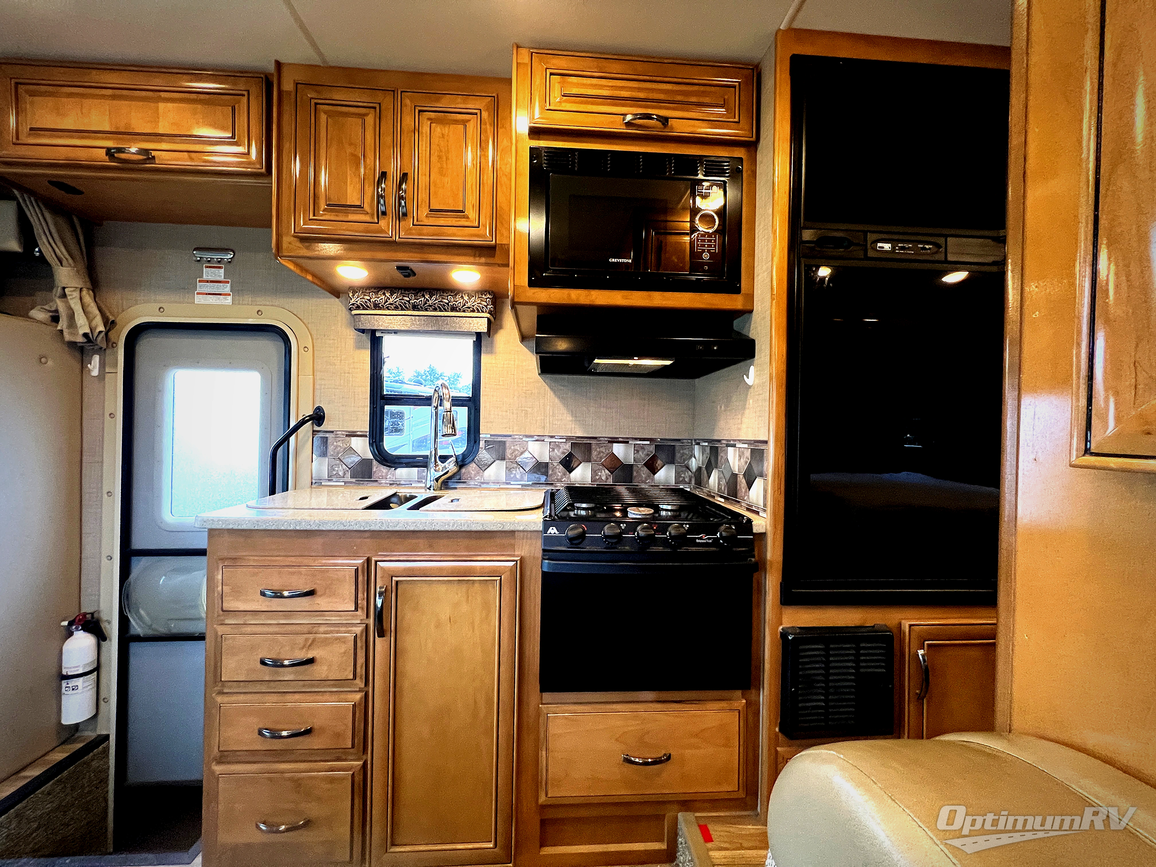 To the left of the entry door find a large kitchen sink, three burner range, microwave oven, and a refrigerator for your perishables. The pantry and upper cabinets provide places to keep your dry goods, dishes and things organized and neatly tucked away.