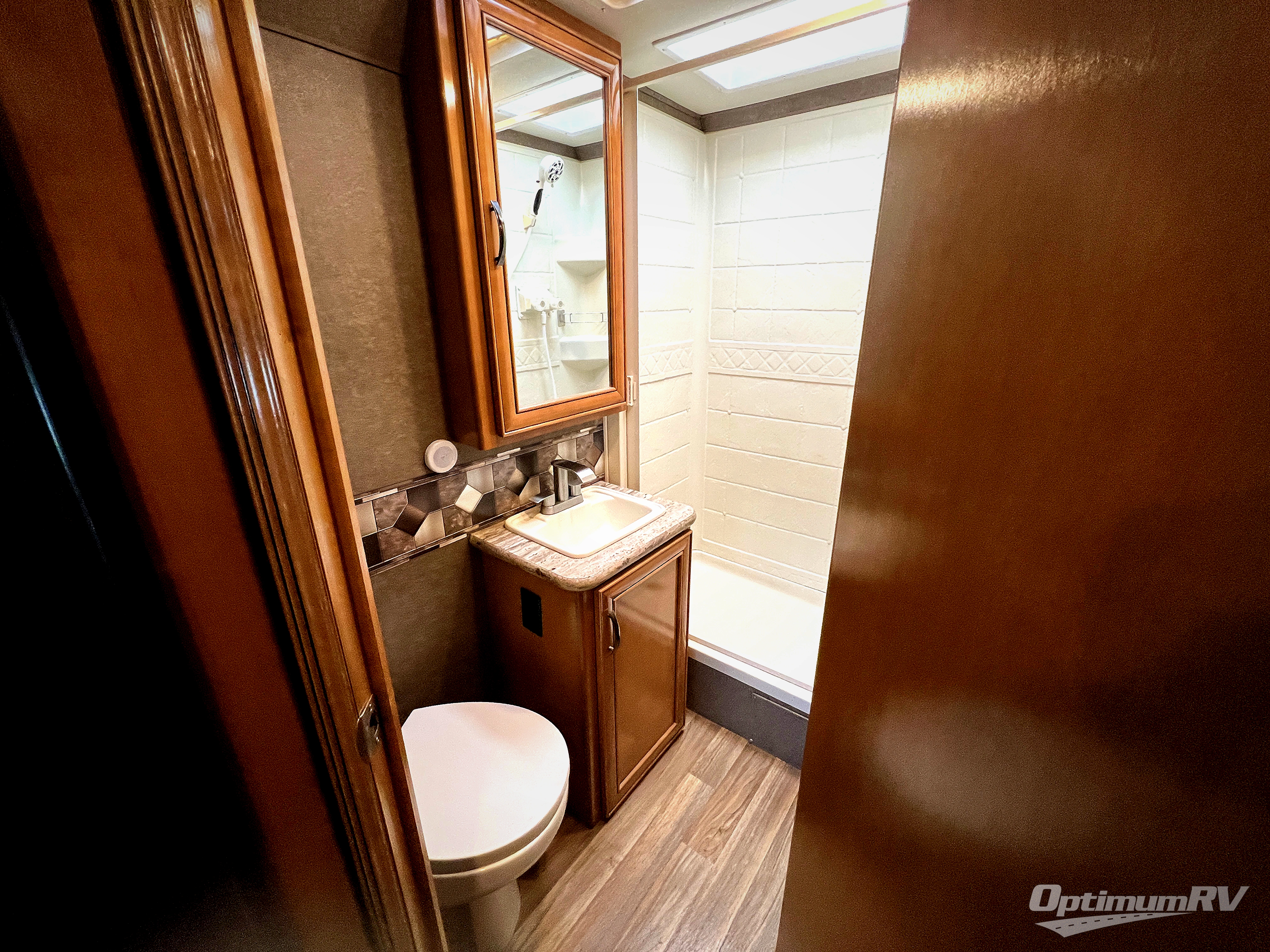 The rear right road side corner features a queen bed slide out with a nightstand and overhead storage. Plus there is a closet for your clothing, and a privacy curtain to pull closed at night. Next door find a conventionality located bathroom with a 24" x 36" shower, toilet, and sink.