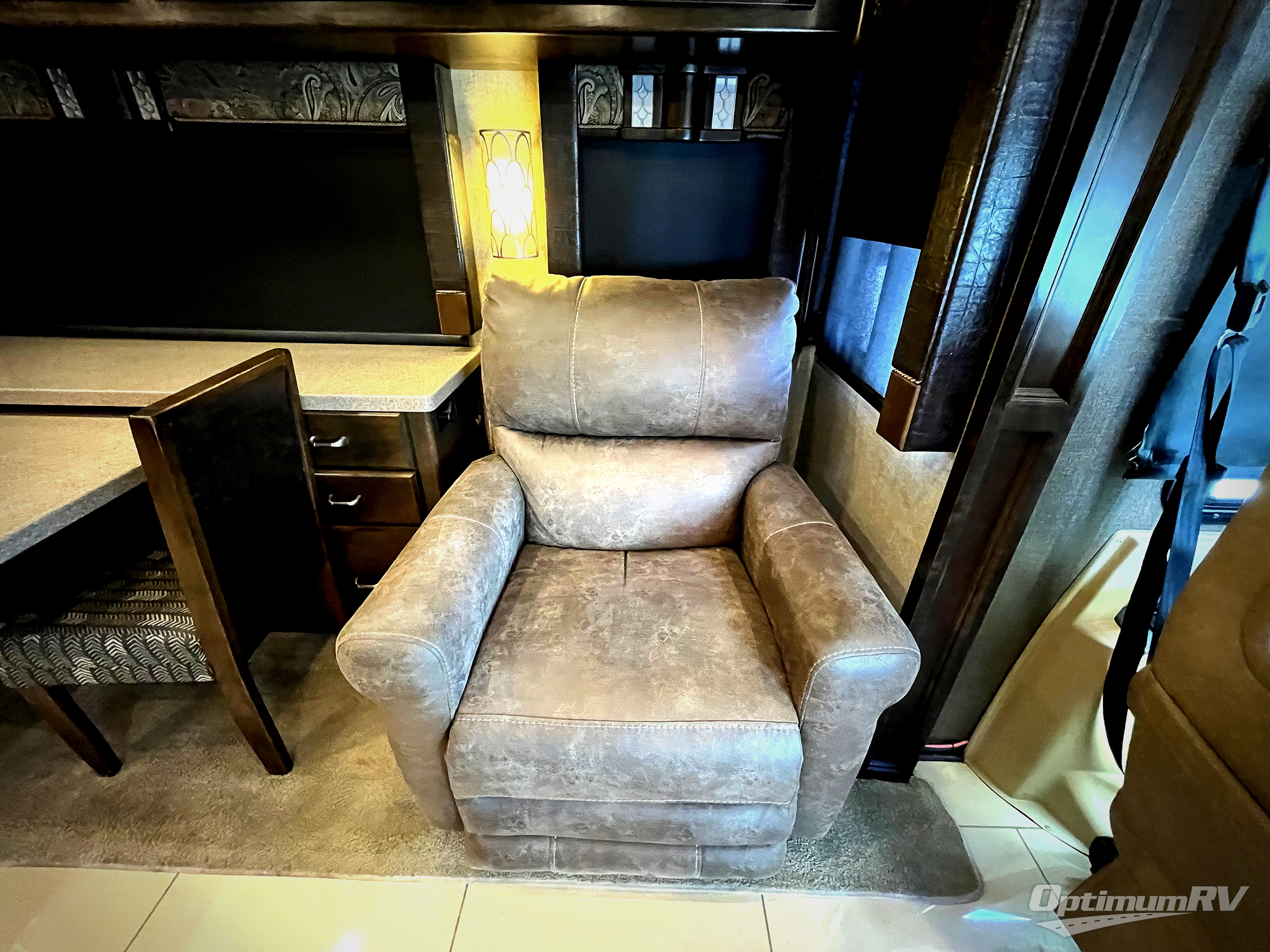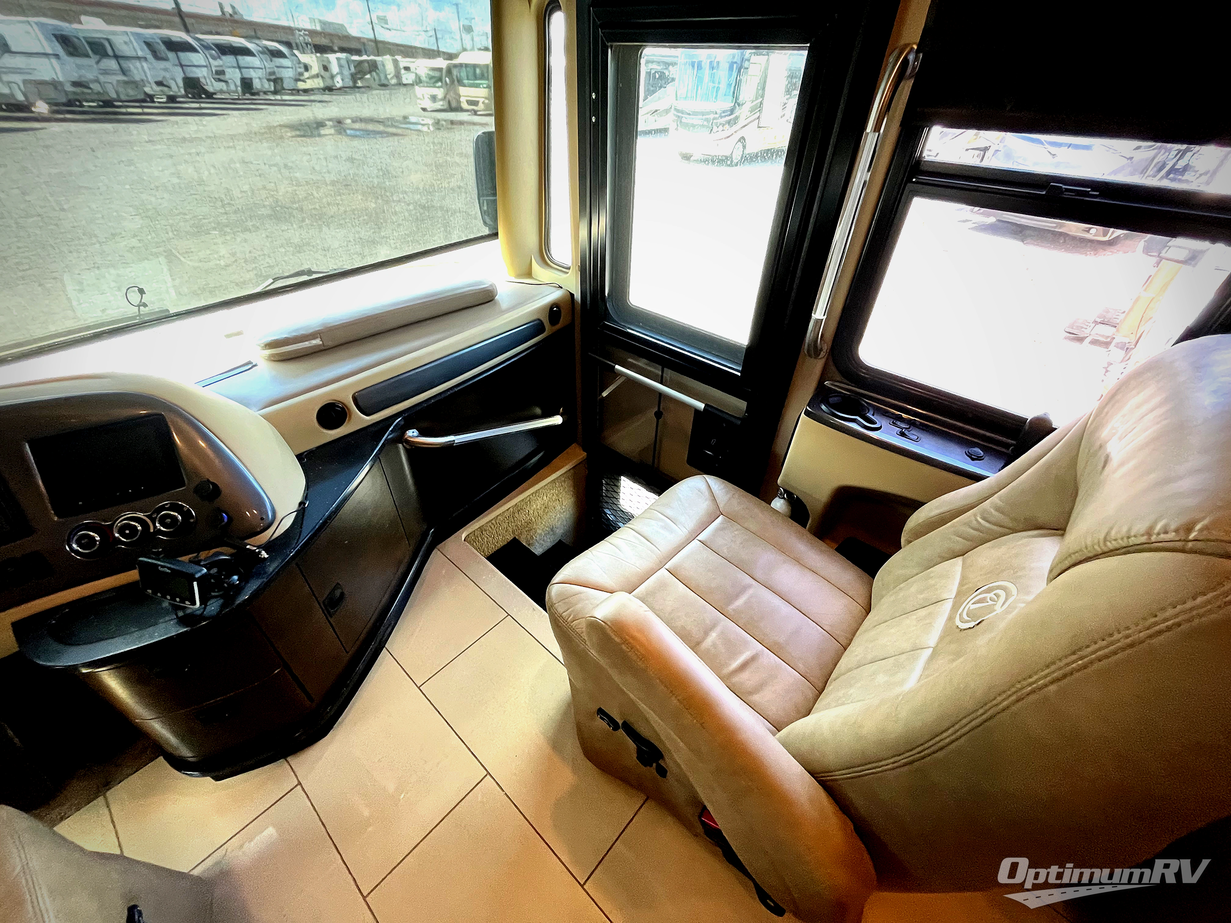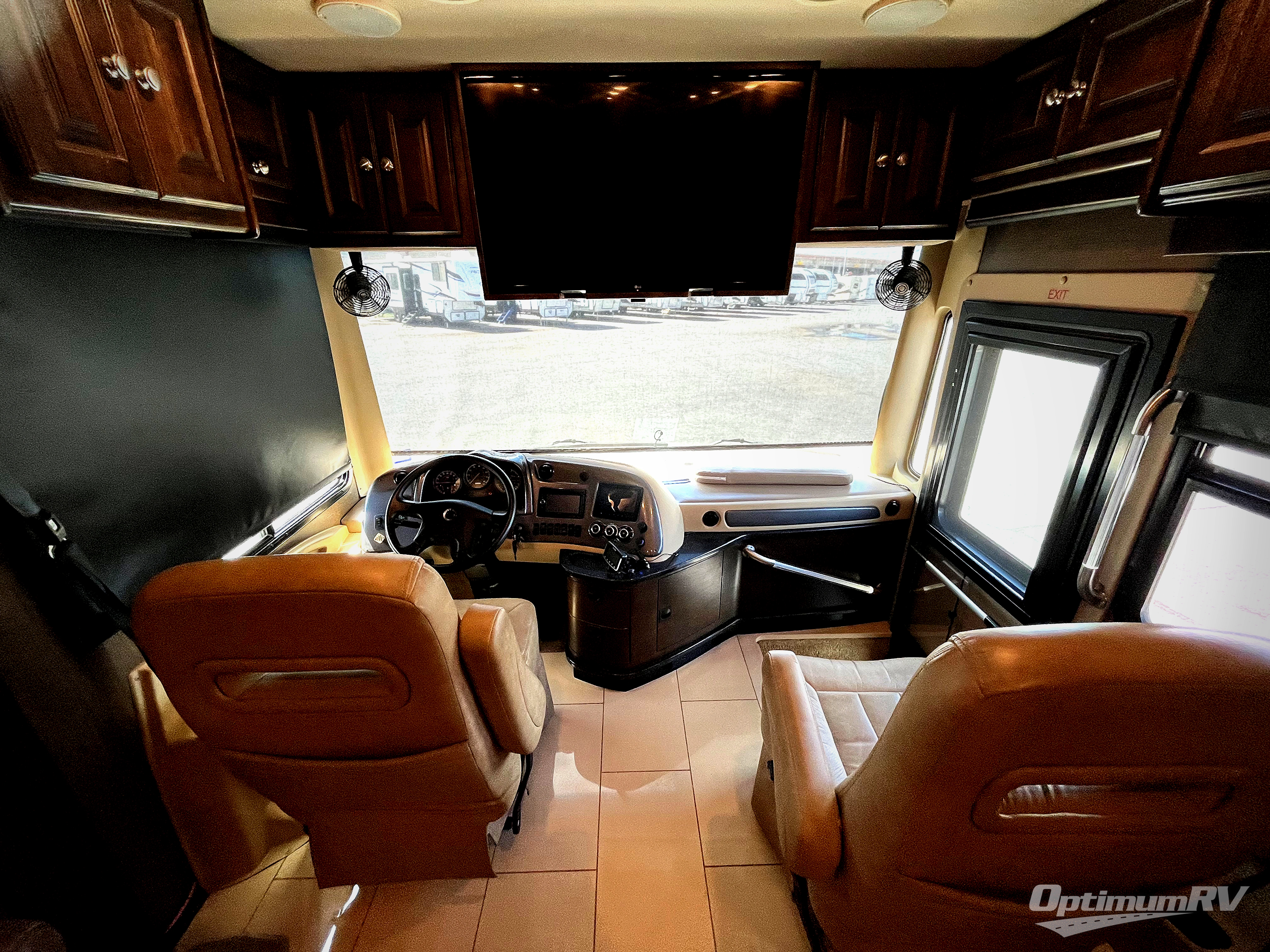 The front cab area features swivel captain and passenger chairs providing added seating when parked. There is plenty of storage in overhead cabinets along the front and both sides, plus there is an overhead TV in the cab.