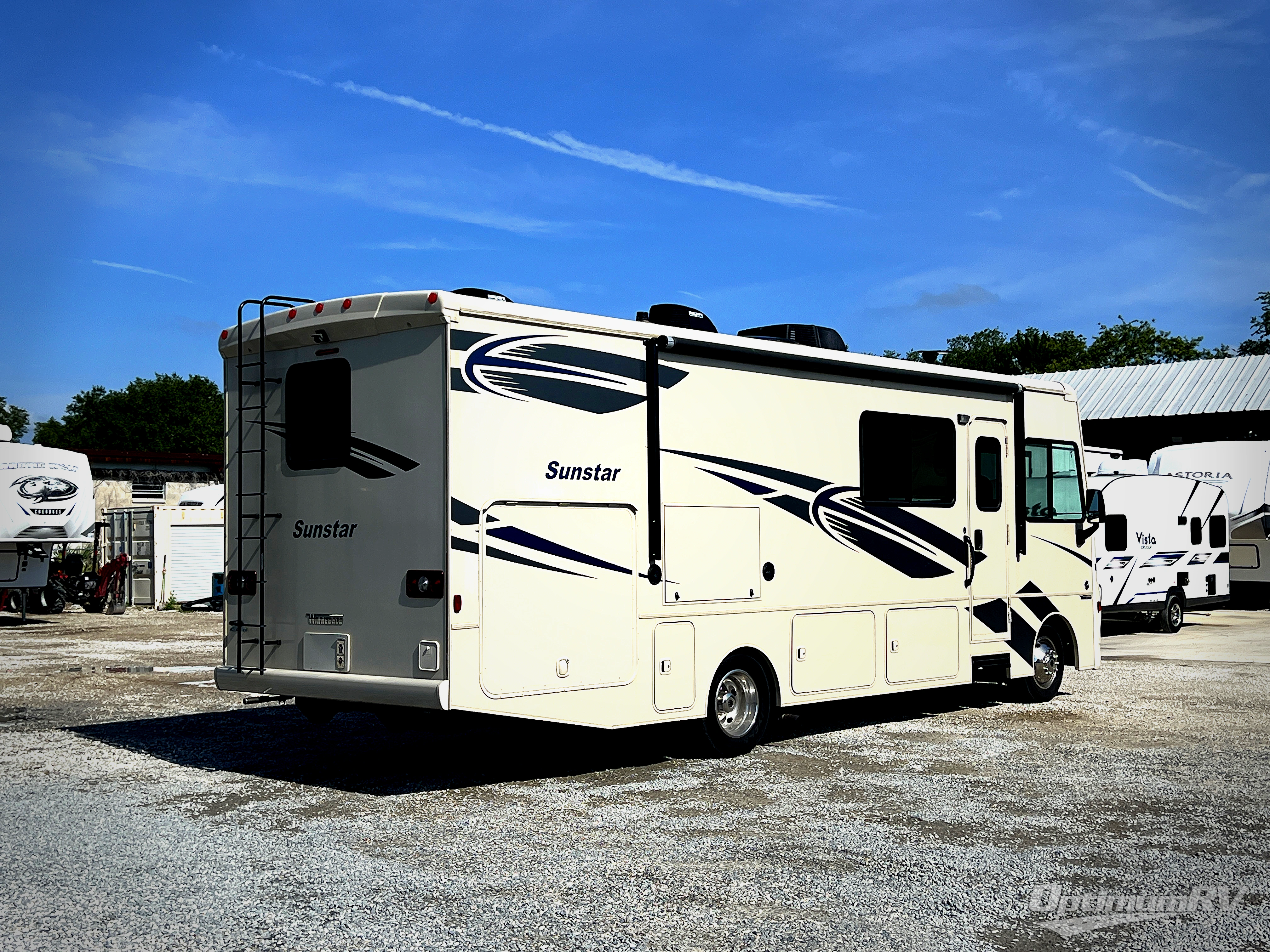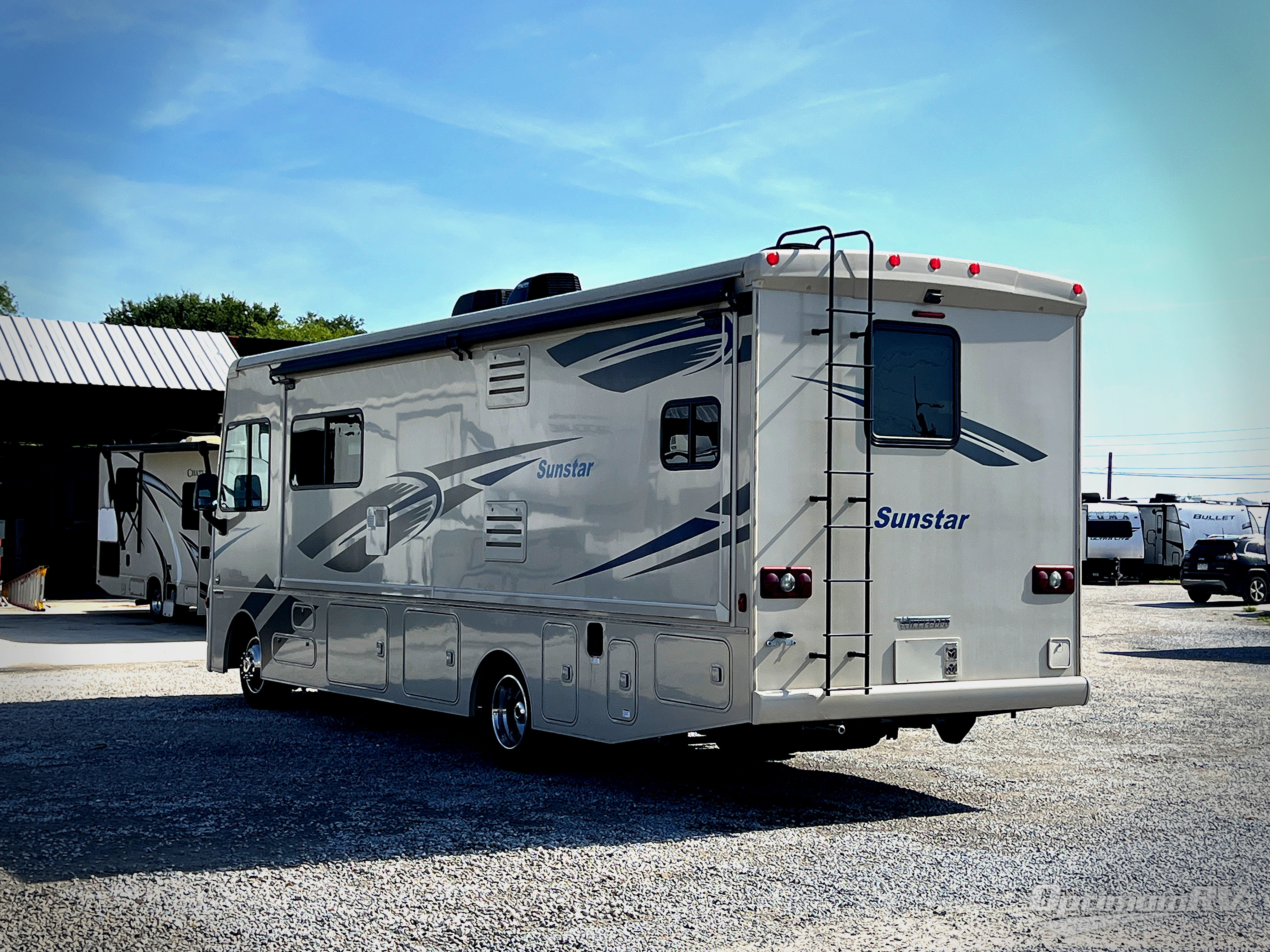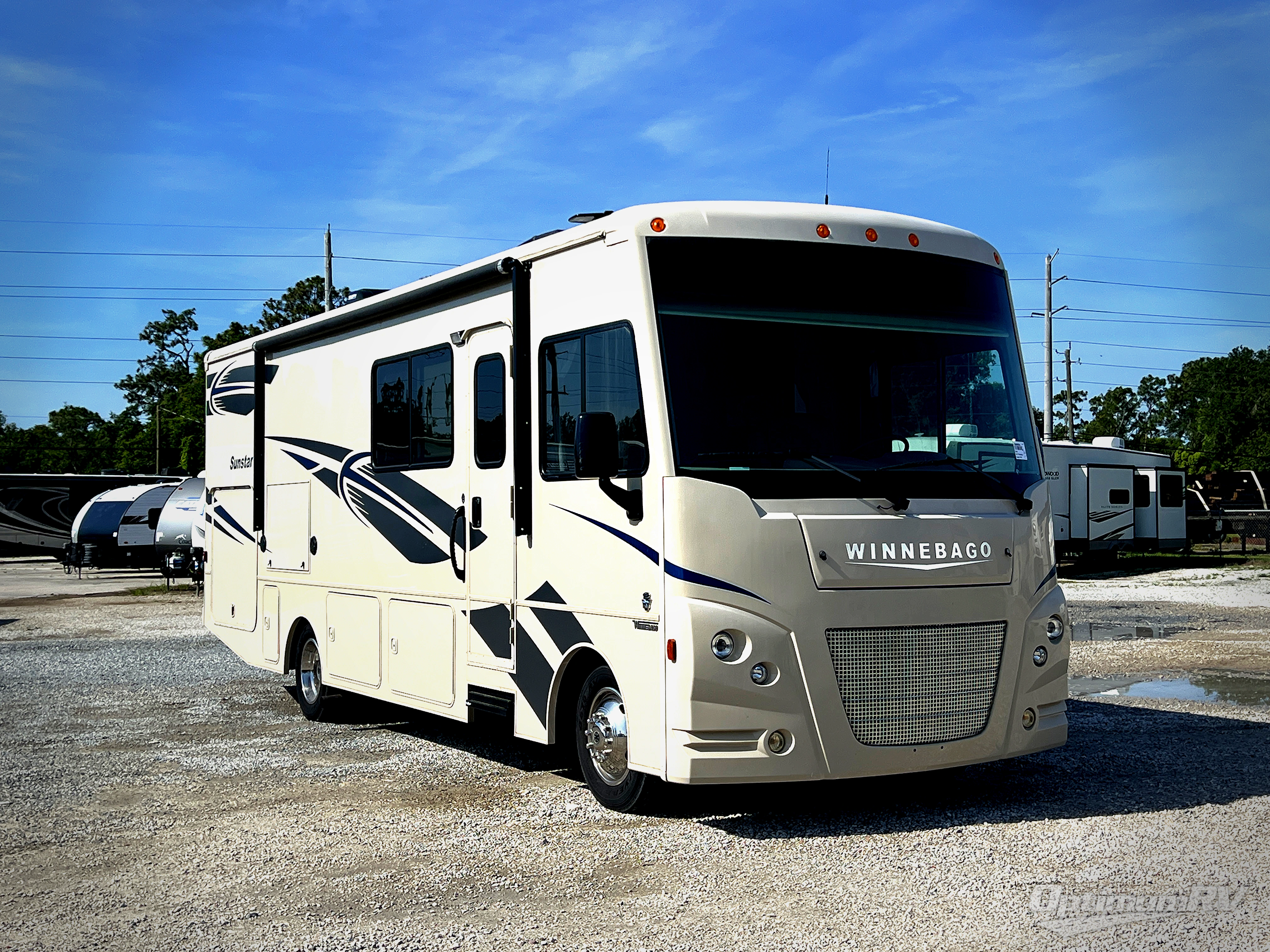 This Sunstar class A gas coach by Winnebago features a full wall slide giving it extra roominess from the front to the back.