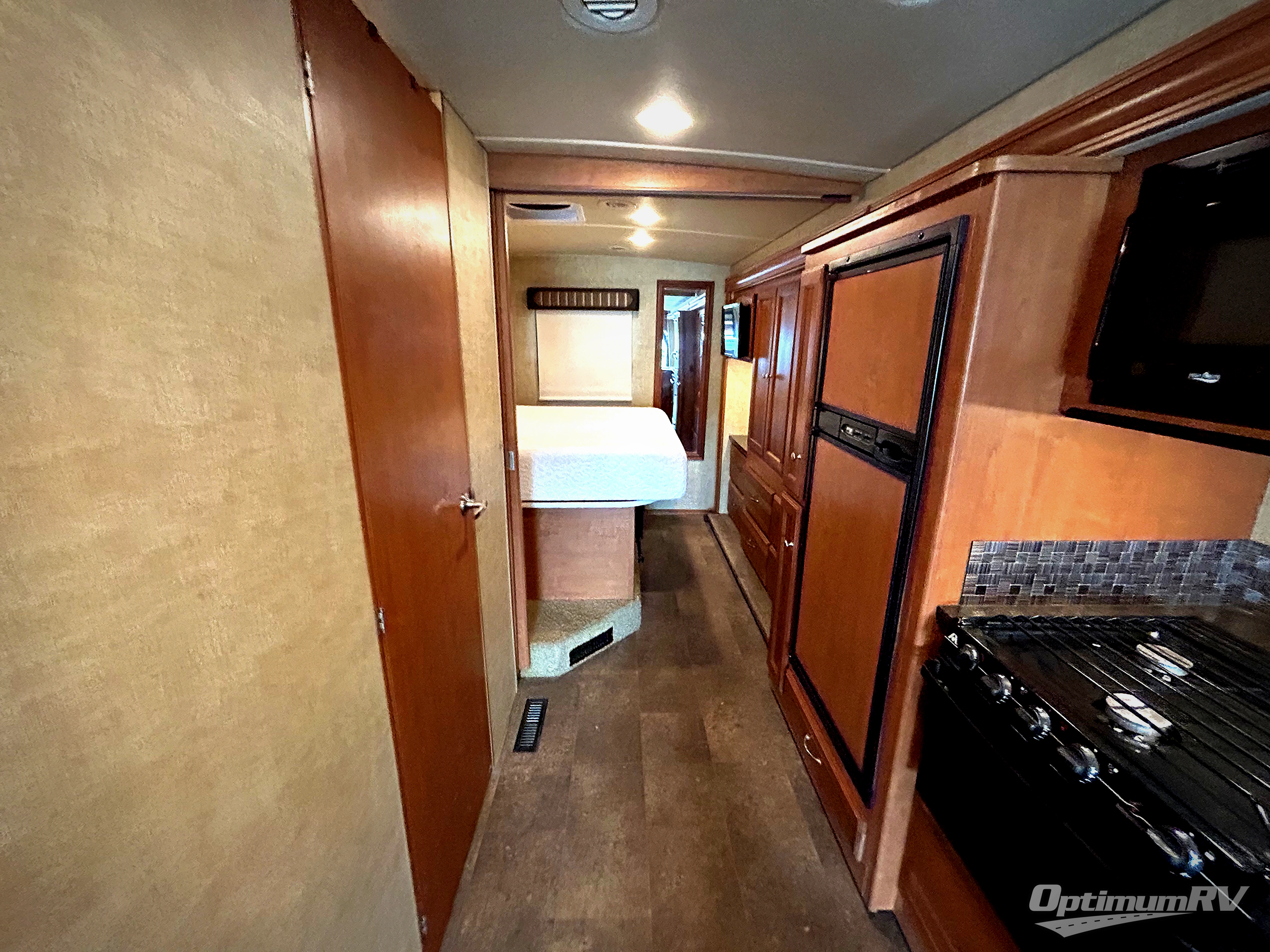 The full slide continues with the kitchen which includes a double sink, overhead cabinetry, a three burner range, refrigerator, and pantry. You will find a second pantry next to the dinette along the curb side where you will also notice a location for a 40" HDTV.