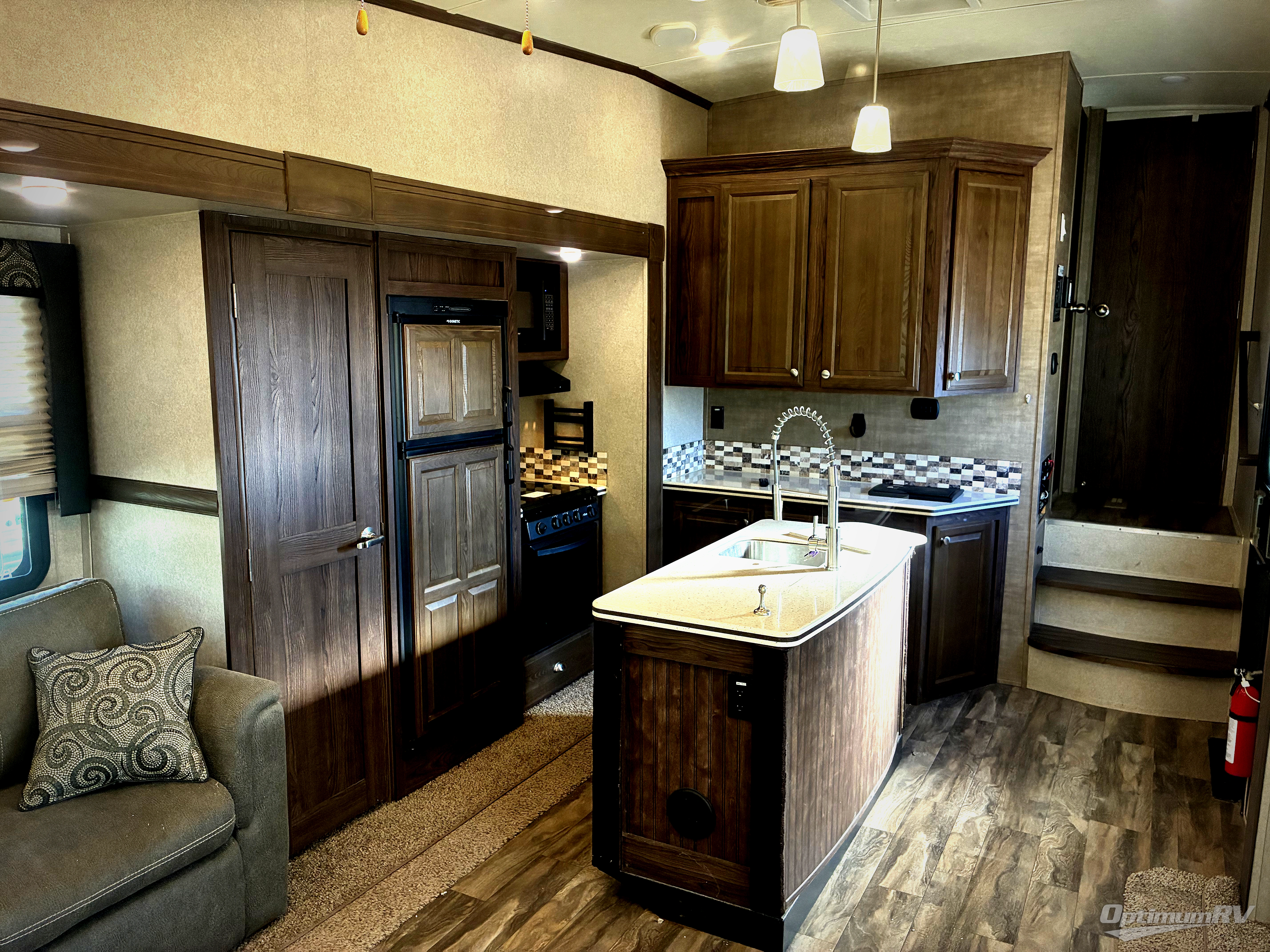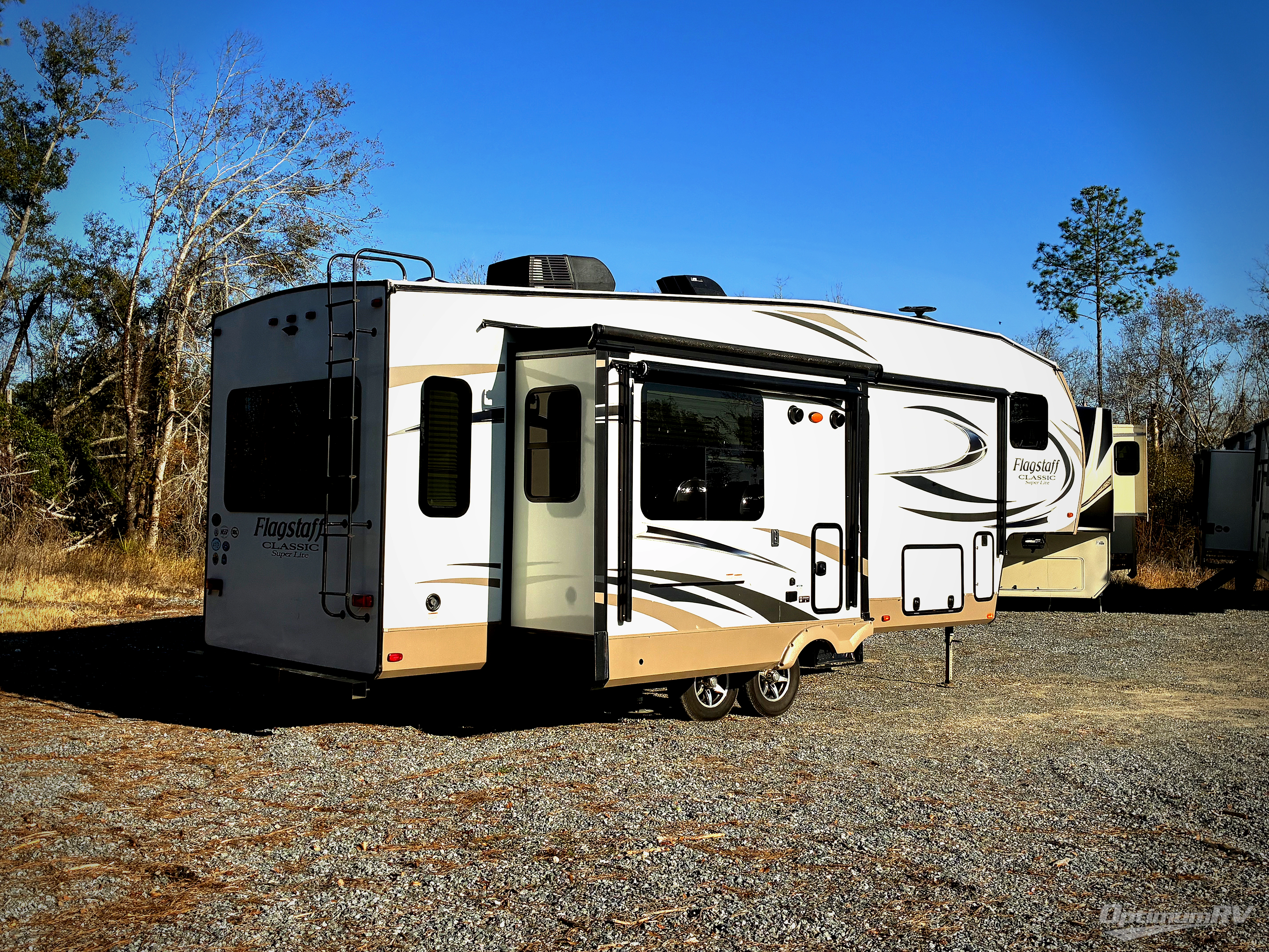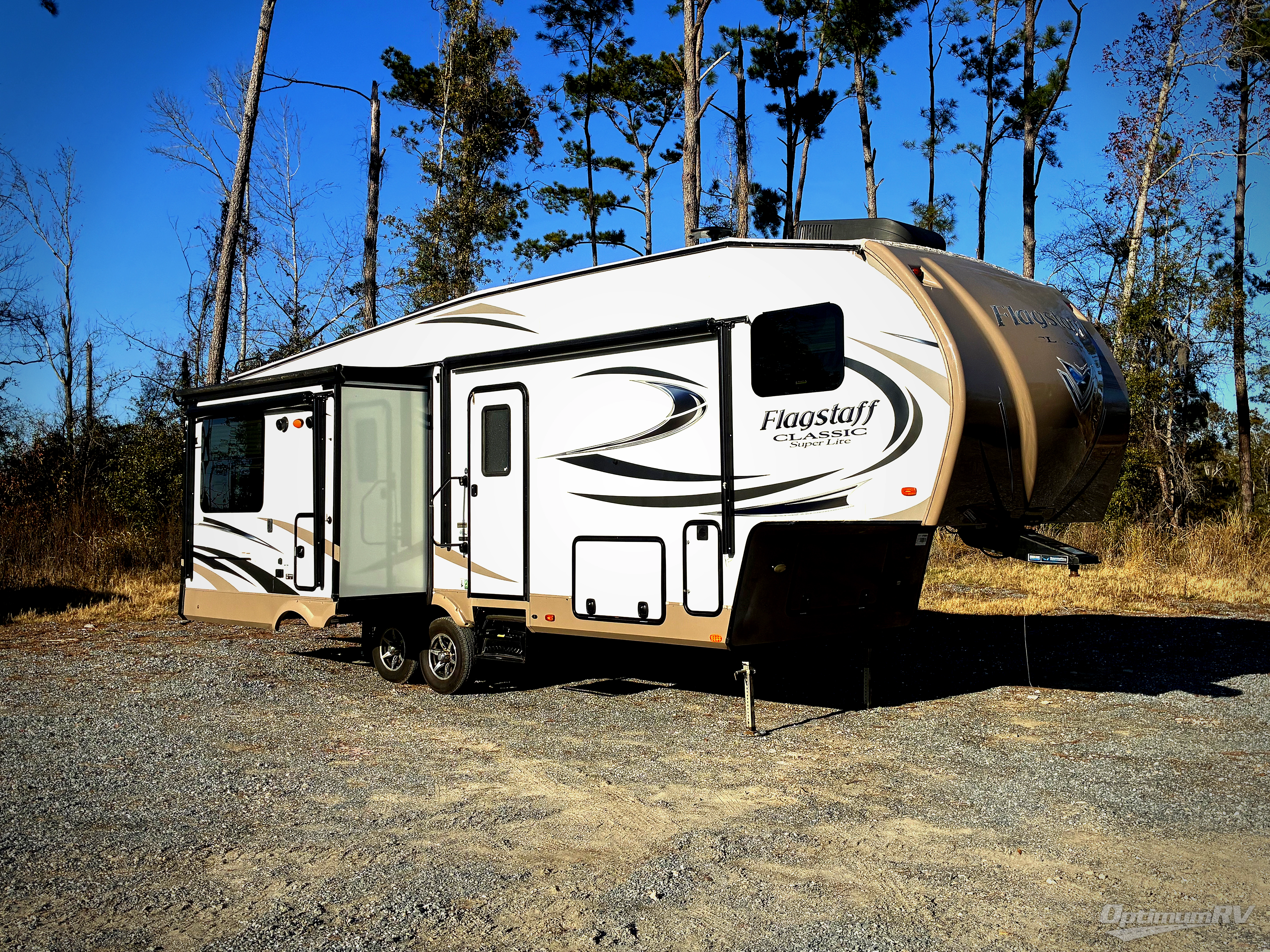 Beautiful and spacious interiors are what you will find throughout each Flagstaff Classic Super Lite fifth wheel. Each floor plan is open and inviting. You will find Driftwood interiors with a decorative cove trim along the ceiling and overhead cabinets. With the WiFi Ranger Wifi Booster you can easily stay connected with your electronic devices. There is also a digital AM/FM/DVD with "Bluetooth" technology. Along the exterior there is a radius roof with vaulted interior ceilings, a one piece seamless roofing membrane, a power awning with adjustable rain dump and LED lighting, plus so much more! The Standard Package is also available on each model which features an upgraded 22" gas oven, solid surface Corian kitchen countertops, a residential Serta mattress upgrade, and thermostatically controlled heated holding tanks, plus so much more!