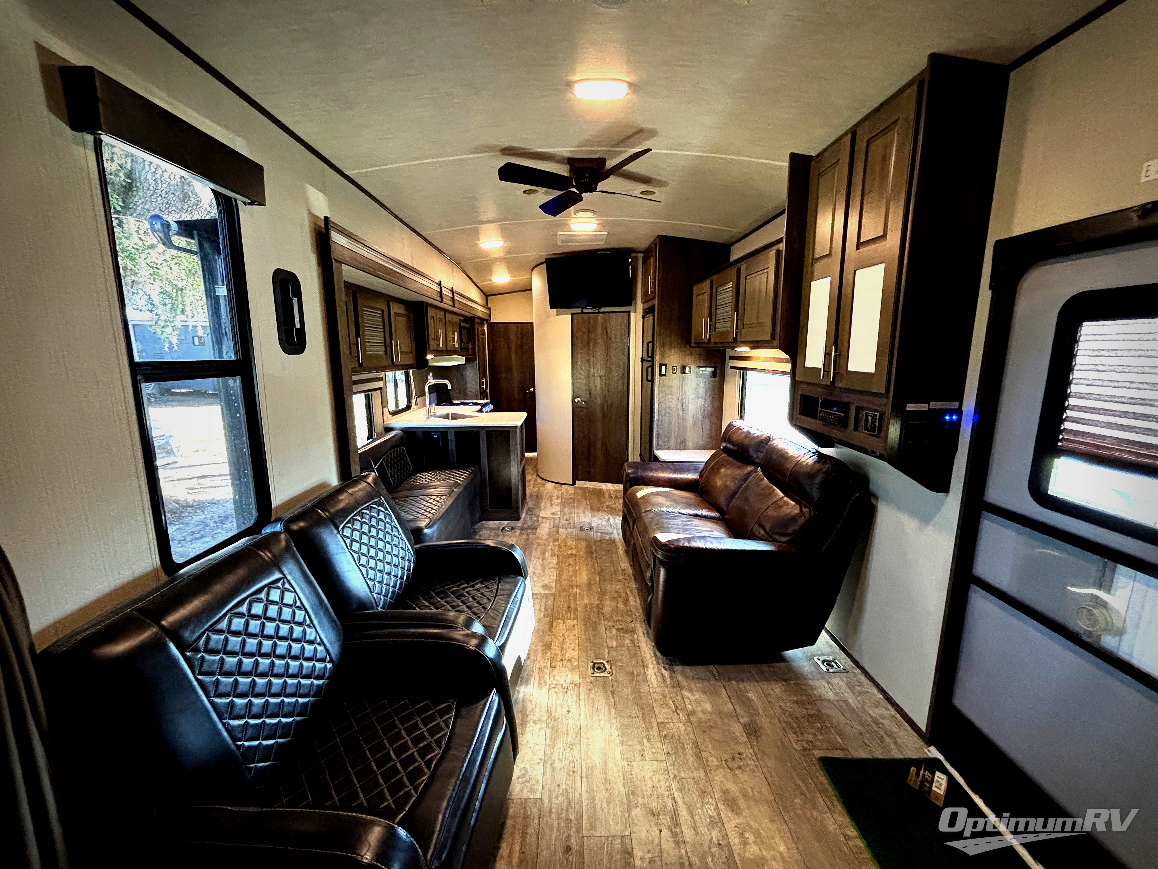 This dual entry/exit toy hauler travel trailer is something to take a look at if you are in the market for a nice large garage area for towing your toys. With up to 16' of garage space you will be able to fit a toy or two in there while you are on the road. Once you are parked and they are unloaded, you have dual opposing sofas with a dinette table in the middle that you can use for eating meals, playing games, or just relaxing. Mom and dad will have a good night's rest on the king sized bed in the private front bedroom that has a private entry door into the bathroom for convenience. There is also plenty of space for cooking up meals and cleaning up afterward.