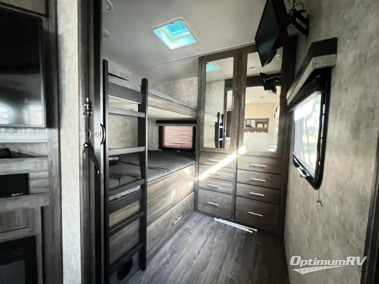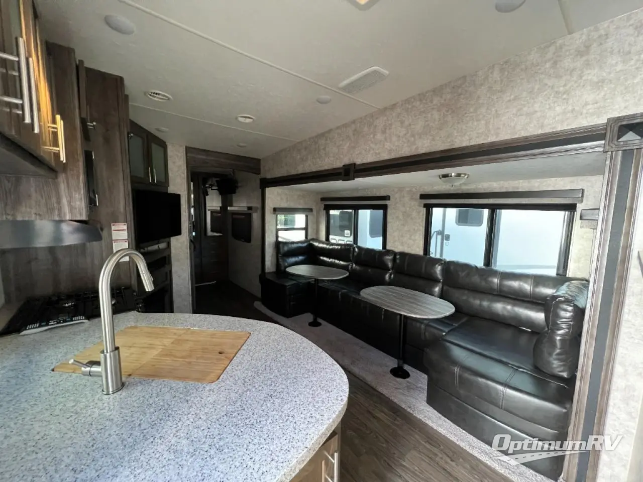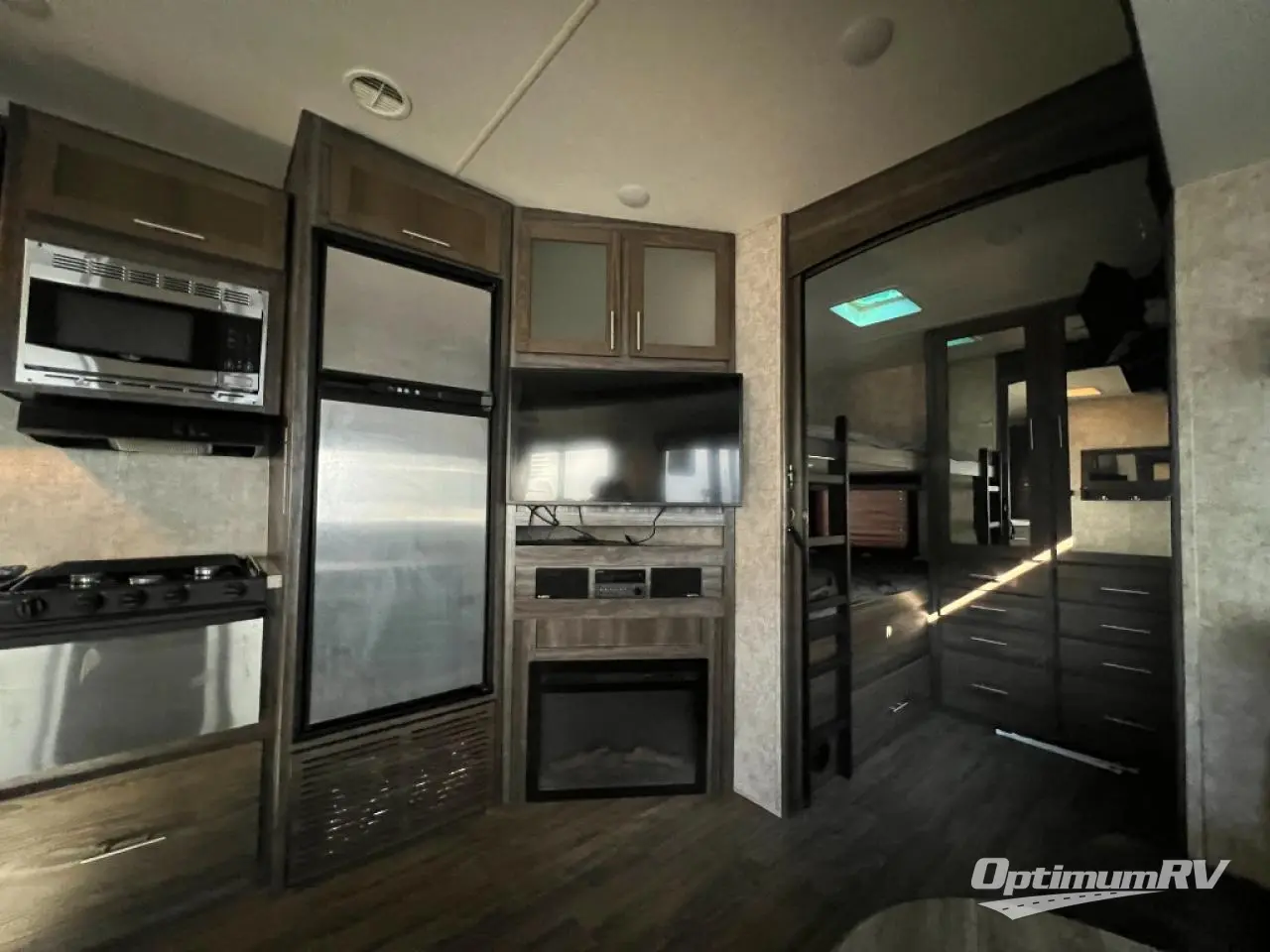 If you have been searching for a private rear bunkhouse for the kids or overnight guests, and an outside kitchen then your search if over. This Mesa Ridge Lite fifth wheel model MF2950BH by Highland Ridge offers two slide outs for more interior floor space in the living area and bedroom, plus sleeping space for 7 with the queen bed, bunk beds, and booth dinette. You can relax and unwind on the theater seats or dinette while watching the big game or a movie on the 39" LED TV. The cook will enjoy preparing meals for the family either inside or outside. The outdoor kitchen provides a two burner cooktop, sink, and more! The convenience of having two entries into the bath allows you quick entry from the hallway across from the main entrance into the fifth wheel, or from the front bedroom. So if you are a family of 7 or enjoy having overnight guests, this Mesa Ridge Lite is perfect for you!