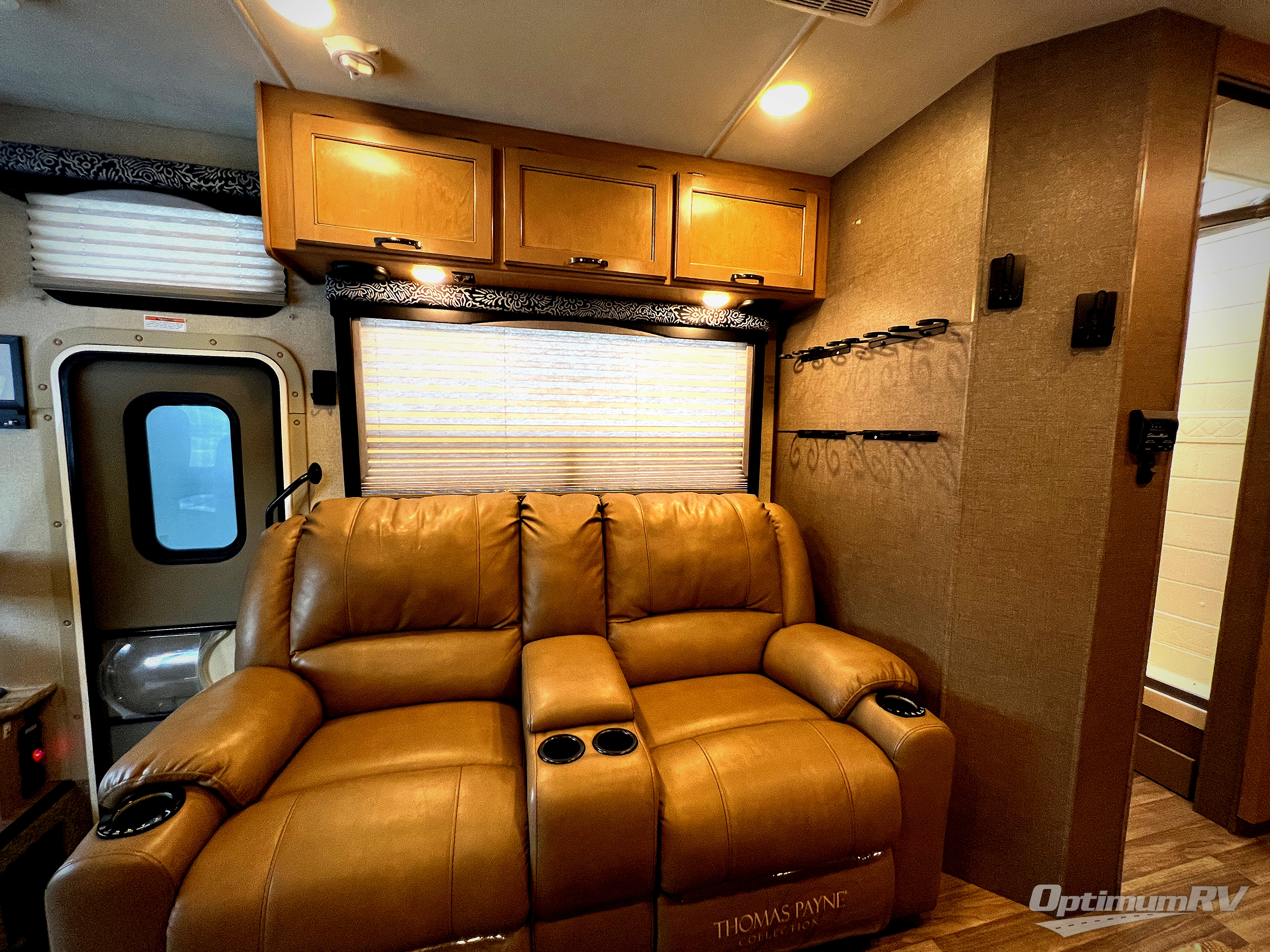 Step inside behind the front passenger seat and notice the spacious interior with a large driver's side slide out fully extended. There is a jack-knife sofa to the left of the main door. Opposite find a booth dinette with 40" LED TV overhead. The dinette features two sets of seat belts, with two more on the jack knife sofa so your backseat travelers can be safe while moving down the road.