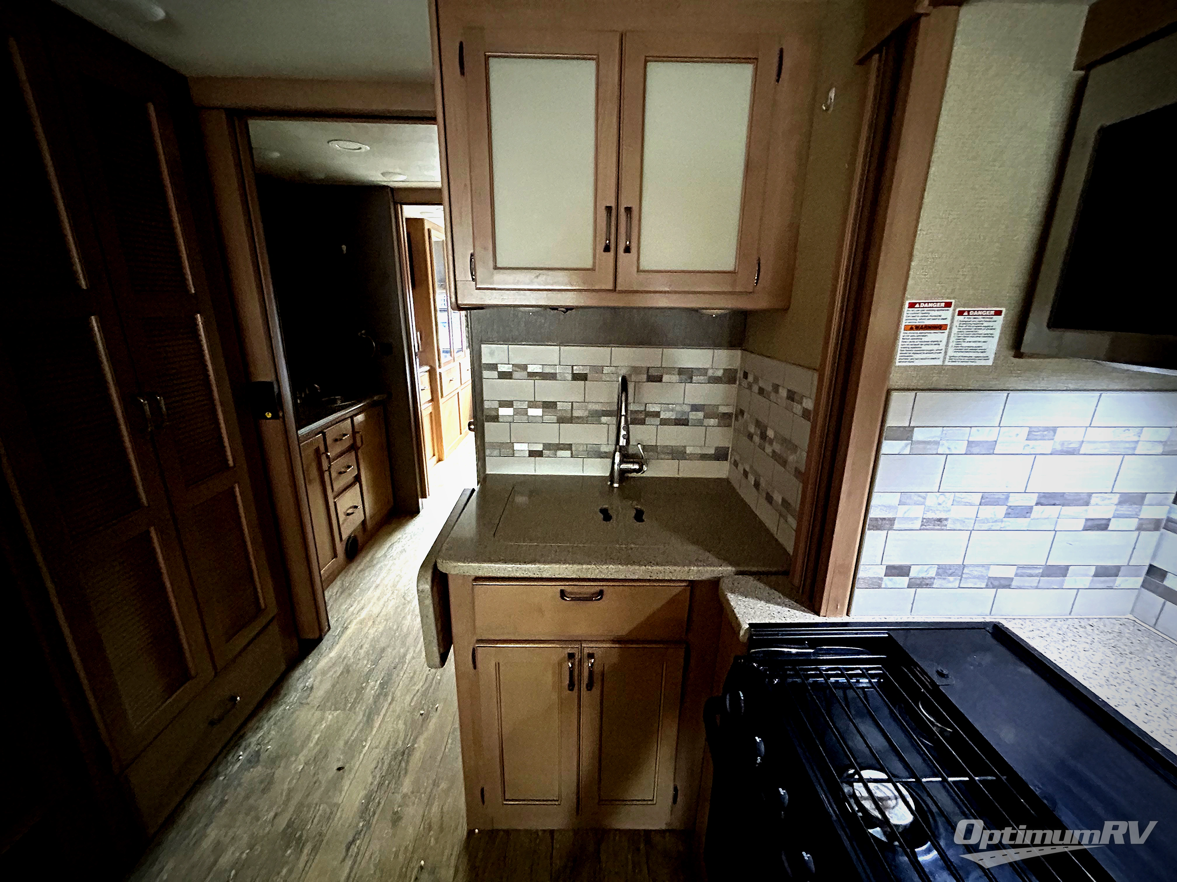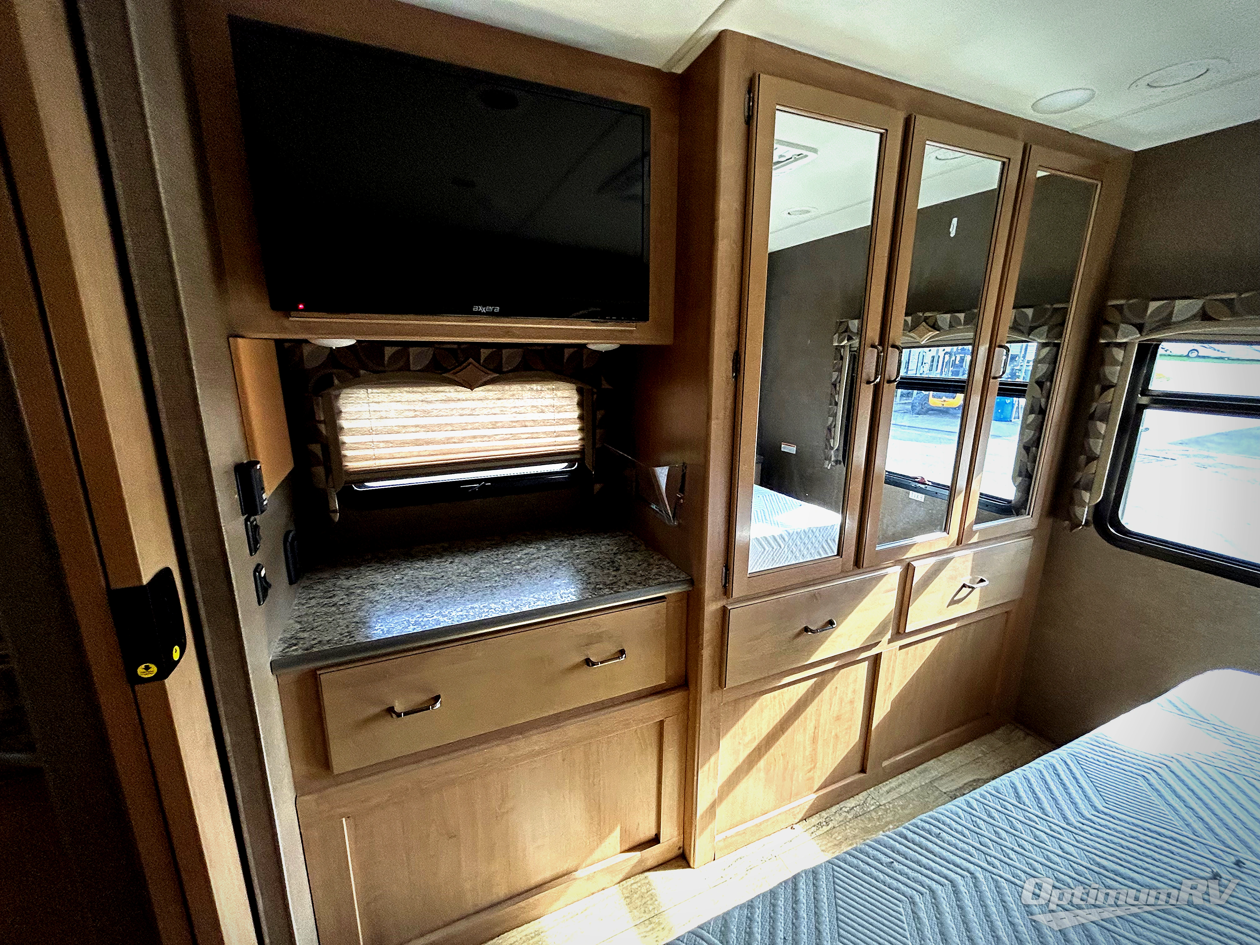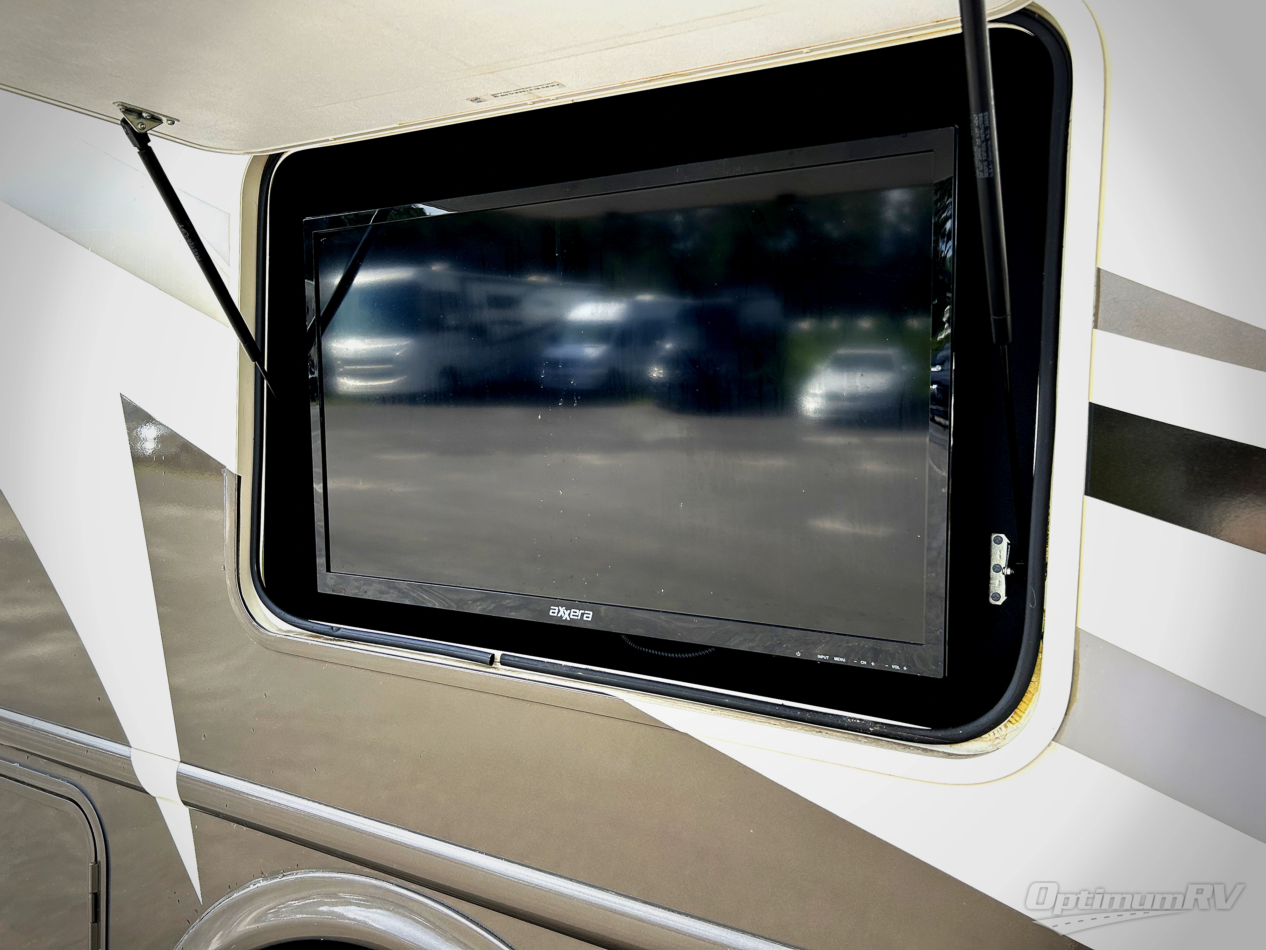 Travel in comfort, and camp like you never left home, in this Hurricane Class A gas coach model 34P. As you enter, you will notice there are two slides for added foot traffic space, some nice residential touches, and even a king size bed in the rear private bedroom! When dining or relaxing you can enjoy the 40" LED TV above the dinette and above the cab area, you will find a drop down overhead bunk that sleeps two with a 54" x 74" area which makes this unit easily sleep seven! A sliding pocket door then leads you back into the master bedroom beyond a walk-through bath. You will find a king size bed and a large wardrobe along with a 32" LED TV for watching a TV show before bed. On the outside, you will find a handy exterior kitchen for cooking outdoors, plus an exterior 32" LED TV for some outdoor entertainment.
