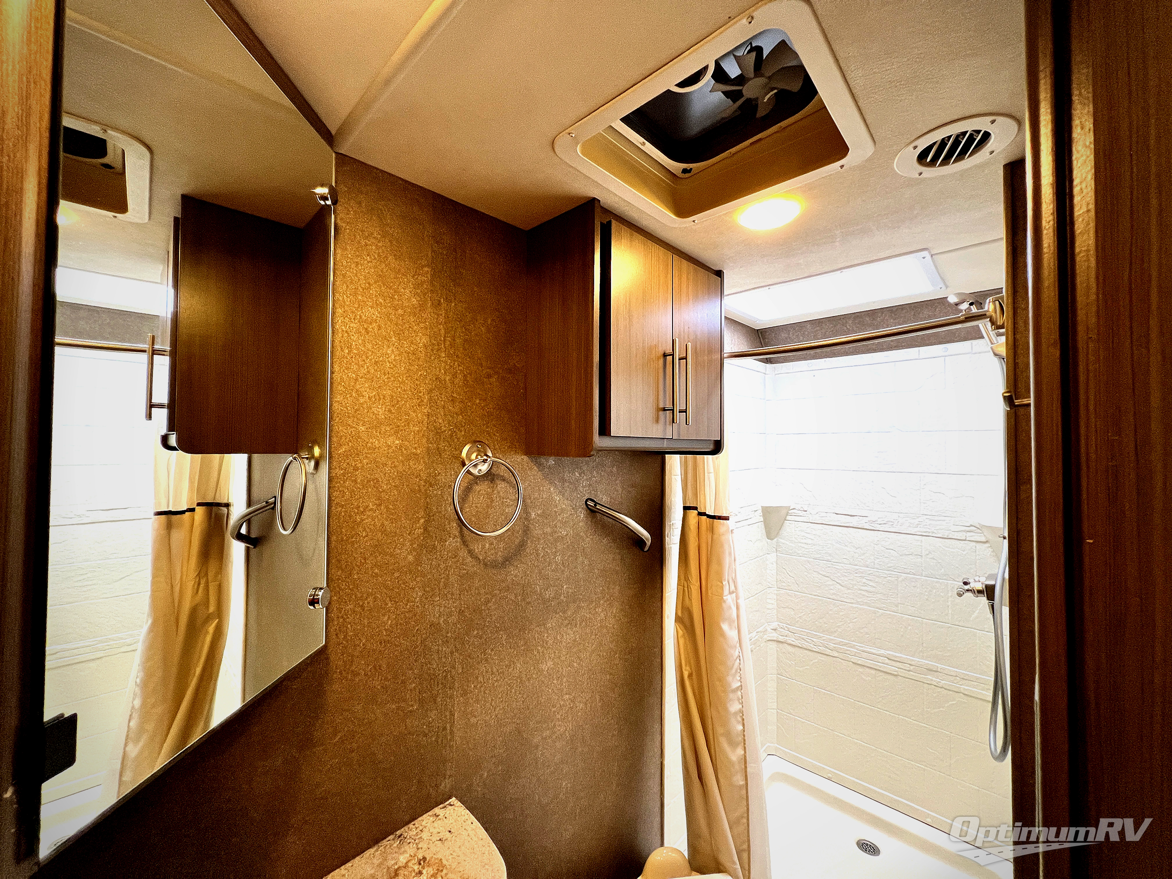 A rear private corner bathroom includes a shower, a toilet, sink, and overhead cabinets. You will love the convenience of your own on board bathroom!