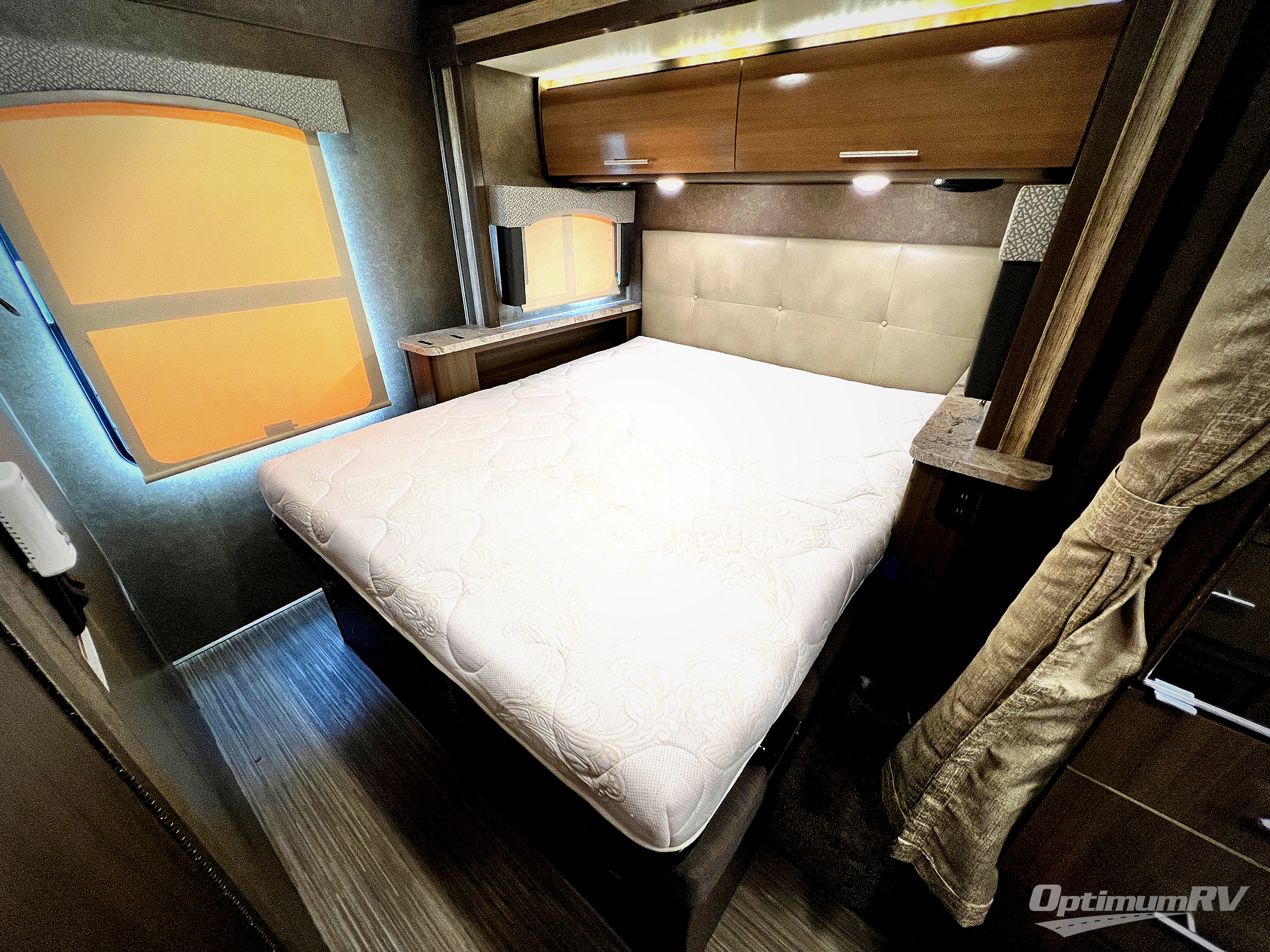 Slide open the doors to enter the private rear bedroom. Here you will find plenty of clothing space in the two closets that are opposite one another. Enjoy a great night's rest on the flip-up queen bed slide which is along the road side wall. The cushioned seating underneath allows for more space to relax and unwind. A 32" LED TV is on the opposite wall for easy viewing either laying down or sitting.