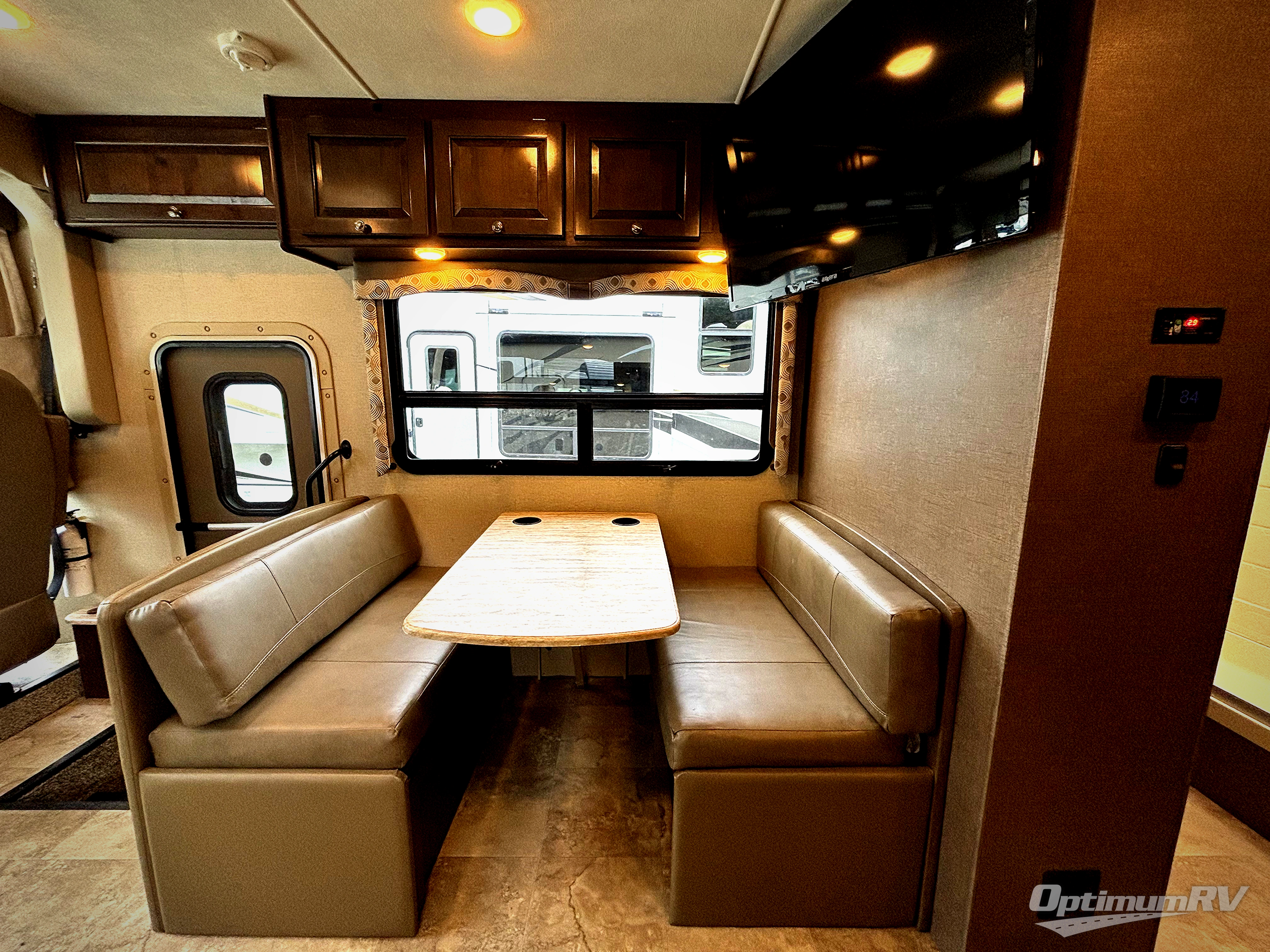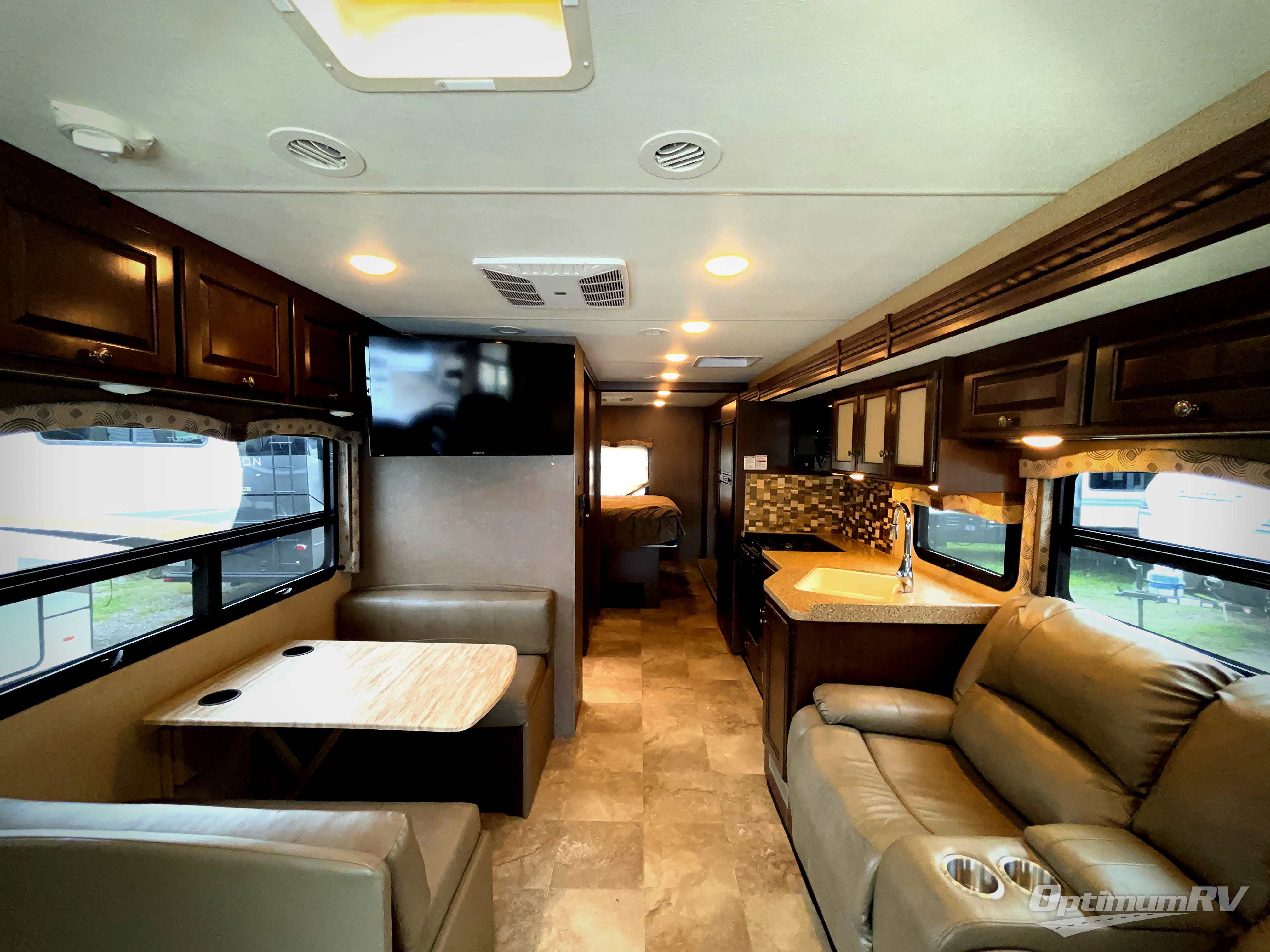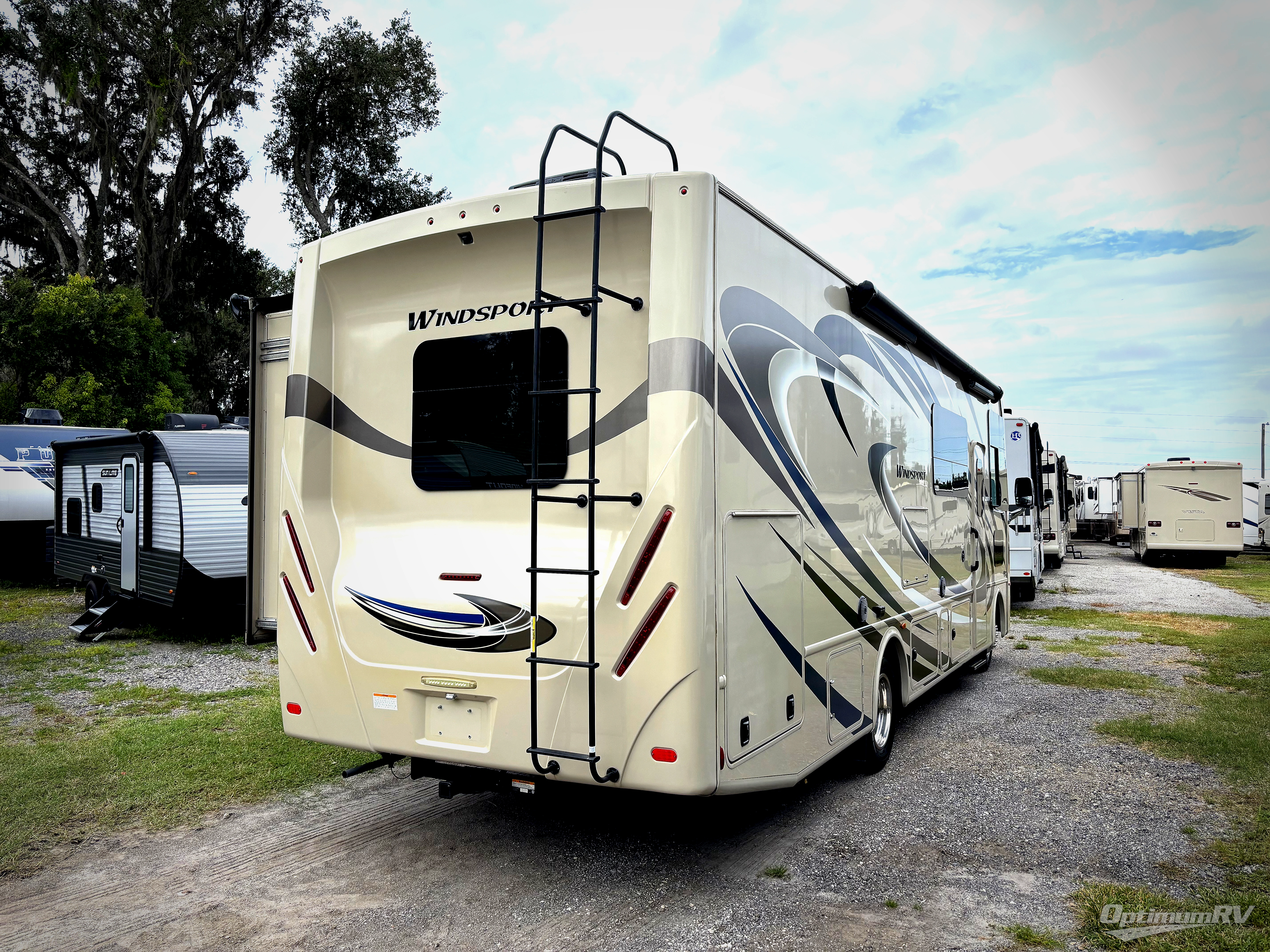 You will find much to love about all Windsport models whether you are out for a long road trip across the country, or a weekend tailgating party close to home. All Windsport models feature Leatherette furniture, solid surface countertops, and raised panel upper cabinet doors with nickel finish hardware and glass inserts on select doors. You will also find added sleeping space in the drop-down cabover bunk that the kids are sure to love. With the swivel and reclining captain's chairs you can easily bring them into a conversation area in the living space once parked, and there is a dash workstation with 110-volt and 12-volt outlets at the passenger side for those who need to do a bit of work while traveling, or for those who just enjoy surfing the internet. On the outside, enjoy Robocast storage compartments, an outdoor shower, plus a 32" LED TV on a manual swivel, and a legless lateral power awning with integrated LED lighting. Make any Windsport class A gas motor home by Thor Motor Coach your new home-away-from-home today!