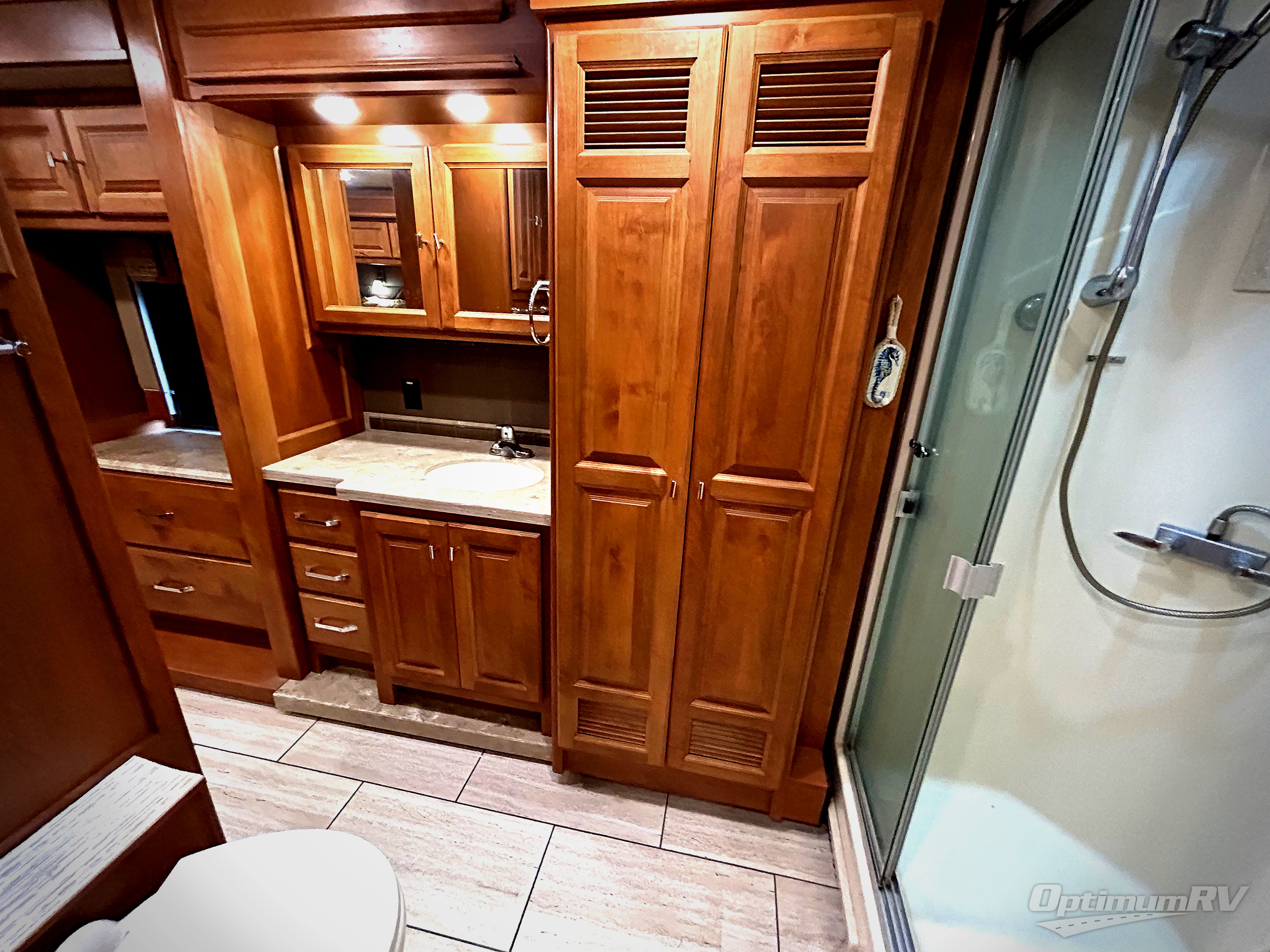Enter into the rear bedroom and find a slide out with a queen bed or optional king, nightstands, and an overhead cabinet along one side. Along the rear wall of the room, there is a TV for your enjoyment. Across from the bed, there is a slide out with a wardrobe, overhead cabinet with drawers below, and continuing into the bathroom the slide has a sink, and an optional washer/dryer. The bathroom also has a shower, linen cabinet, and toilet. You will find easy access to the bathroom from either the hallway or from the bedroom.