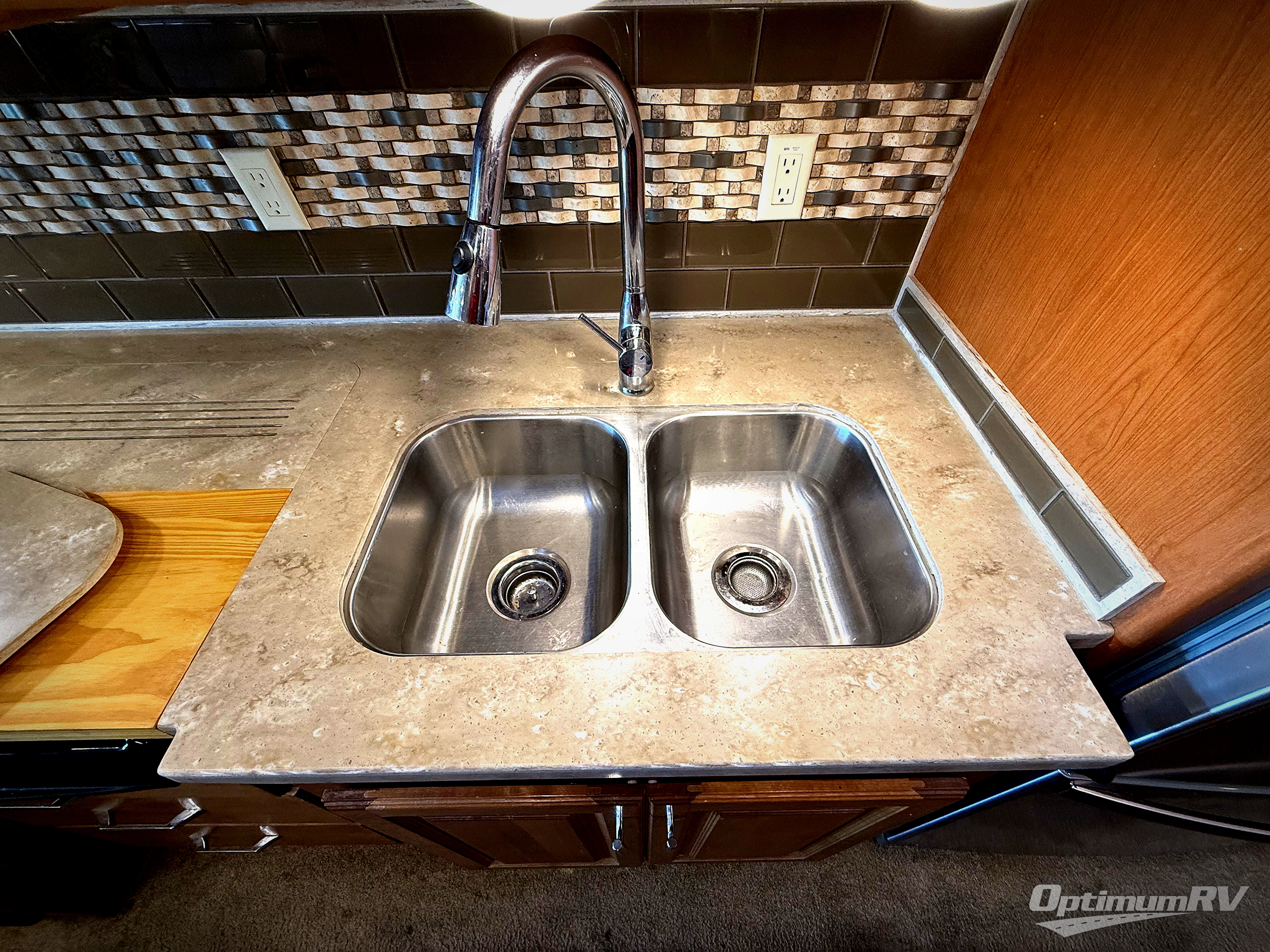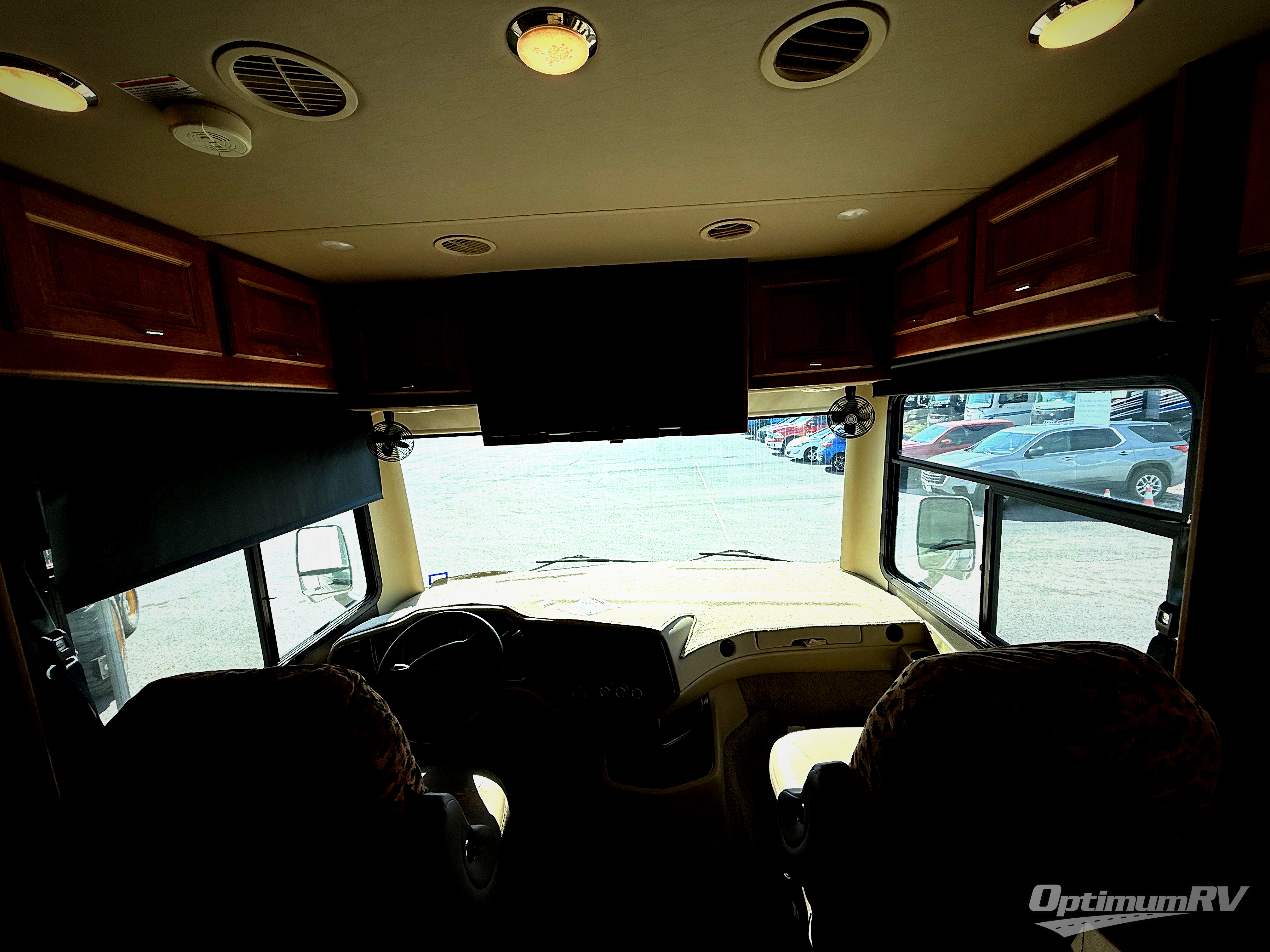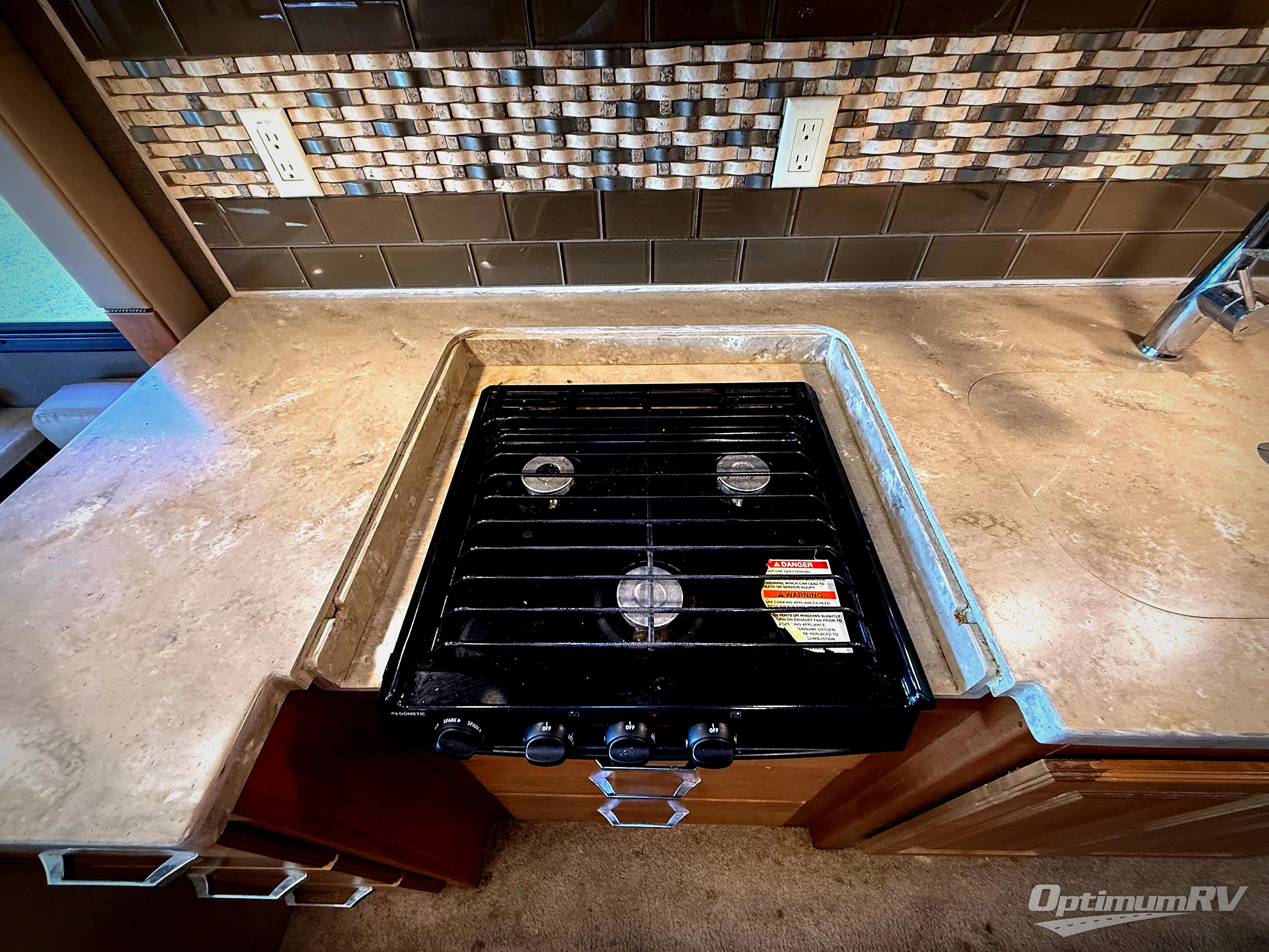 As you enter this motor home, you will find that there are two slide outs in the main living area. The first slide out has a booth dinette, three burner range, microwave, double kitchen sink, overhead cabinet for dishes, and a refrigerator. In place of the booth dinette, you can choose to have an optional dinette with a computer work station. The slide opposite has a sofa bed or you can choose an optional L-shaped chaise sofa bed with coffee table. Adjacent to the slide you will find a TV, and in the cab, there are comfortable seats, overhead storage on either side and a TV.