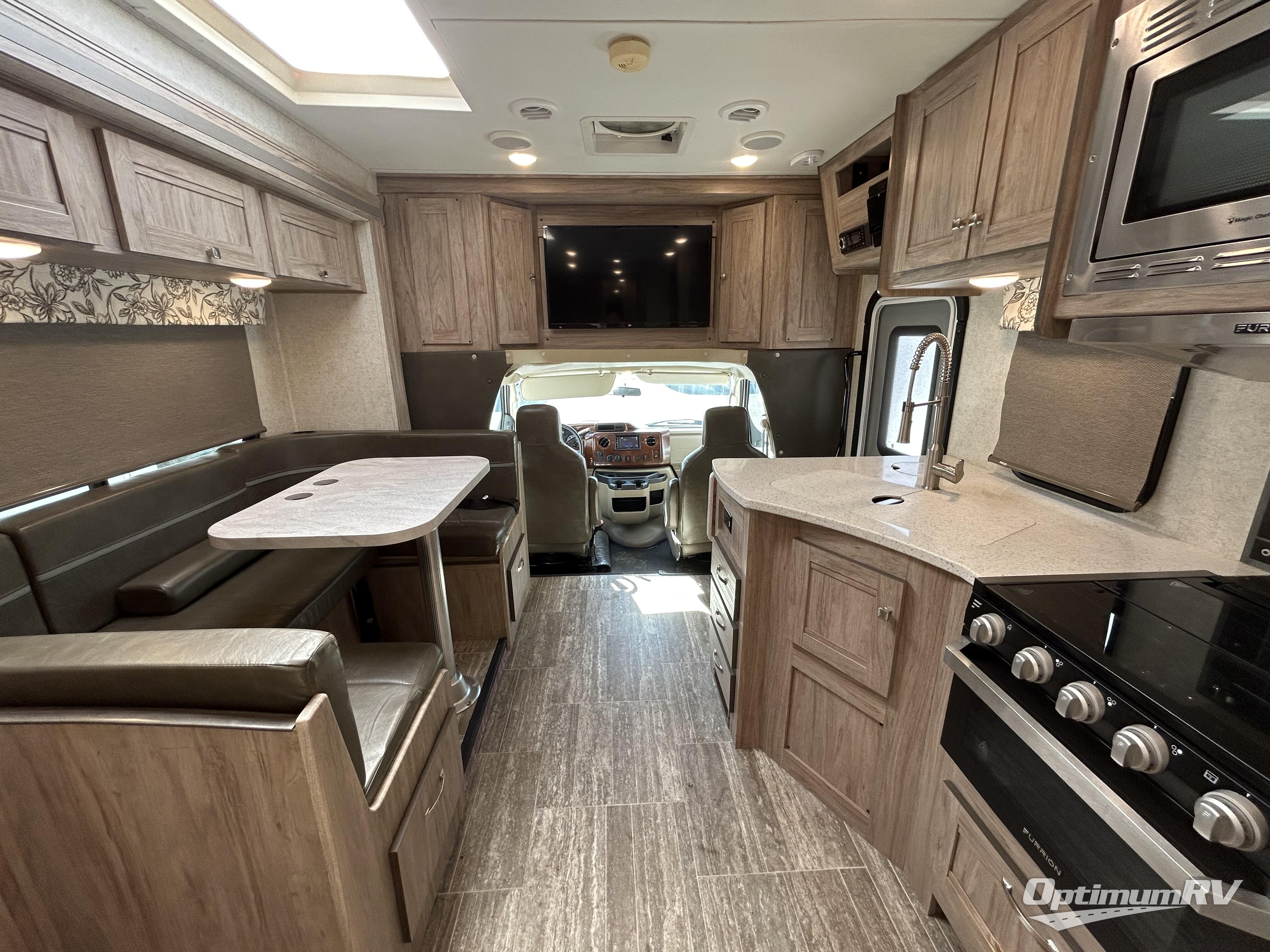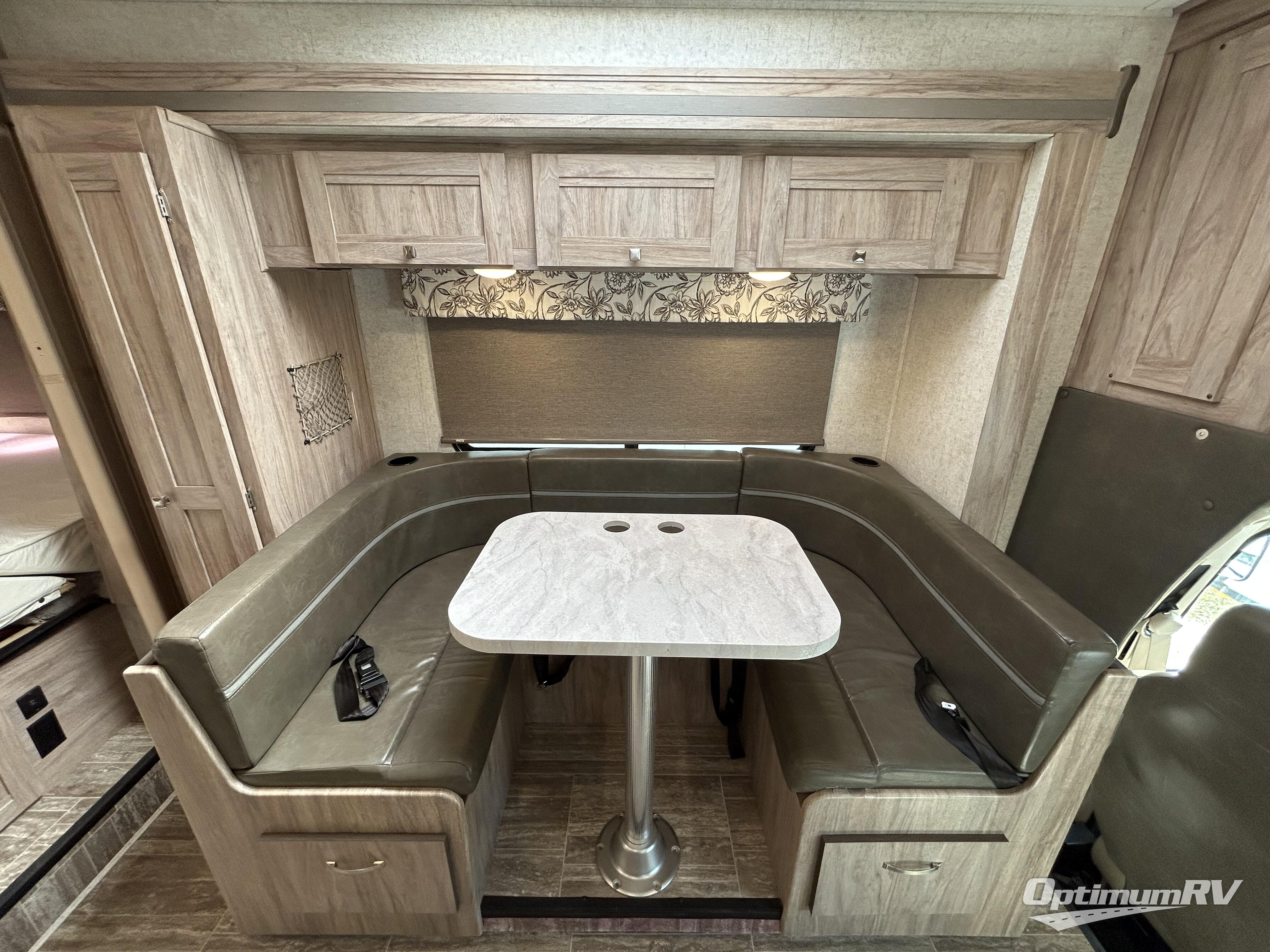 Easily take this class C motorhome on your next tailgate or camping adventure. You have a full bath in the rear for some privacy. The toilet is separate from the rest of the bath so you can use both rooms at the same time. The u-shaped dinette has seatbelts for keeping your guests safe while you are on the road. It also folds down into a place for sleeping at night if needed. You can sleep up to five or six individuals using the bunk over the cab, the queen bed, and the dinette. You have the option to add an optional 28" TV outside if you wish.