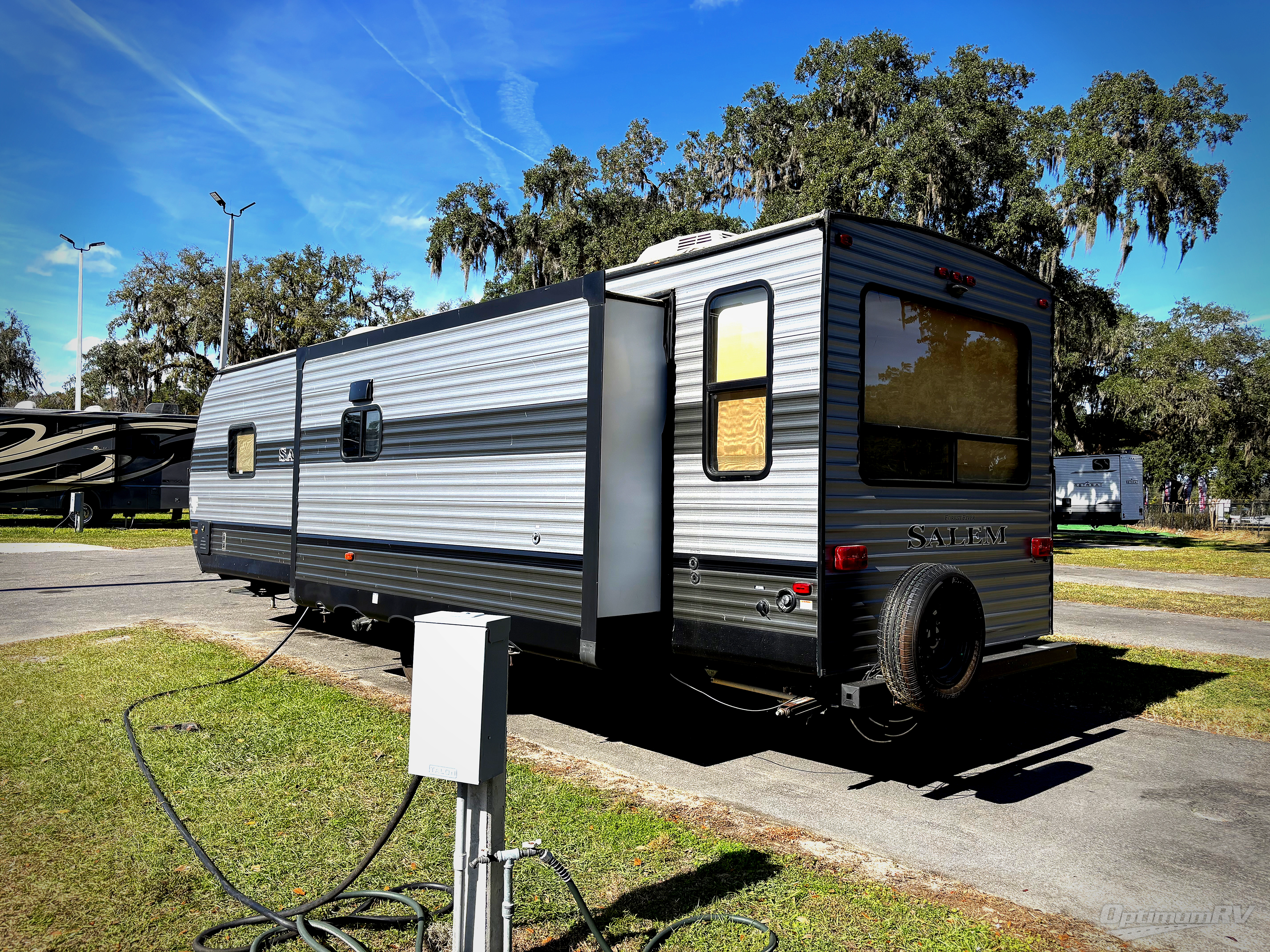 Come start your next camping trip with comfort and ease when you have this Salem travel trailer by Forest River. This model features dual opposing slides which help to open up the floor space. Along the rear wall is a Jiffy sofa, and more seating can be found on the two recliners and booth dinette within the curbside slide out. In the evening you can have a fire in the fireplace while you read a book or plan out tomorrow's adventures. Everything that you need to create your meals can be found in the kitchen, like the three-burner range and residential sink on the island. Outside you will find two awnings that will provide as much shade as possible for you!