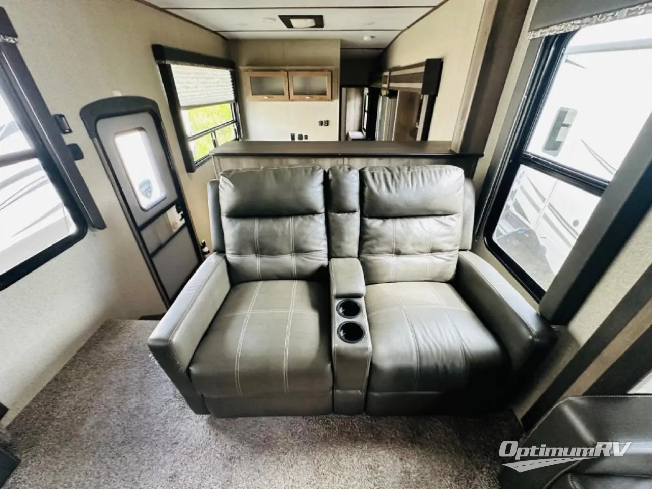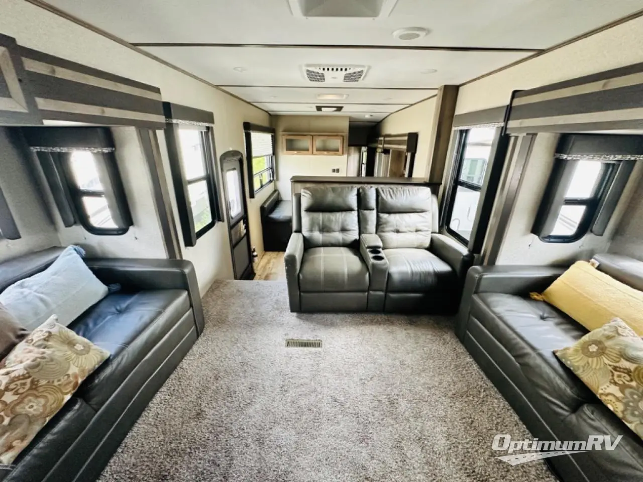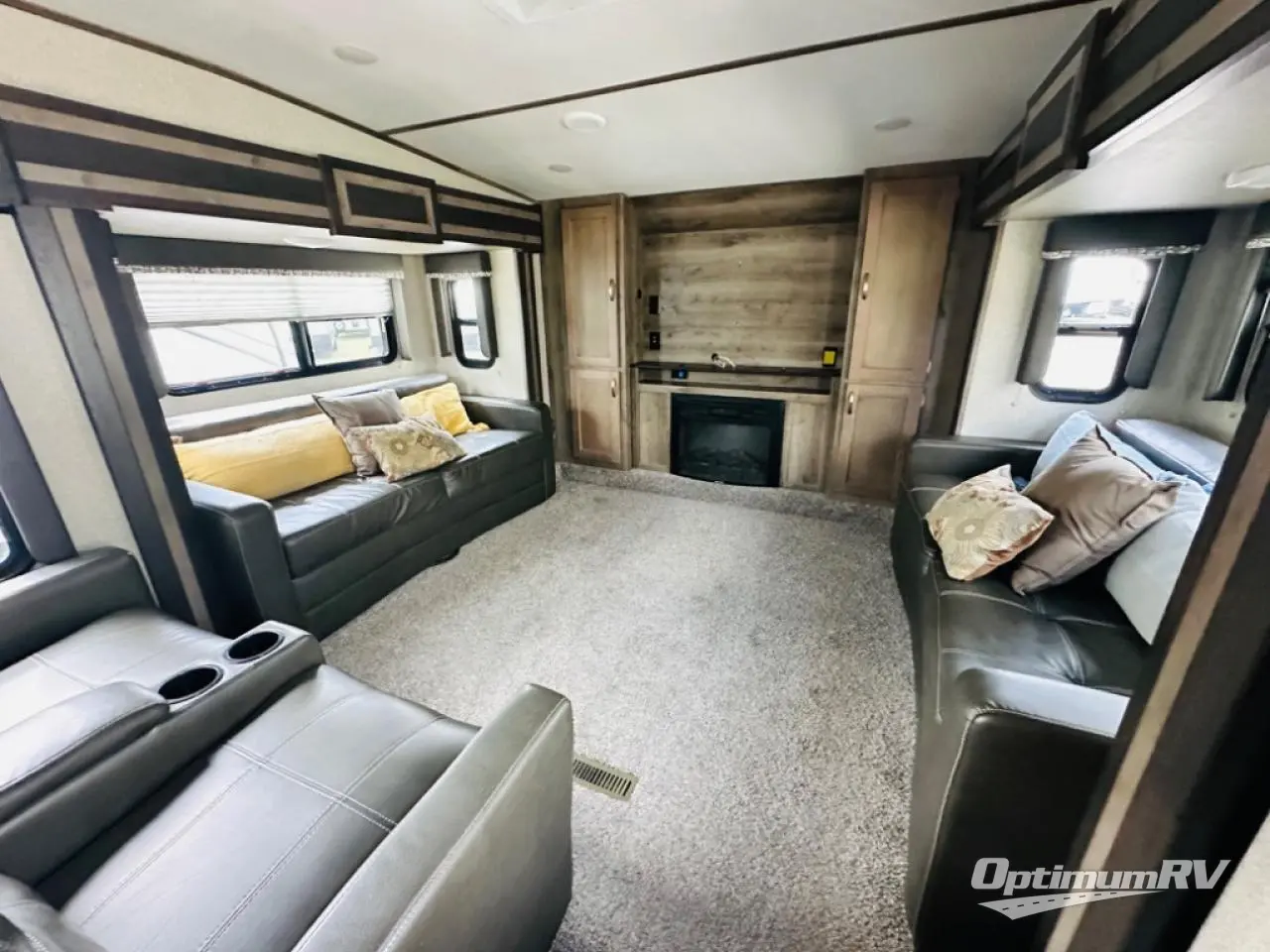This fifth wheel could be your home away from home with a separate living area, quad slides throughout and a fireplace for those chilly nights. The front living area offers two opposing queen size tri-fold sofa slide outs, reclining theatre seats, and a 50" HDTV with a HDMI entertainment center. This area can also double as a sleeping space for the kids or grandkids. Just imagine the third slide out including the king bed, and the bathroom giving you two access points, plus there a wardrobe next to the pantry in the kitchen slide. The unique dinette offers bench and chair seating to play games and dine at. Your search can be over!