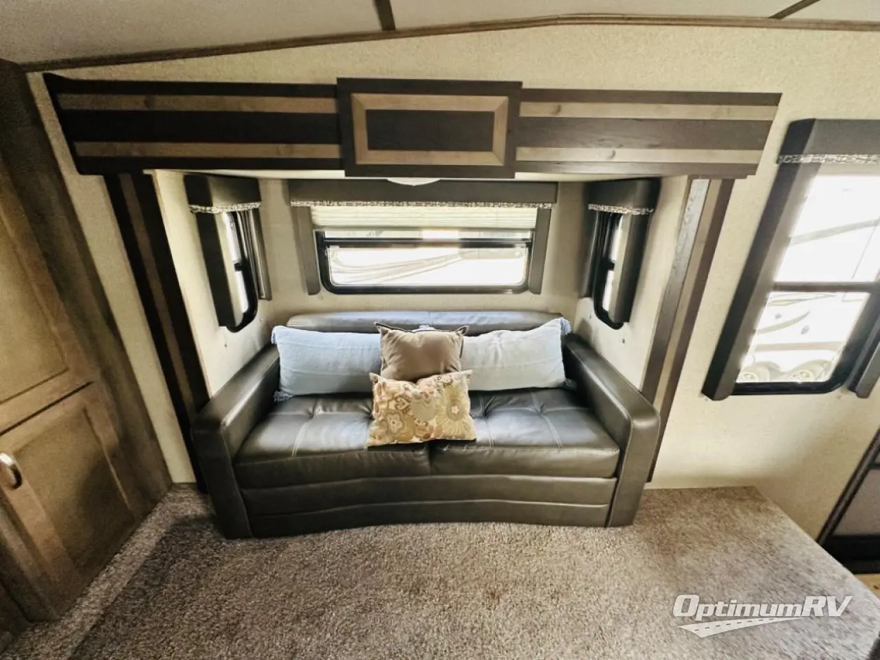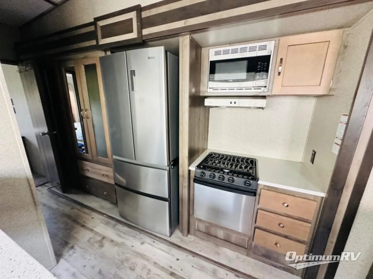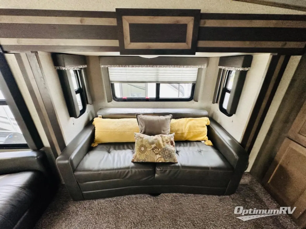 This fifth wheel could be your home away from home with a separate living area, quad slides throughout and a fireplace for those chilly nights. The front living area offers two opposing queen size tri-fold sofa slide outs, reclining theatre seats, and a 50" HDTV with a HDMI entertainment center. This area can also double as a sleeping space for the kids or grandkids. Just imagine the third slide out including the king bed, and the bathroom giving you two access points, plus there a wardrobe next to the pantry in the kitchen slide. The unique dinette offers bench and chair seating to play games and dine at. Your search can be over!