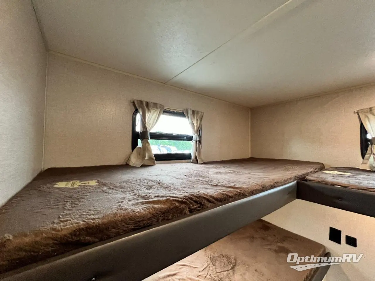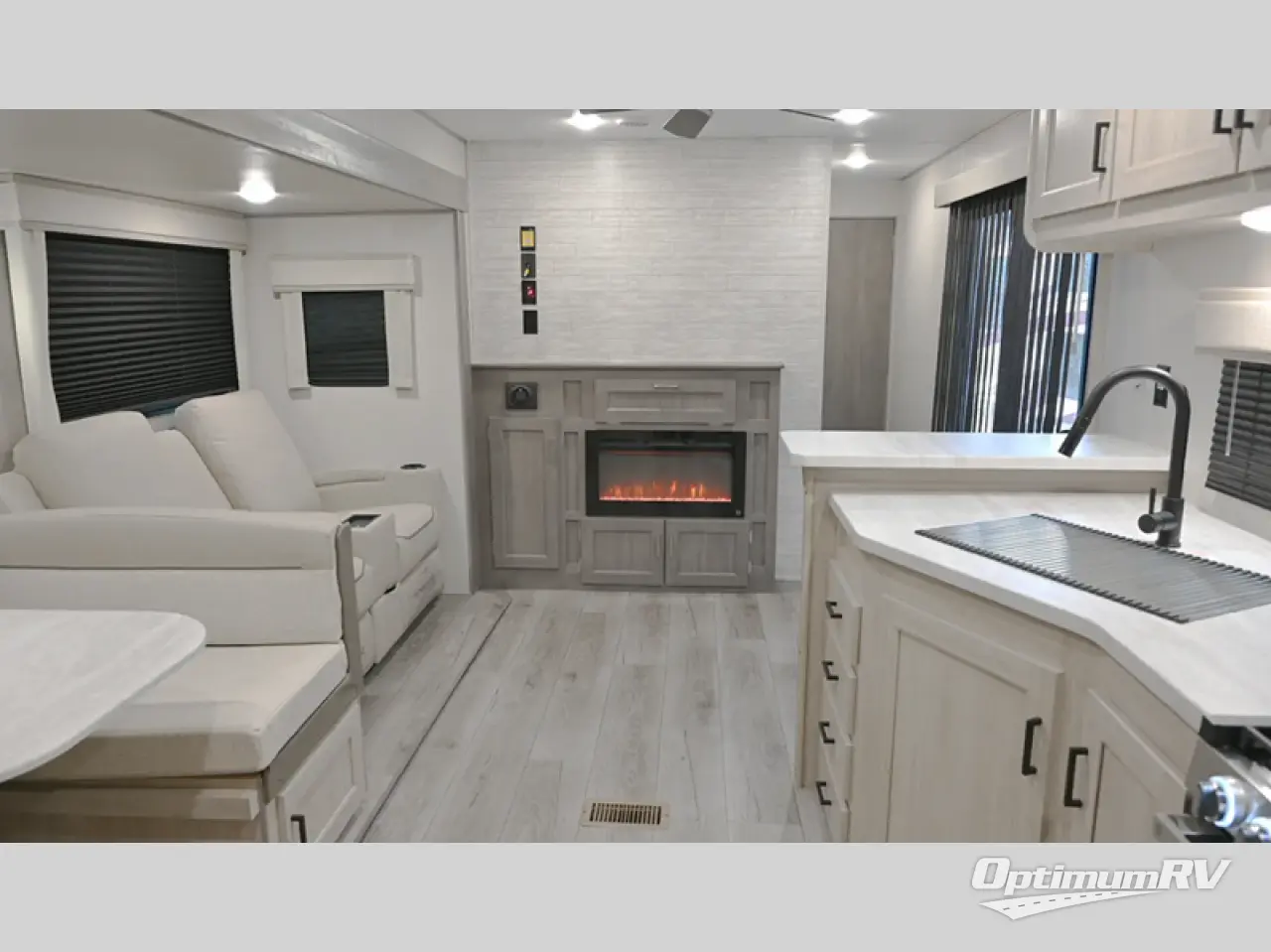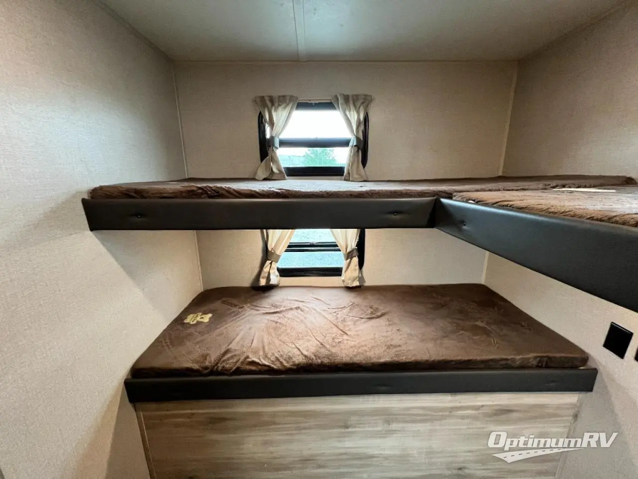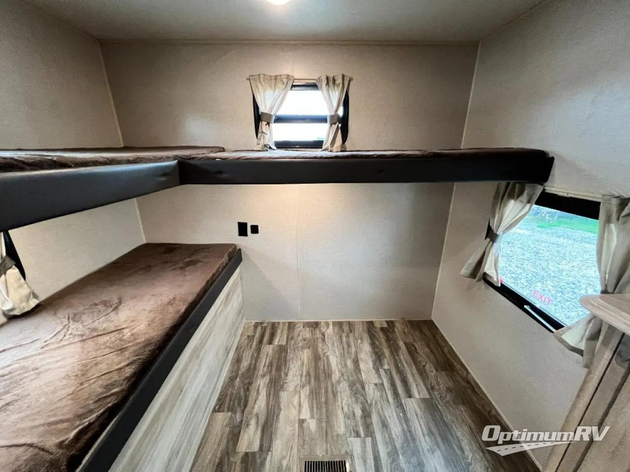 Not only will you be comfortable in this trailer, your friends will have comfort and privacy thanks to having their own bunkhouse, and you'll have a front bedroom where you can sleep like royalty! There are three bunk beds and two COA cube seats plus a location for a TV, a wardrobe, and windows for natural lighting. The combined living and kitchen is spacious thanks to the slide out U-shaped dinette and sofa with drink holders. You can even add the fireplace option if you want that feature. The cook will have full amenities to whip up meals including overhead cabinets for dishes and snacks. And the exterior camper kitchen allows the cook to visit with everyone outside under the 18' electric awning that includes multicolor LED lights with a remote.