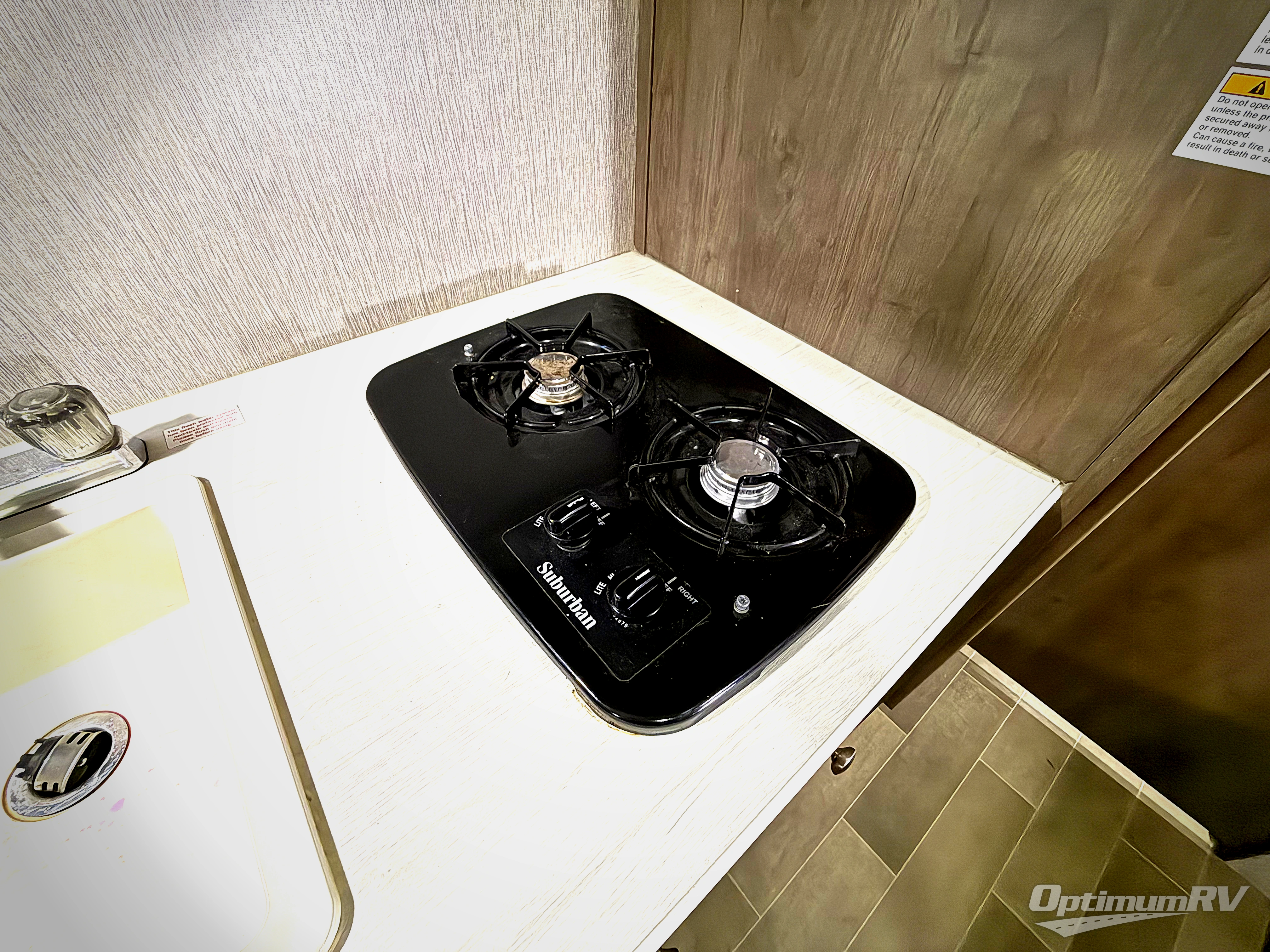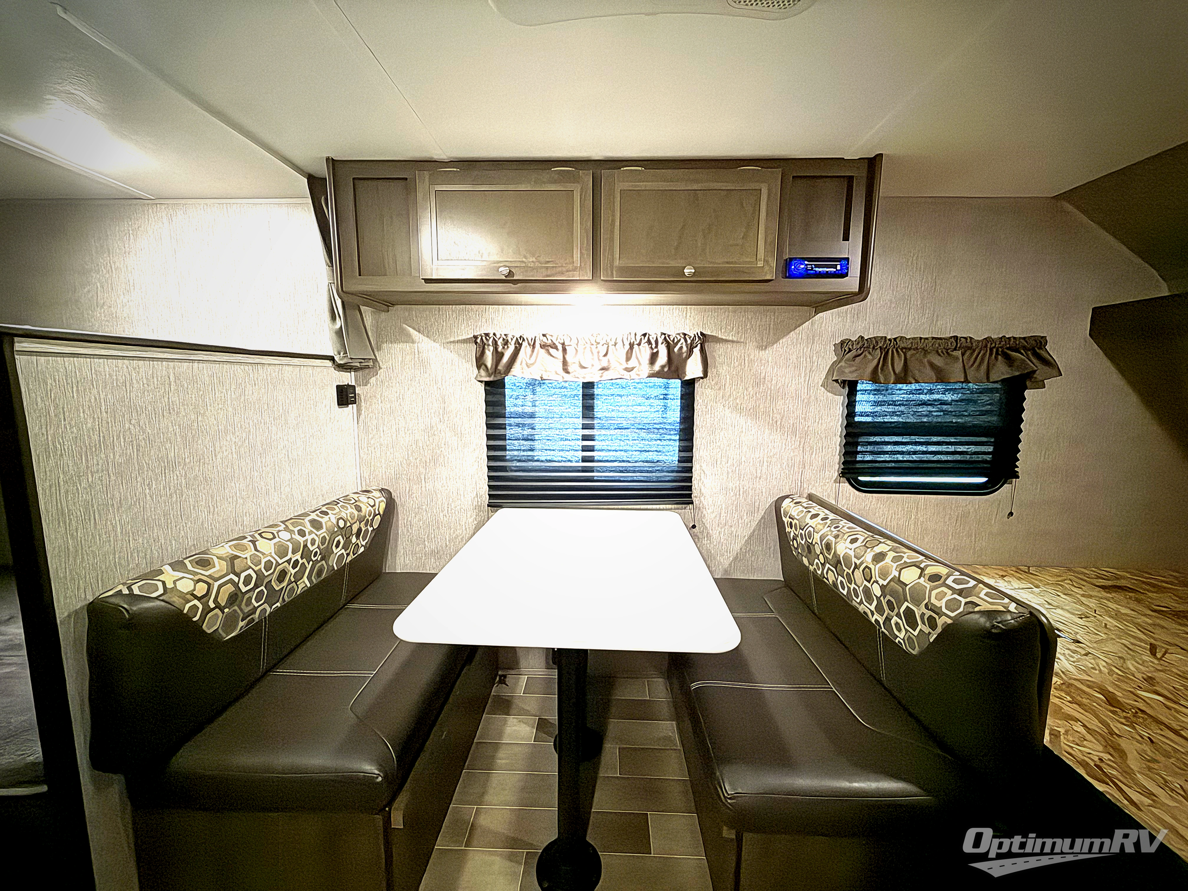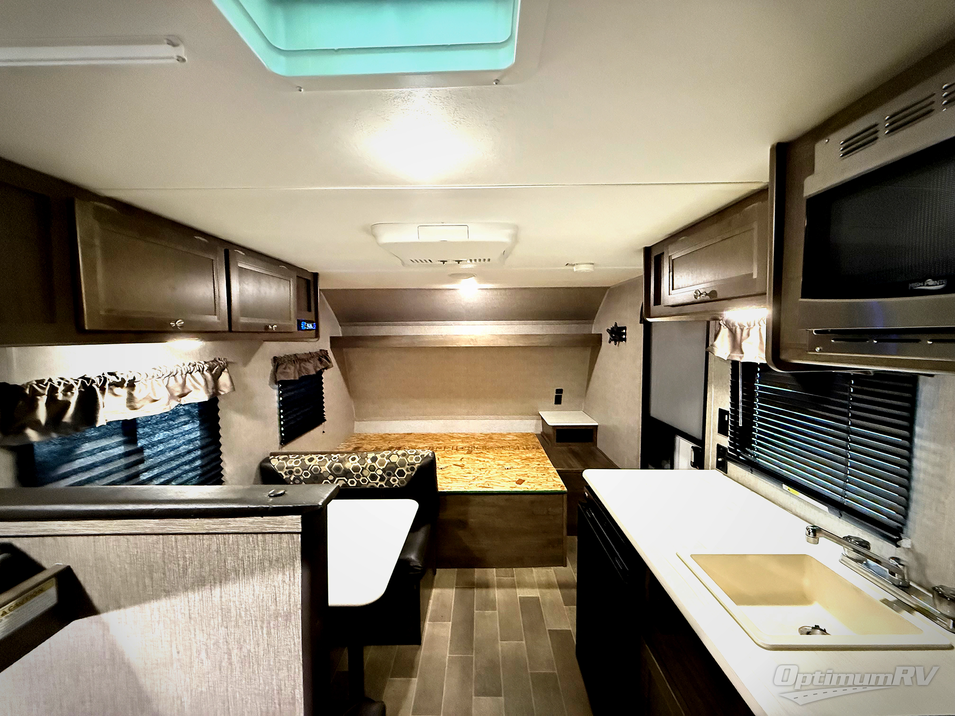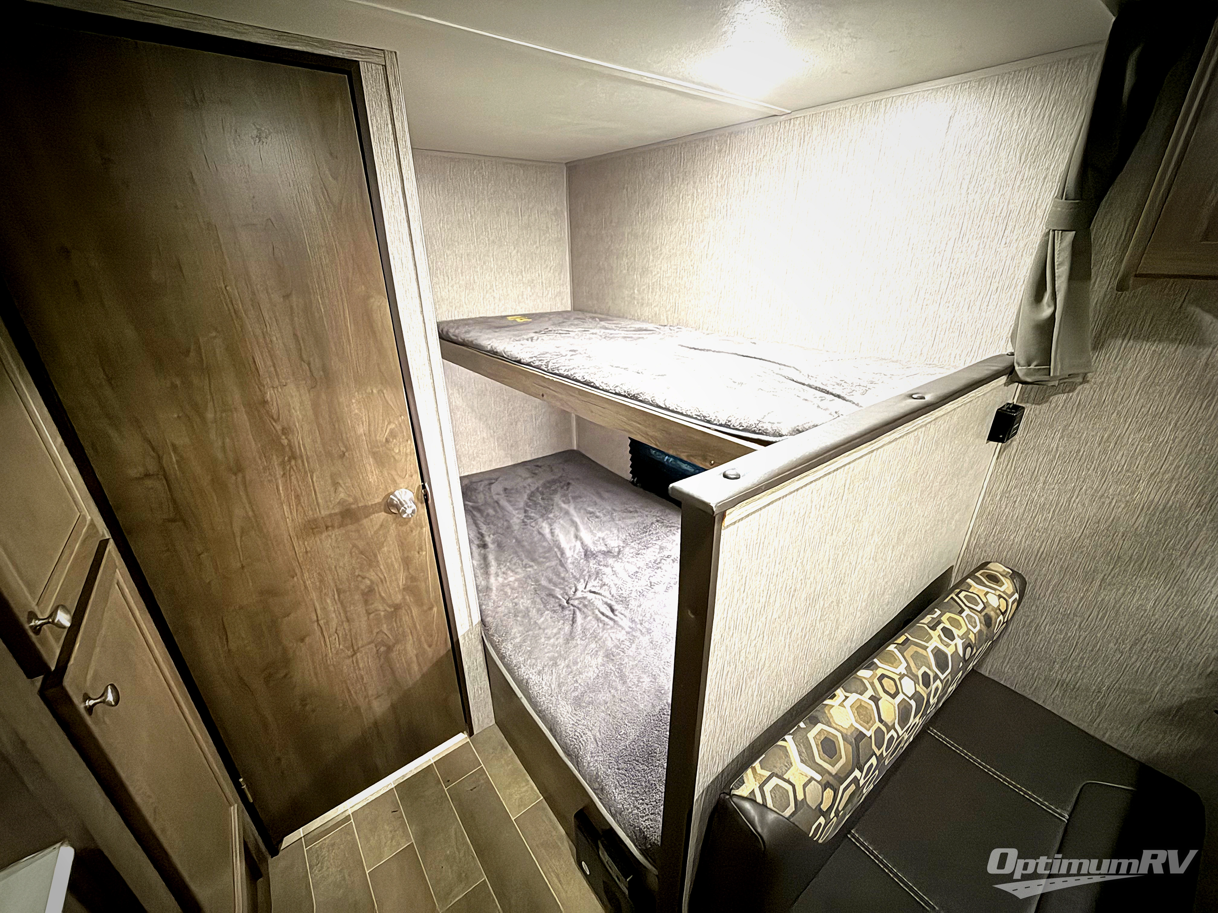 This travel trailer is perfect for the beginner with kids or the seasoned traveler that doesn't want a lot of space to clean after a fun weekend away. You can probably picture your kids deciding if they want the top bunk or the bottom bunk bed to call their own while you sleep on a queen bed. The cook can make meals inside on the two burner cooktop and everyone can eat outside under the 10' power awning with LED patio light or at the booth dinette inside. And the private shower and toilet room allow everyone to stay refreshed.