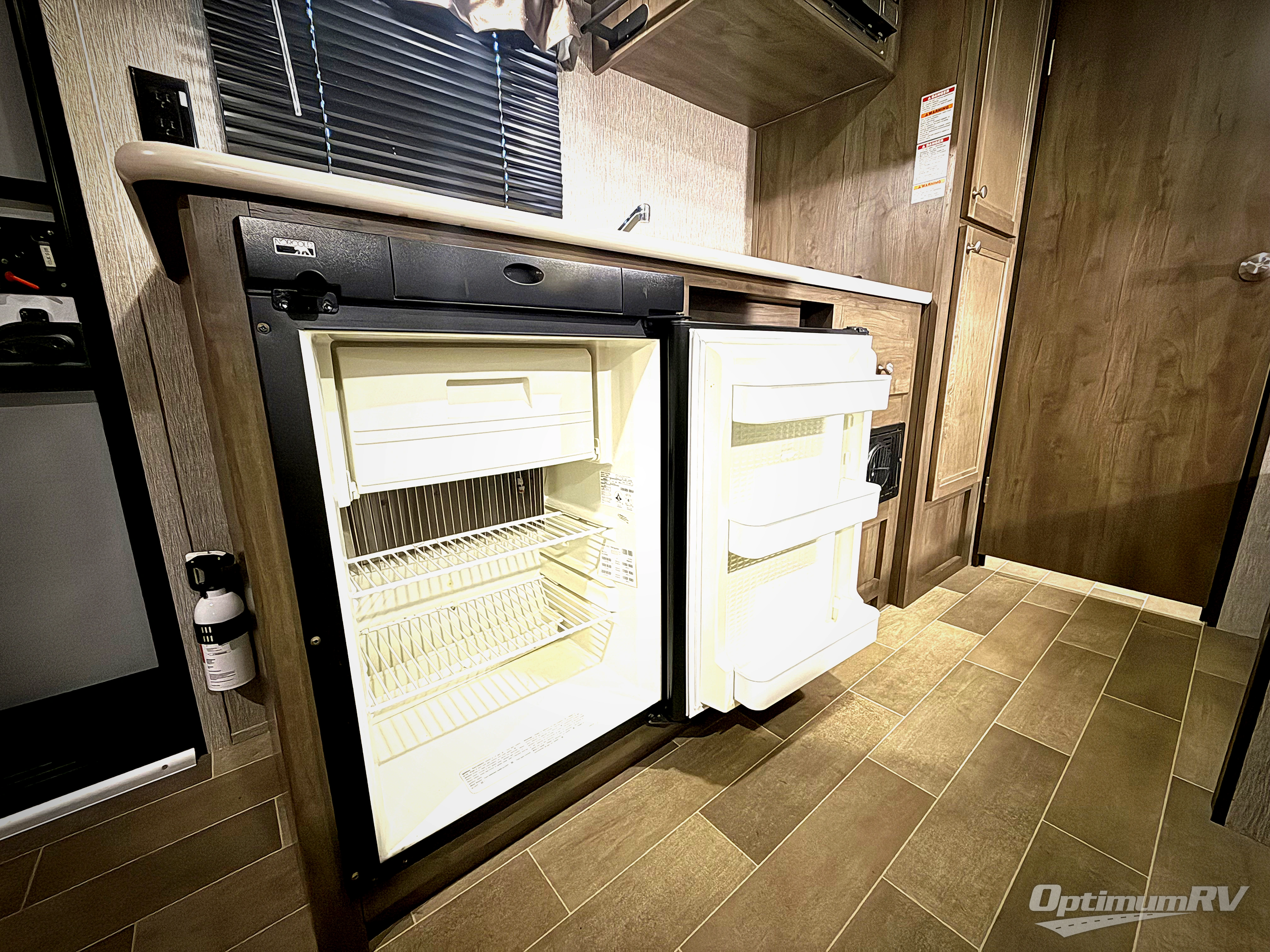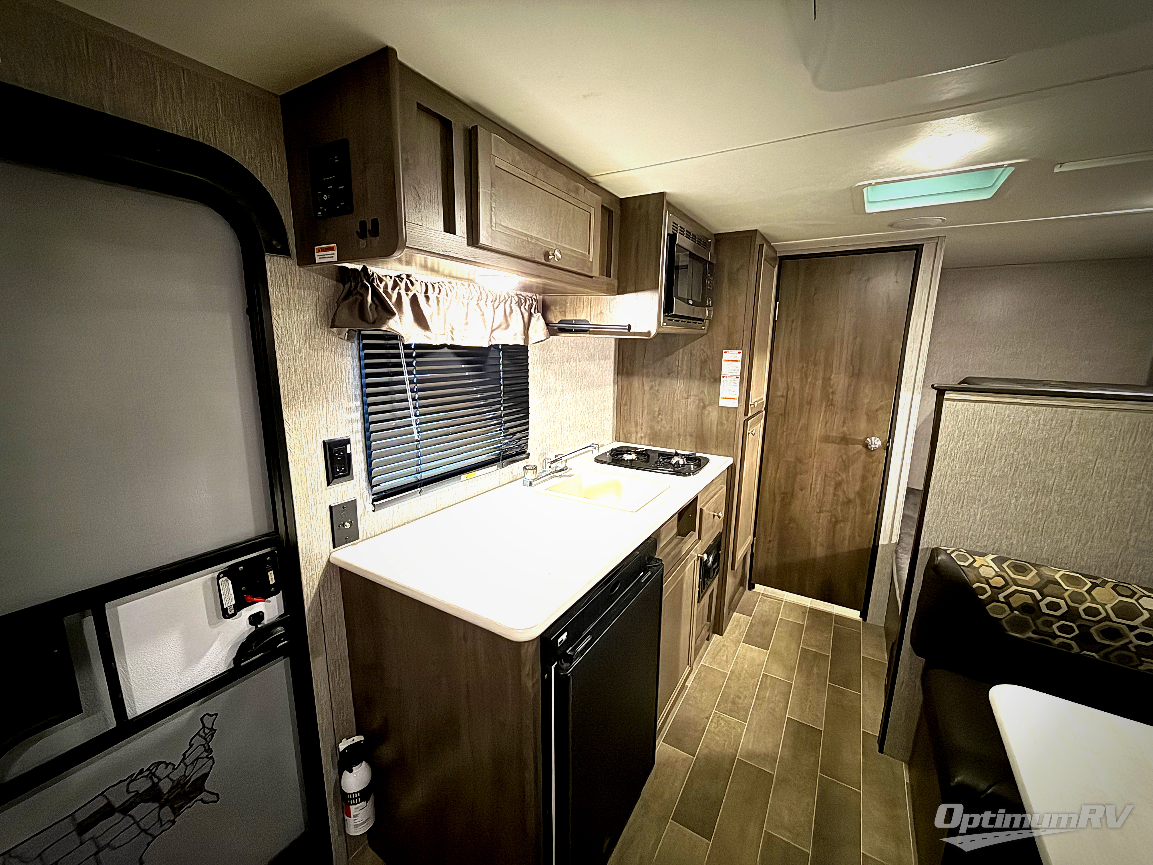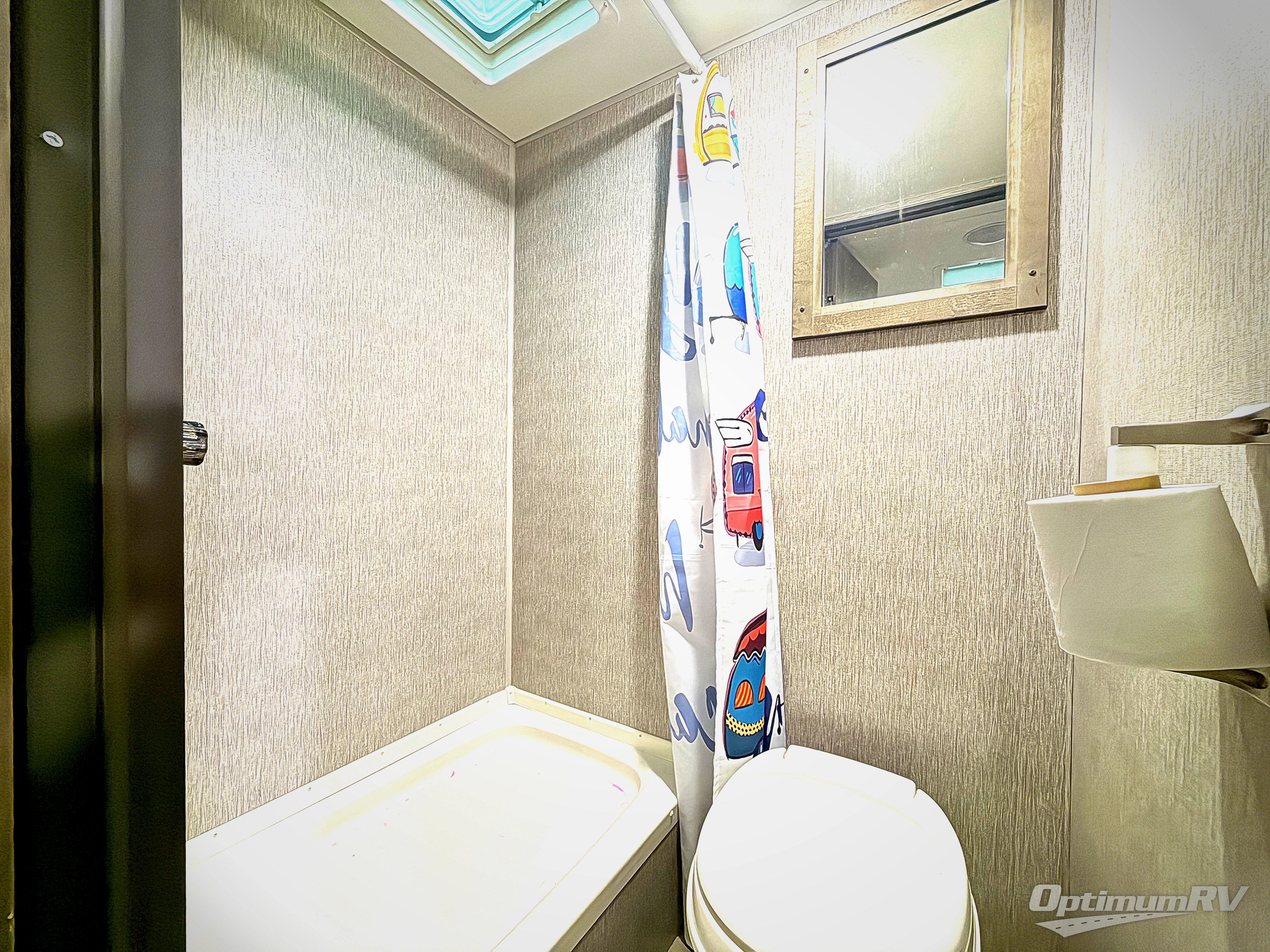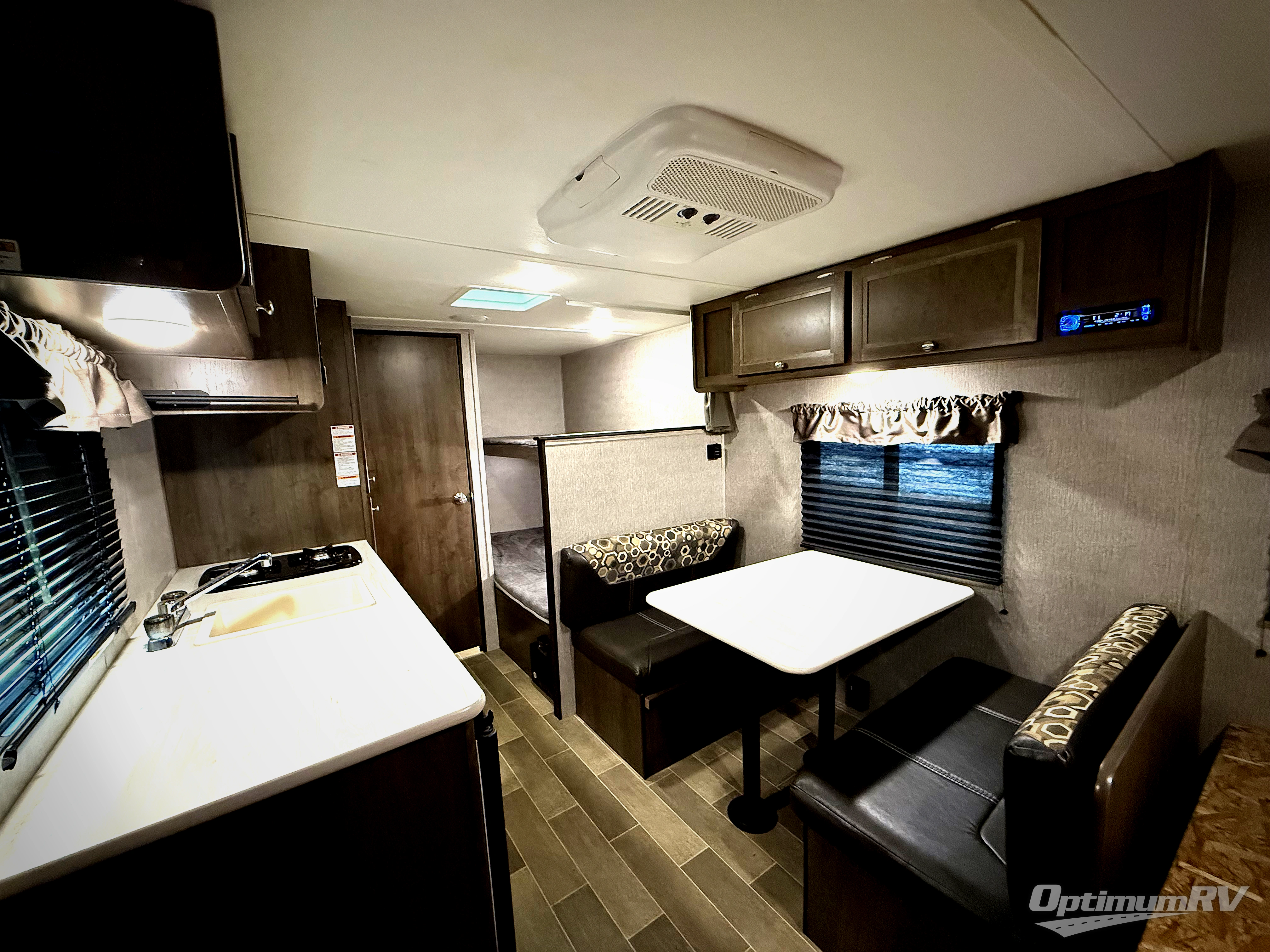 This travel trailer is perfect for the beginner with kids or the seasoned traveler that doesn't want a lot of space to clean after a fun weekend away. You can probably picture your kids deciding if they want the top bunk or the bottom bunk bed to call their own while you sleep on a queen bed. The cook can make meals inside on the two burner cooktop and everyone can eat outside under the 10' power awning with LED patio light or at the booth dinette inside. And the private shower and toilet room allow everyone to stay refreshed.
