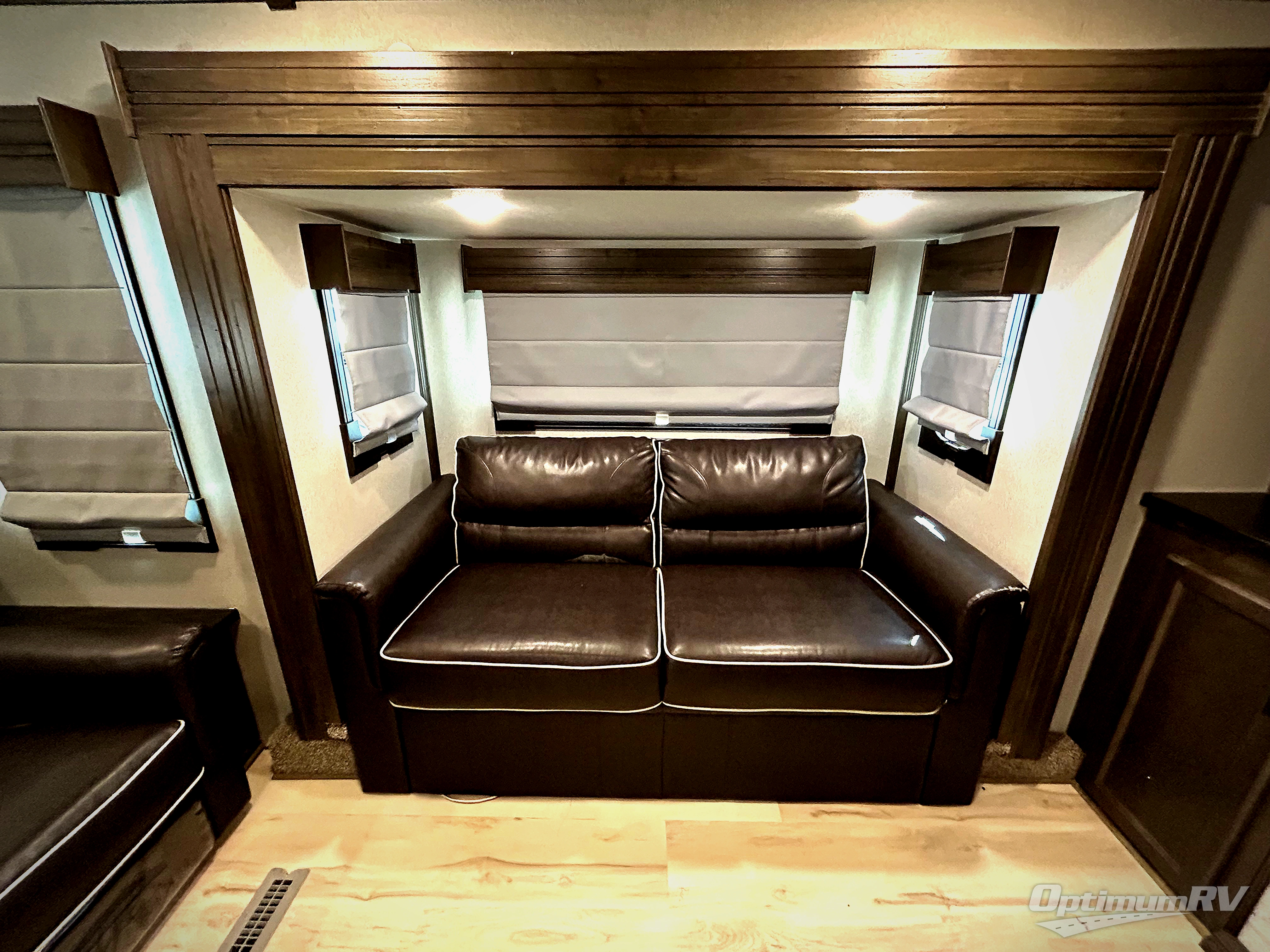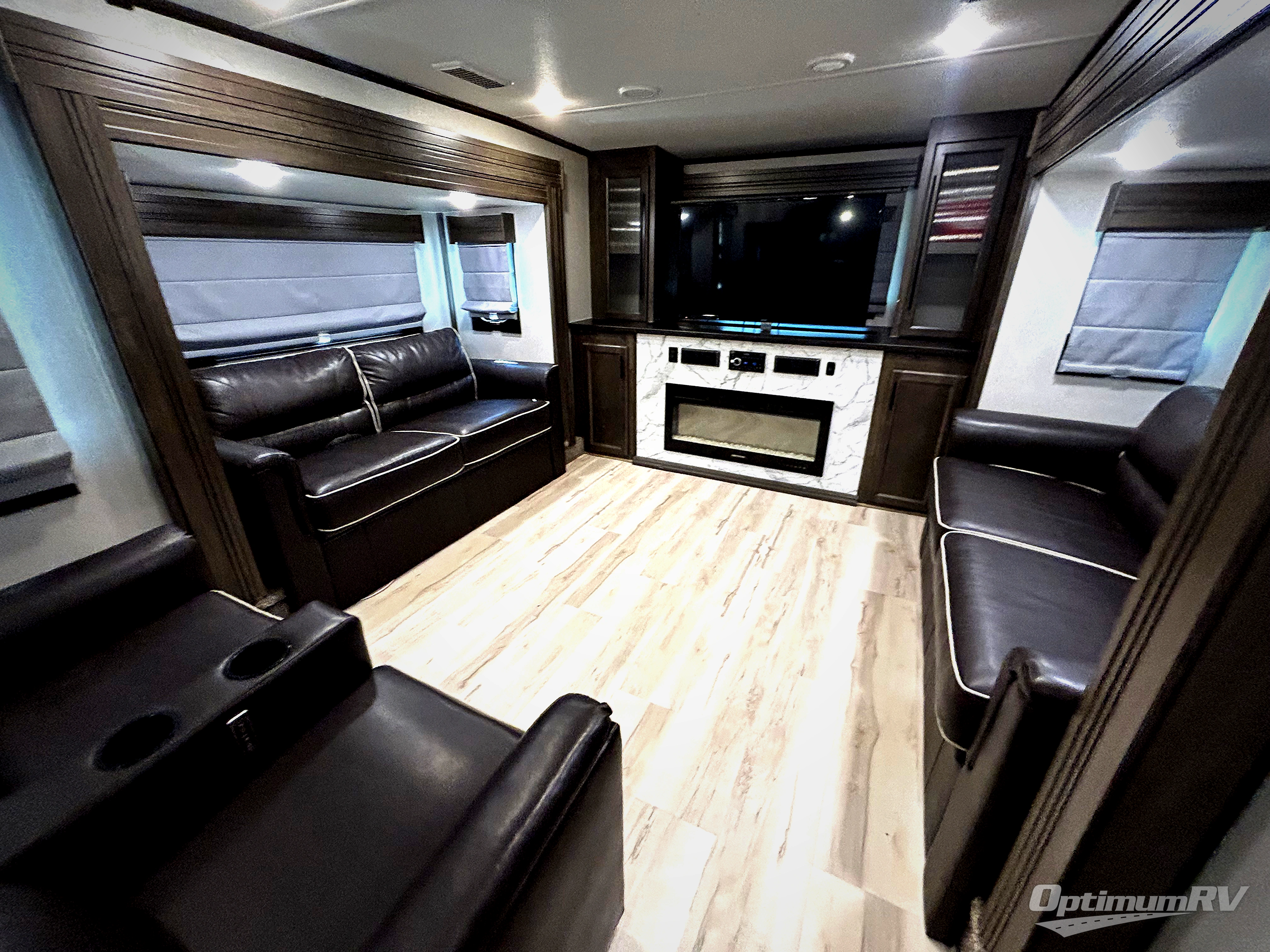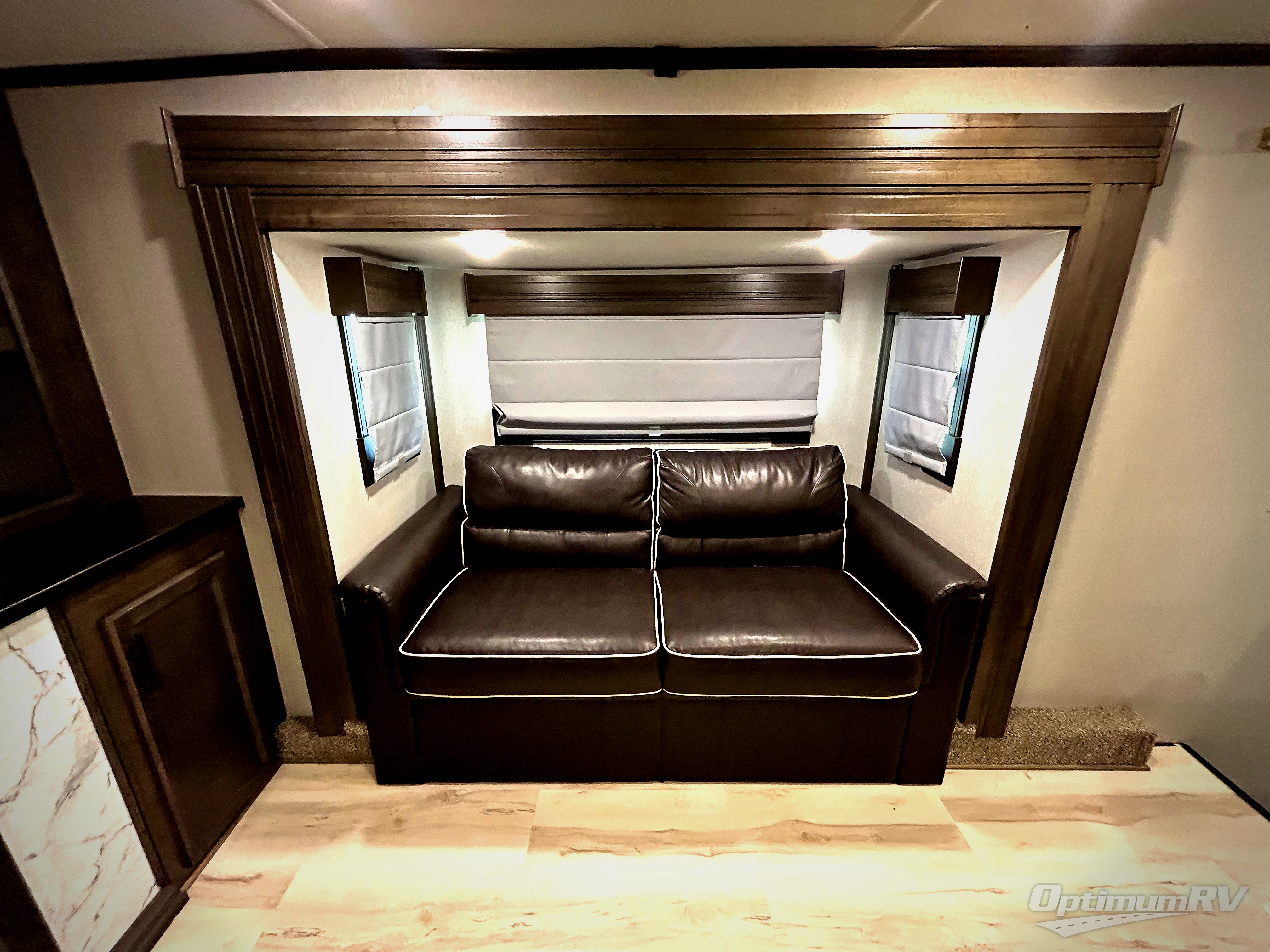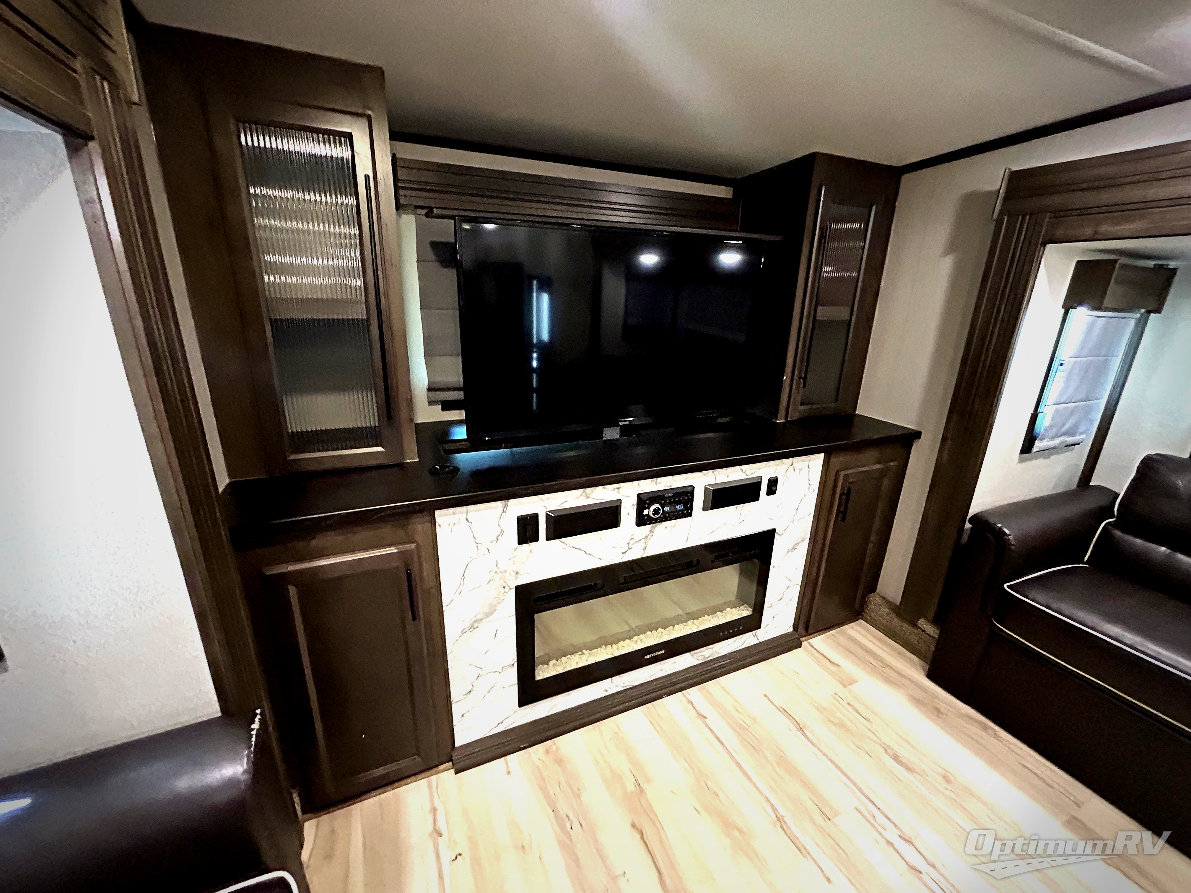 This front living fifth wheel is sure to be a hit with everyone! It features two sofa slides opposing each other and theater seating across from the entertainment center with a fireplace and a pop-up TV. The kitchen has many features you will love as well like the kitchen island, the walk-in pantry, and the spice rack. Inside the rear private bedroom you will find all of the comforts from home like the desk with a chair, the king bed, and a closet that even has a washer and dryer!