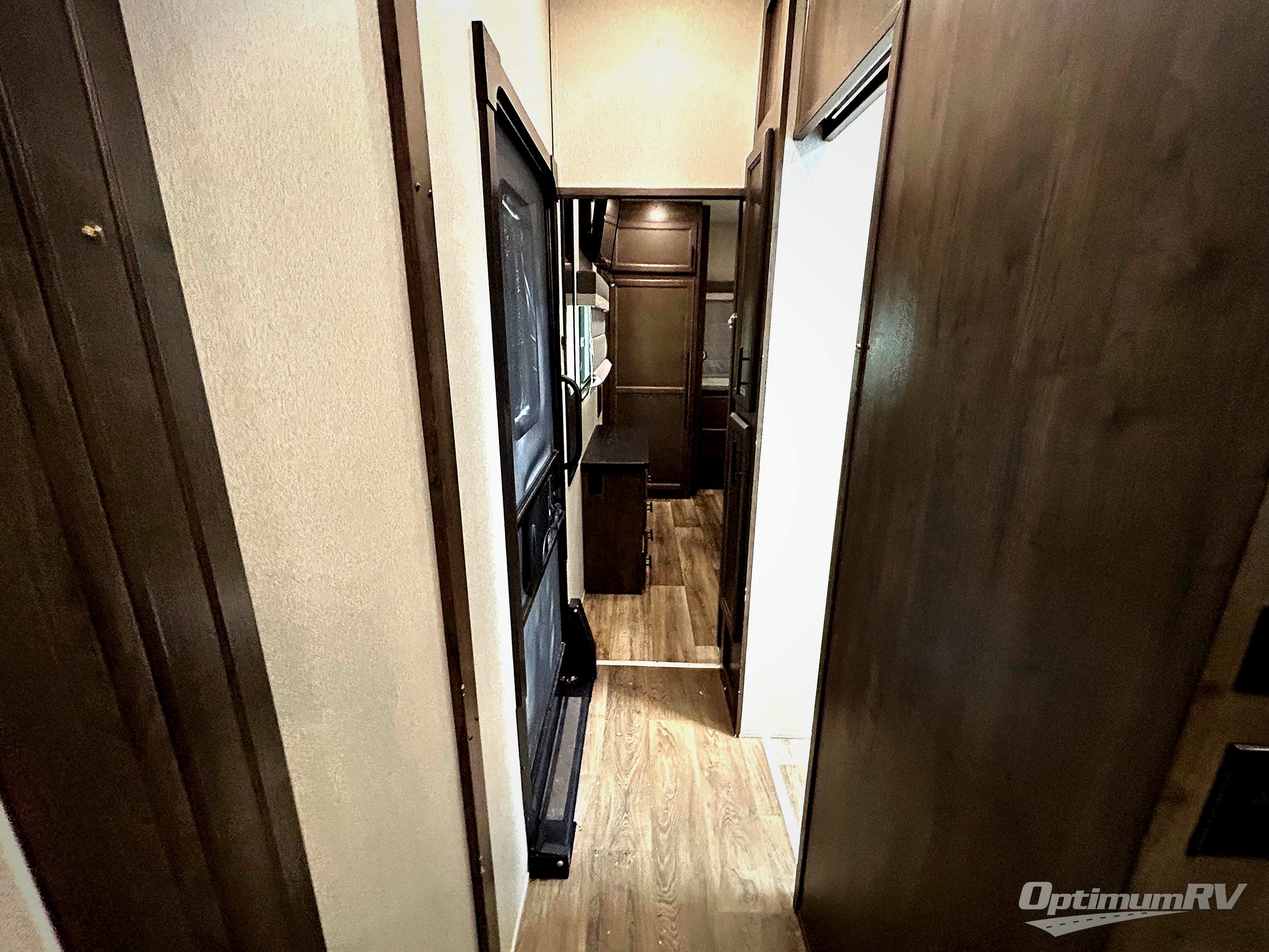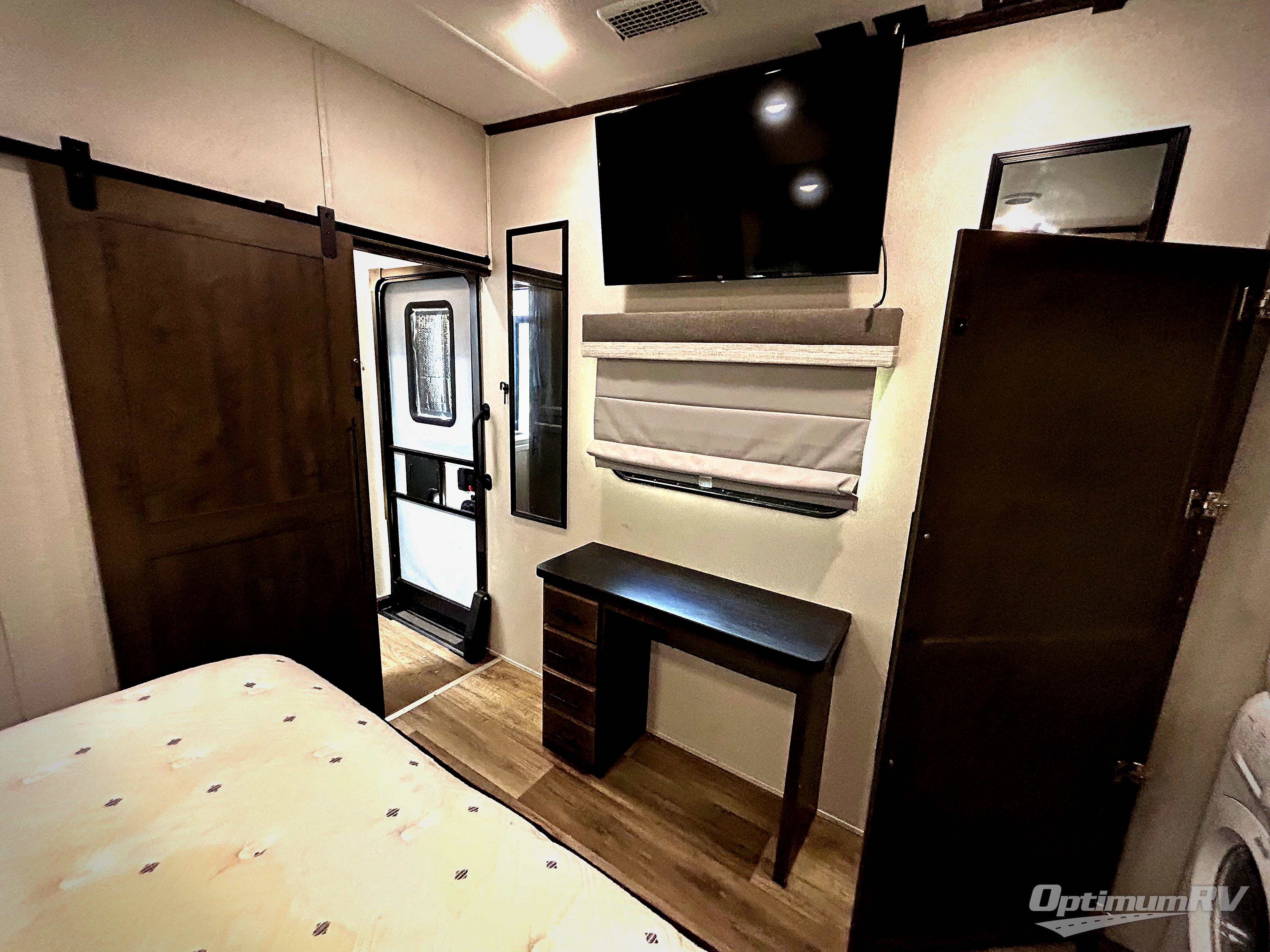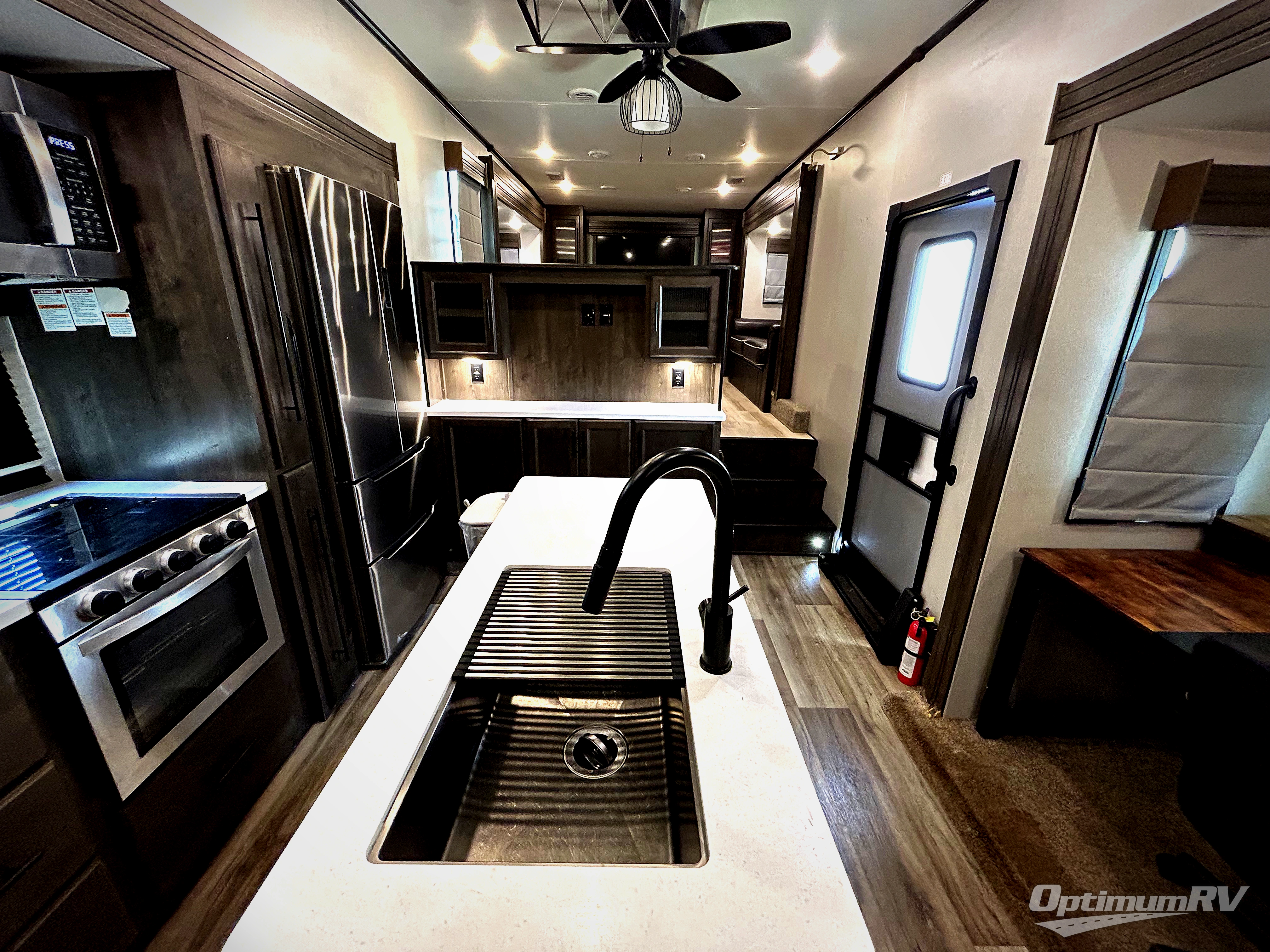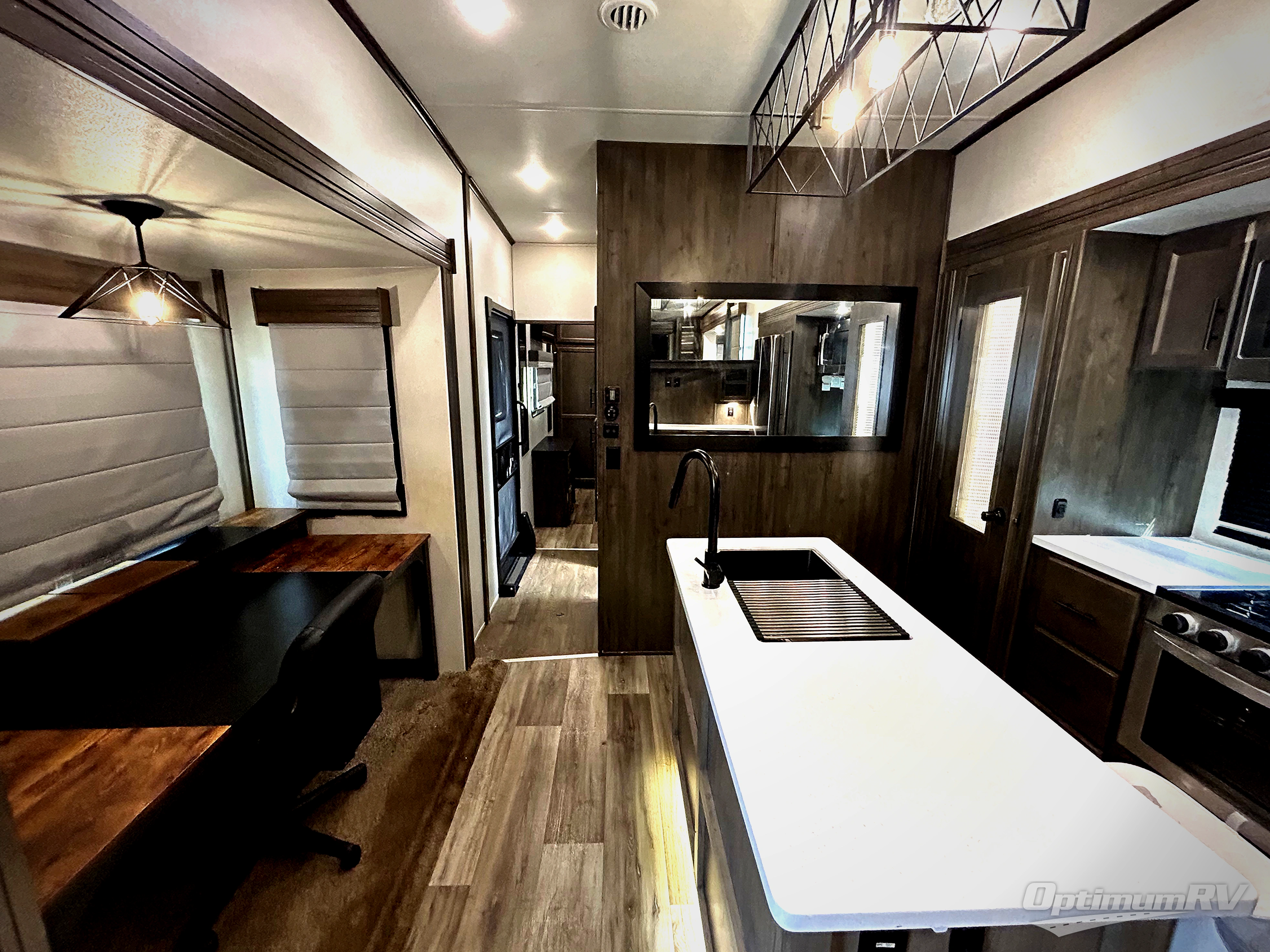 This front living fifth wheel is sure to be a hit with everyone! It features two sofa slides opposing each other and theater seating across from the entertainment center with a fireplace and a pop-up TV. The kitchen has many features you will love as well like the kitchen island, the walk-in pantry, and the spice rack. Inside the rear private bedroom you will find all of the comforts from home like the desk with a chair, the king bed, and a closet that even has a washer and dryer!