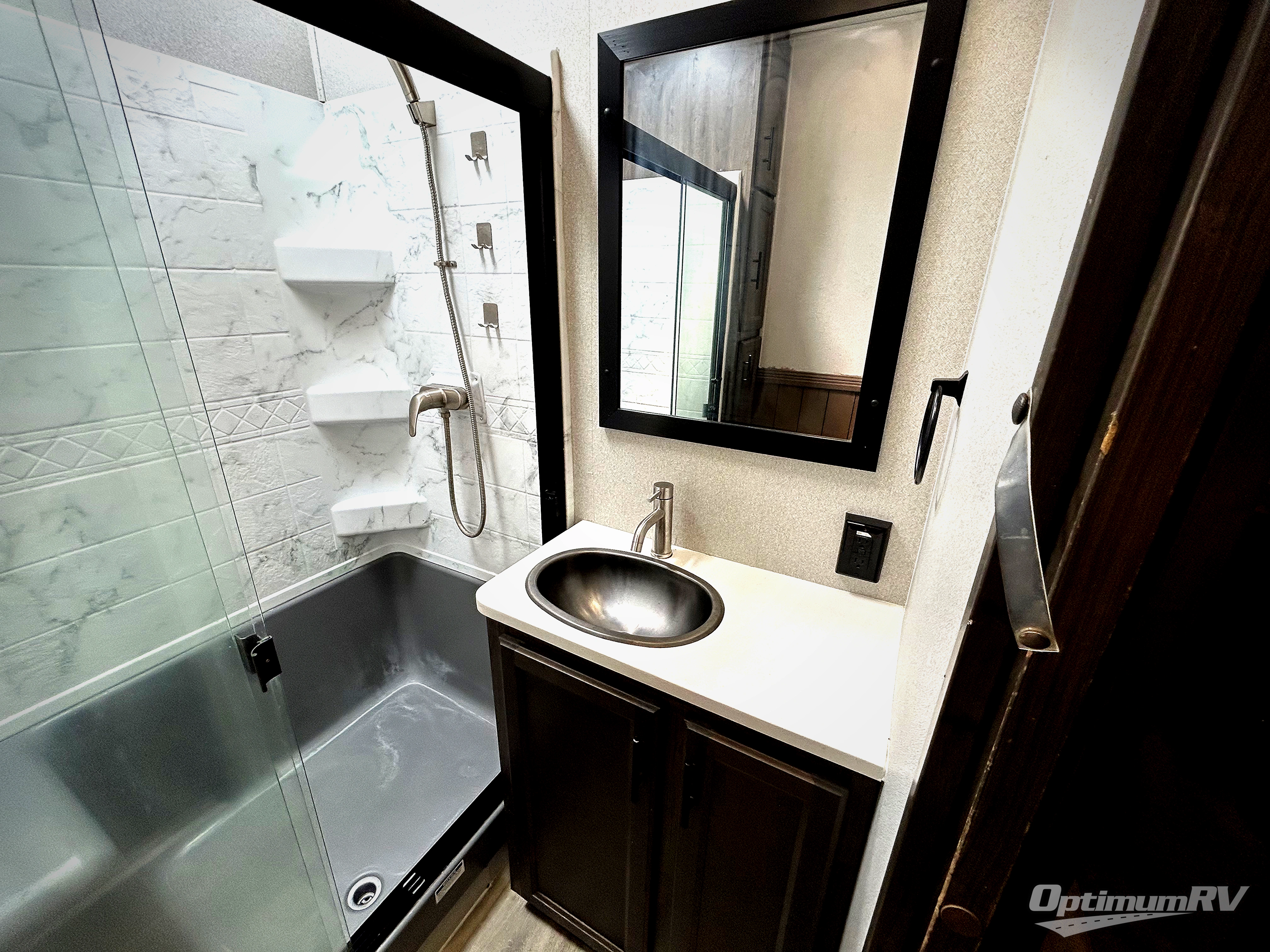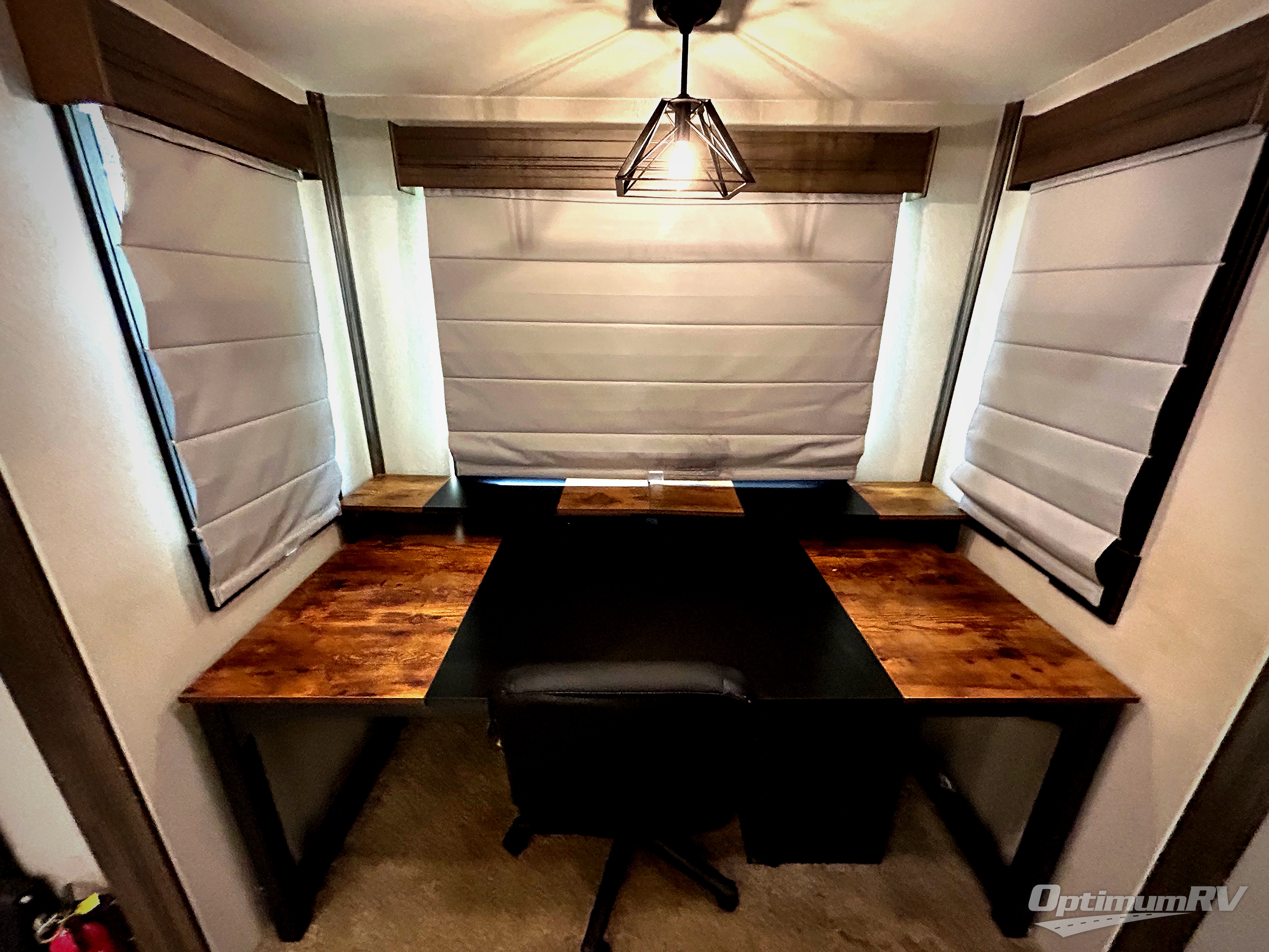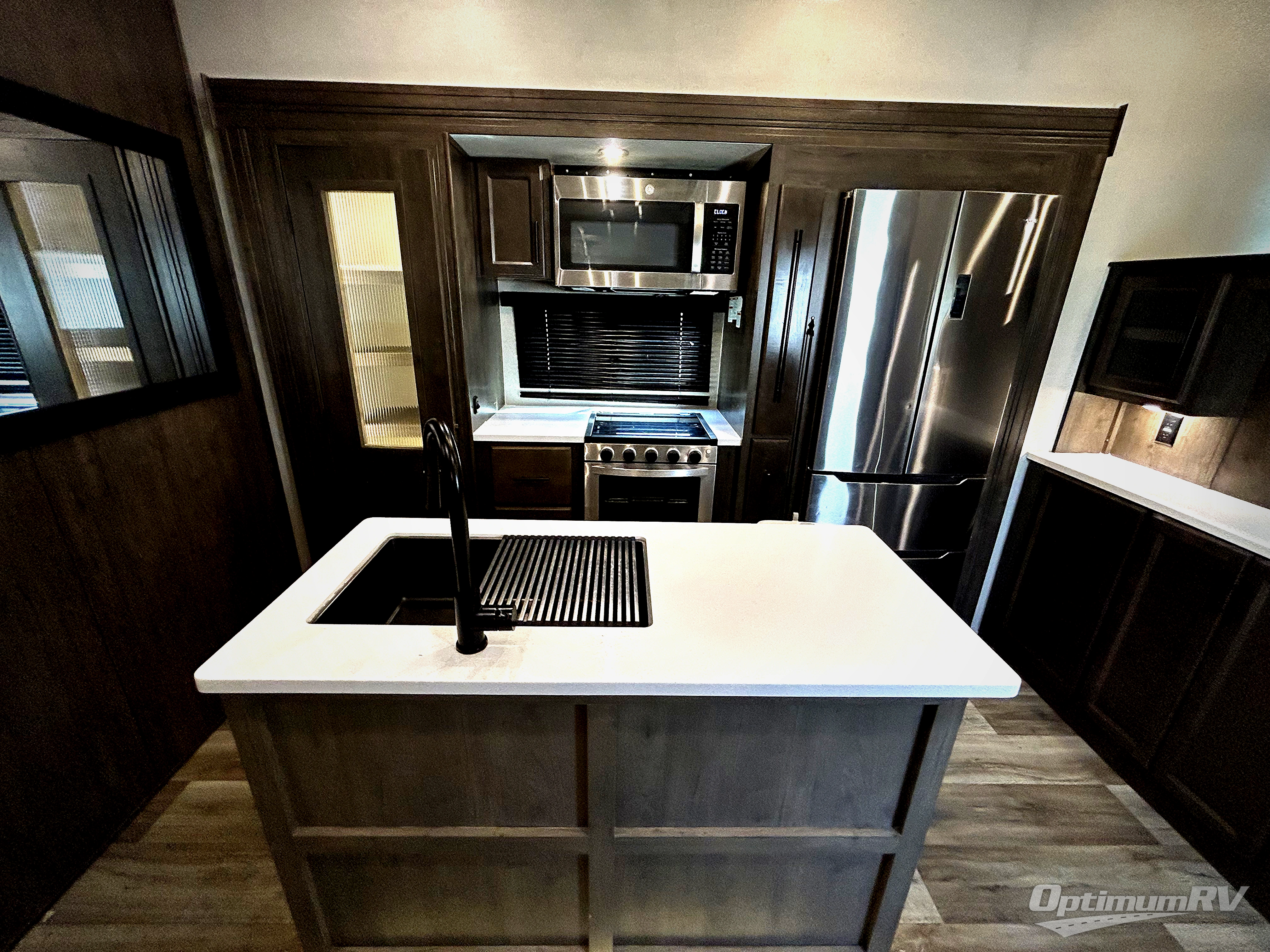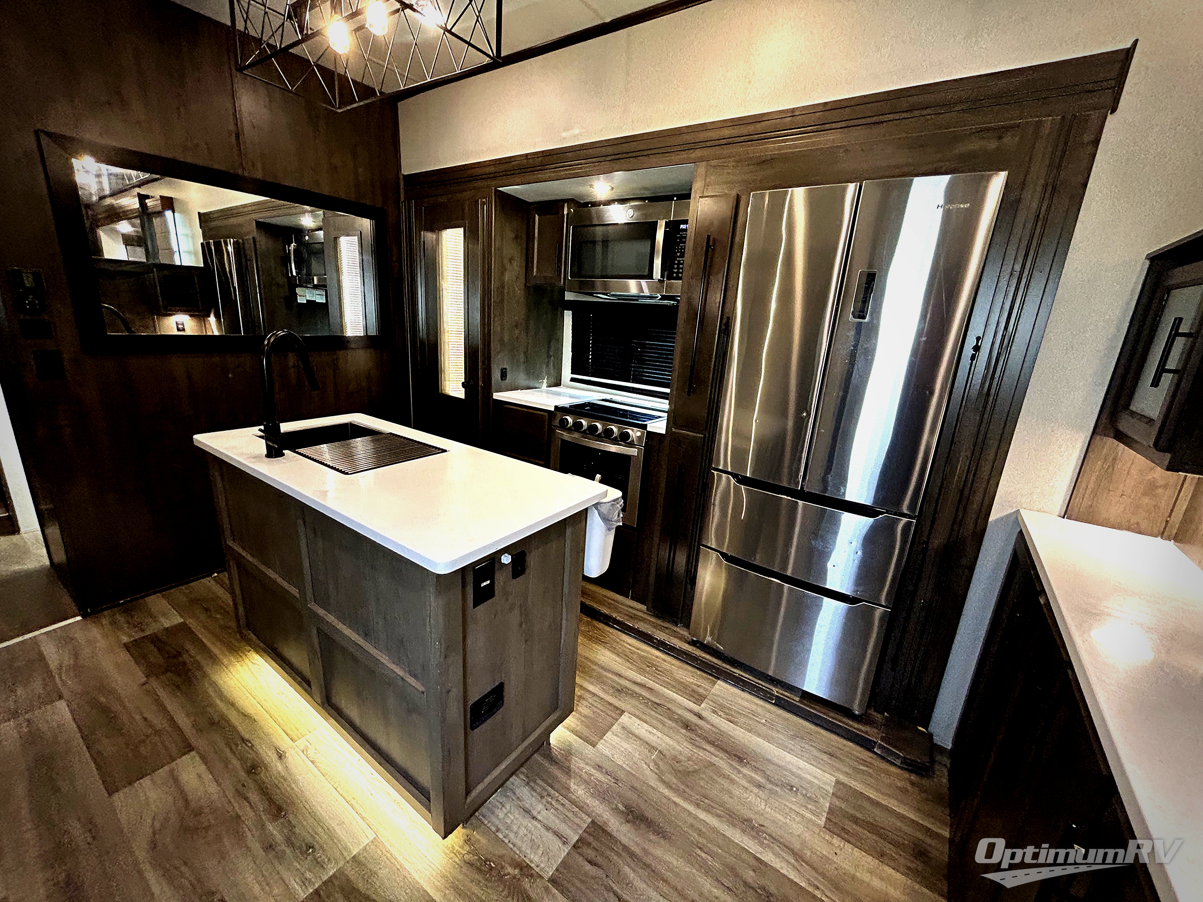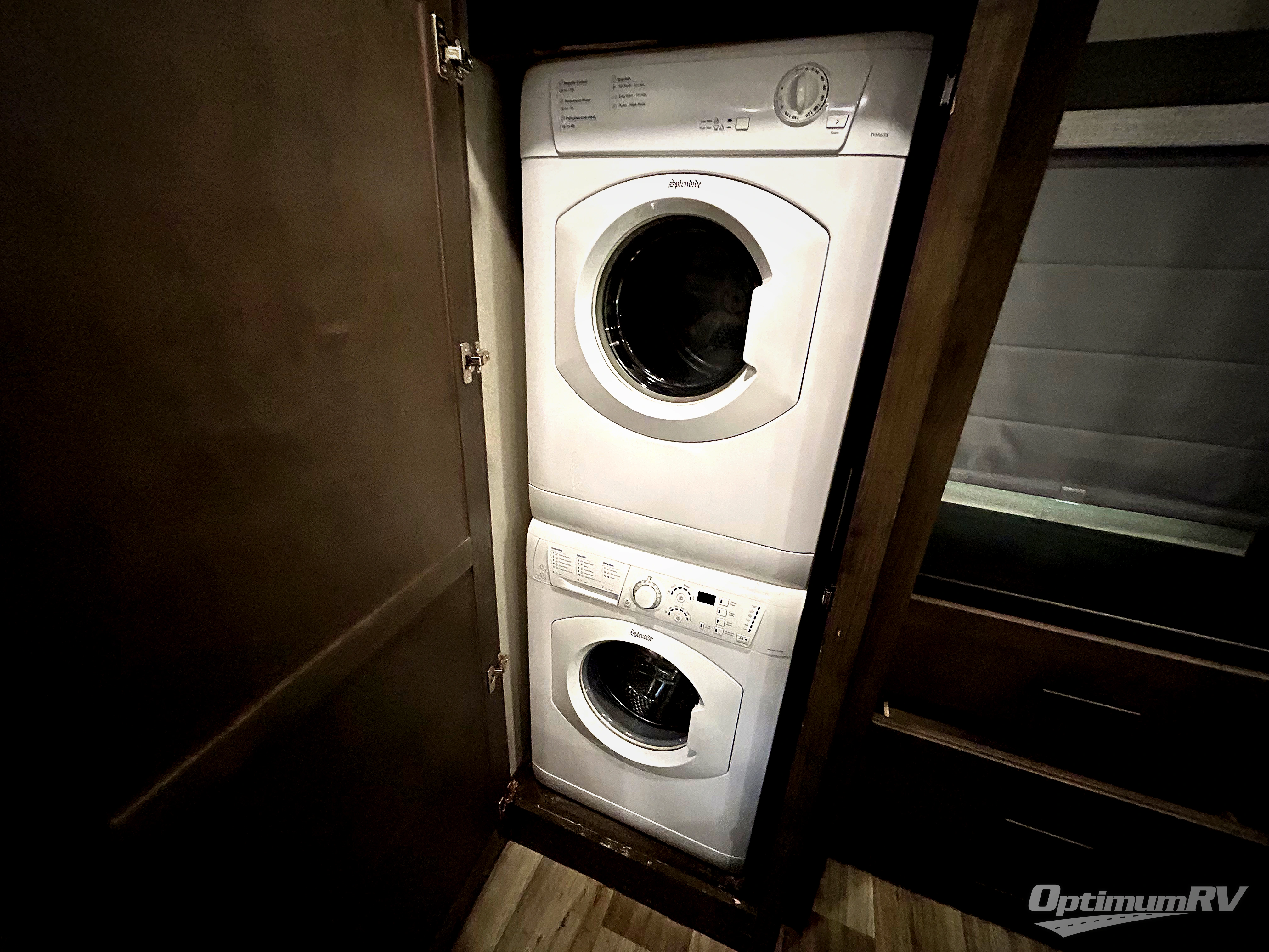 This front living fifth wheel is sure to be a hit with everyone! It features two sofa slides opposing each other and theater seating across from the entertainment center with a fireplace and a pop-up TV. The kitchen has many features you will love as well like the kitchen island, the walk-in pantry, and the spice rack. Inside the rear private bedroom you will find all of the comforts from home like the desk with a chair, the king bed, and a closet that even has a washer and dryer!
