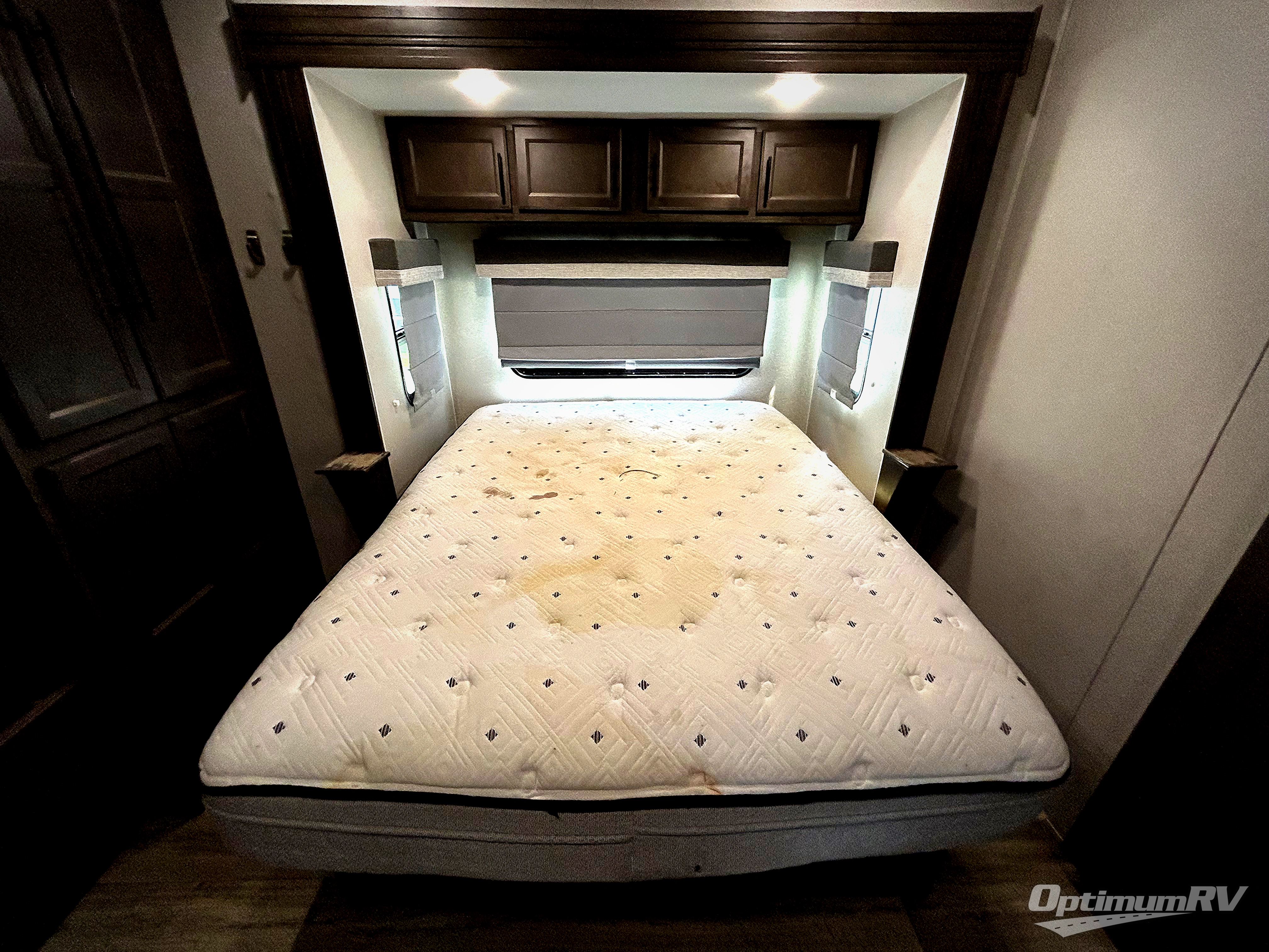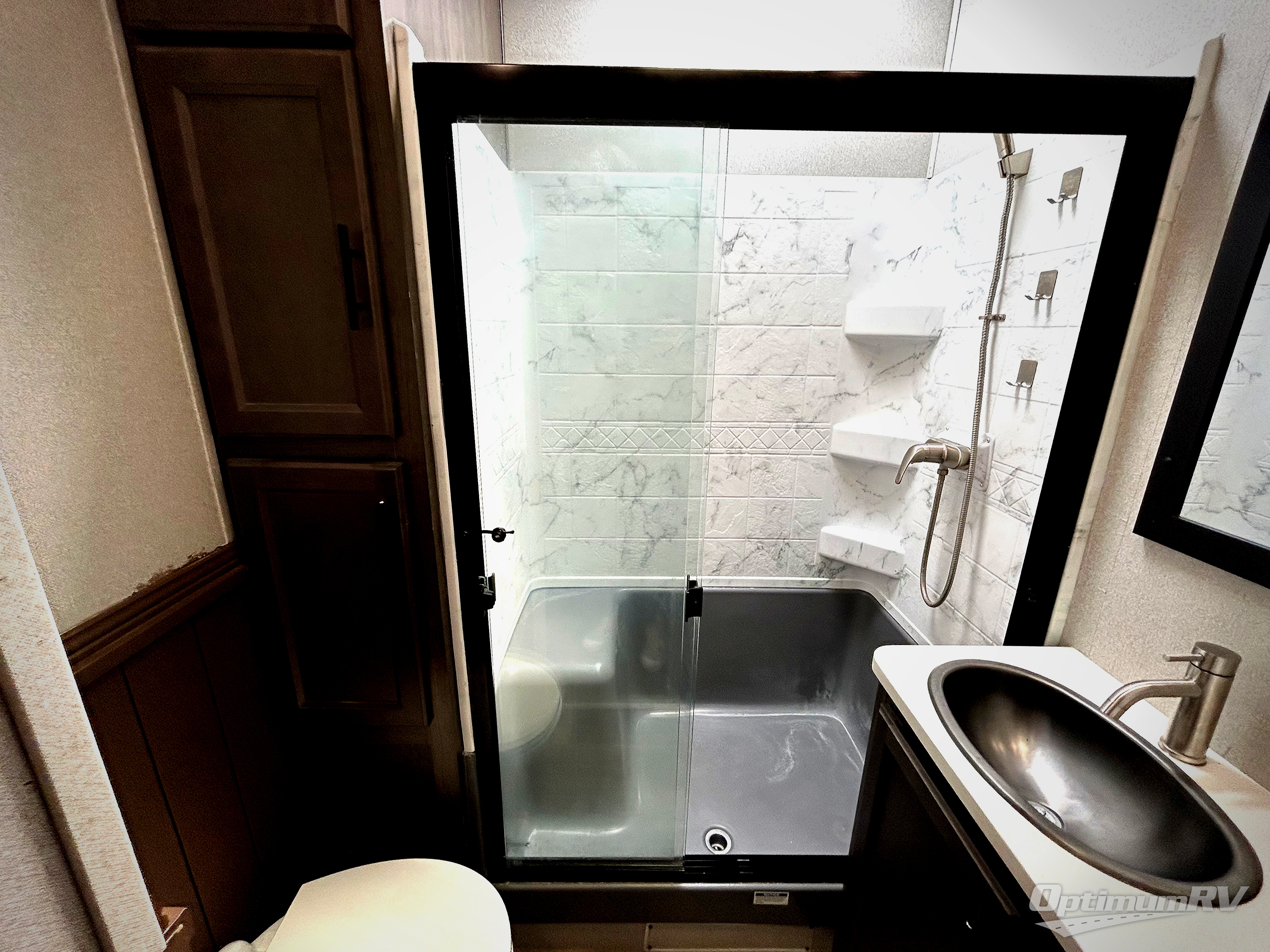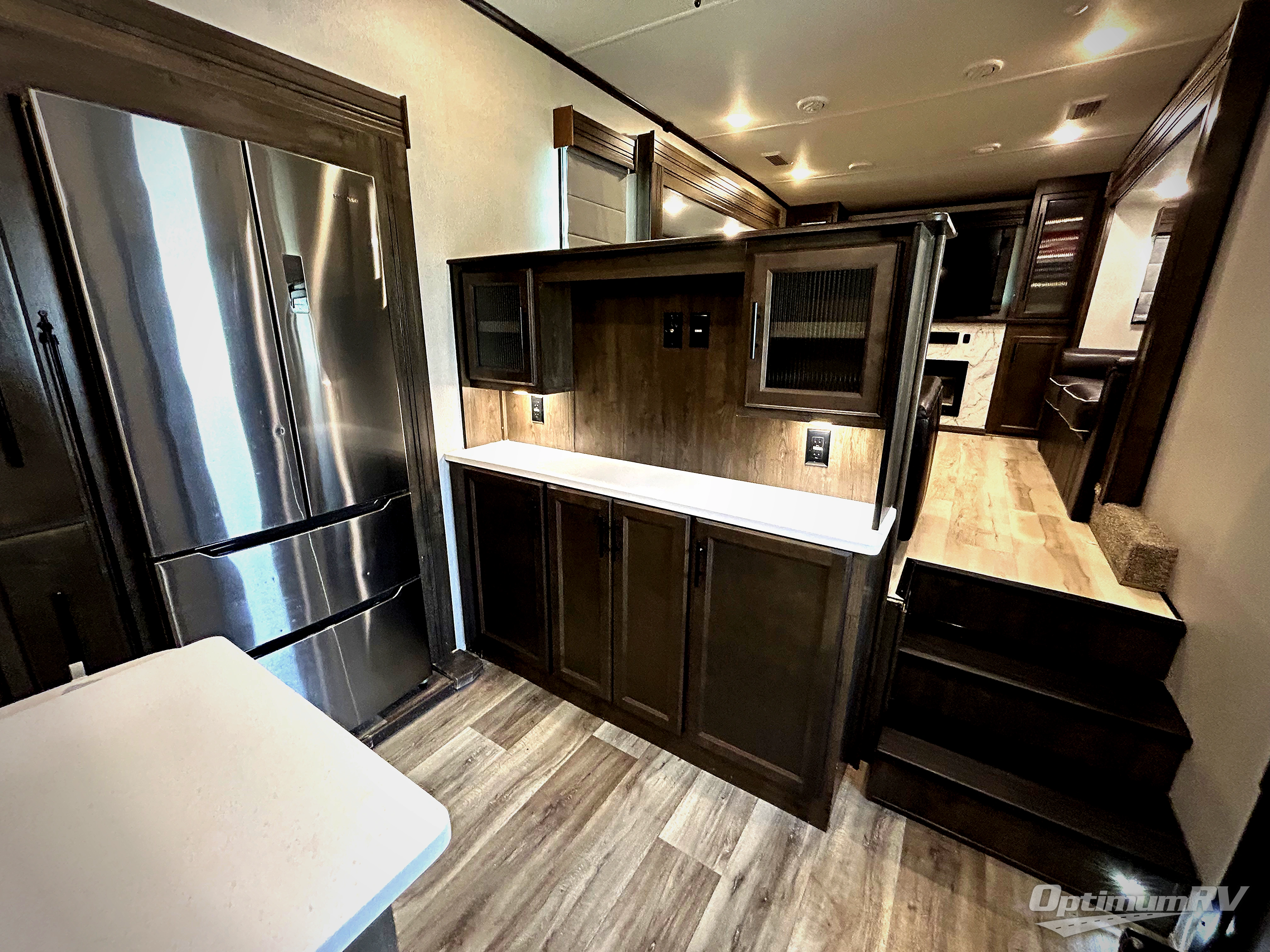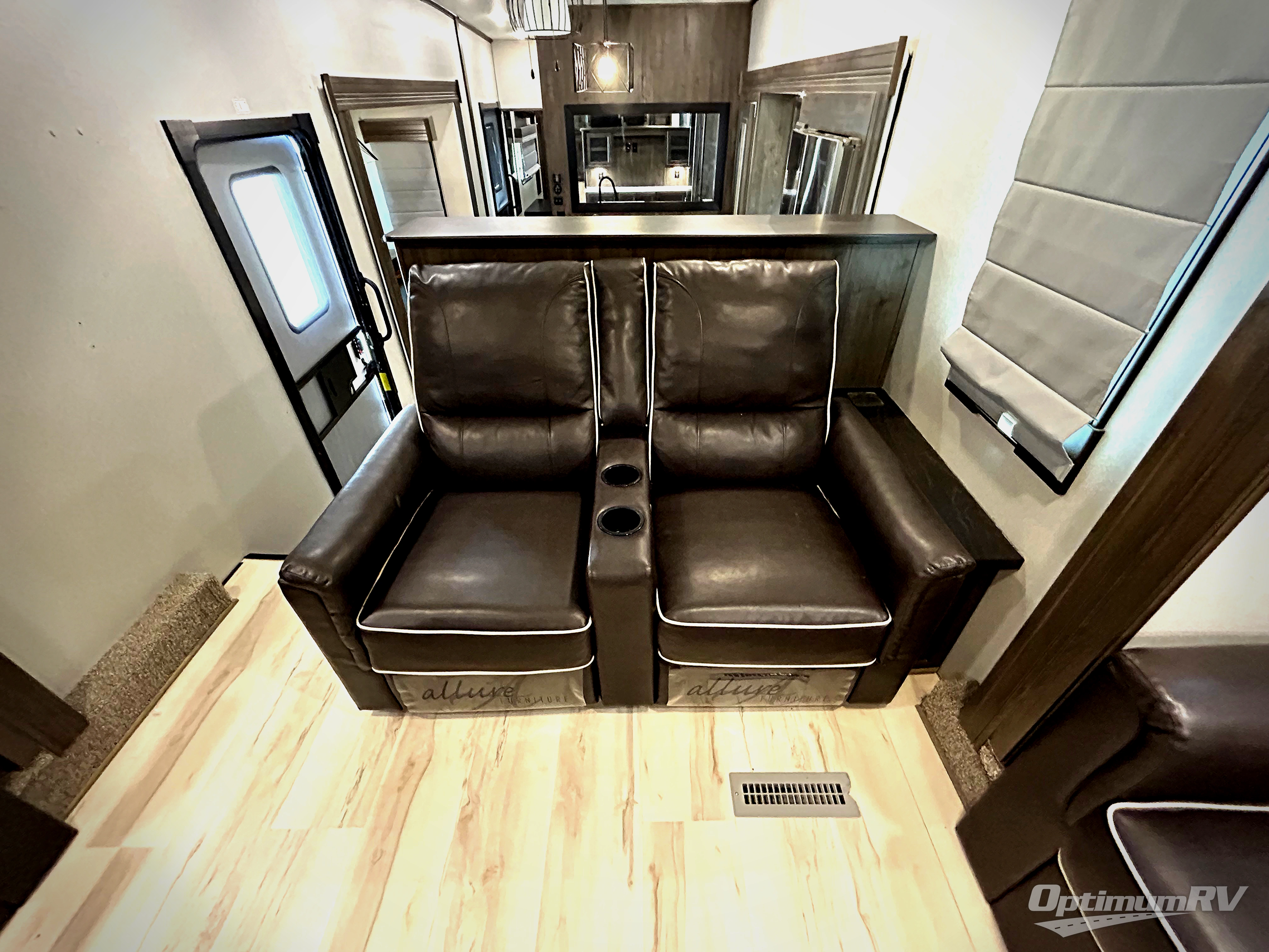 This front living fifth wheel is sure to be a hit with everyone! It features two sofa slides opposing each other and theater seating across from the entertainment center with a fireplace and a pop-up TV. The kitchen has many features you will love as well like the kitchen island, the walk-in pantry, and the spice rack. Inside the rear private bedroom you will find all of the comforts from home like the desk with a chair, the king bed, and a closet that even has a washer and dryer!