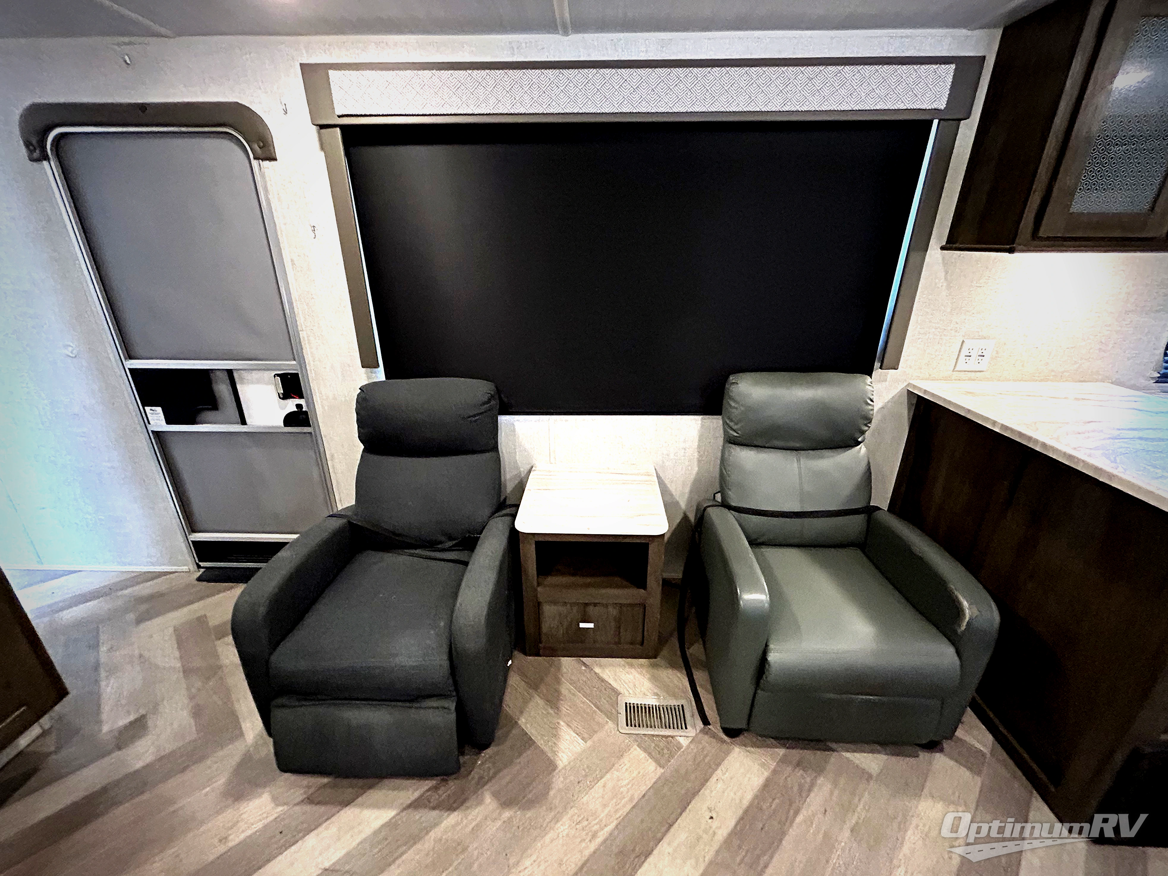 You will feel so comfortable in this Salem travel trailer! The fireplace is a great addition to the living area, and the Versa Lounge is a very convenient feature in this living area because it can transform into whatever you need it to be, like a bed or chaise lounge. You will also find a set of lounge chairs next to the rear kitchen which means that while you are relaxing you can chat with the cook who is sizzling up some burgers on the three-burner, high-output range with oven. If the cook needs some help, you can grab all of the condiments and drinks for dinner from the oversized refrigerator.