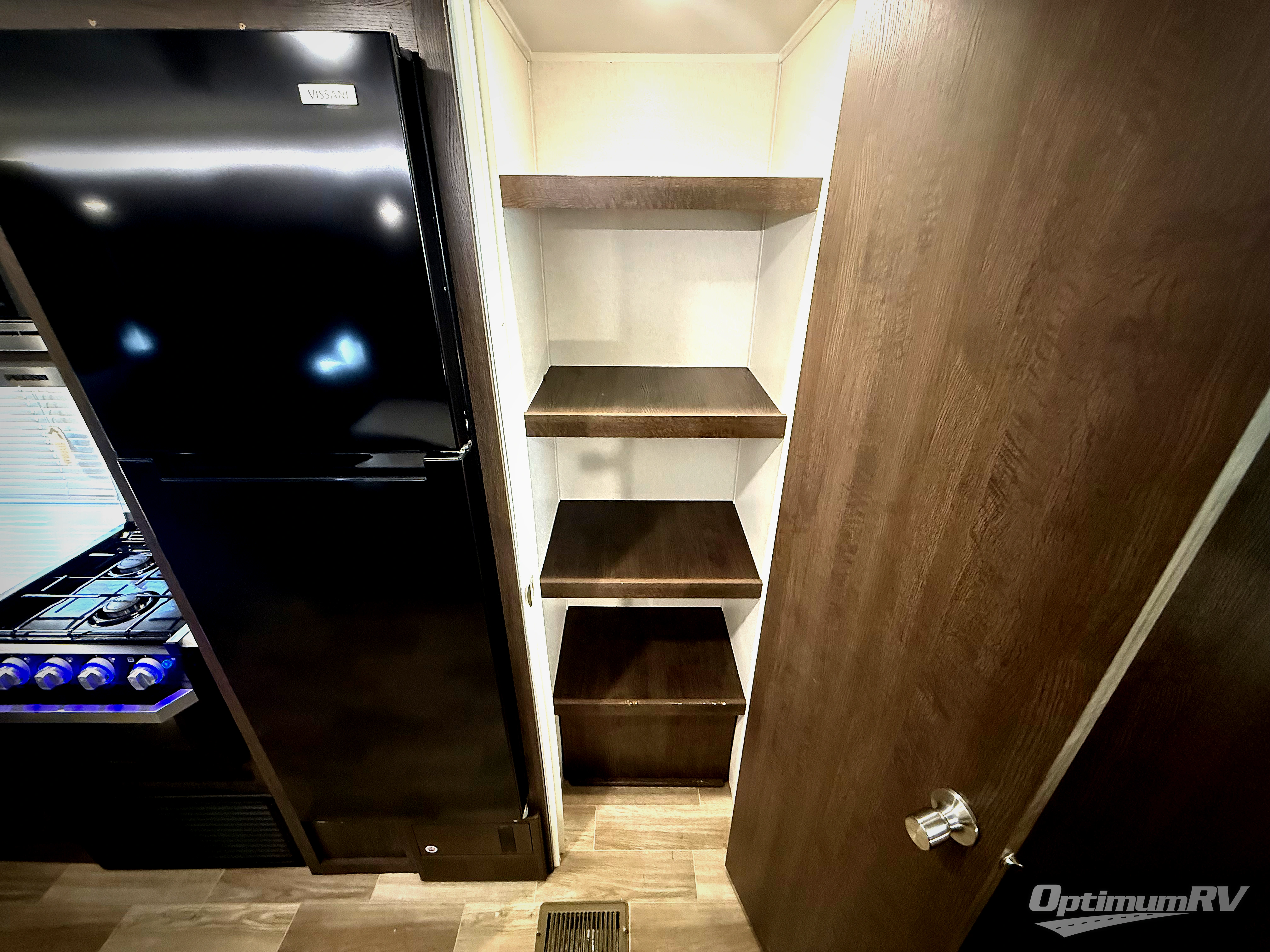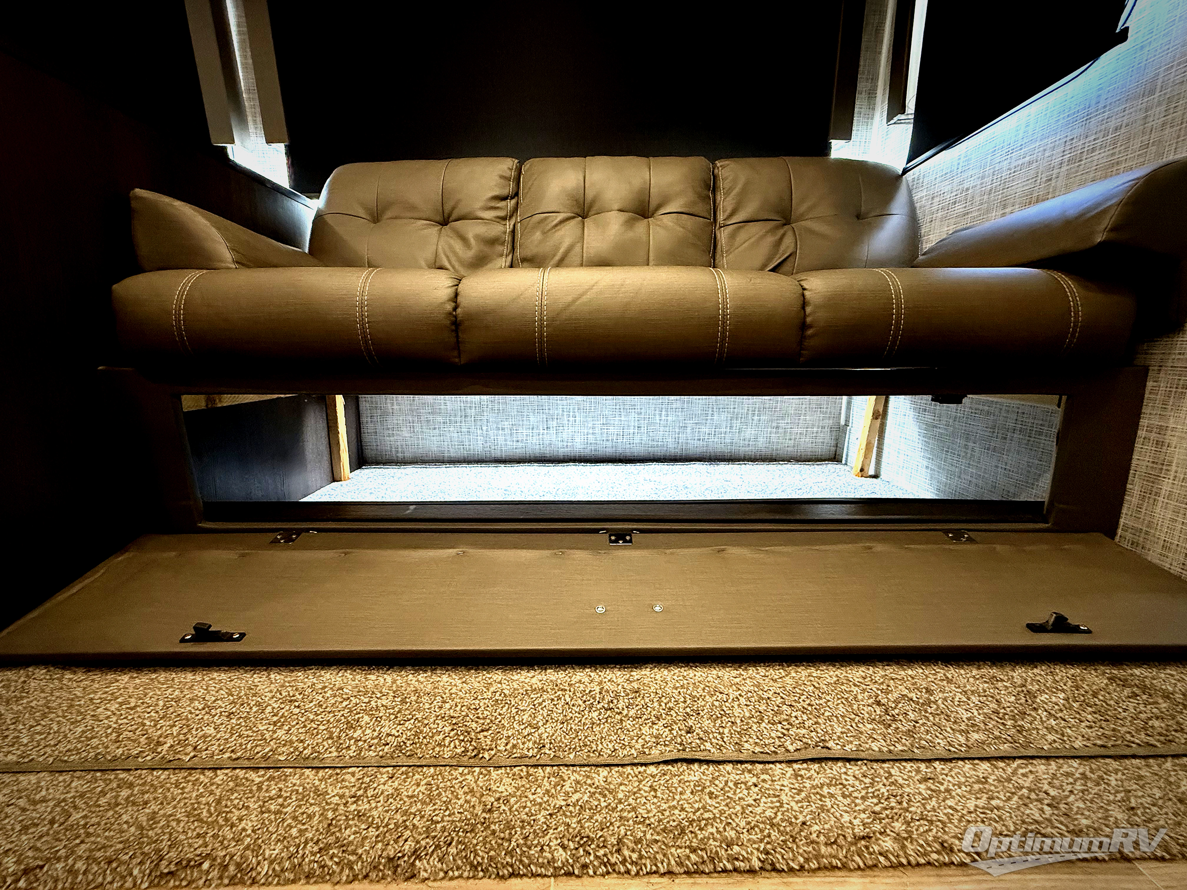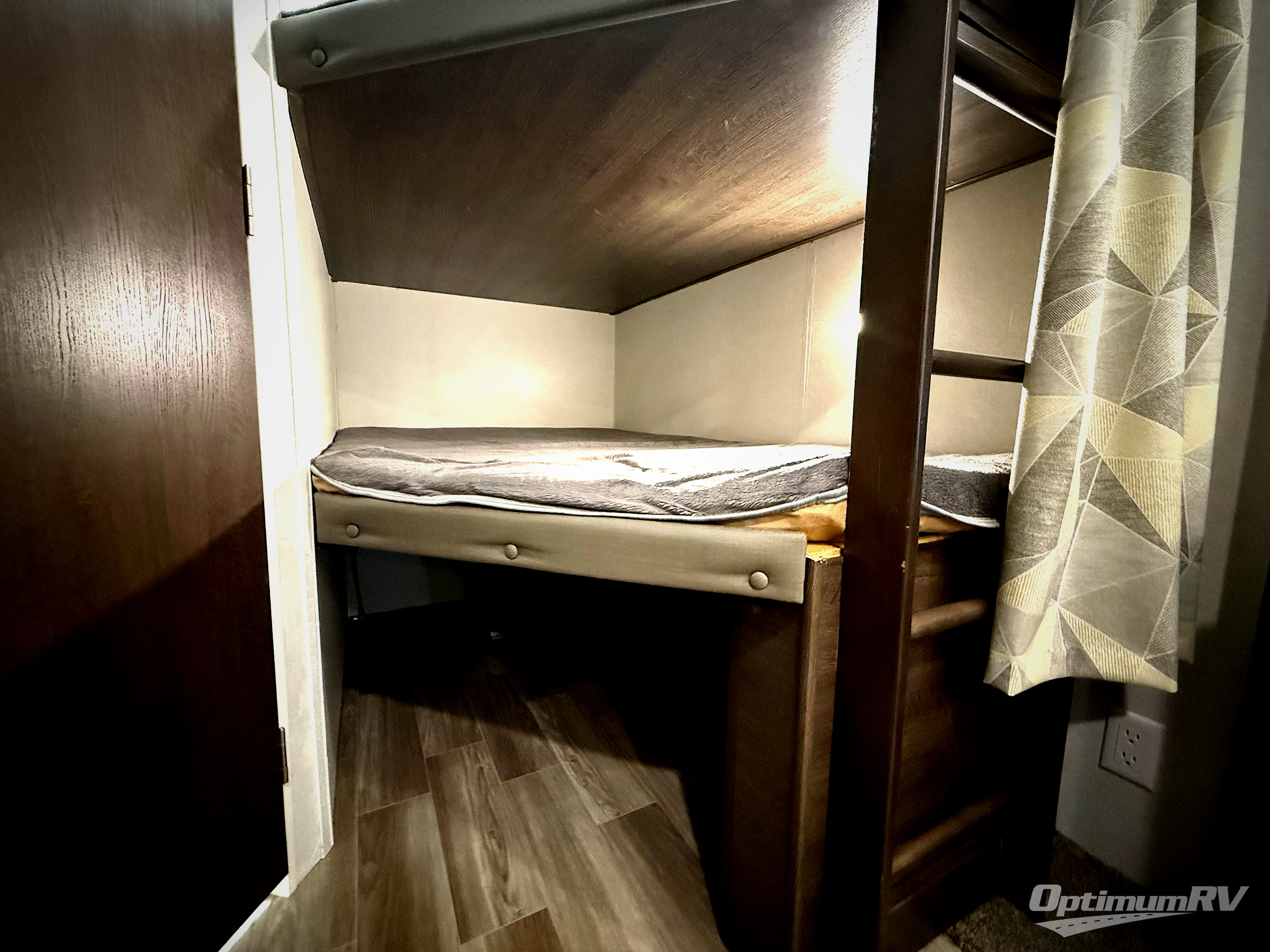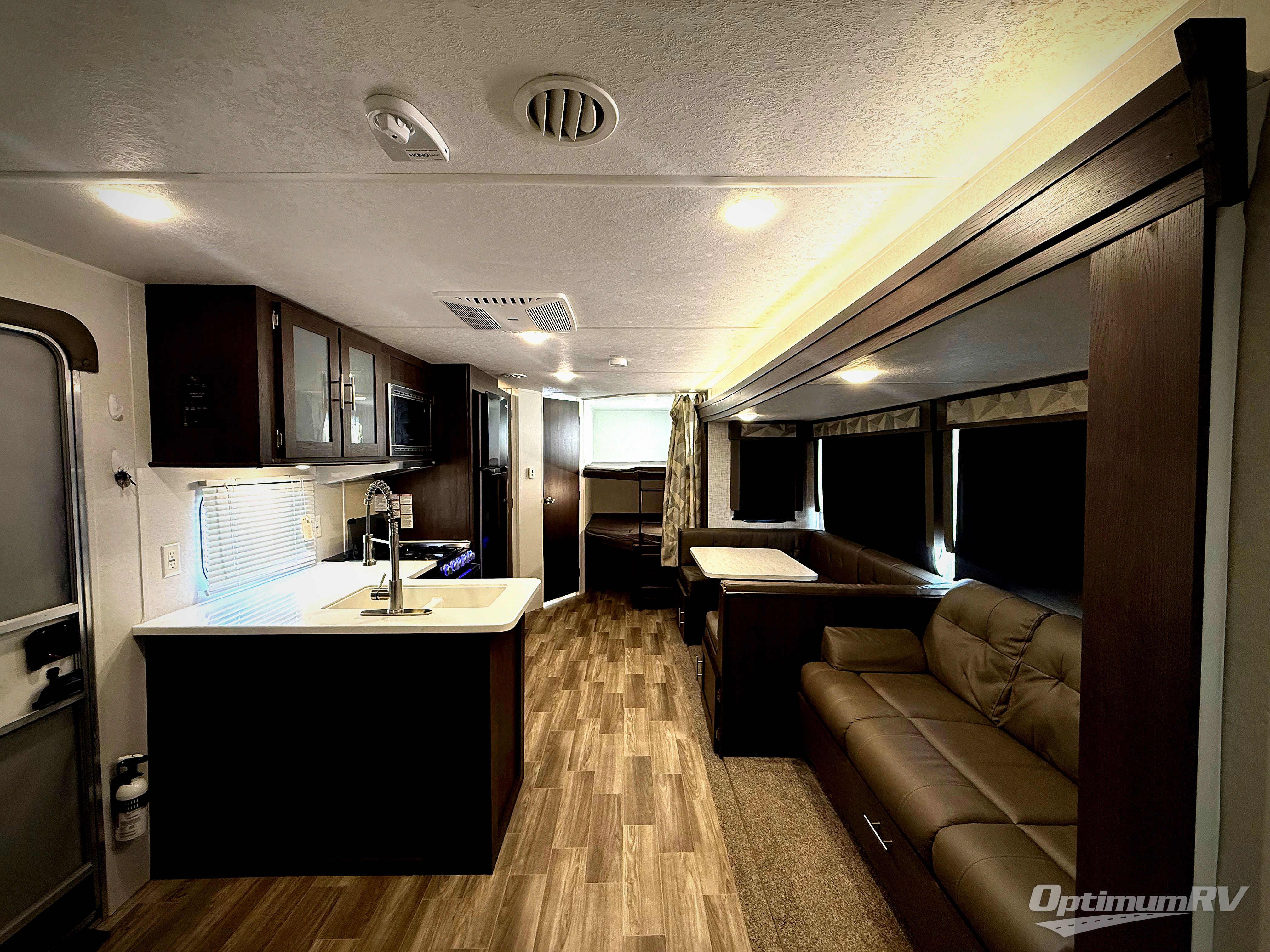 This travel trailer is perfect for a larger group and family since it includes double bunk beds for the kids and a front private bedroom for mom and dad. You'll find a Versa Lounge in the large slide out which includes a large U-shaped dinette and sofa and the panoramic windows will provide great views. This model includes dual entry doors; one leading into the main living area, and one into the rear corner bath for convenience. Bring along all of your camp gear and store it in the pass-through storage and the walk-in pantry indoors can hold all the snacks.