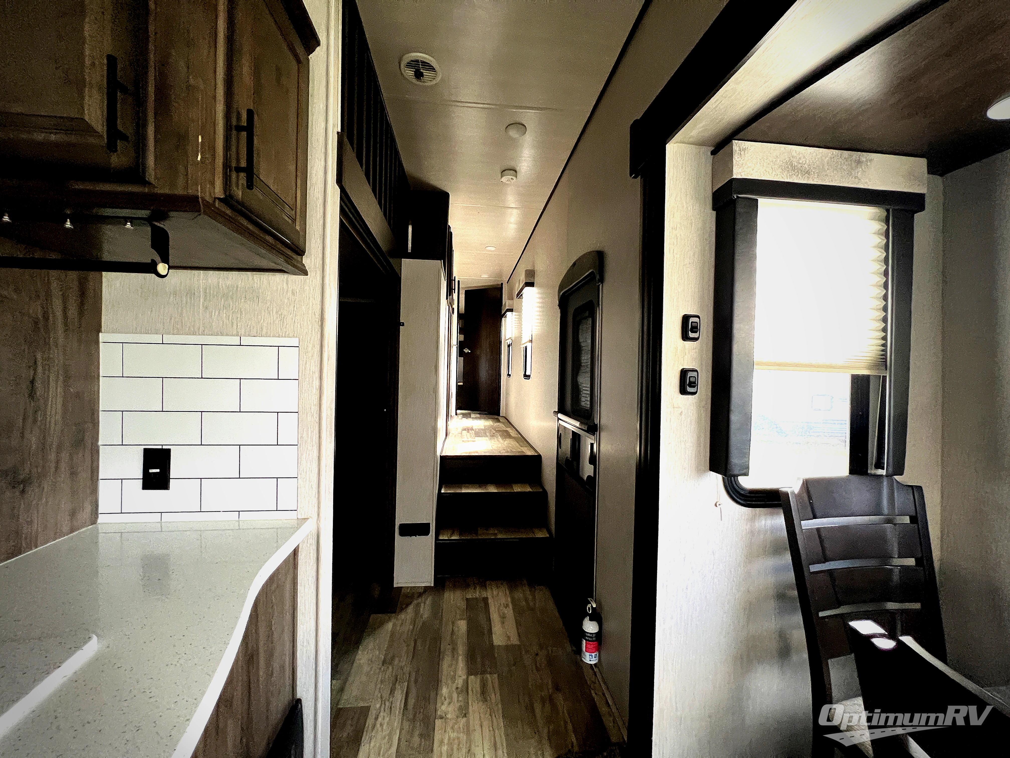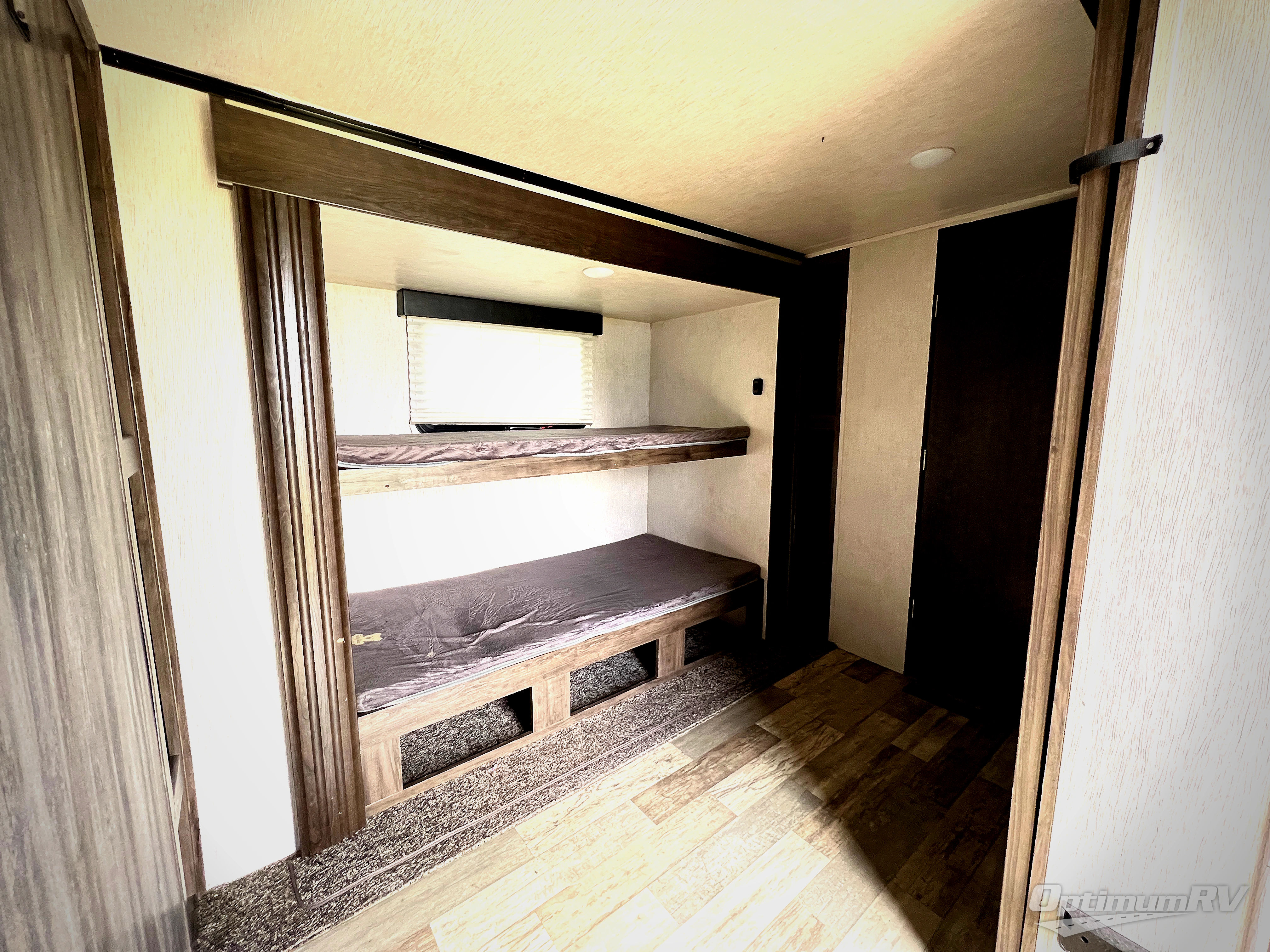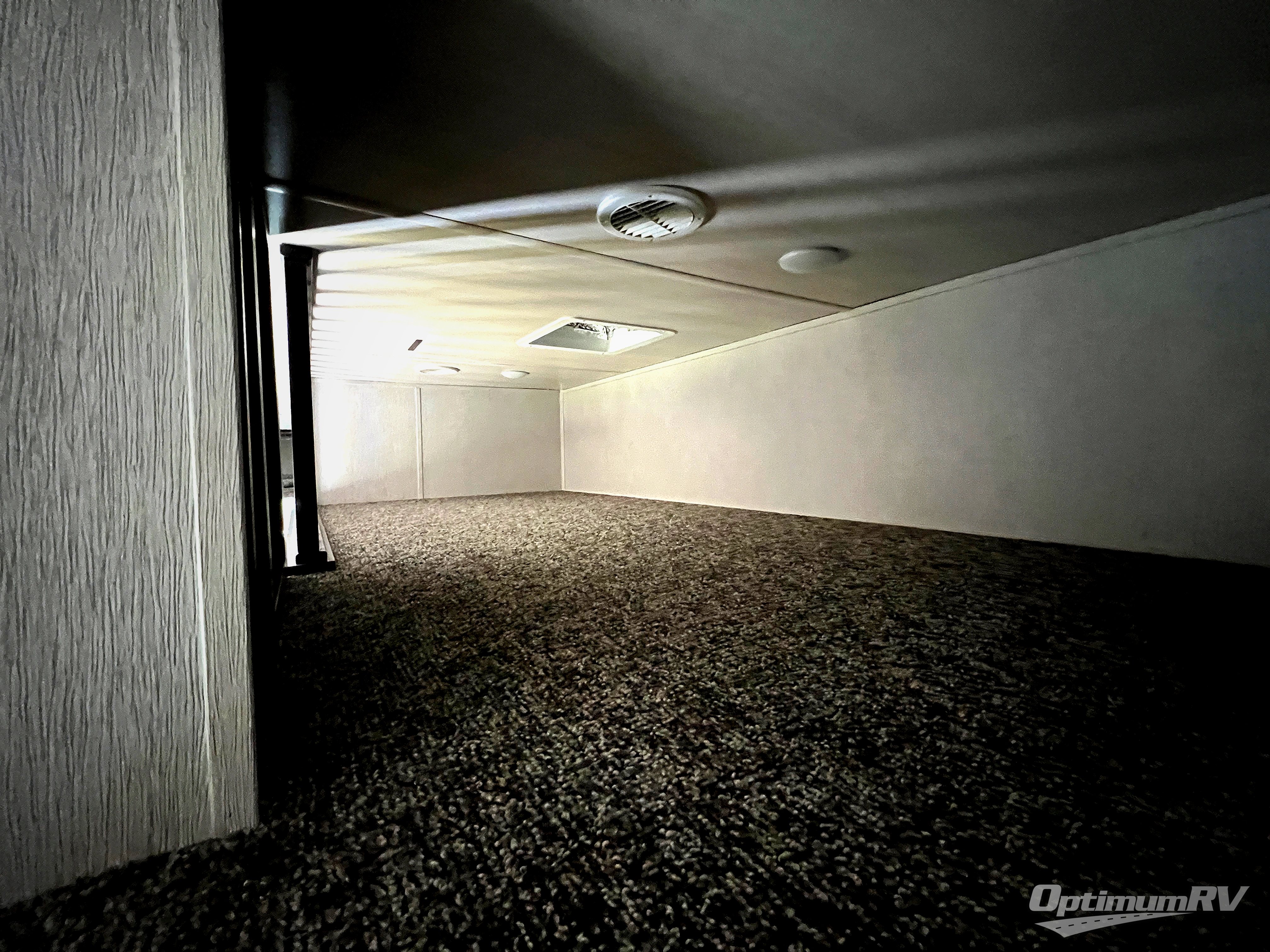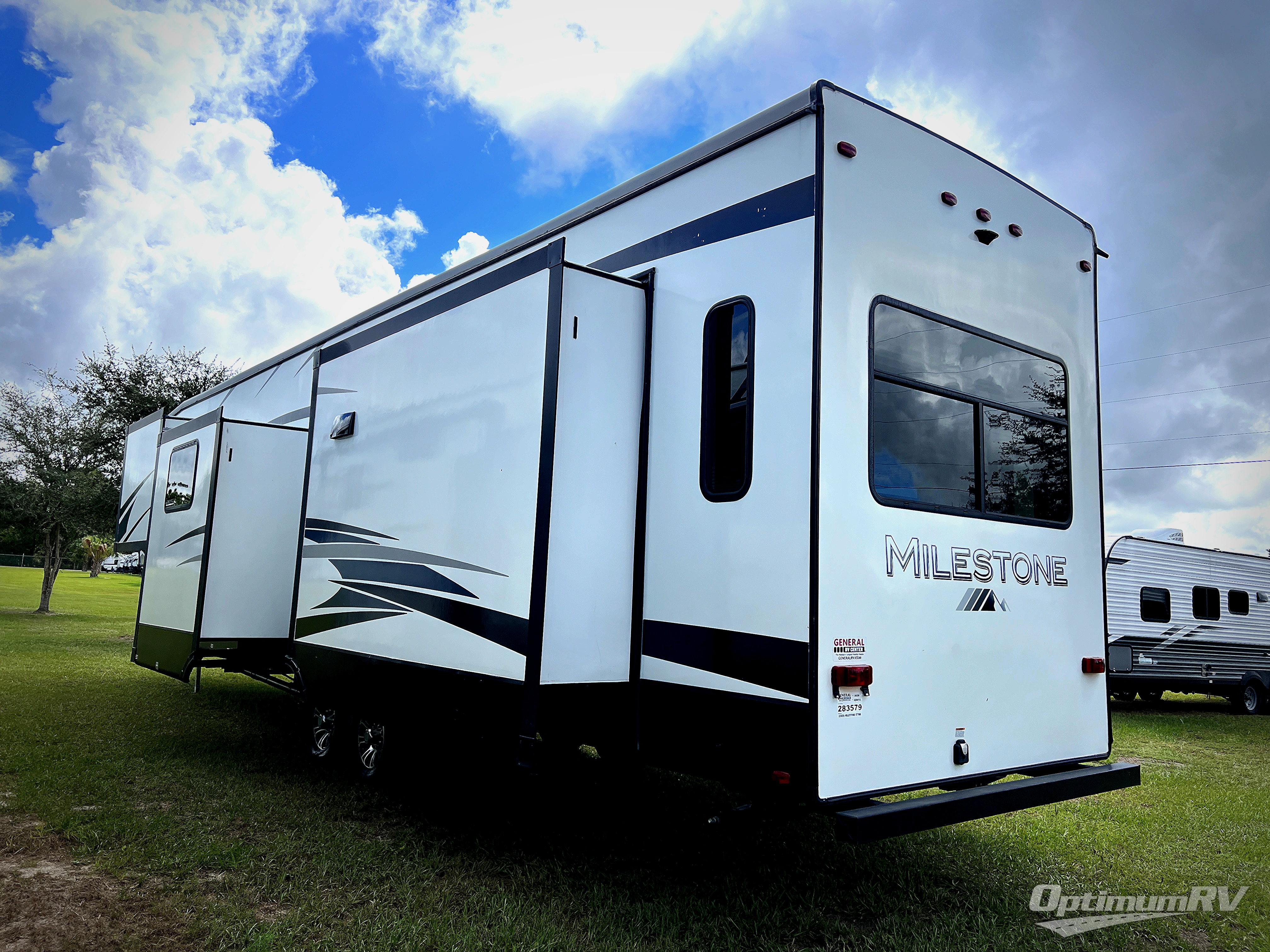 Imagine the kids laughing and visiting about their day as they sleep in the middle bunkhouse which also includes a half bath and storage for their things in this Milestone fifth wheel. If they invited their friends, the loft offers more sleeping space. You will have your own master suite with a walk-around bed and a wardrobe slide out that extends into the dual-entry bathroom. The rear living area provides a sofa and theater seating to relax on, and you will find all the kitchen appliances you will need including a residential refrigerator to store lots of cold food for everyone. The kitchen peninsula countertop is a great place to prepare and serve meals, and the large pantry will hold lots of ingredients and snacks.