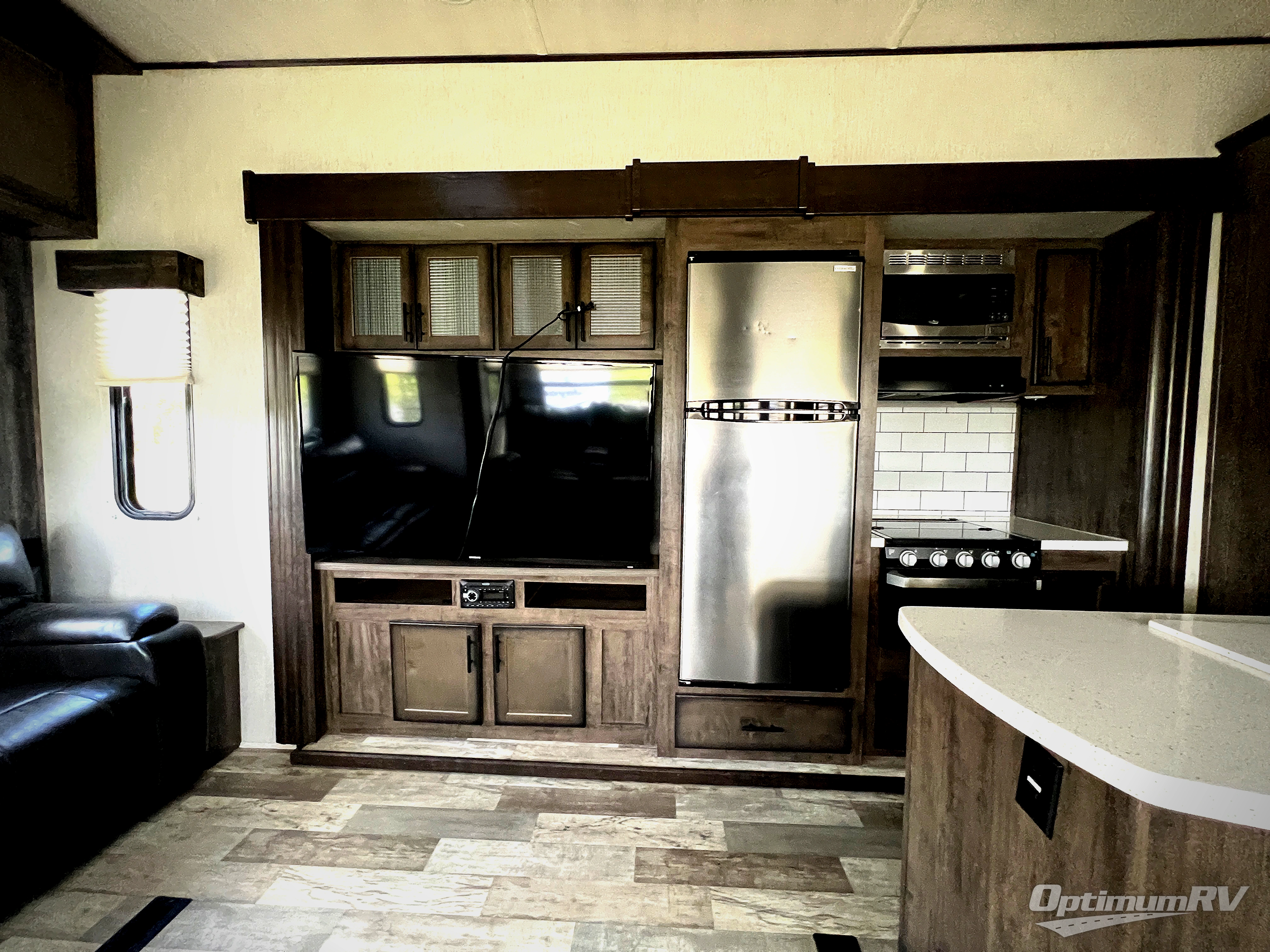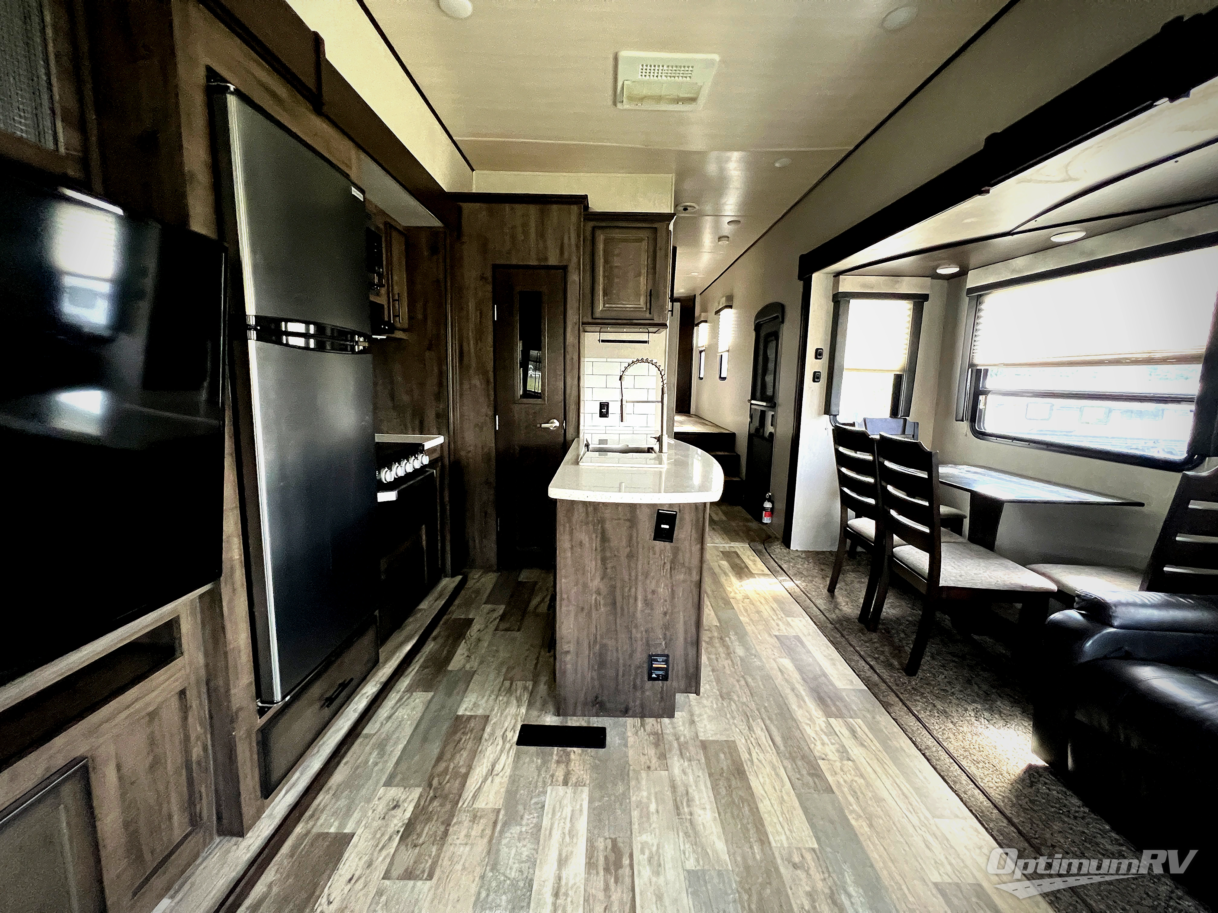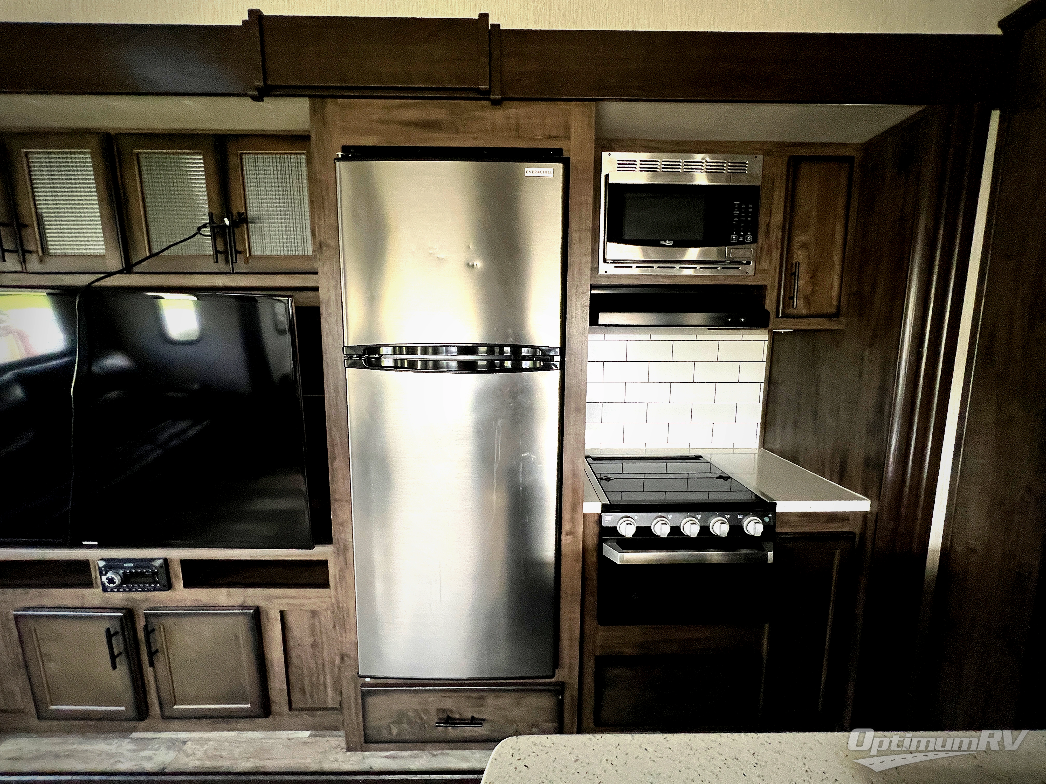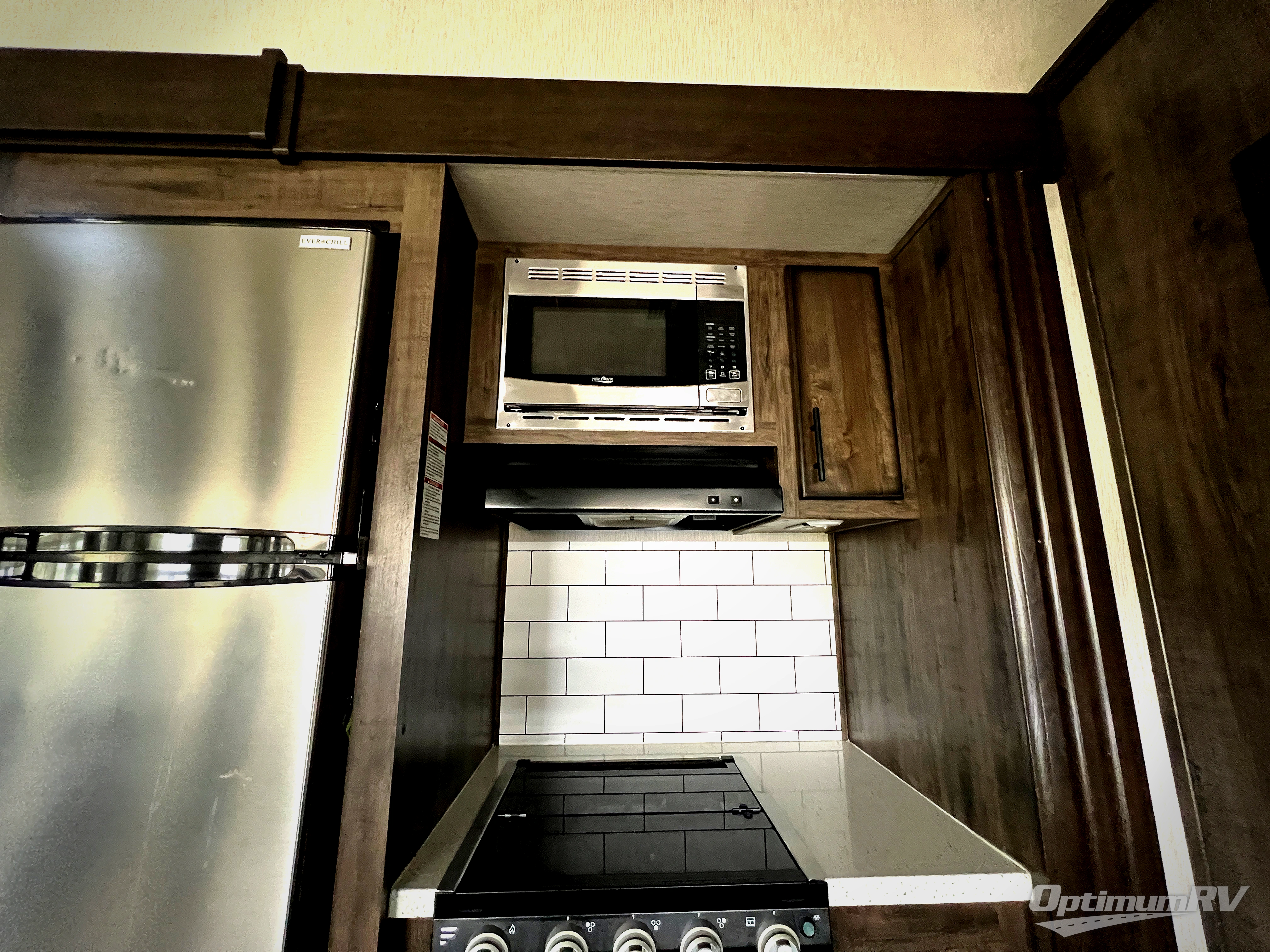Imagine the kids laughing and visiting about their day as they sleep in the middle bunkhouse which also includes a half bath and storage for their things in this Milestone fifth wheel. If they invited their friends, the loft offers more sleeping space. You will have your own master suite with a walk-around bed and a wardrobe slide out that extends into the dual-entry bathroom. The rear living area provides a sofa and theater seating to relax on, and you will find all the kitchen appliances you will need including a residential refrigerator to store lots of cold food for everyone. The kitchen peninsula countertop is a great place to prepare and serve meals, and the large pantry will hold lots of ingredients and snacks.