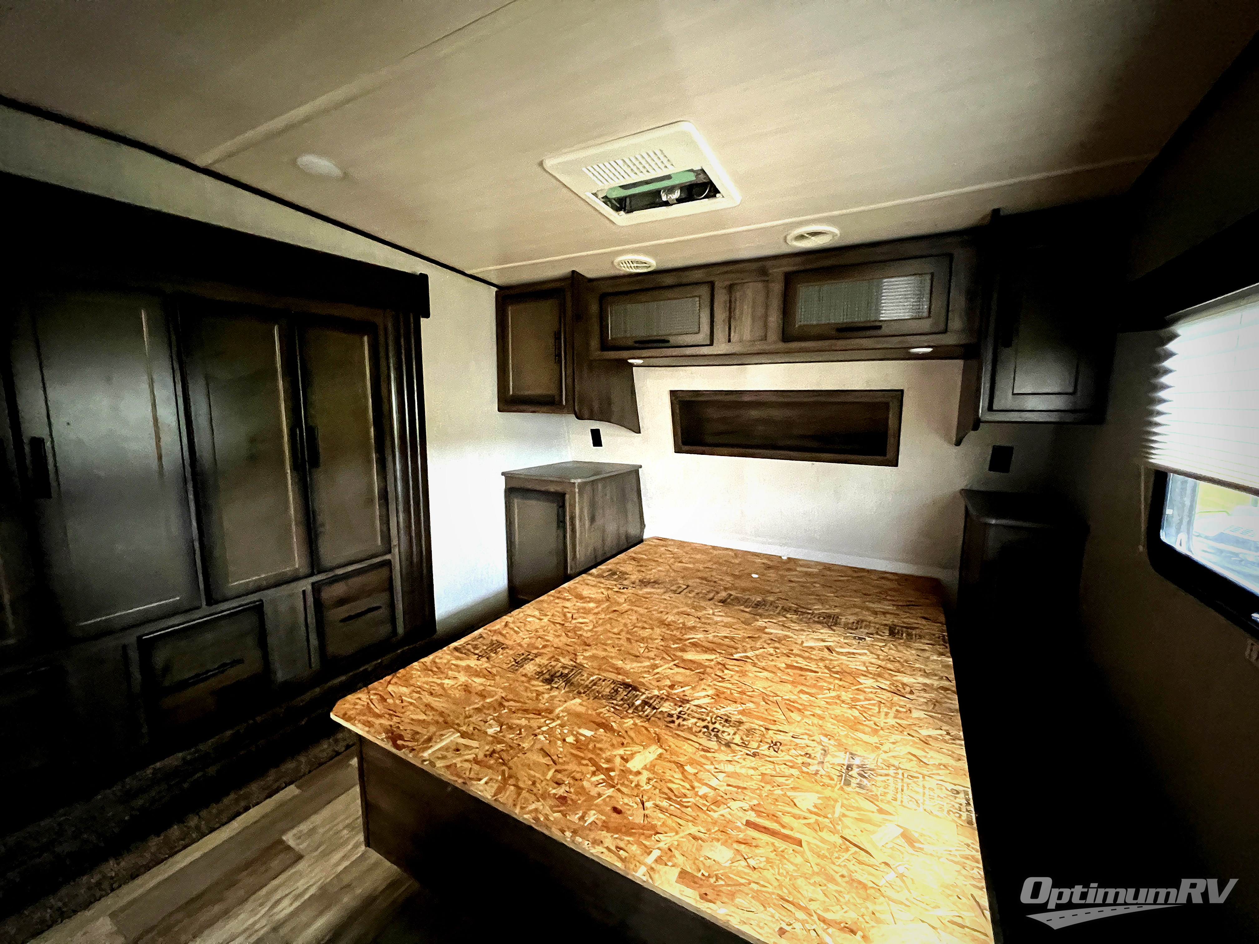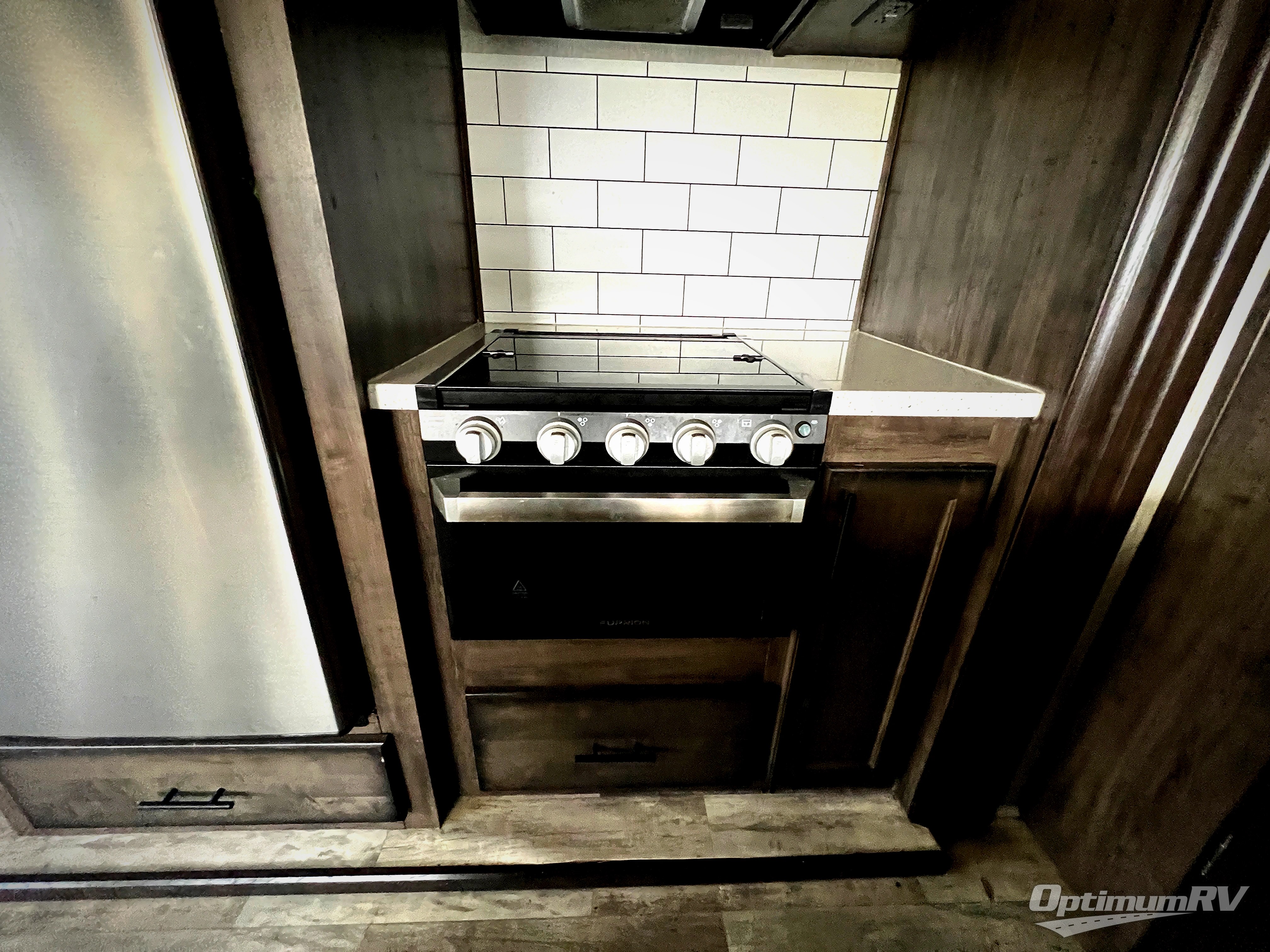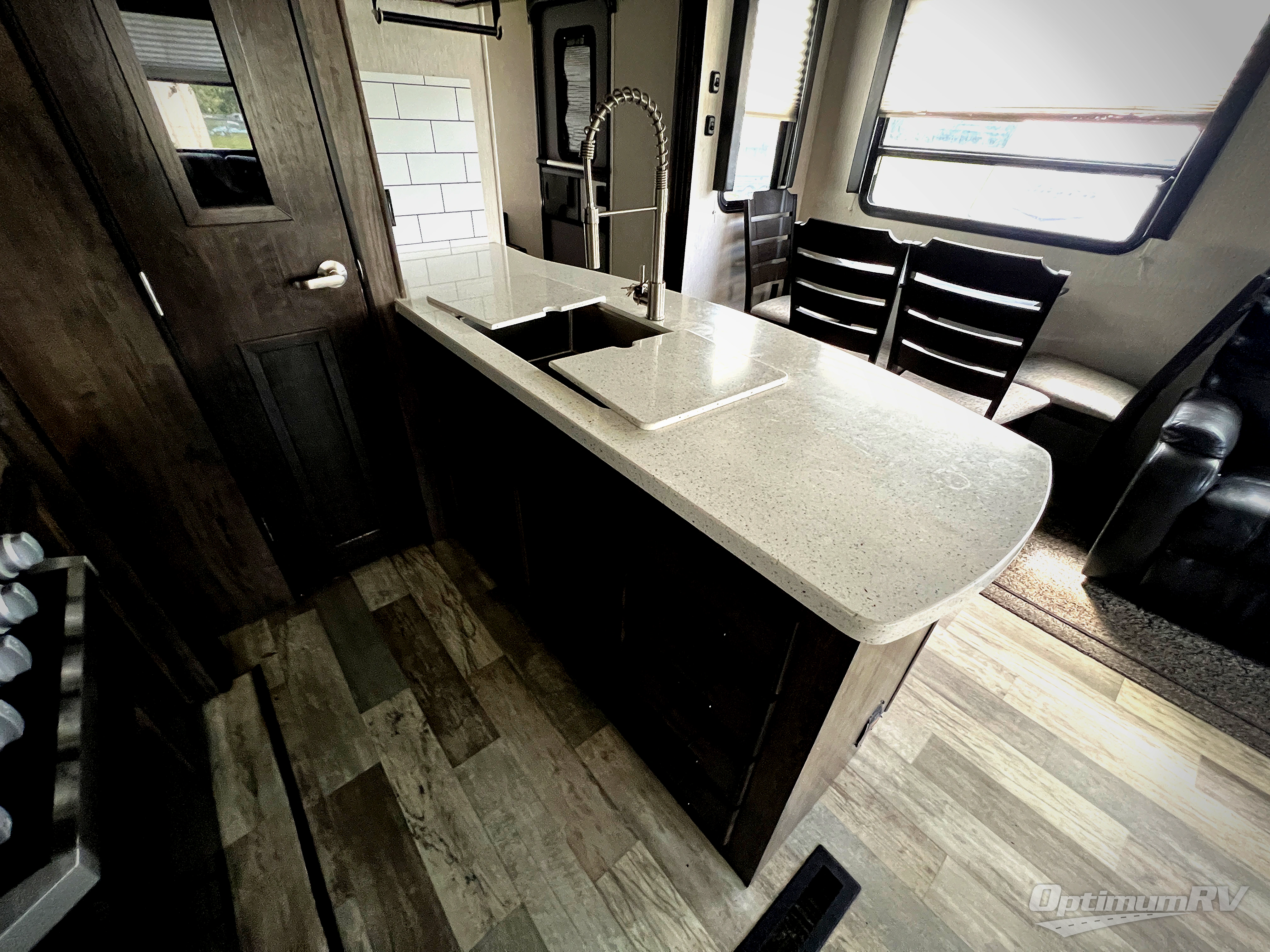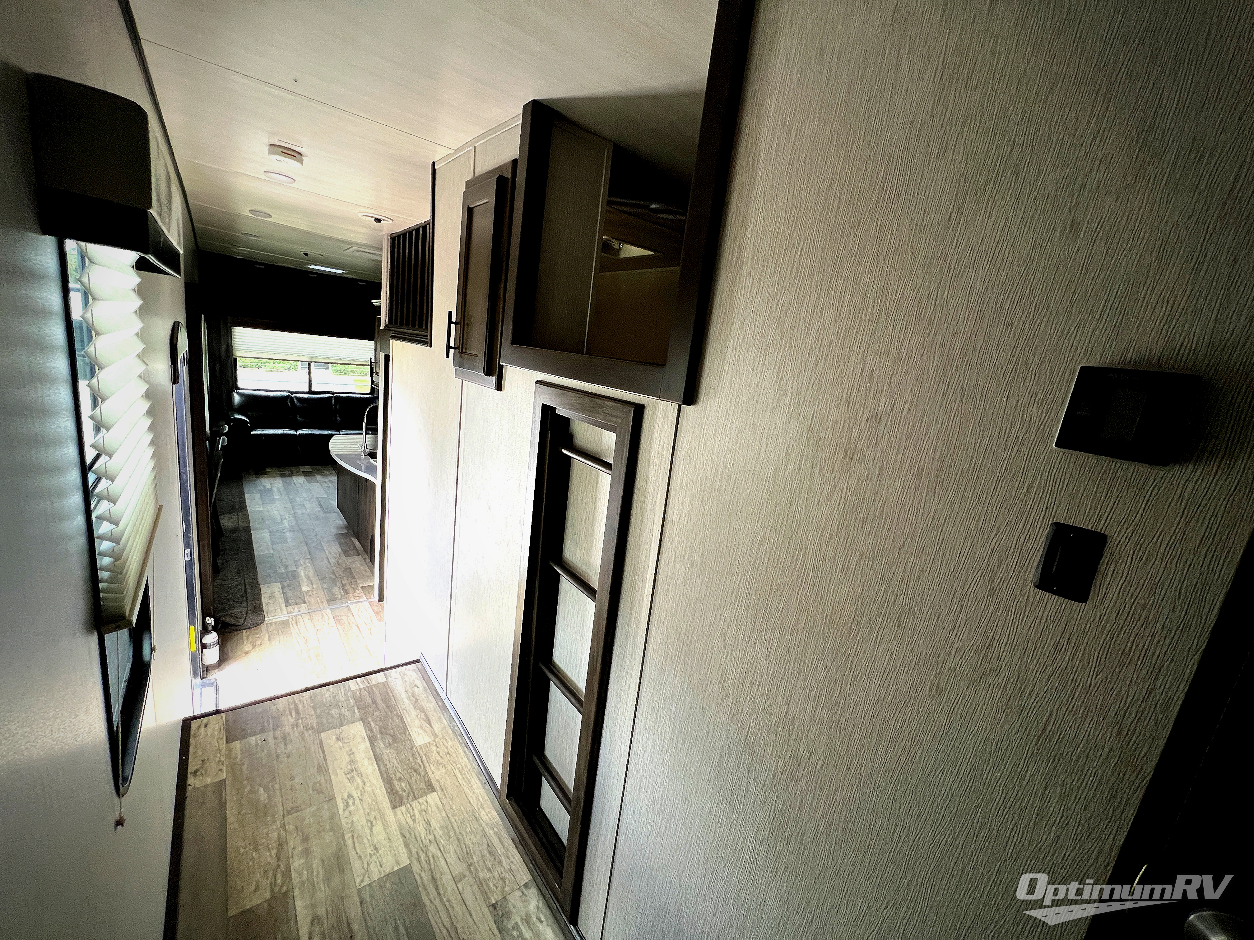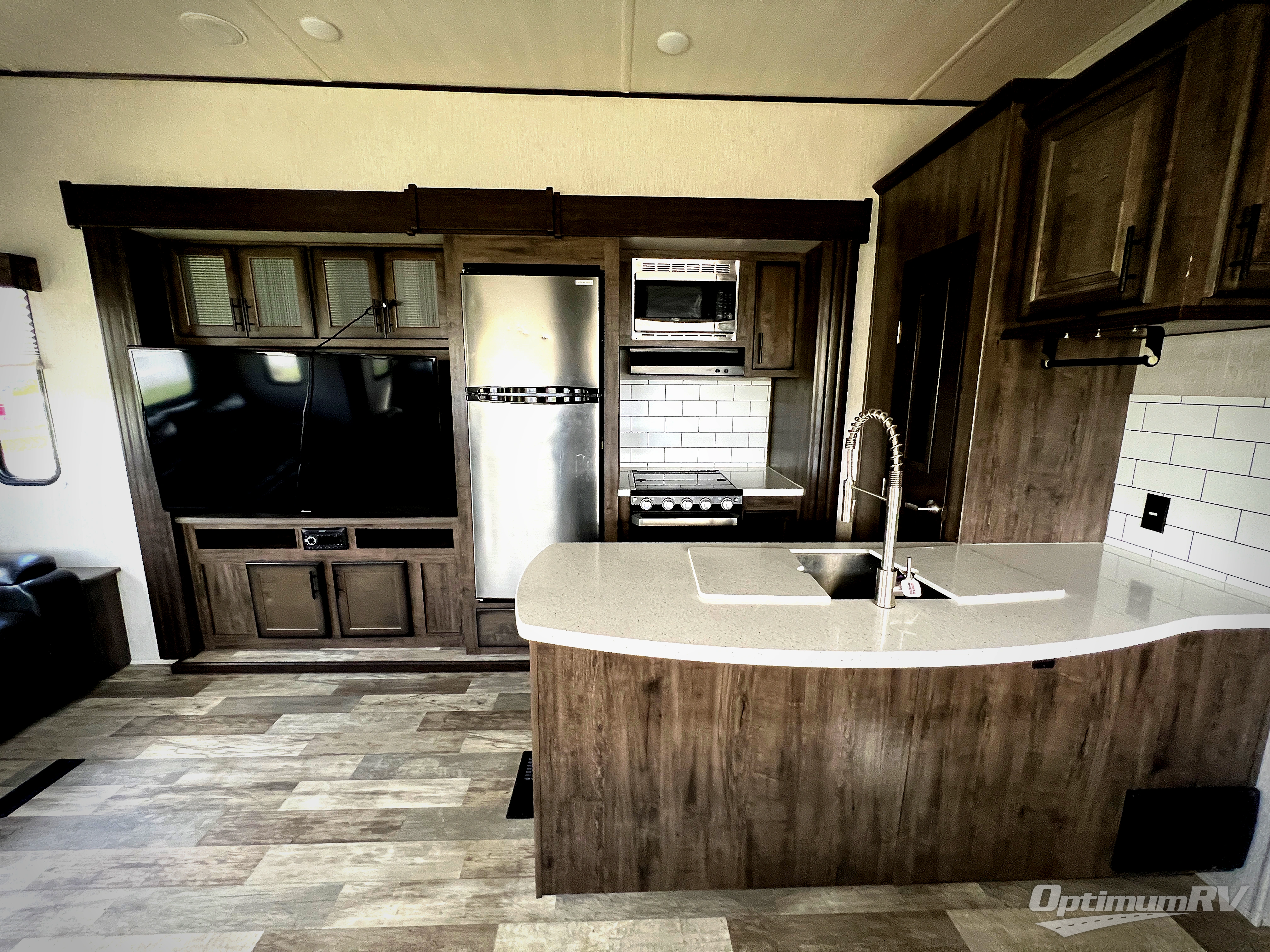 Imagine the kids laughing and visiting about their day as they sleep in the middle bunkhouse which also includes a half bath and storage for their things in this Milestone fifth wheel. If they invited their friends, the loft offers more sleeping space. You will have your own master suite with a walk-around bed and a wardrobe slide out that extends into the dual-entry bathroom. The rear living area provides a sofa and theater seating to relax on, and you will find all the kitchen appliances you will need including a residential refrigerator to store lots of cold food for everyone. The kitchen peninsula countertop is a great place to prepare and serve meals, and the large pantry will hold lots of ingredients and snacks.