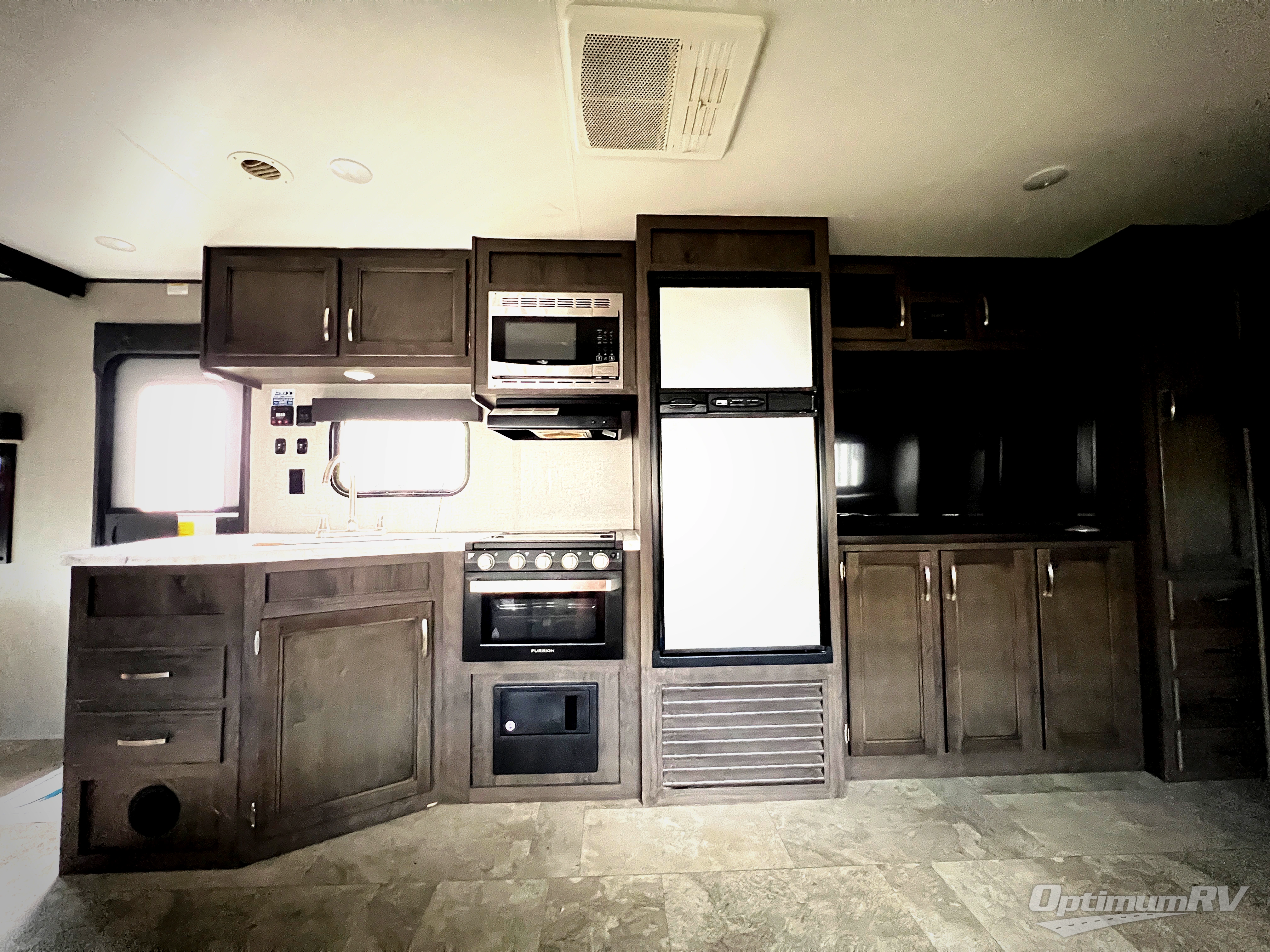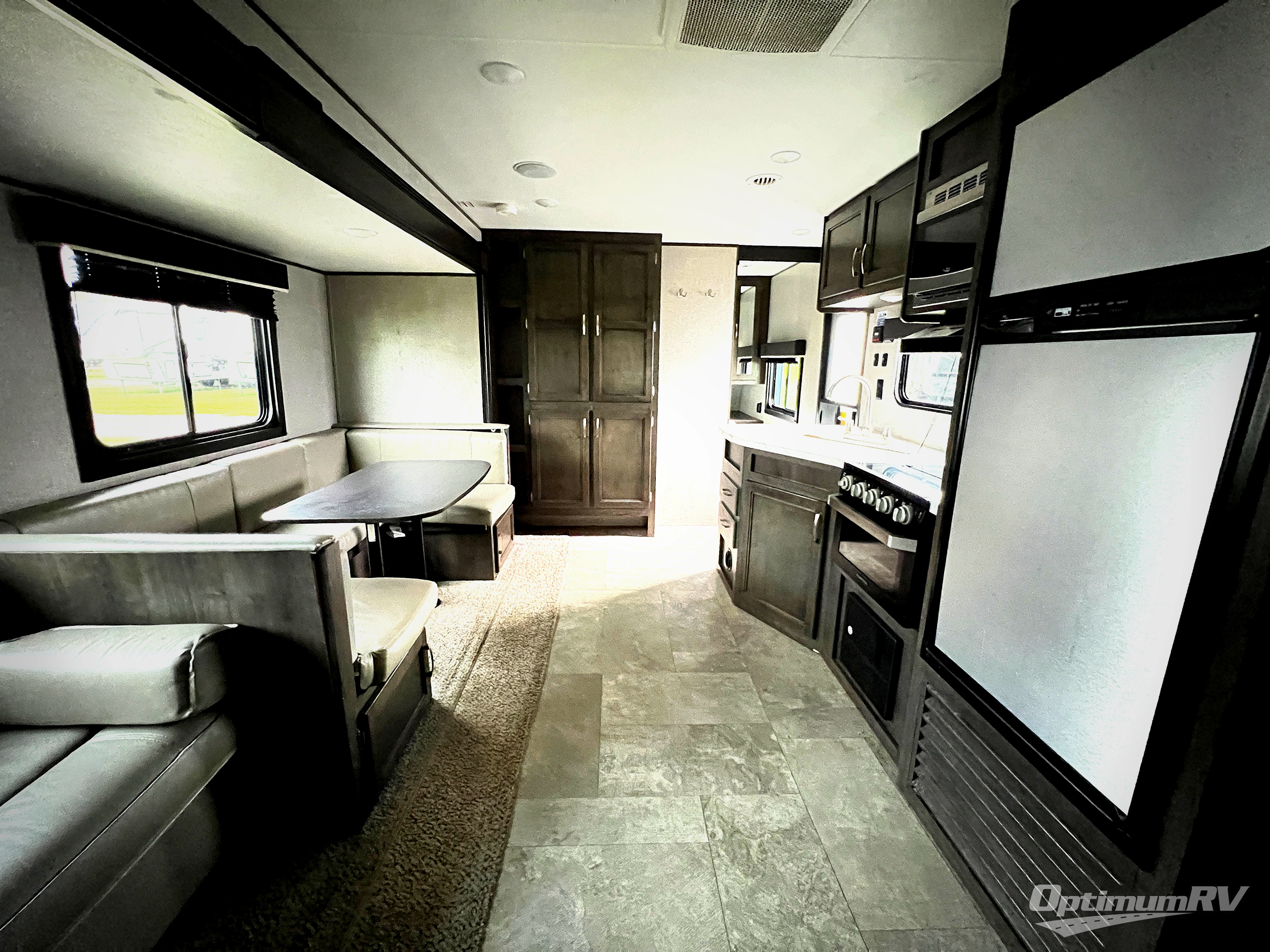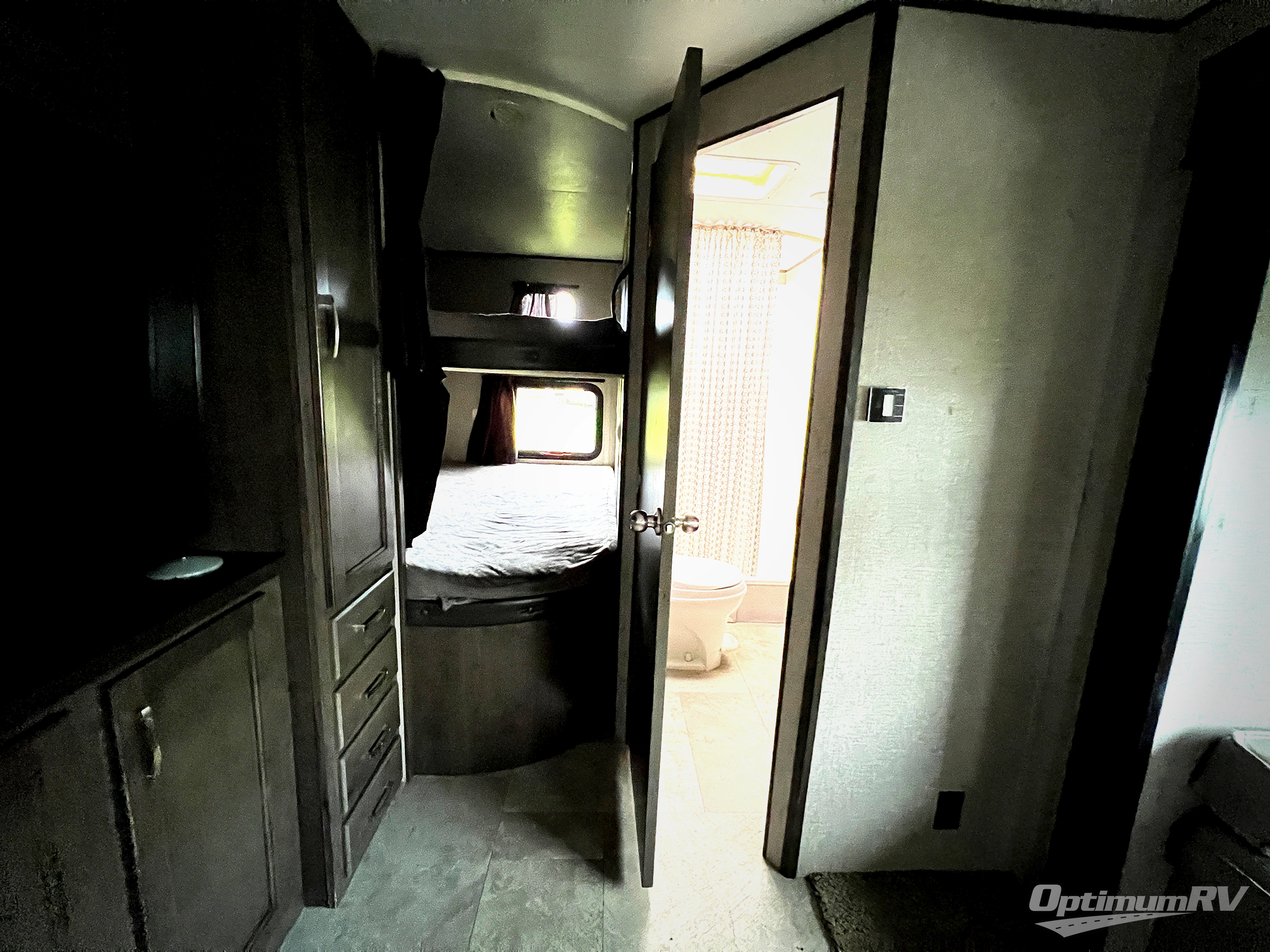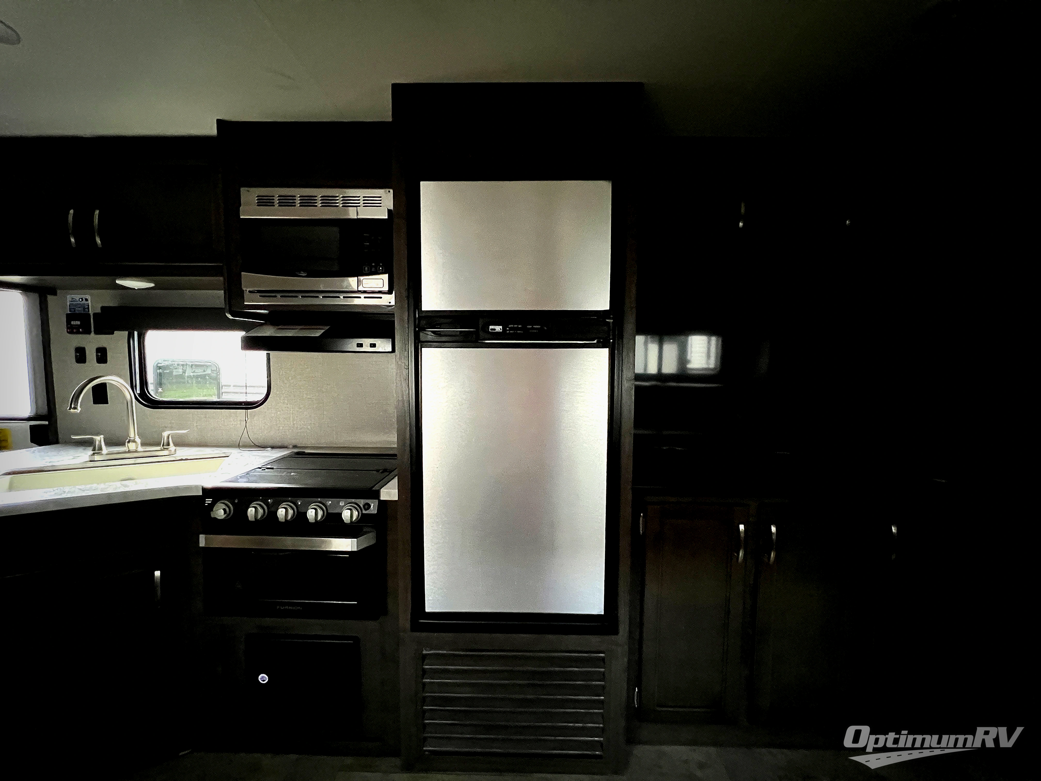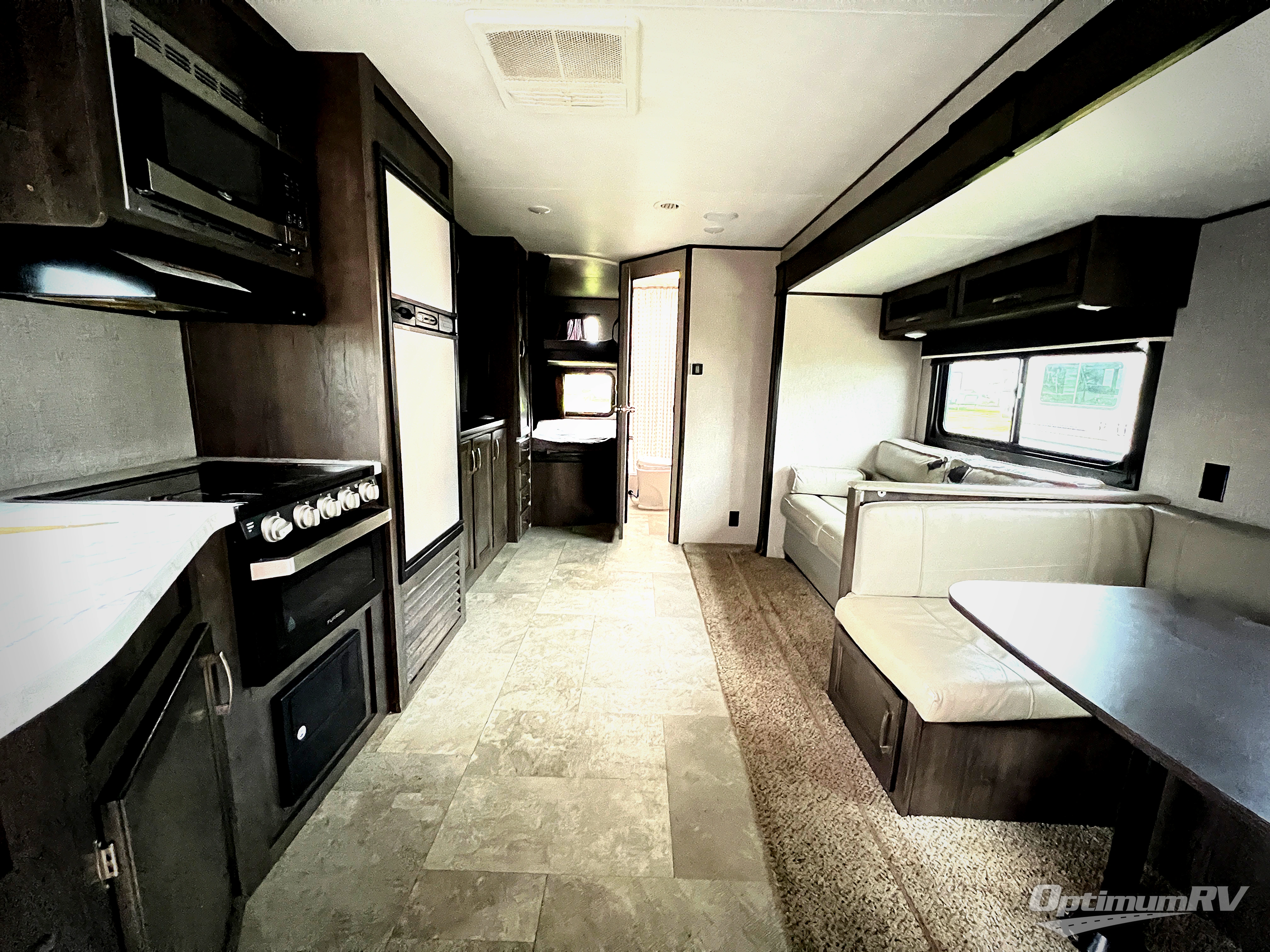 How does cooking breakfast, lunch and even dinner outdoors sound? Well you have that choice each day thanks to the outside kitchen, plus the full kitchen inside offers even more appliances and seamless solid surface countertops. The spacious living area offers a slide out jackknife sofa and U-shaped dinette, and an entertainment center with a 48" TV, plus bench/storage which is quiet handy as you enter the trailer. The kids will enjoy having their own double size bunk with privacy curtain and you can slide the master bedroom door closed and fall asleep on your own queen bed to wake up to grab your clothing from the solid wood cabinet wardrobes.
