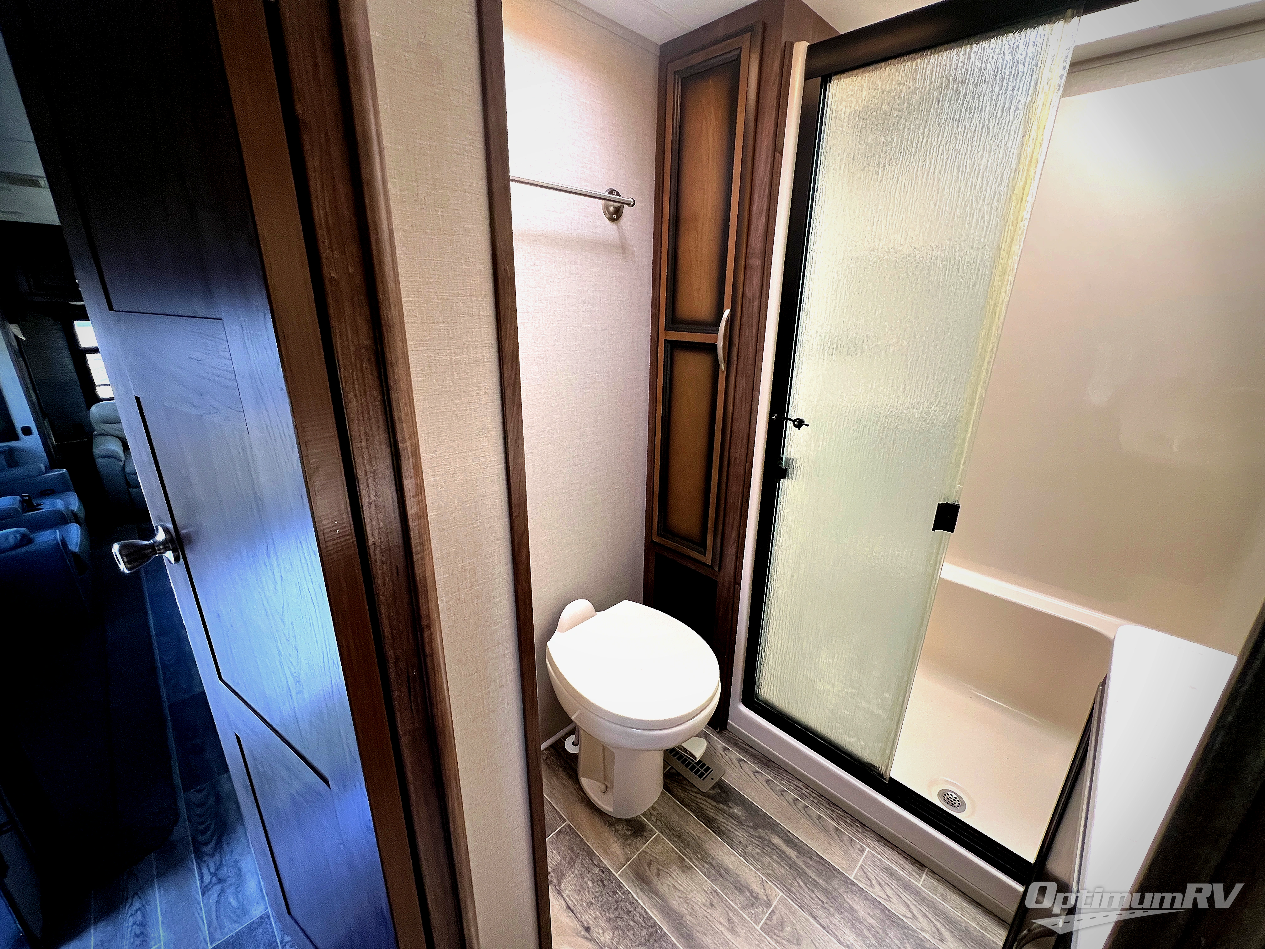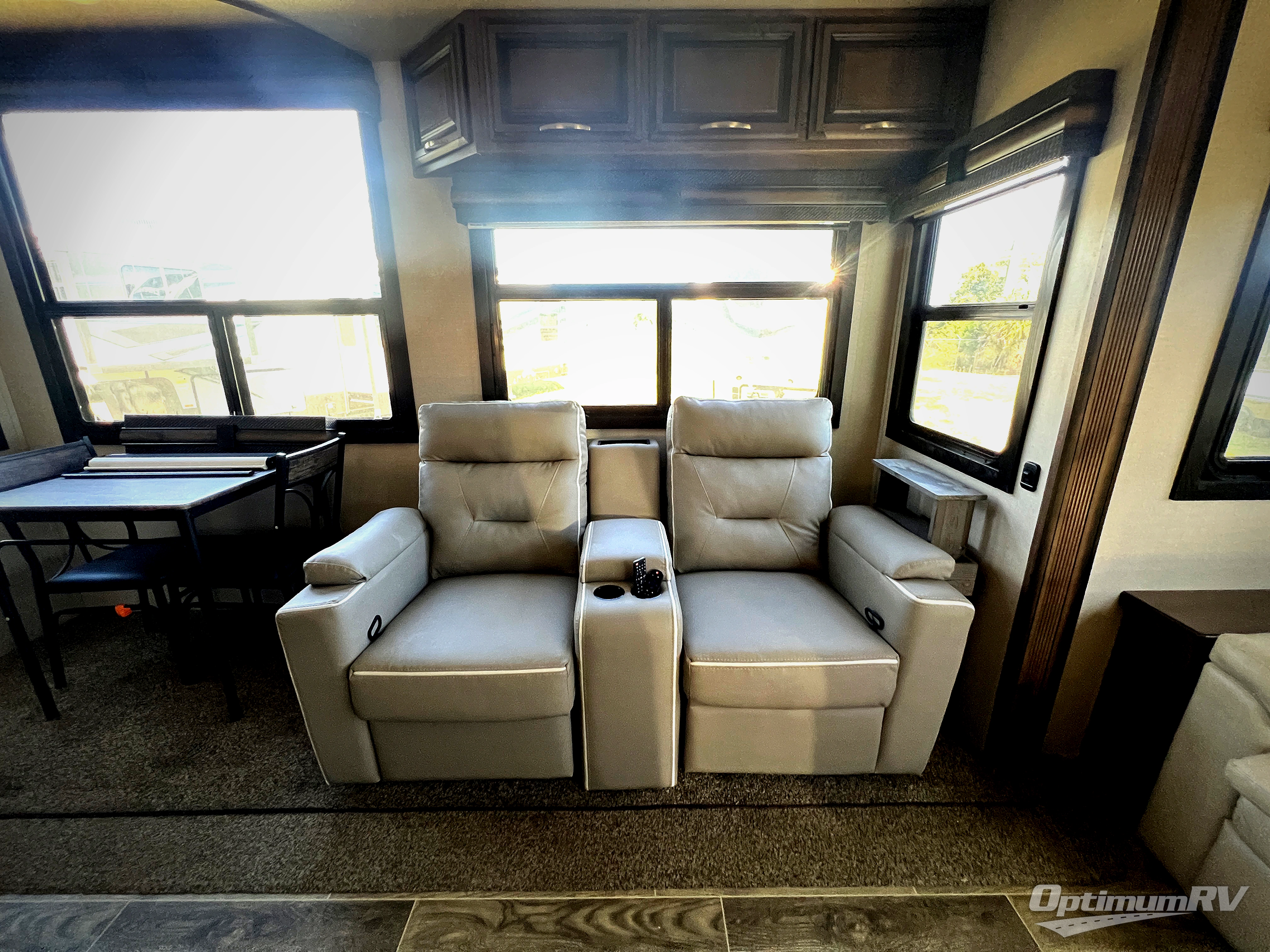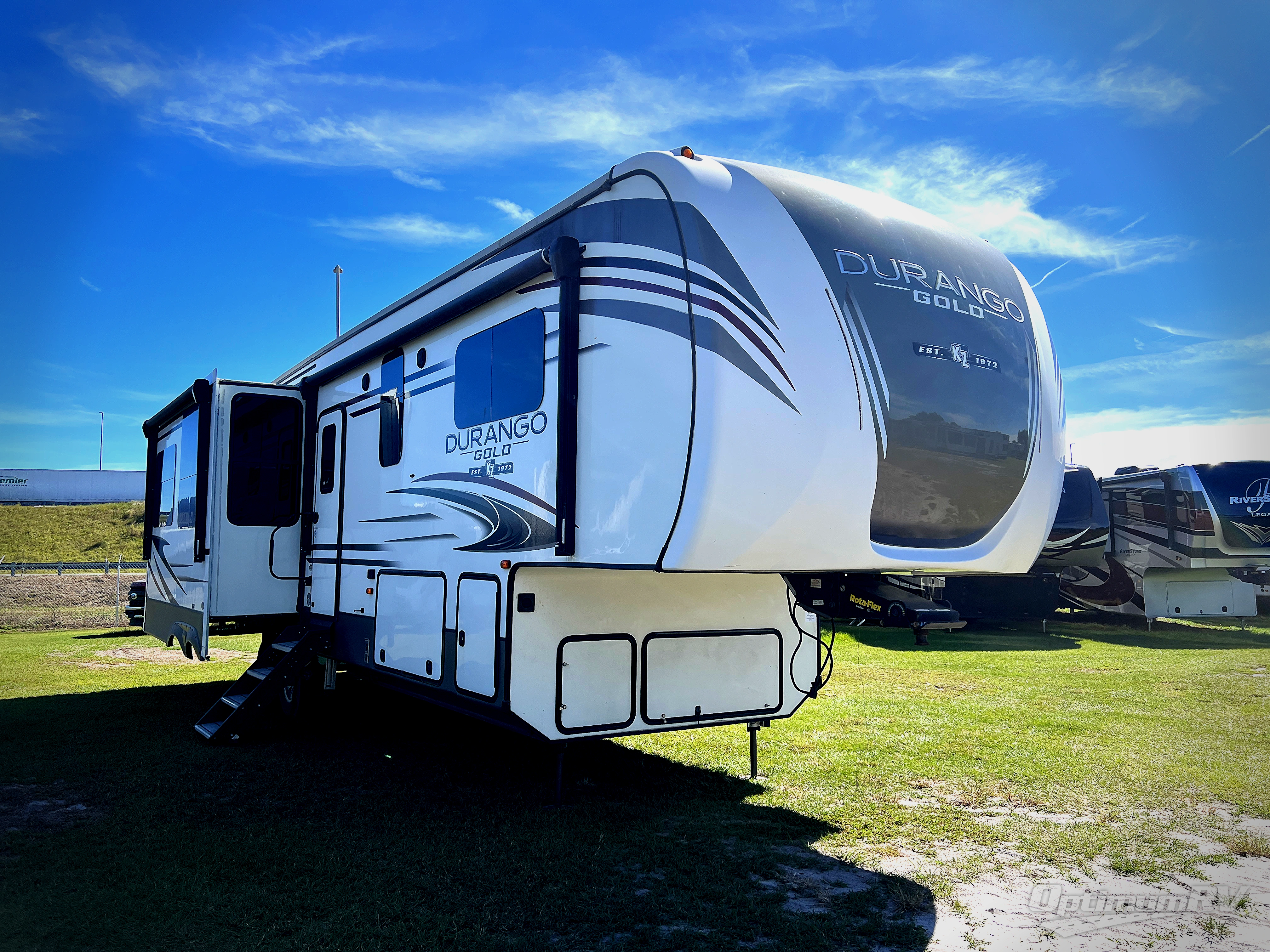 Step up into full-time RV living the right way, in this Durango Gold fifth wheel. You'll love the space you have thanks to the dual opposing slides in the rear kitchen/living area and there is a third slide in the front master suite for even more space. Spend your days exploring or just relaxing outside under the power awning and the full bath will allow you to clean up just like you do at home. Watch your favorite shows on the 50" LED TV or catch up on some reading with the cozy fireplace on. Since this model features theater seating with heat, massage, LED lit cup holders, and power recline, you may never want to leave your seat! When it's time to call it a night, the electric tilt king bed will provide a great night's rest and you'll find plenty of storage for all your clothes, including a dresser with hidden storage!