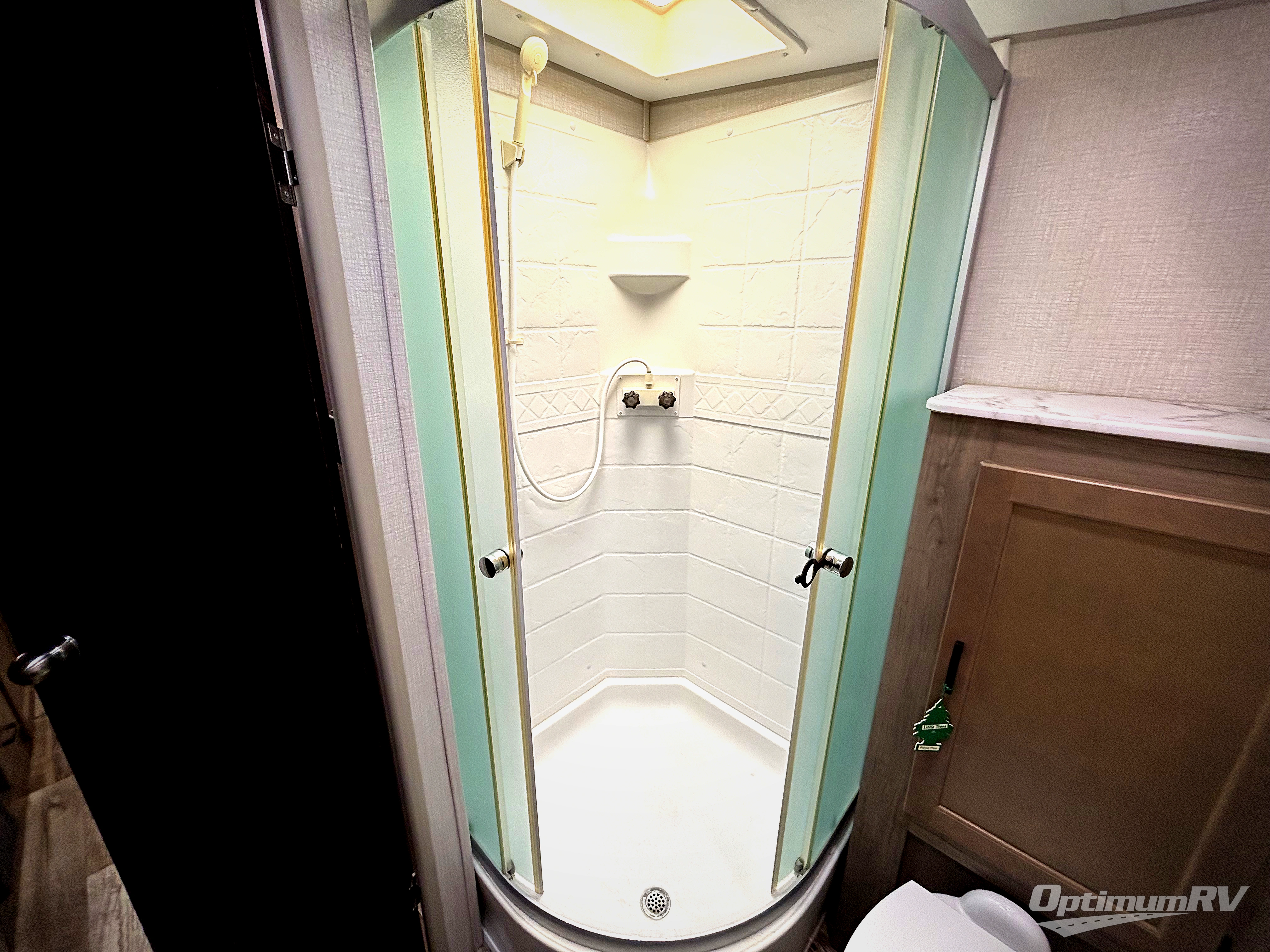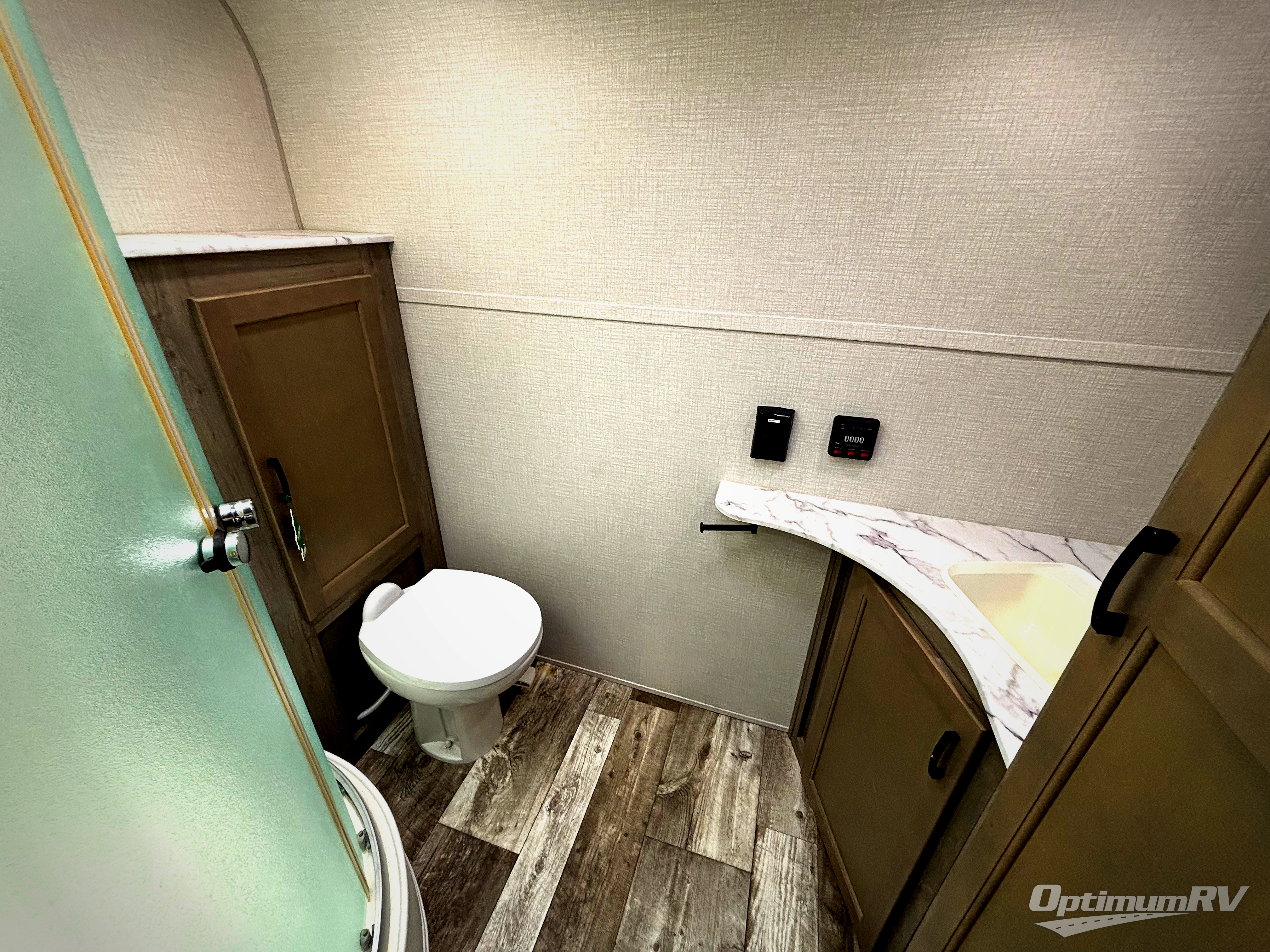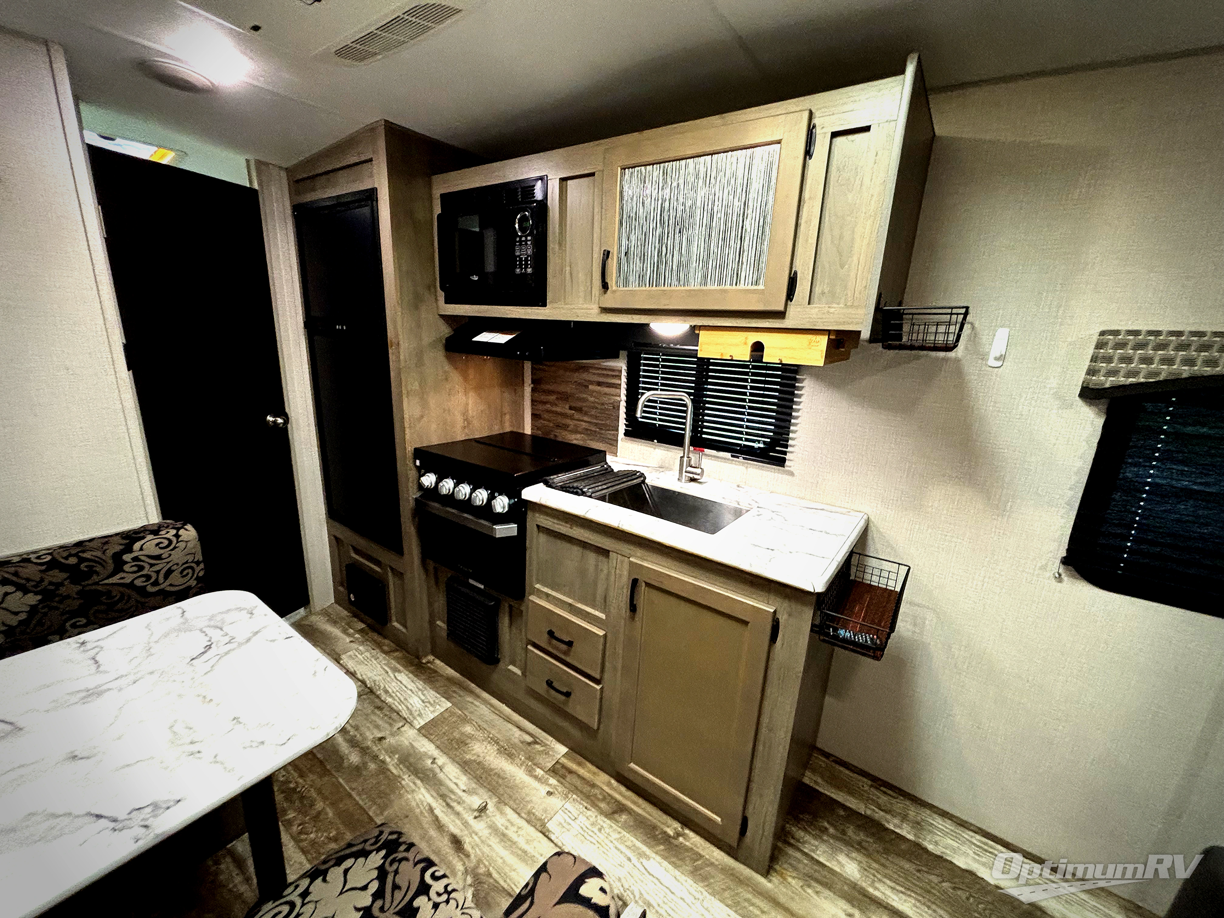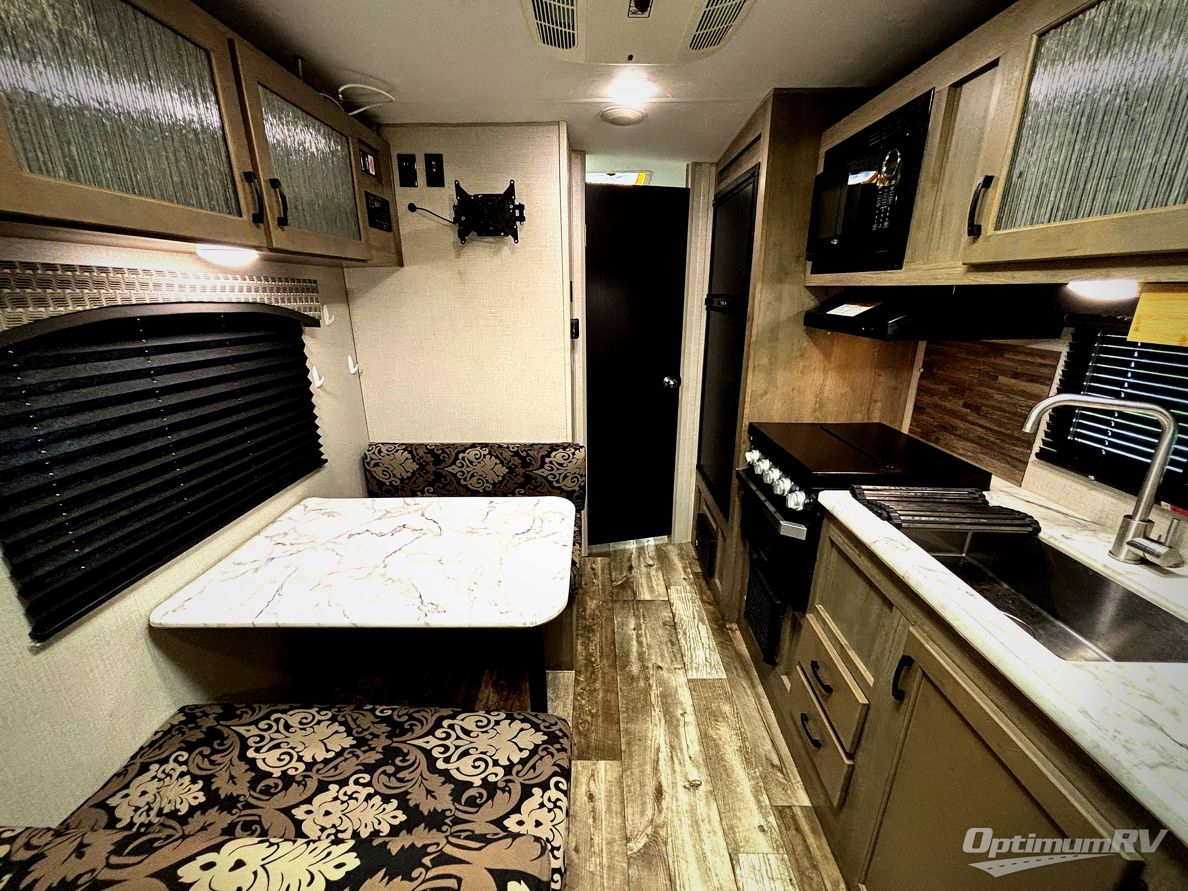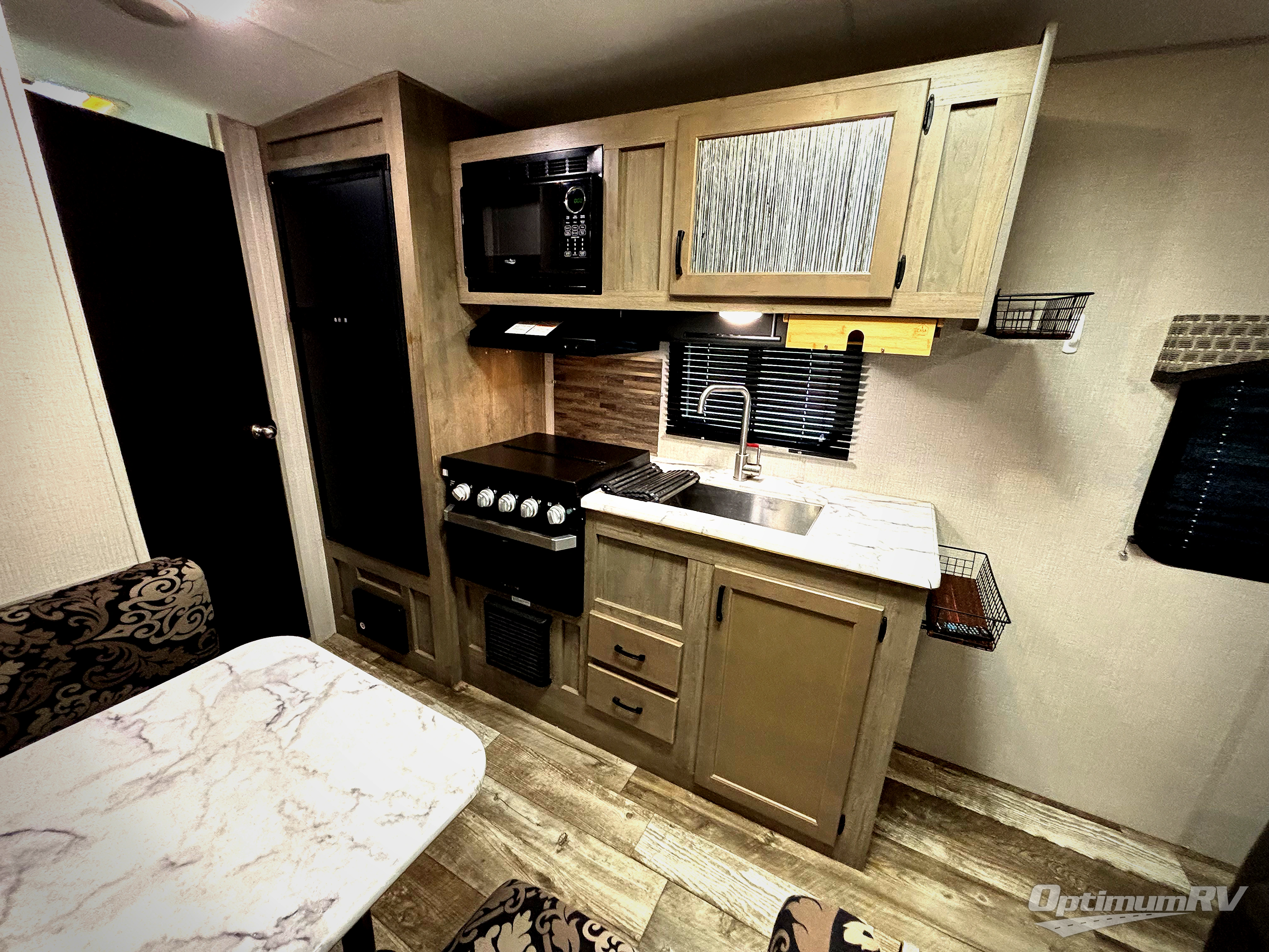 Just imagine you and your spouse exploring campgrounds with this lightweight travel trailer in tow. After a long day of traveling you can get a good night's rest on the RV queen bed or choose the Murphy bed option instead. You can then turn on the Furrion Bluetooth stereo and prepare a meal in the kitchen using the two burner cooktop. You then have the choice to eat at the dinette or outside under the 13' awning. And the full rear bath allows you to skip the public facilities and get cleaned up after each activity.