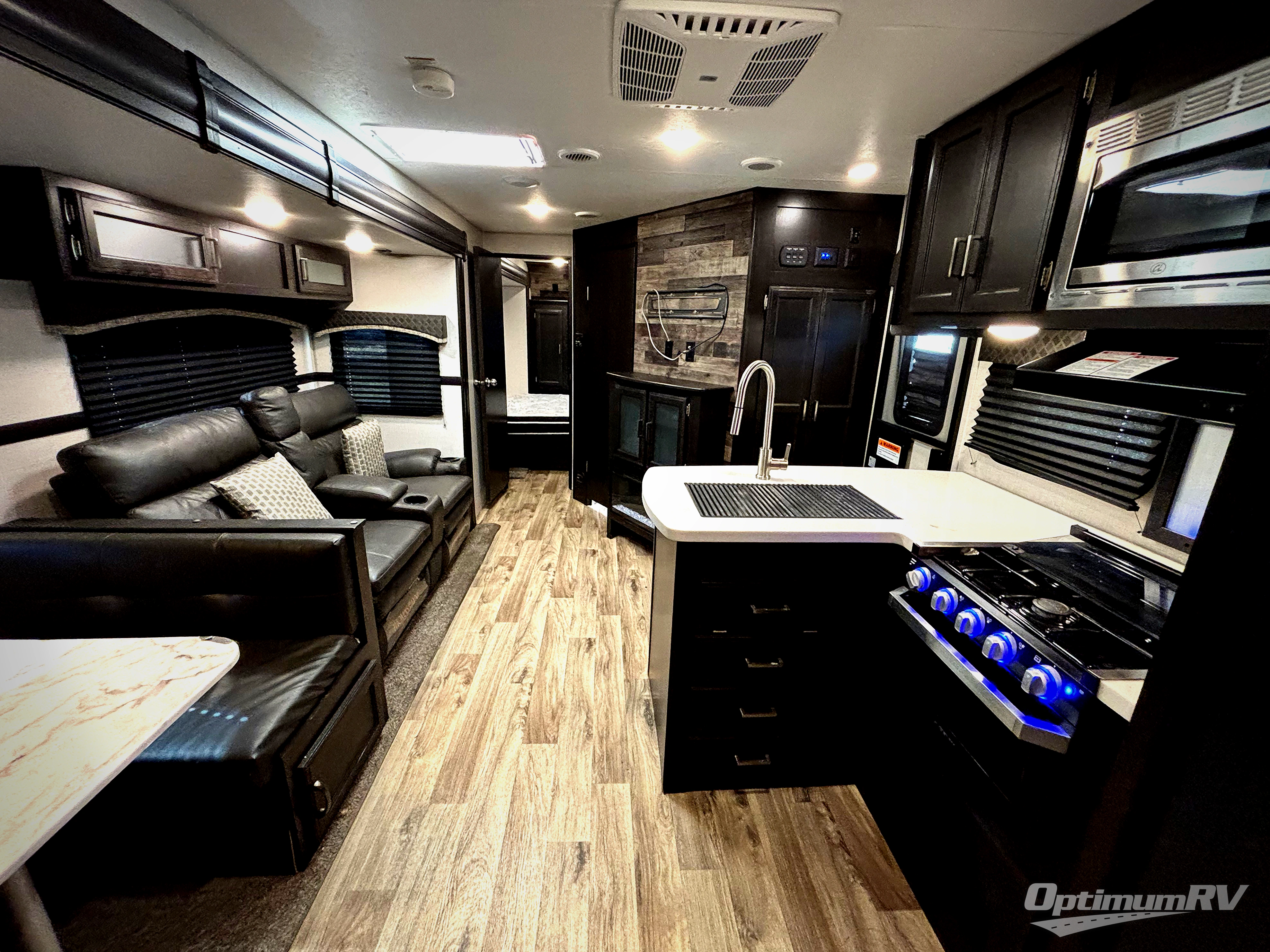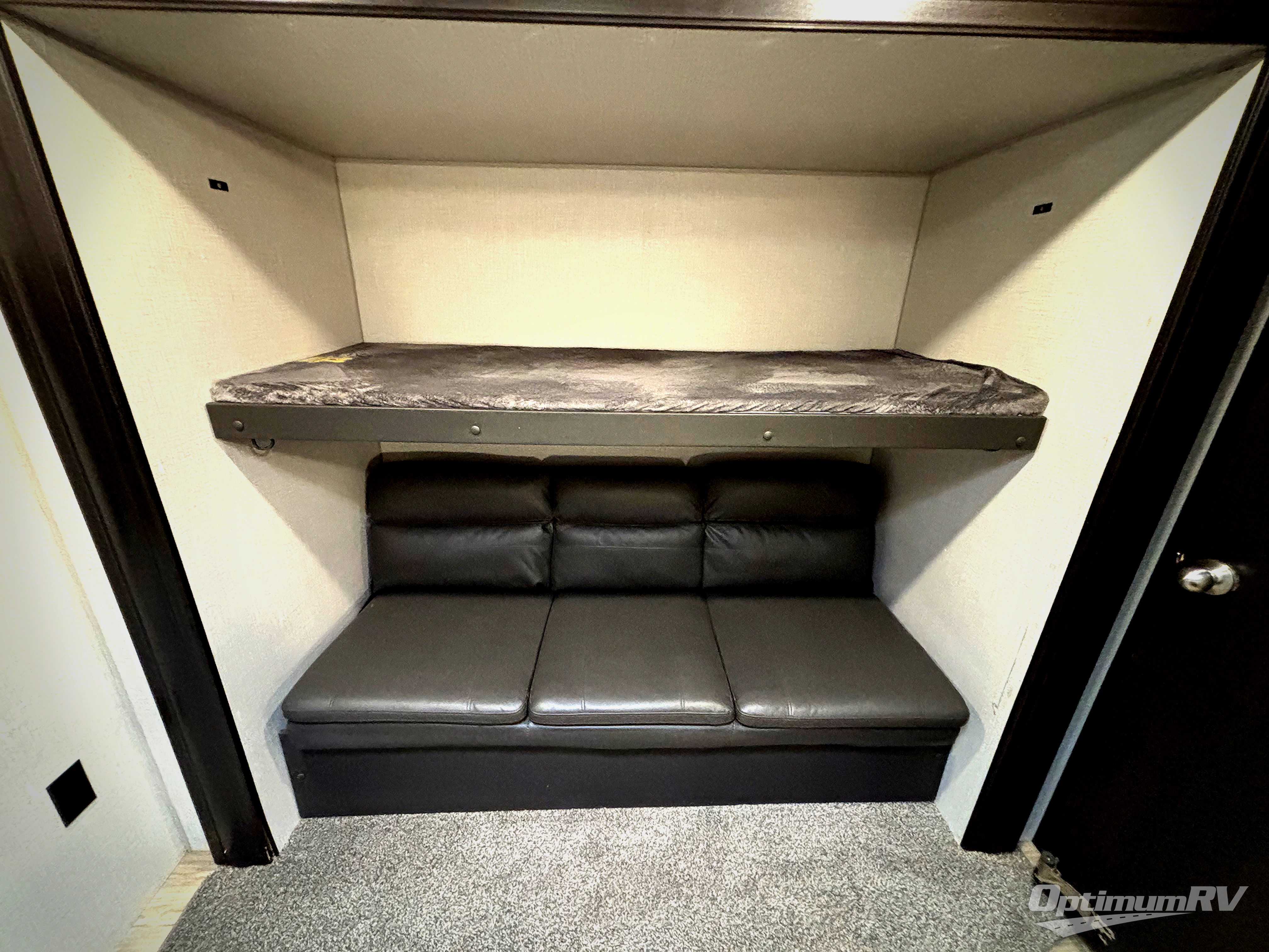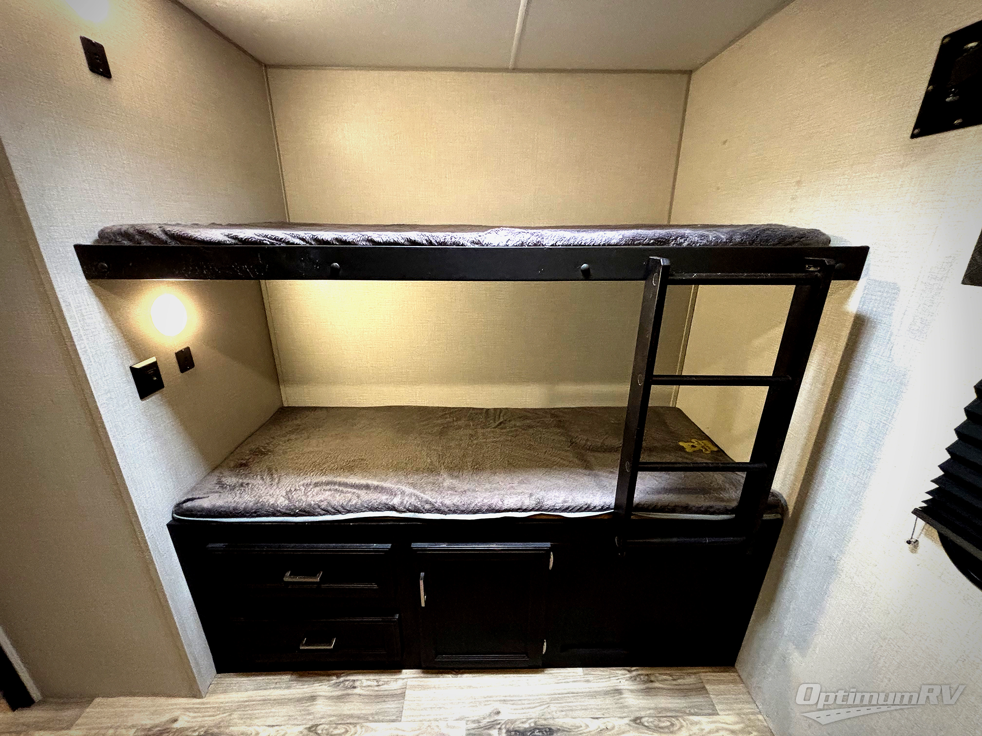 If you've been looking for a travel trailer that includes at-home features and allows you to bring along the family, look no further than this unit! The kids will love the rear private bunkhouse with its slide out for added space, three bunks, plus a table under the flip-up bunk so they can play a game. Mom and dad will appreciate the front master suite with a slide out queen bed, their own fireplace, plus a large front dresser and closet. The bath and a half included in this unit will be a big plus since you'll have a larger group camping with you and the outside campfire cafe will allow you to grill burgers for everyone. There is even an exterior 40" TV to watch the game on!