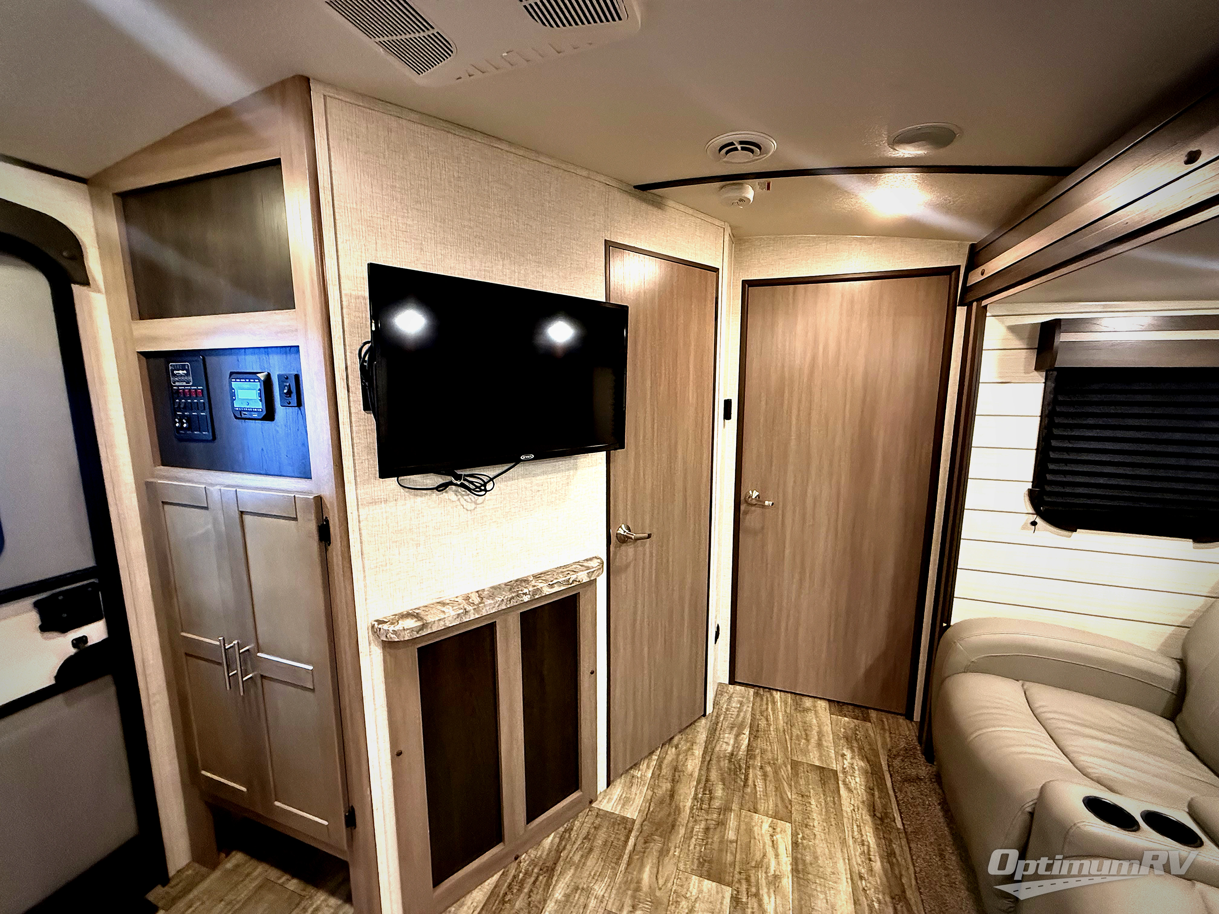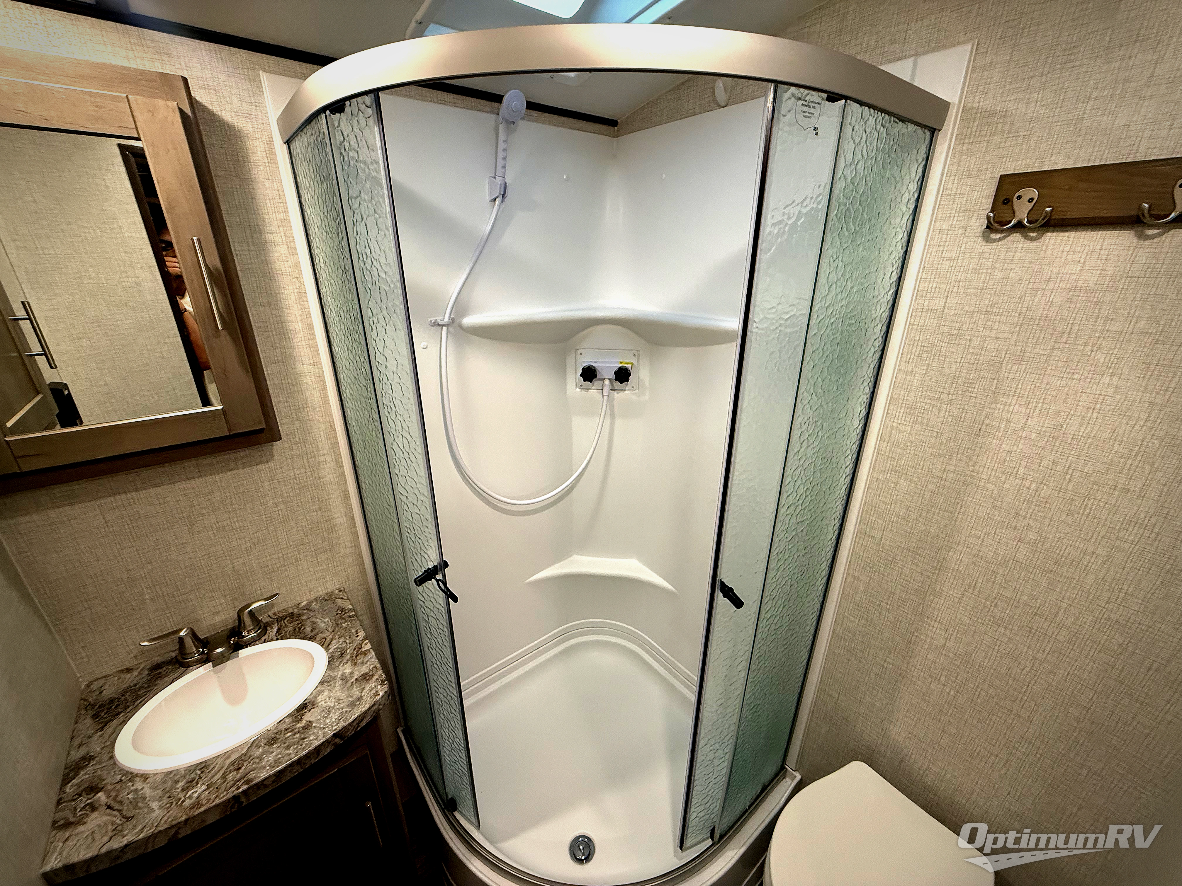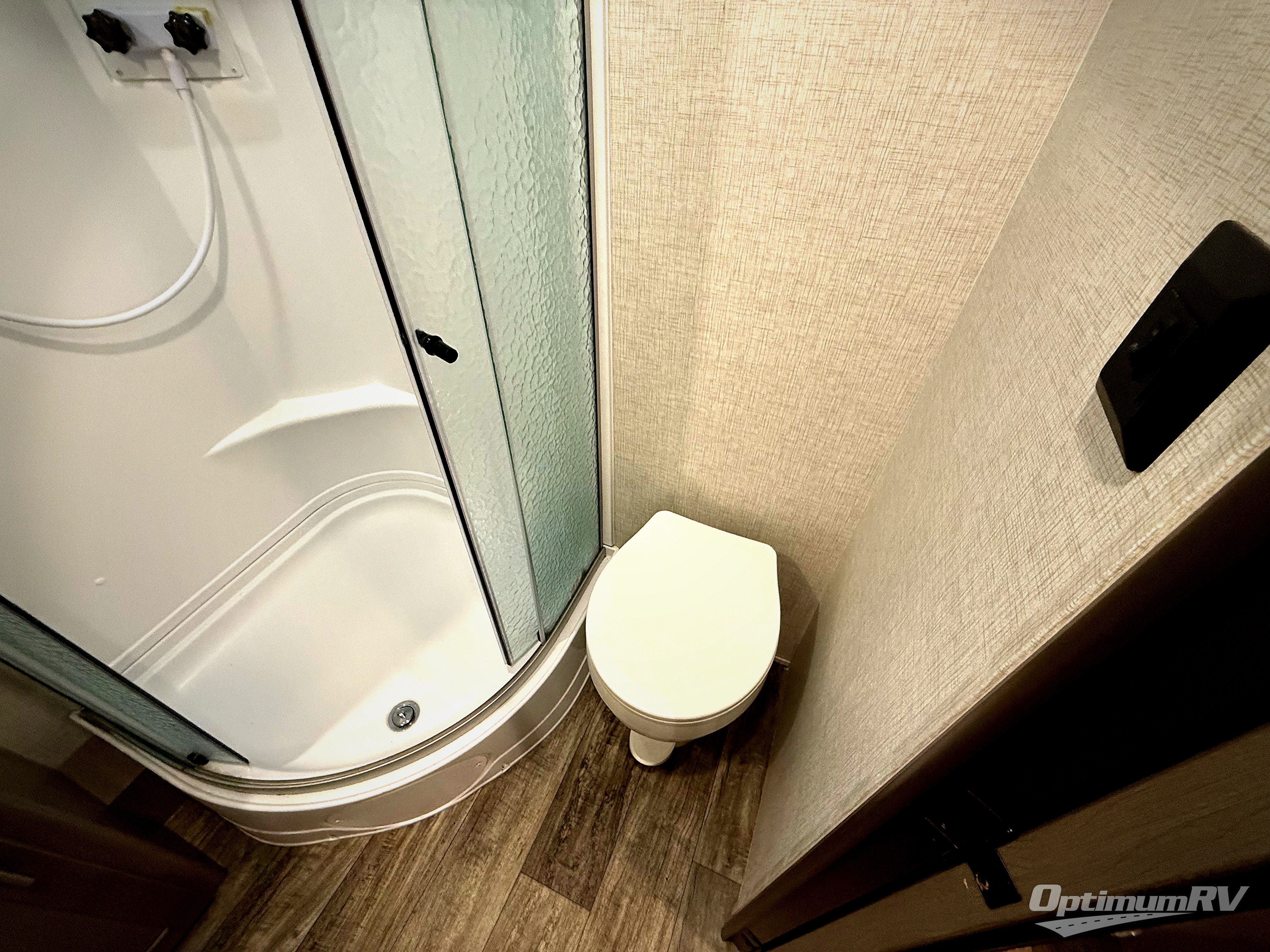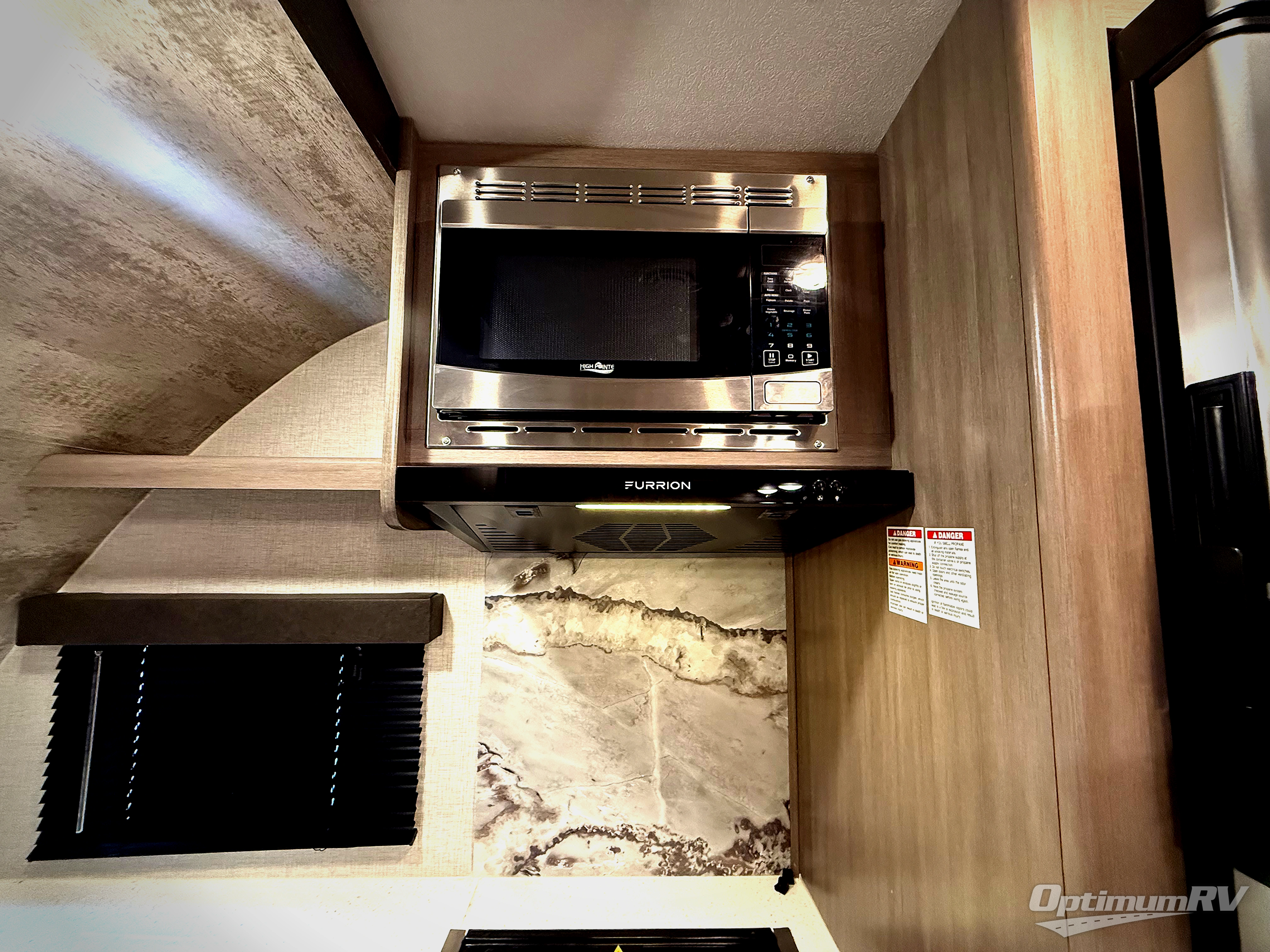 Pack your bags and head to the lake in this spacious travel trailer. Once you arrive you can prepare a quick lunch on the glass top range or use the convenient stainless steel microwave. Take a look around the campground or find a trail or two, and when you return you can freshen up in the full bath. The XL booth dinette provides a place to dine and two can comfortably sleep here. You'll also find a tri-fold sofa or you can choose optional theater seating if you're not needing the extra sleeping space. Mom and dad will enjoy the rear private bedroom with its king bed, dual wardrobes, plus a shoe storage and pet station for convenience.